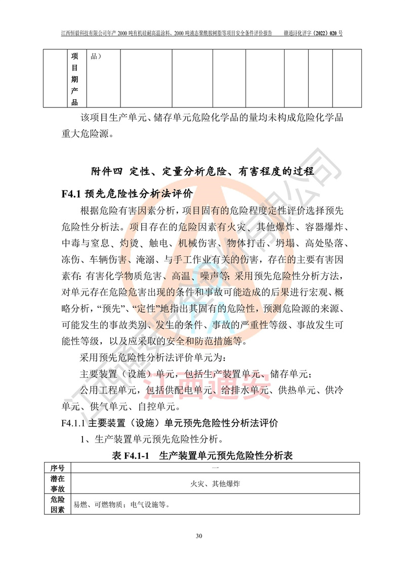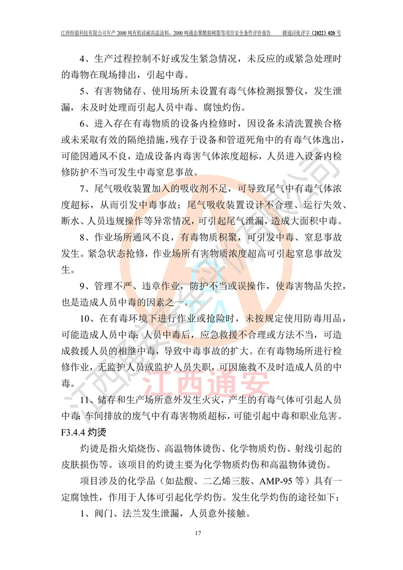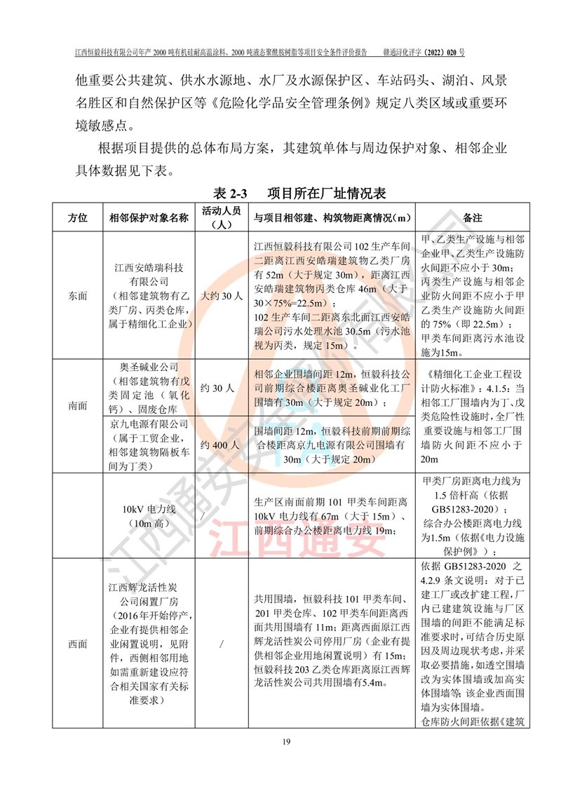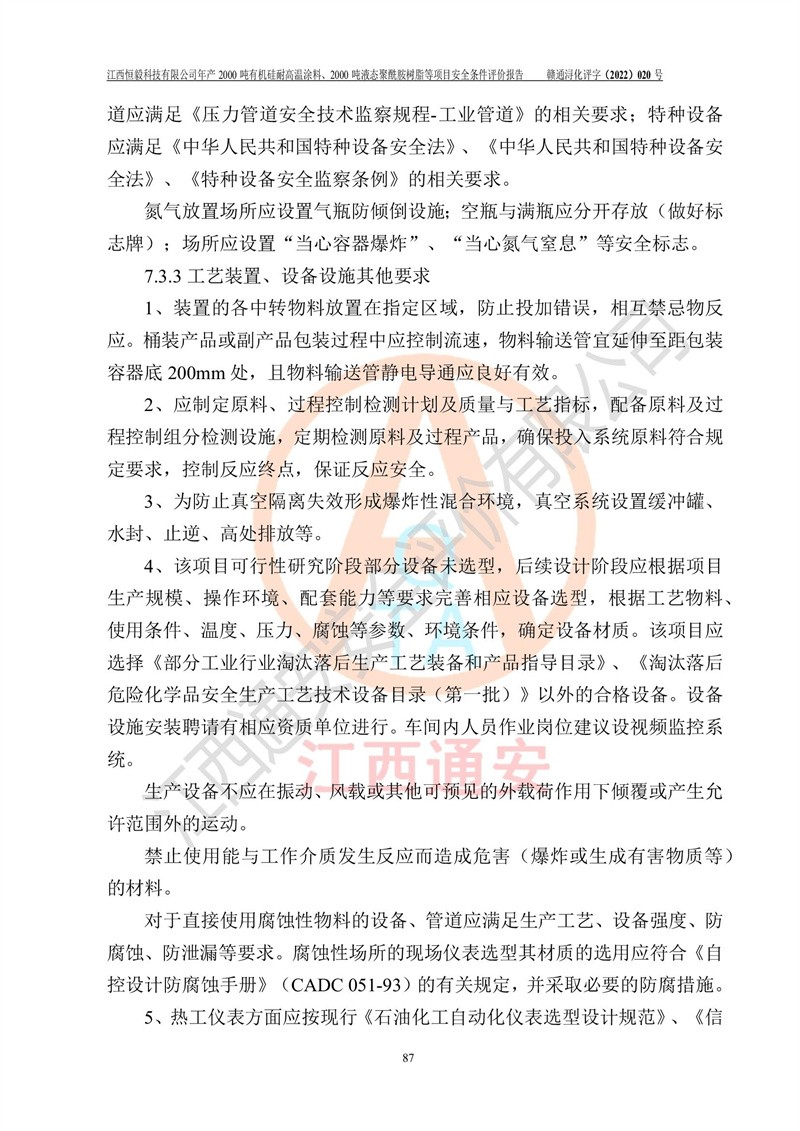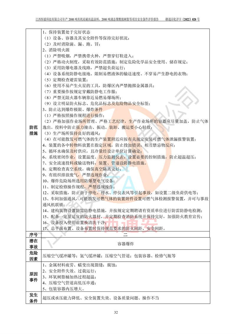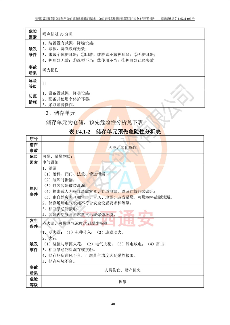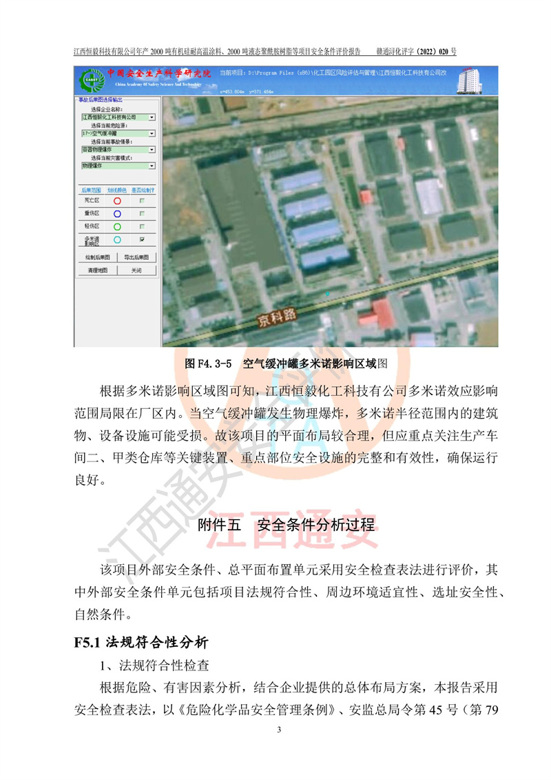 评价结论 | 江西恒毅科技有限公司年产2000吨有机硅耐高温涂料、2000吨液态聚酰胺树脂等项目的选址、总体布局、周边环境、自然环境能满足建设安全条件;项目选择的工艺过程及设备设施的安全可靠性能达到**法规、标准规定要求;项目存在的危险有害因素可控,在落实本评价报告提出的有关安全对策措施后,其危险有害程度能达到可以接受的程度,项目建设能够实现安 全运行的目标。 | ||||