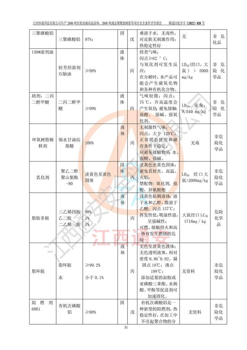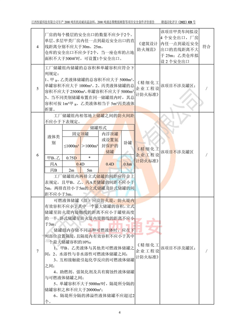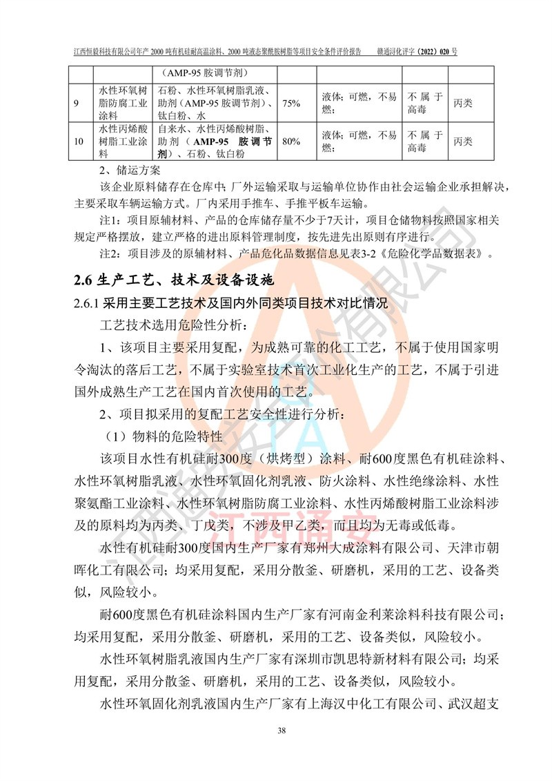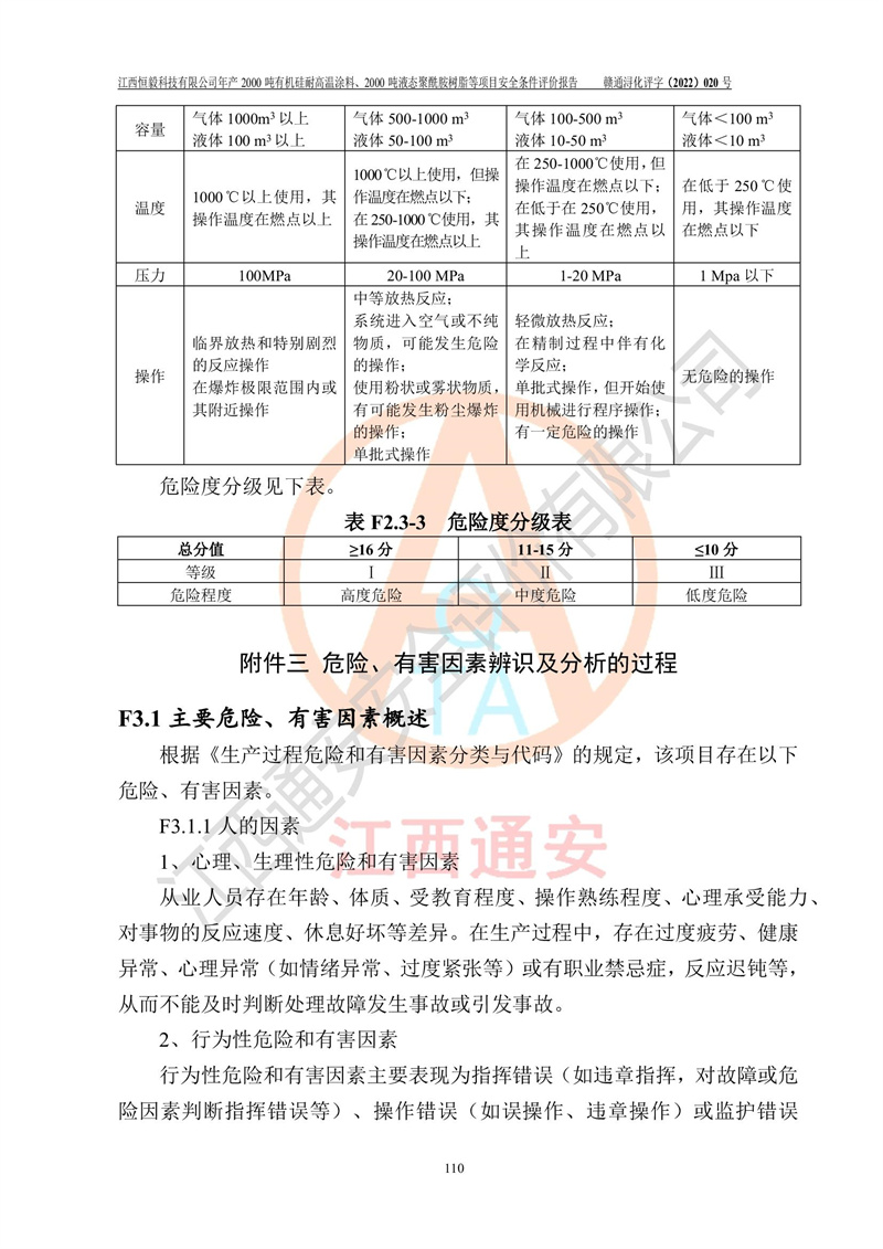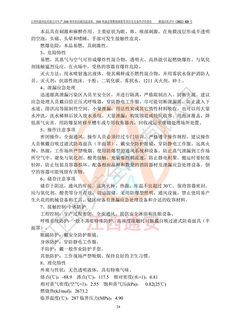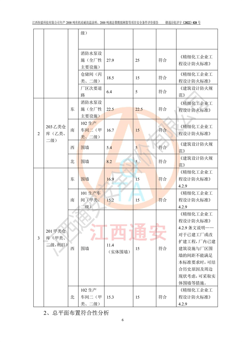 评价结论 | 江西恒毅科技有限公司年产2000吨有机硅耐高温涂料、2000吨液态聚酰胺树脂等项目的选址、总体布局、周边环境、自然环境能满足建设安全条件;项目选择的工艺过程及设备设施的安全可靠性能达到**法规、标准规定要求;项目存在的危险有害因素可控,在落实本评价报告提出的有关安全对策措施后,其危险有害程度能达到可以接受的程度,项目建设能够实现安 全运行的目标。 | ||||