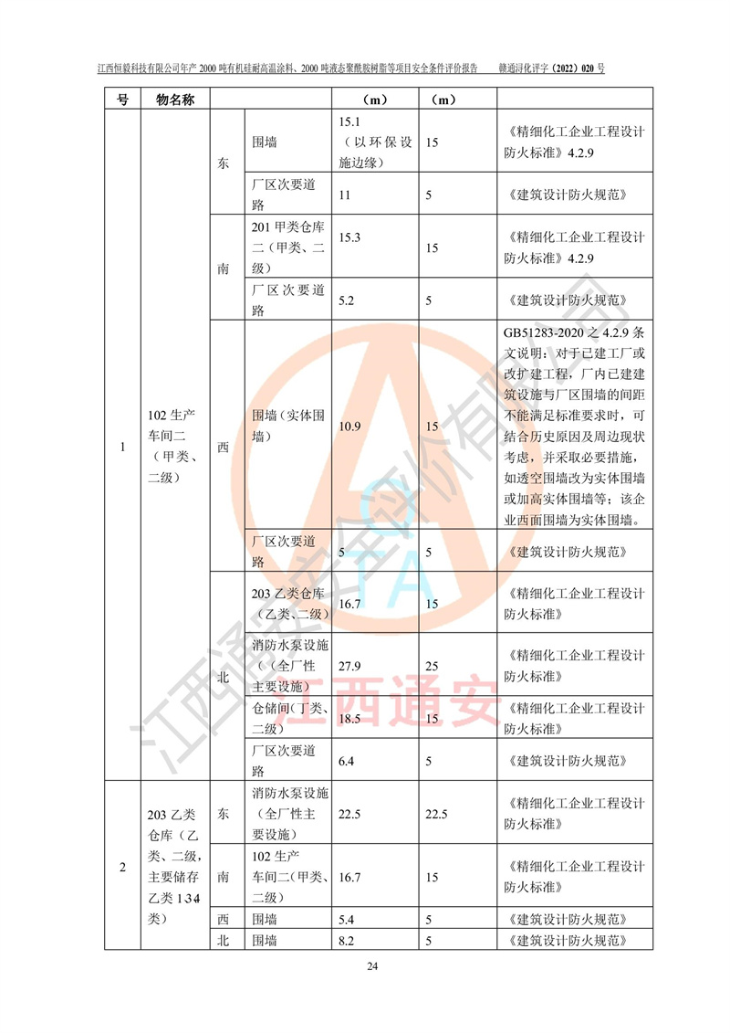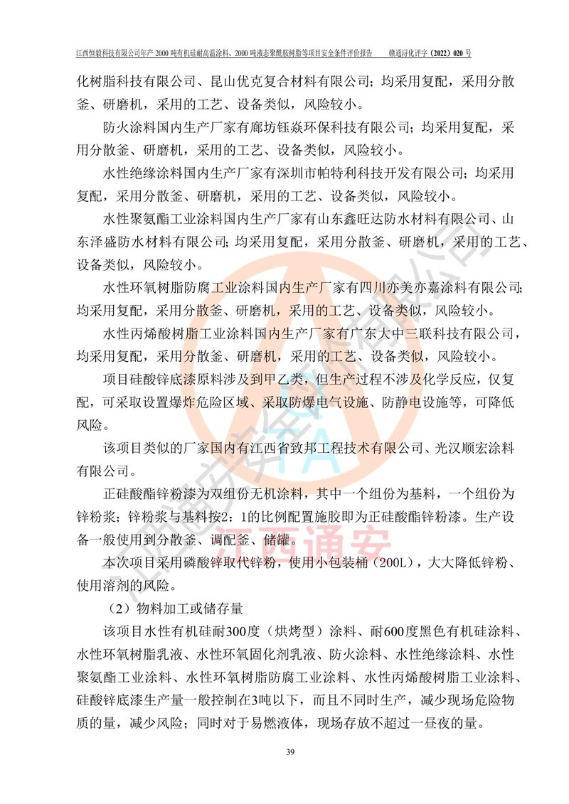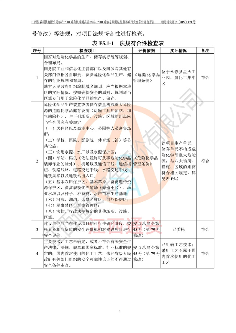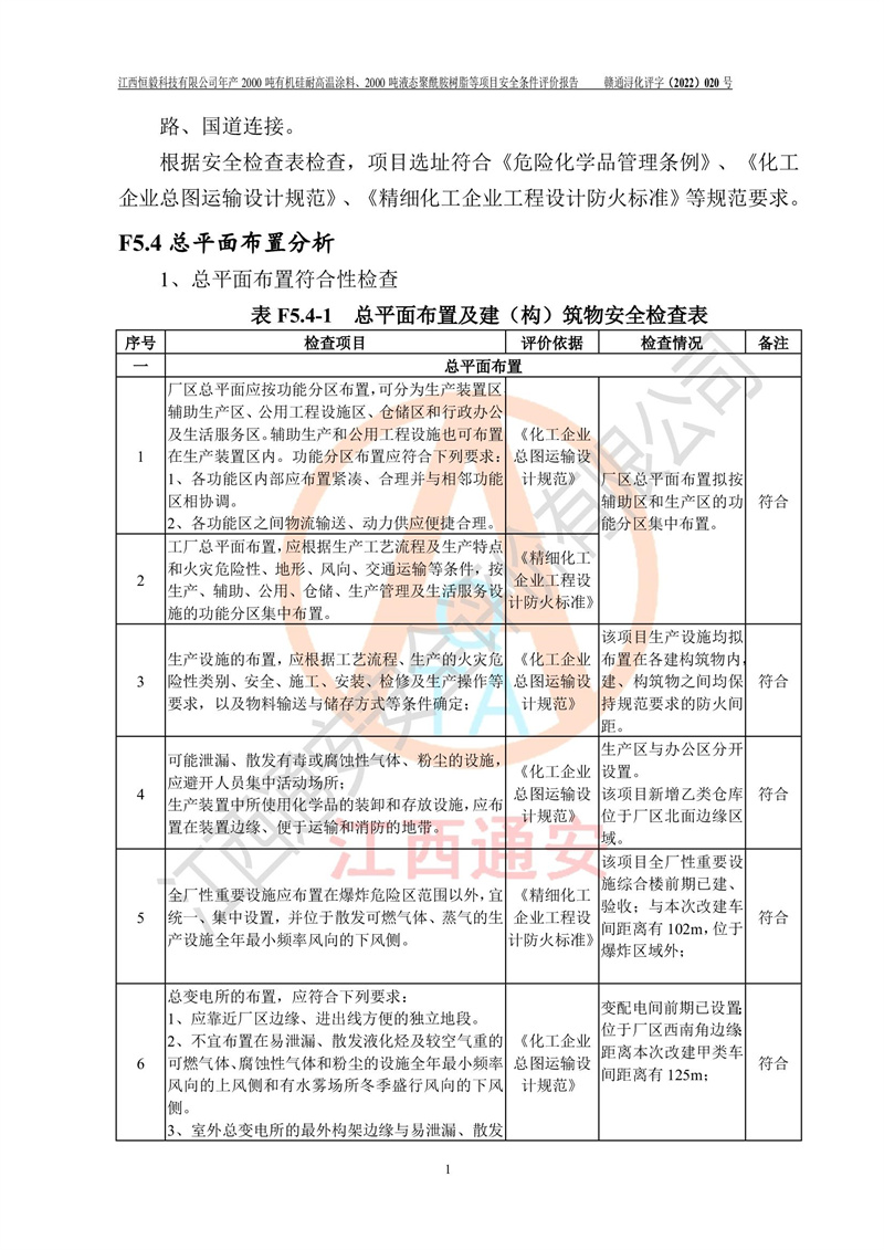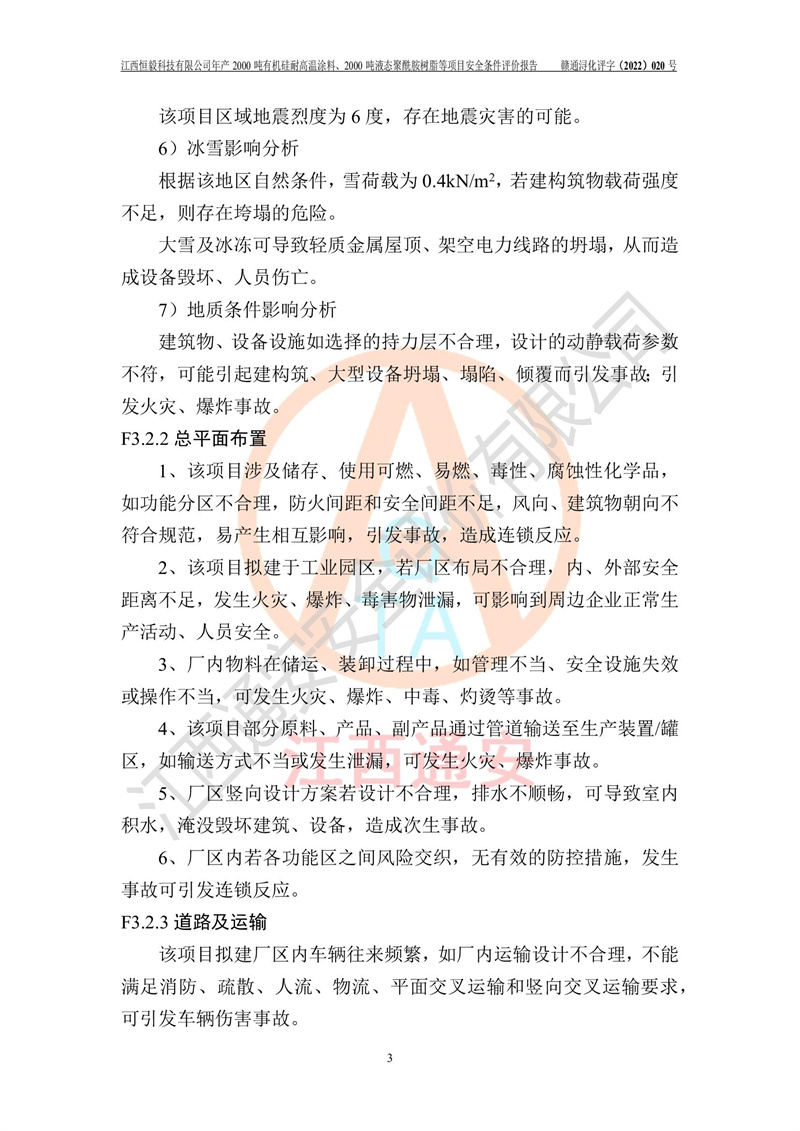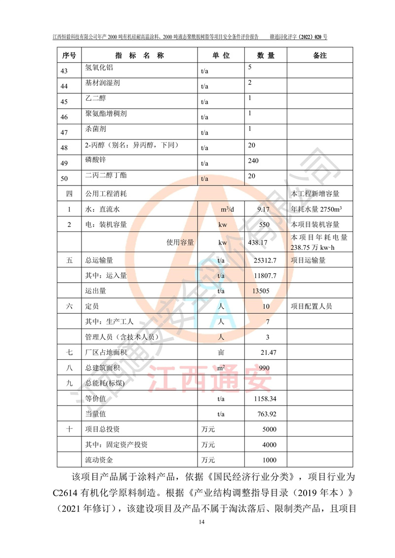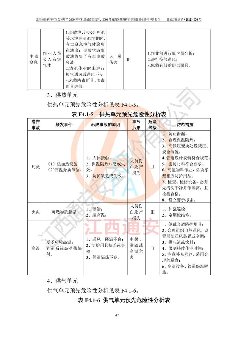 评价结论 | 江西恒毅科技有限公司年产2000吨有机硅耐高温涂料、2000吨液态聚酰胺树脂等项目的选址、总体布局、周边环境、自然环境能满足建设安全条件;项目选择的工艺过程及设备设施的安全可靠性能达到**法规、标准规定要求;项目存在的危险有害因素可控,在落实本评价报告提出的有关安全对策措施后,其危险有害程度能达到可以接受的程度,项目建设能够实现安 全运行的目标。 | ||||