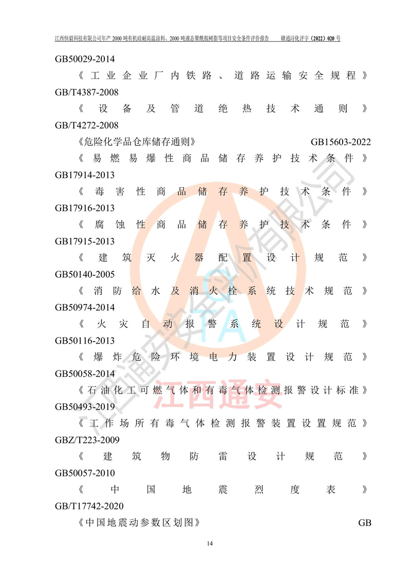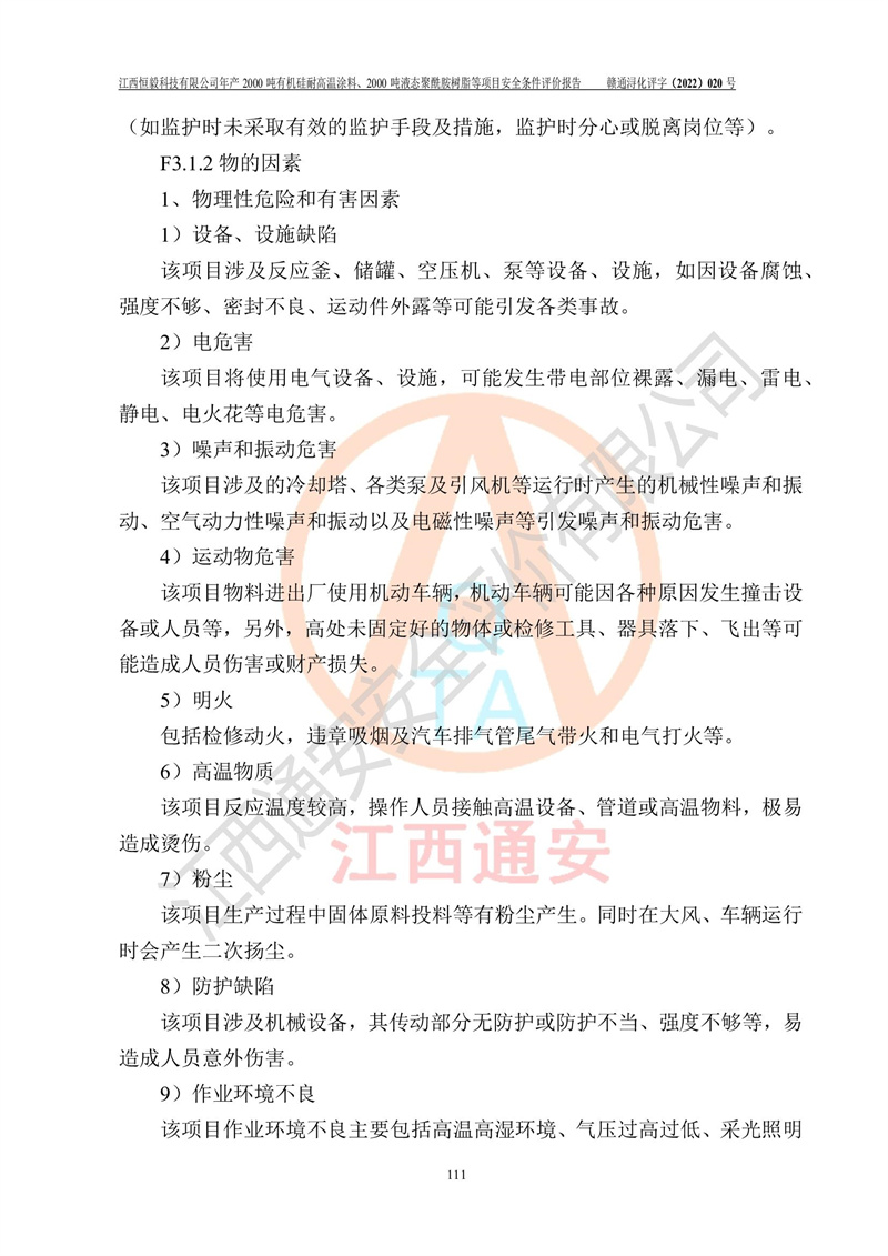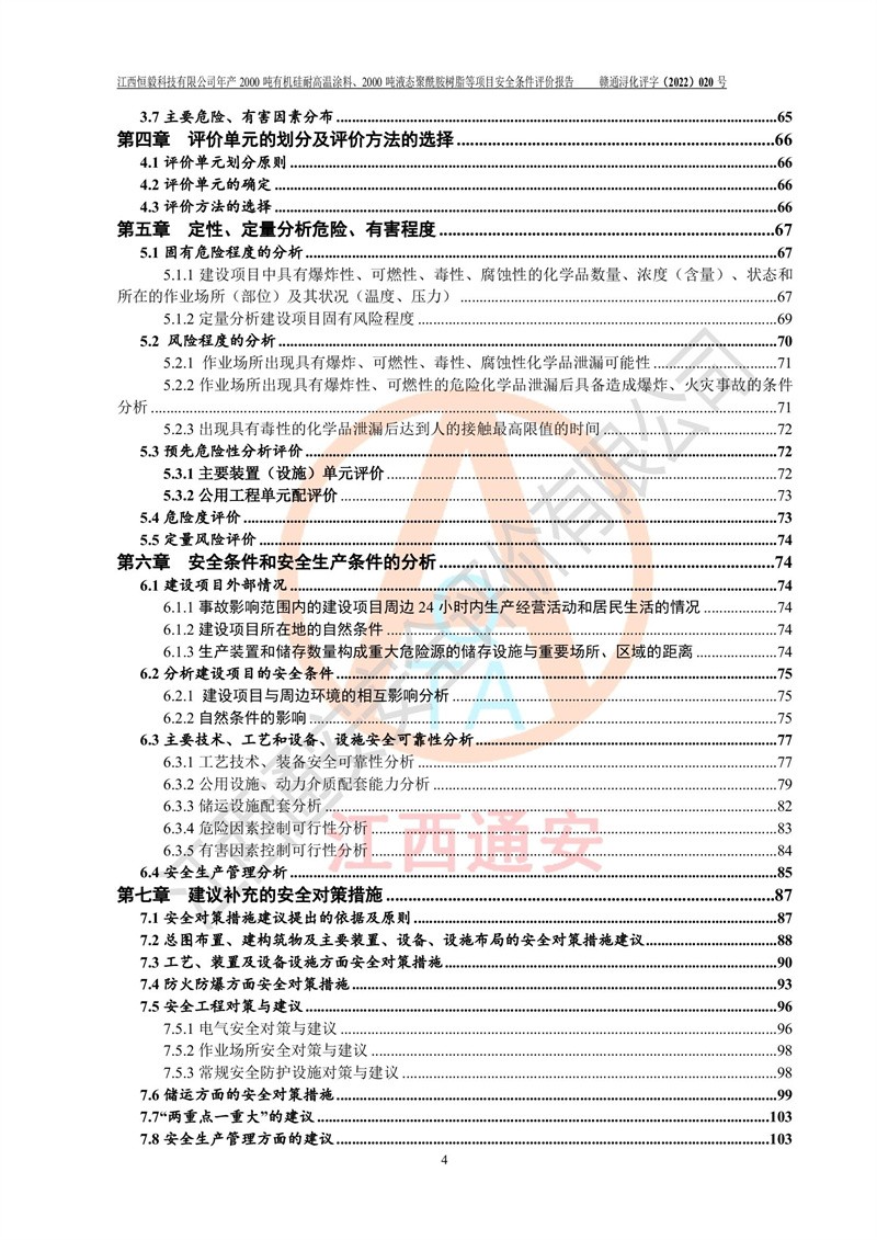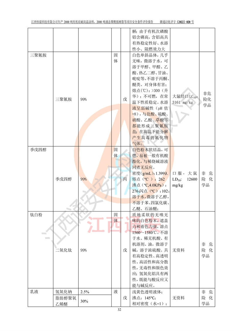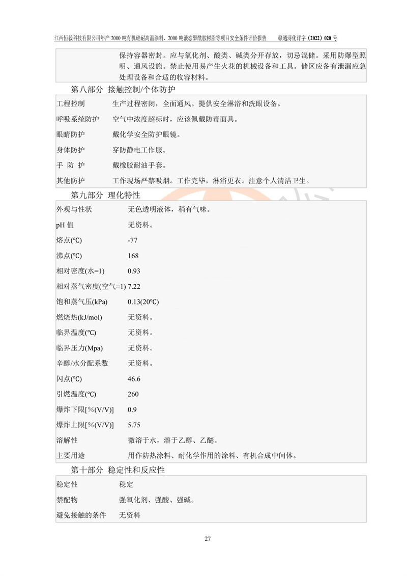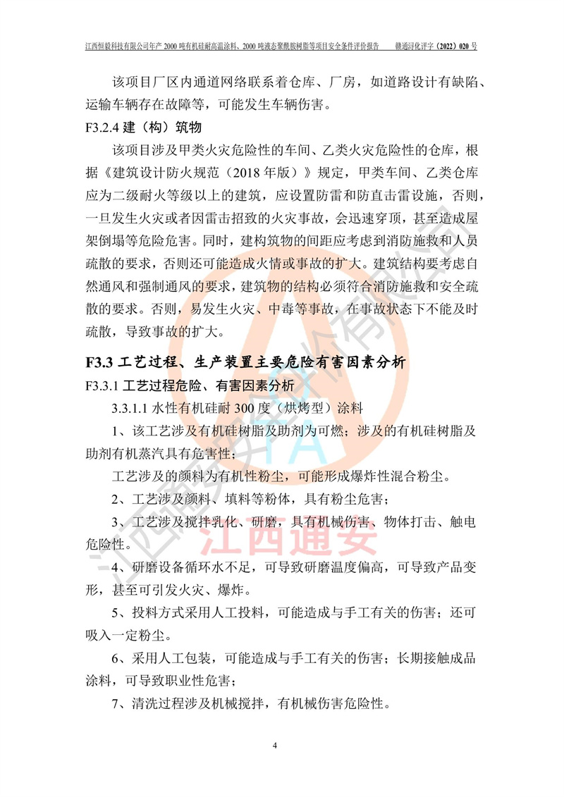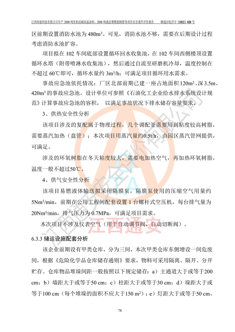 评价结论 | 江西恒毅科技有限公司年产2000吨有机硅耐高温涂料、2000吨液态聚酰胺树脂等项目的选址、总体布局、周边环境、自然环境能满足建设安全条件;项目选择的工艺过程及设备设施的安全可靠性能达到**法规、标准规定要求;项目存在的危险有害因素可控,在落实本评价报告提出的有关安全对策措施后,其危险有害程度能达到可以接受的程度,项目建设能够实现安 全运行的目标。 | ||||