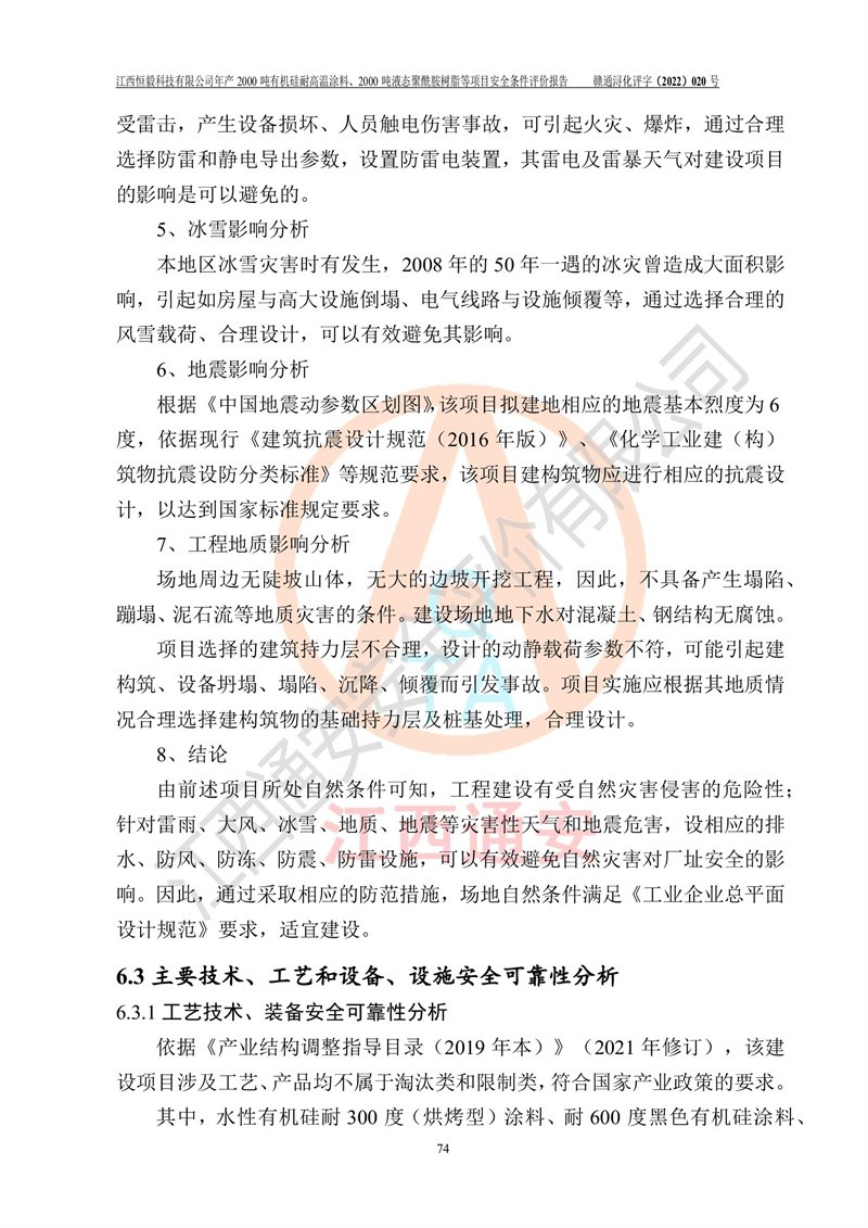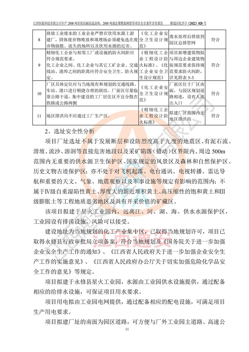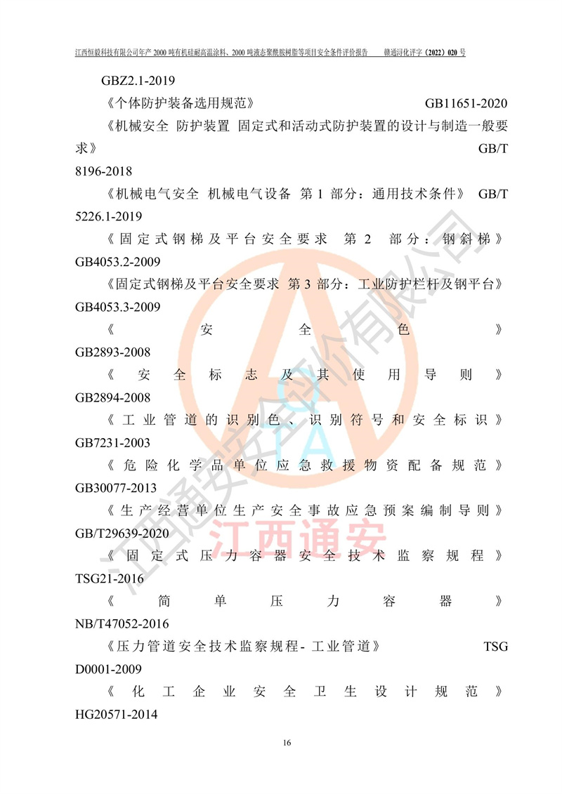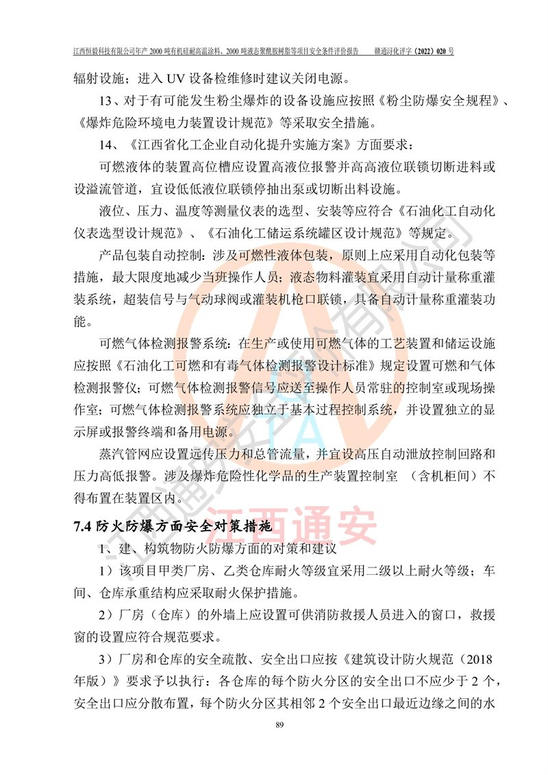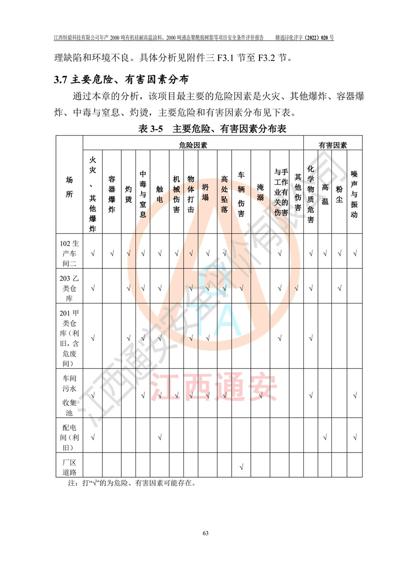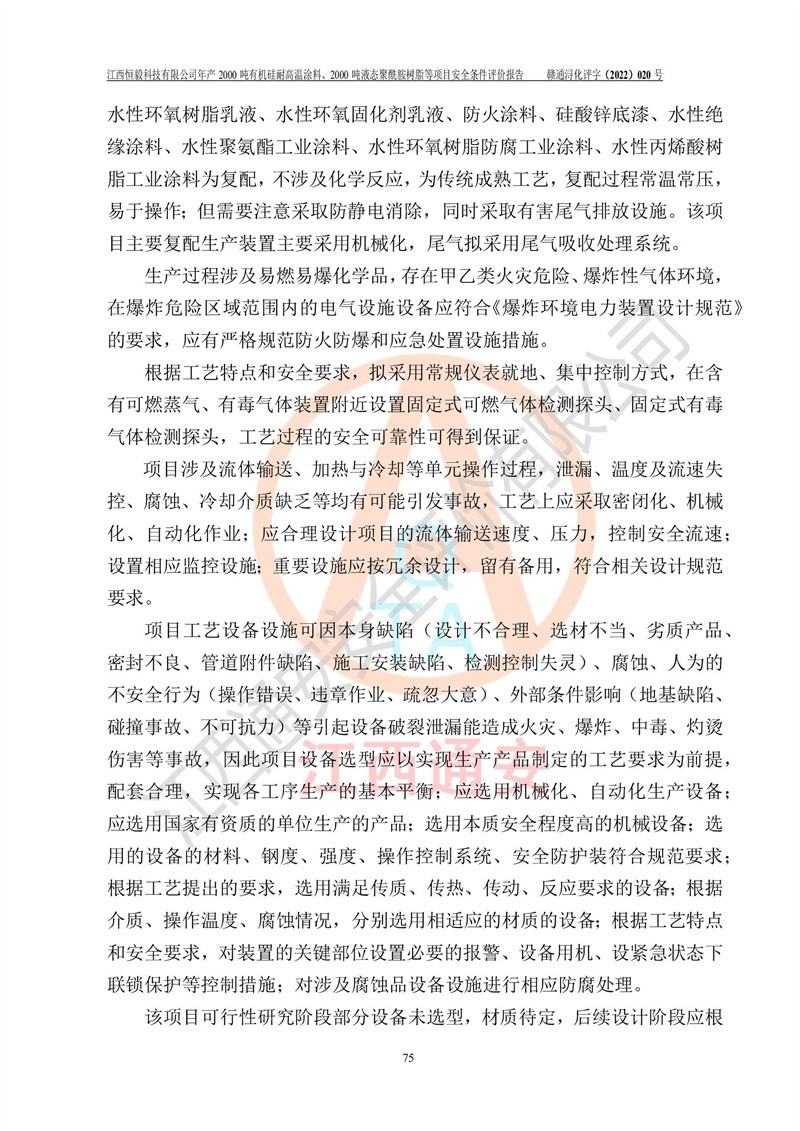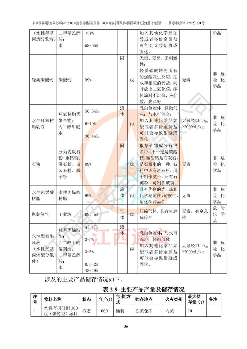 评价结论 | 江西恒毅科技有限公司年产2000吨有机硅耐高温涂料、2000吨液态聚酰胺树脂等项目的选址、总体布局、周边环境、自然环境能满足建设安全条件;项目选择的工艺过程及设备设施的安全可靠性能达到**法规、标准规定要求;项目存在的危险有害因素可控,在落实本评价报告提出的有关安全对策措施后,其危险有害程度能达到可以接受的程度,项目建设能够实现安 全运行的目标。 | ||||