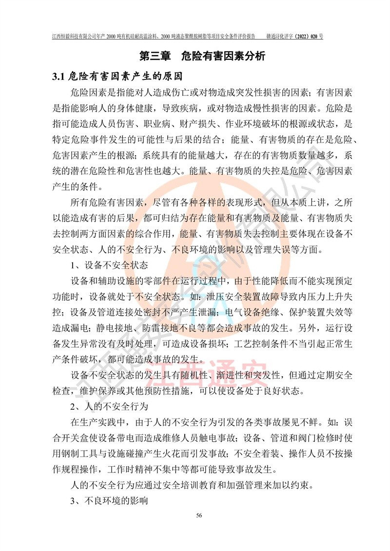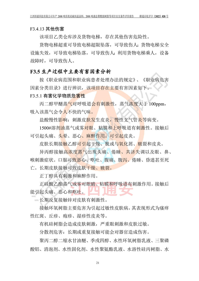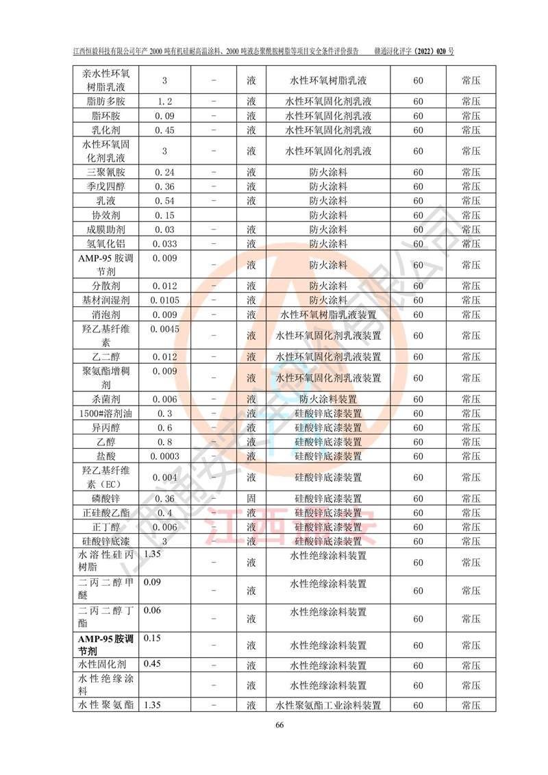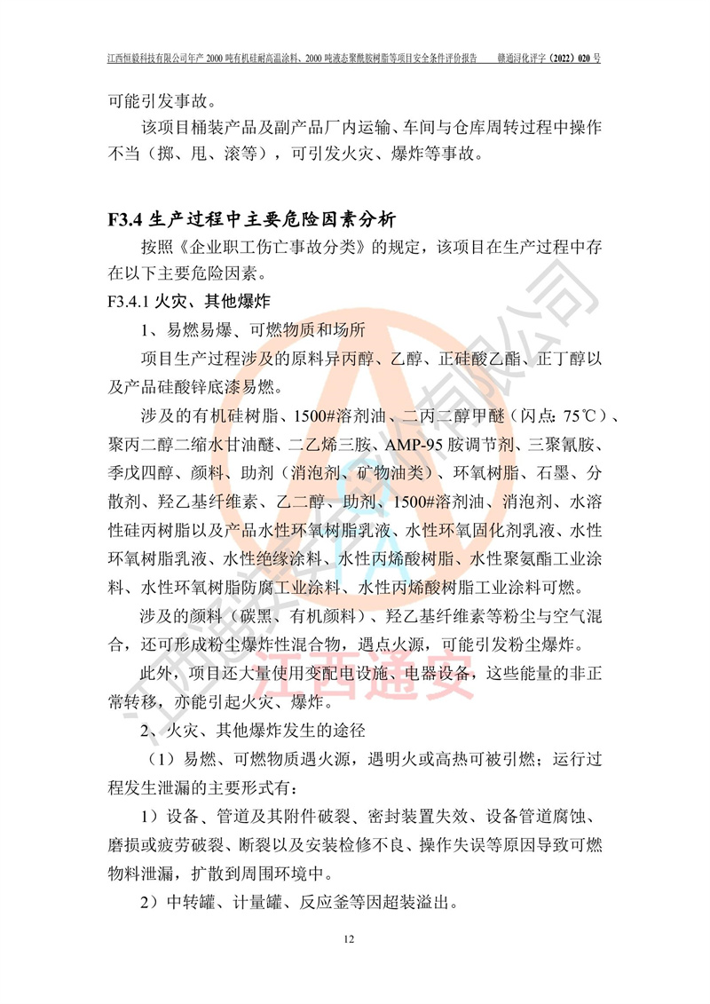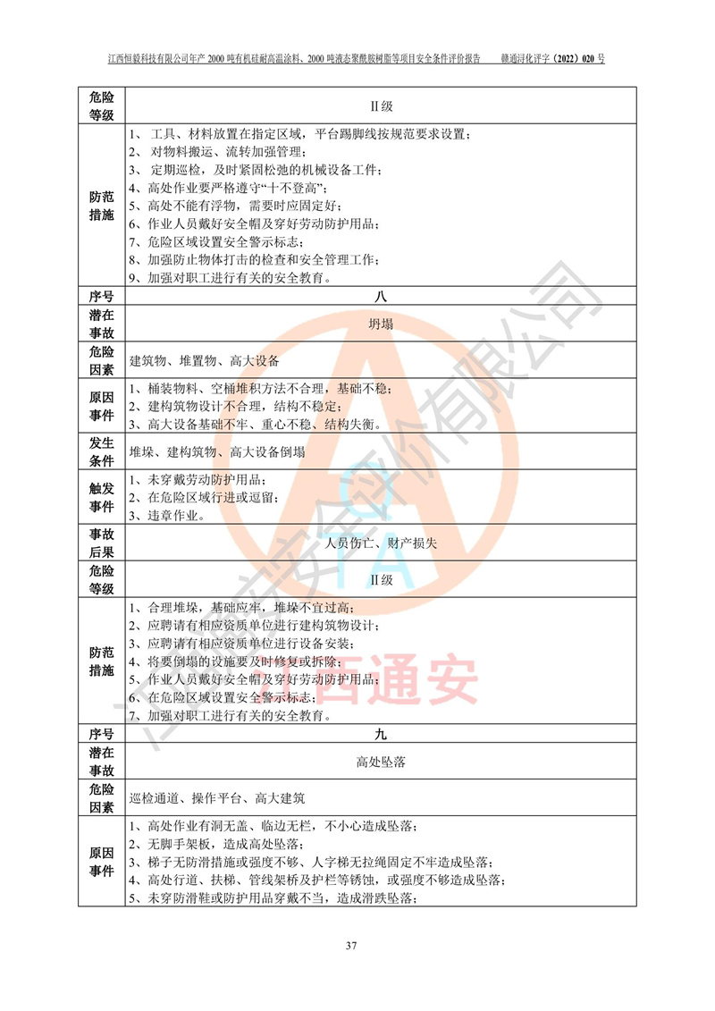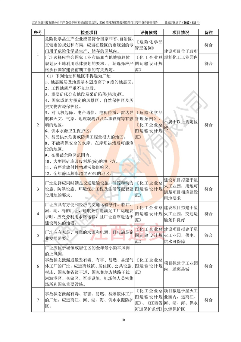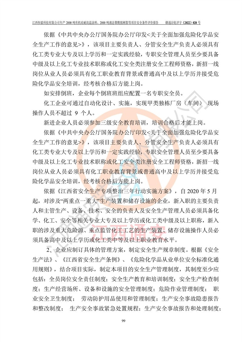 评价结论 | 江西恒毅科技有限公司年产2000吨有机硅耐高温涂料、2000吨液态聚酰胺树脂等项目的选址、总体布局、周边环境、自然环境能满足建设安全条件;项目选择的工艺过程及设备设施的安全可靠性能达到**法规、标准规定要求;项目存在的危险有害因素可控,在落实本评价报告提出的有关安全对策措施后,其危险有害程度能达到可以接受的程度,项目建设能够实现安 全运行的目标。 | ||||