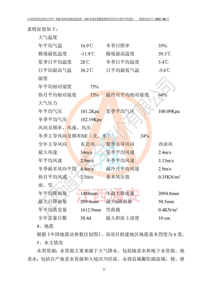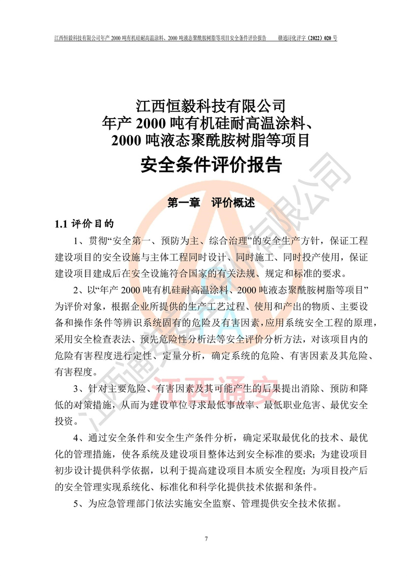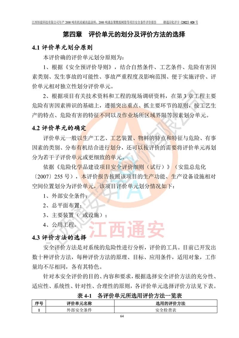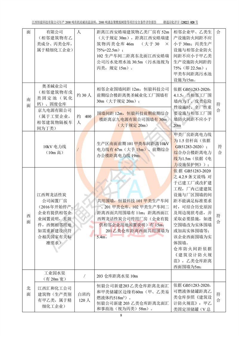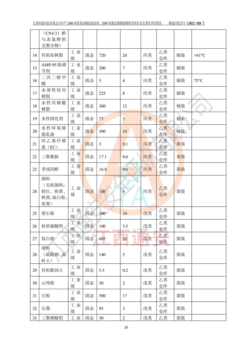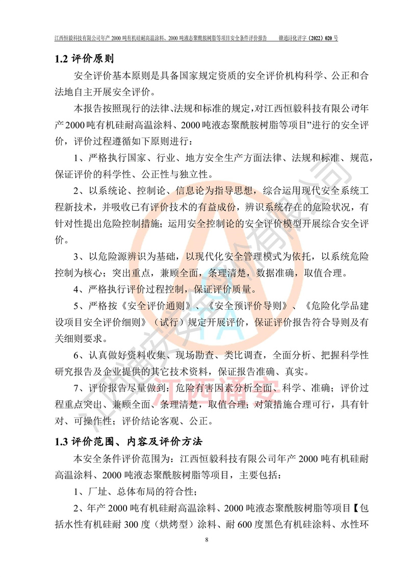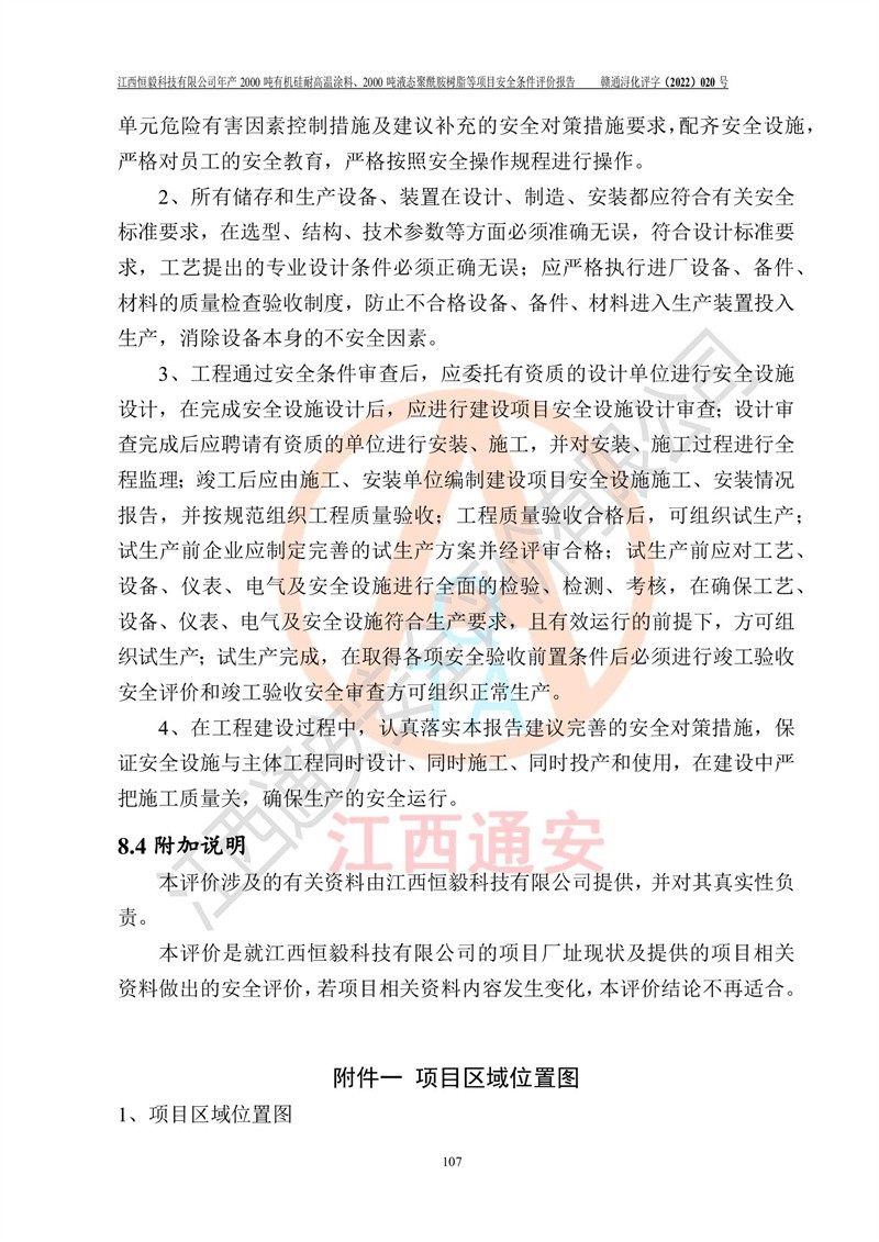 评价结论 | 江西恒毅科技有限公司年产2000吨有机硅耐高温涂料、2000吨液态聚酰胺树脂等项目的选址、总体布局、周边环境、自然环境能满足建设安全条件;项目选择的工艺过程及设备设施的安全可靠性能达到**法规、标准规定要求;项目存在的危险有害因素可控,在落实本评价报告提出的有关安全对策措施后,其危险有害程度能达到可以接受的程度,项目建设能够实现安 全运行的目标。 | ||||