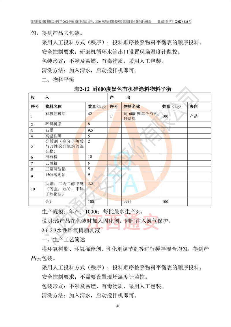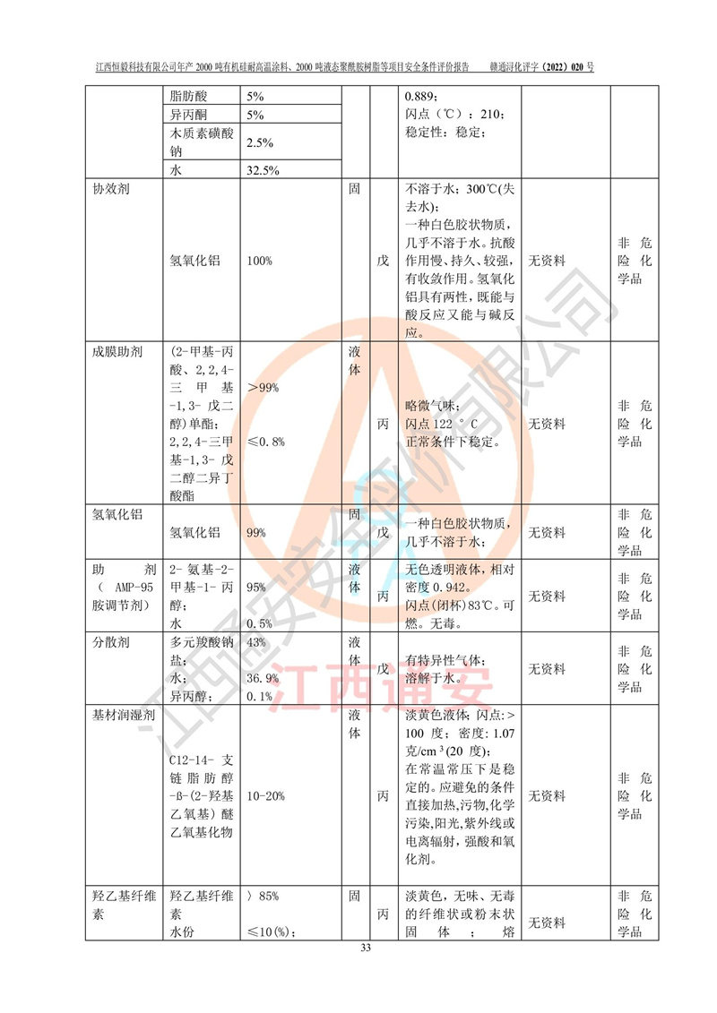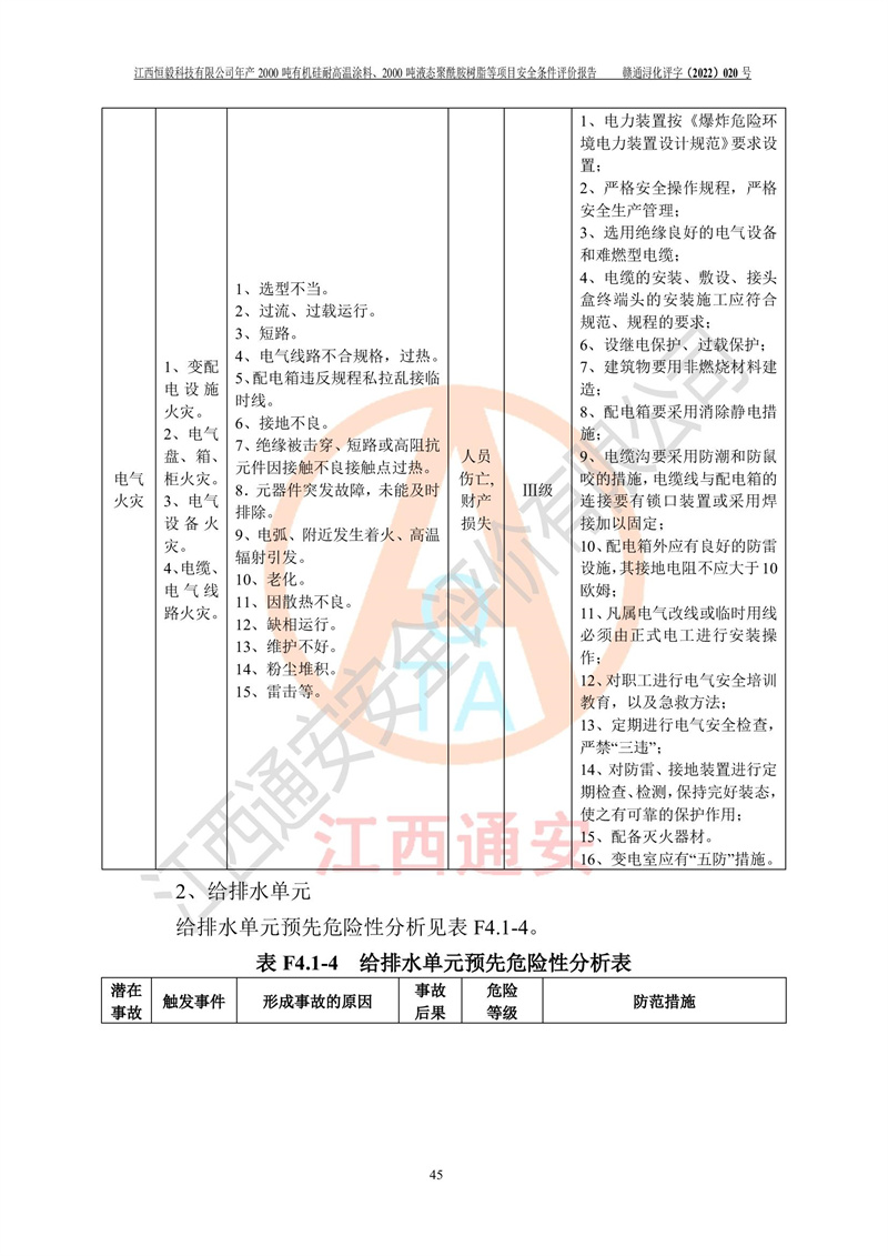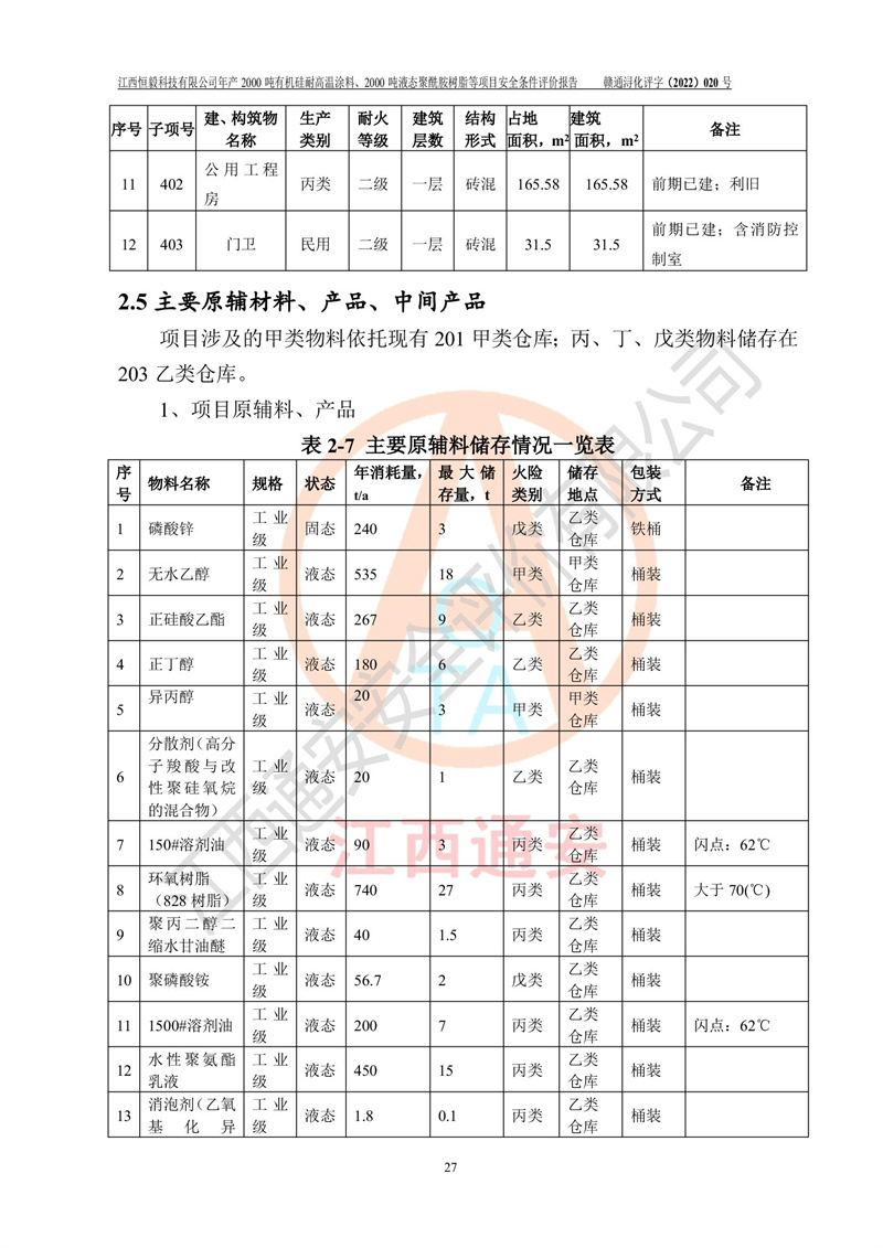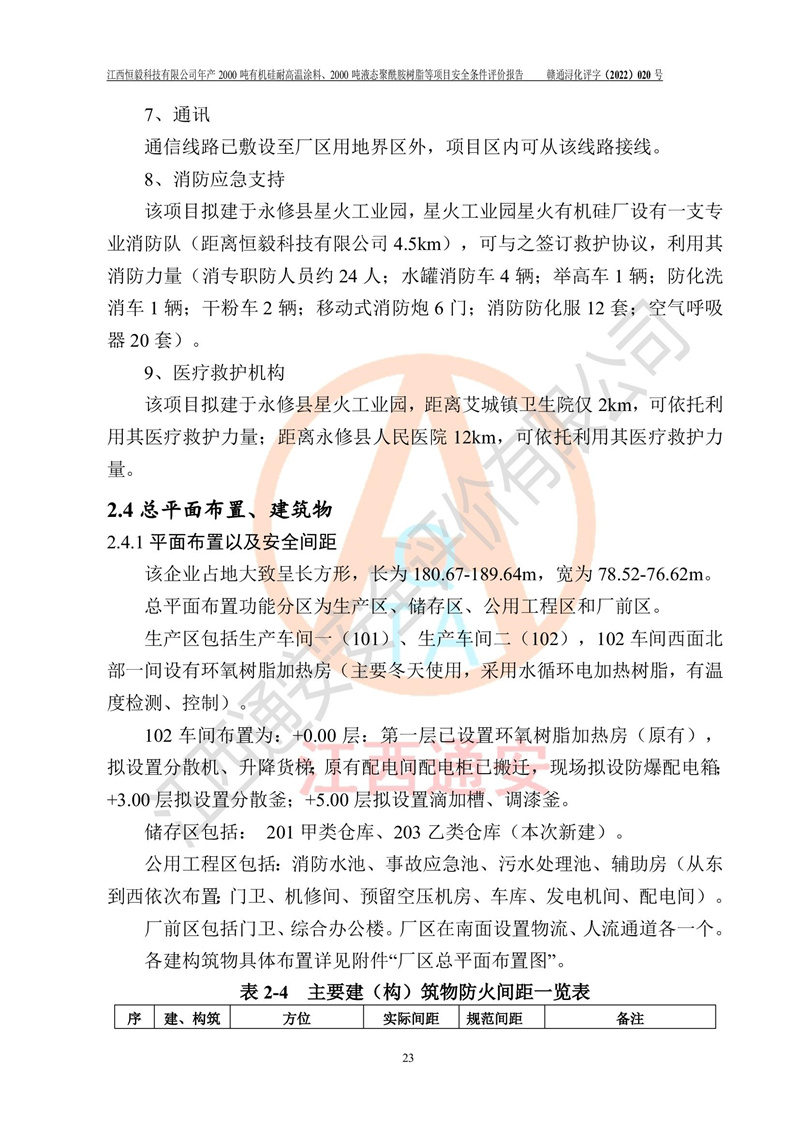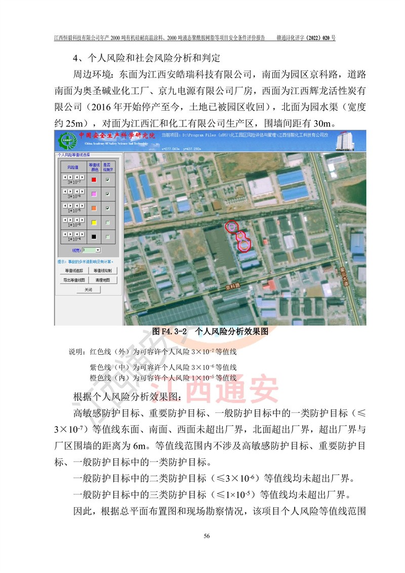 评价结论 | 江西恒毅科技有限公司年产2000吨有机硅耐高温涂料、2000吨液态聚酰胺树脂等项目的选址、总体布局、周边环境、自然环境能满足建设安全条件;项目选择的工艺过程及设备设施的安全可靠性能达到**法规、标准规定要求;项目存在的危险有害因素可控,在落实本评价报告提出的有关安全对策措施后,其危险有害程度能达到可以接受的程度,项目建设能够实现安 全运行的目标。 | ||||