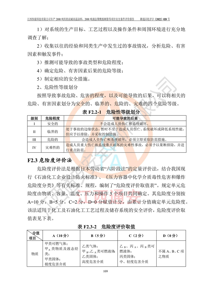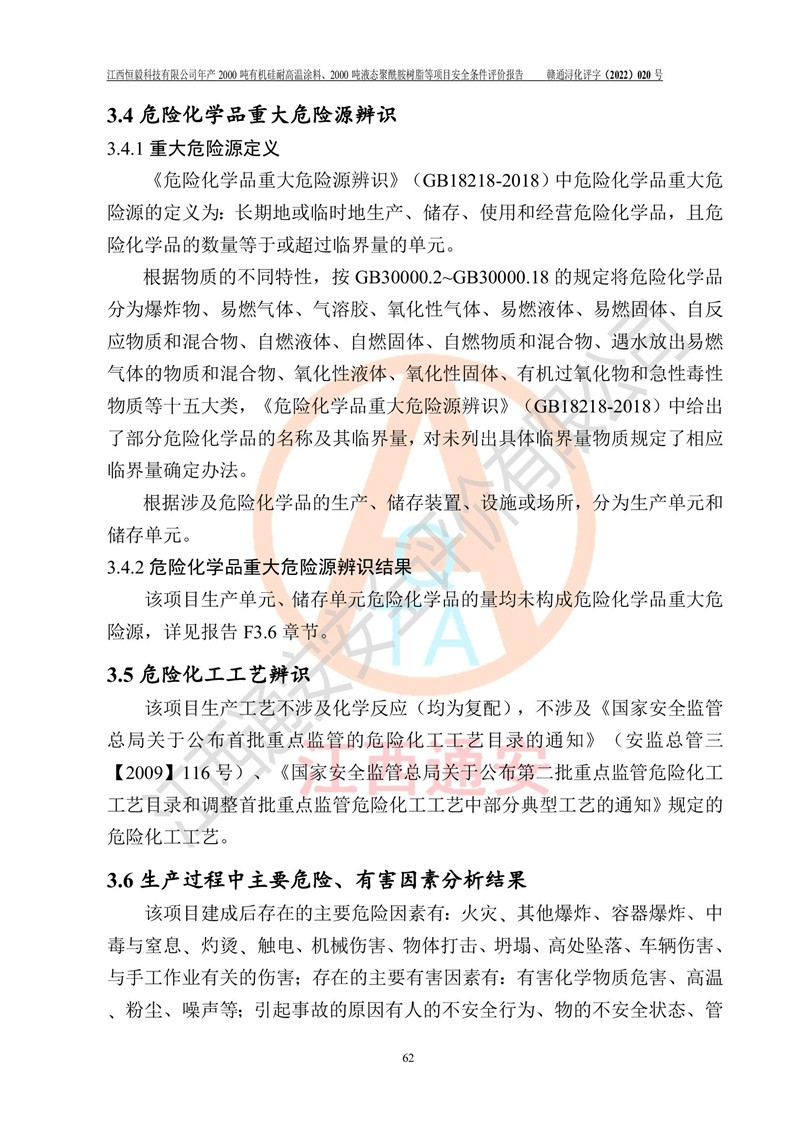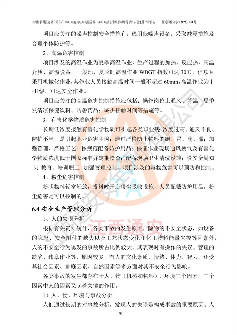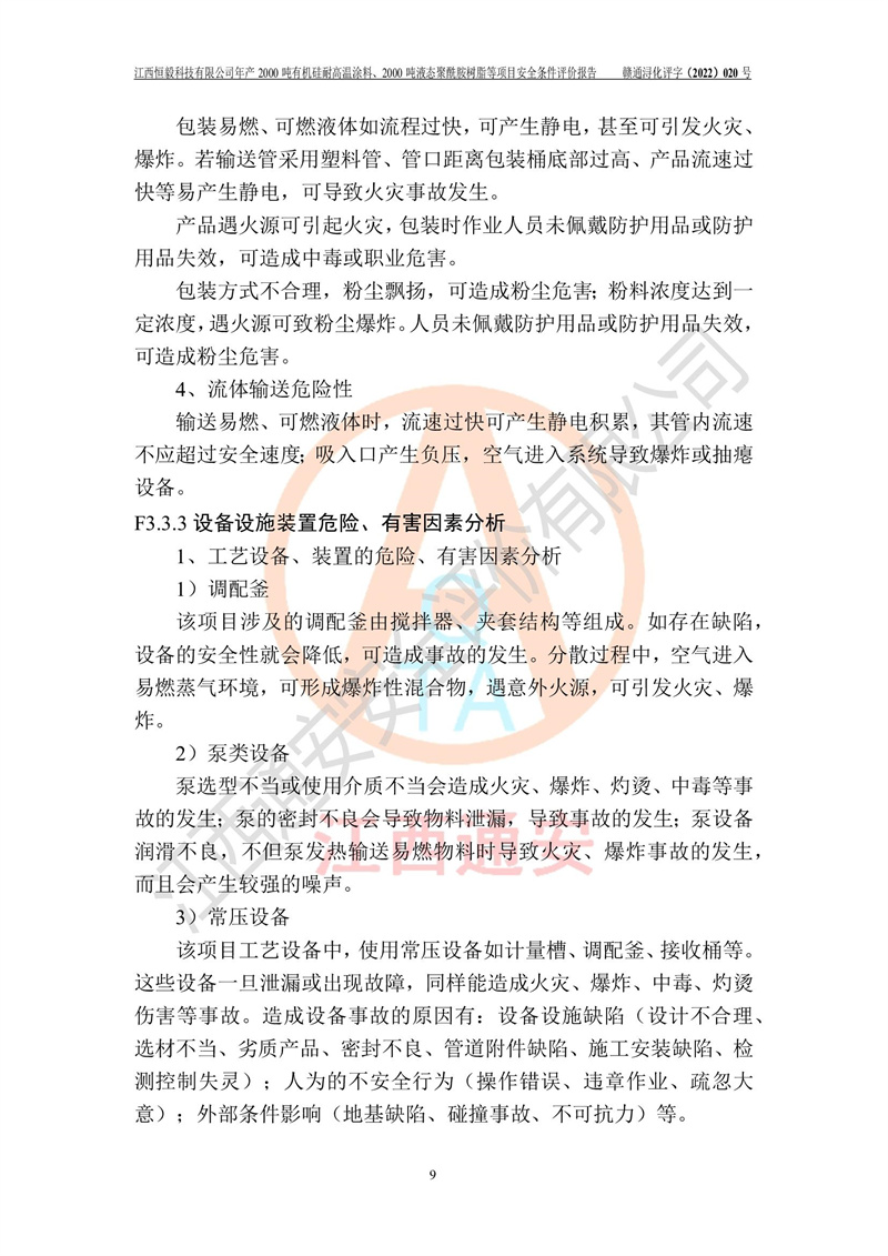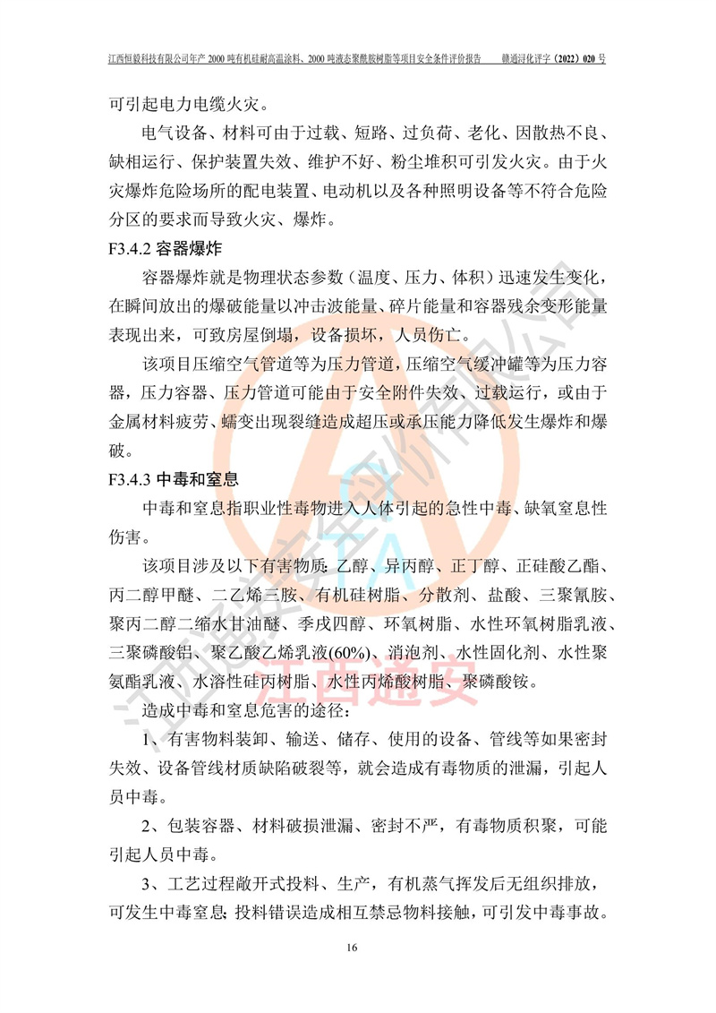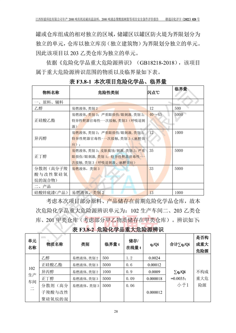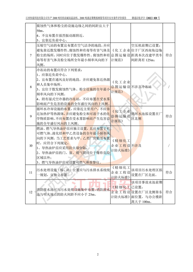 评价结论 | 江西恒毅科技有限公司年产2000吨有机硅耐高温涂料、2000吨液态聚酰胺树脂等项目的选址、总体布局、周边环境、自然环境能满足建设安全条件;项目选择的工艺过程及设备设施的安全可靠性能达到**法规、标准规定要求;项目存在的危险有害因素可控,在落实本评价报告提出的有关安全对策措施后,其危险有害程度能达到可以接受的程度,项目建设能够实现安 全运行的目标。 | ||||