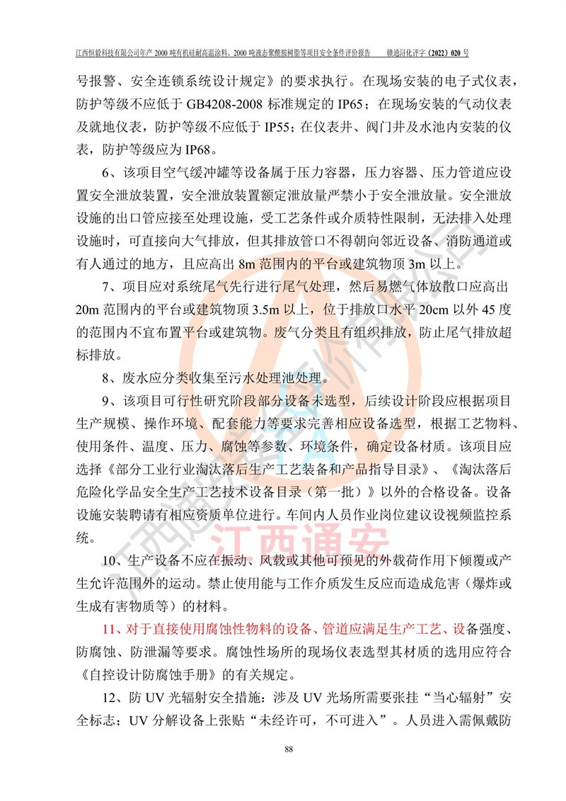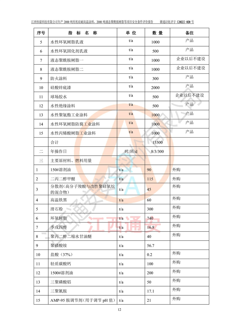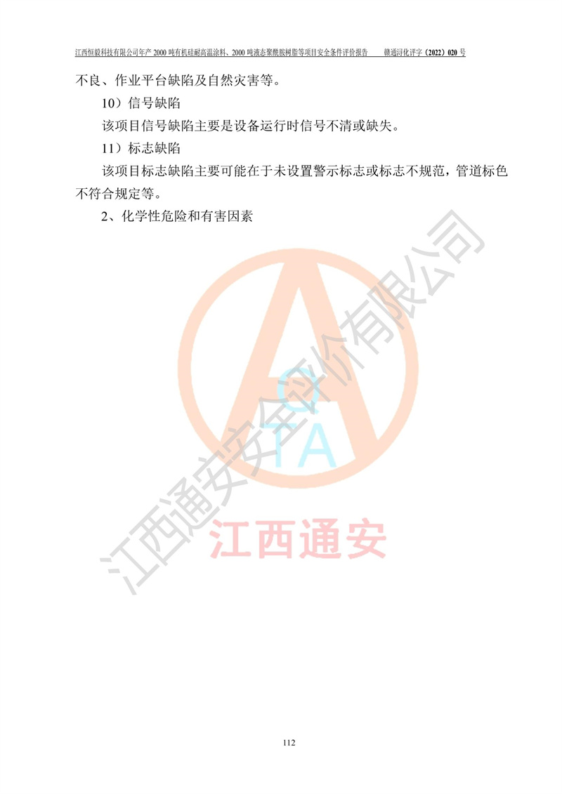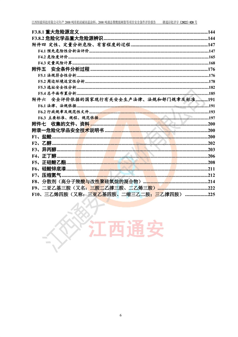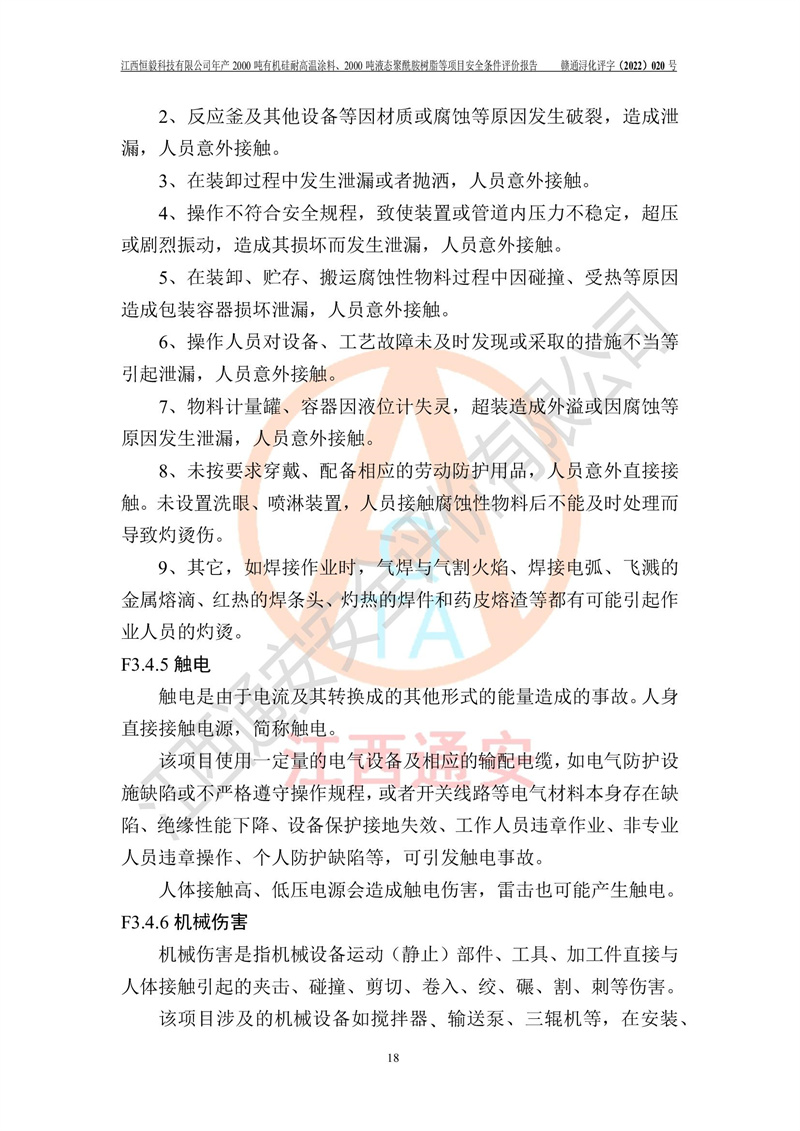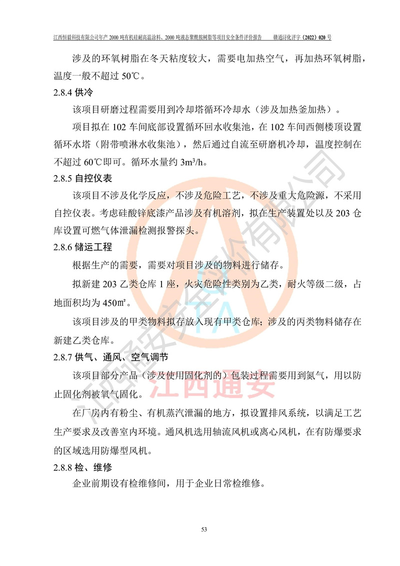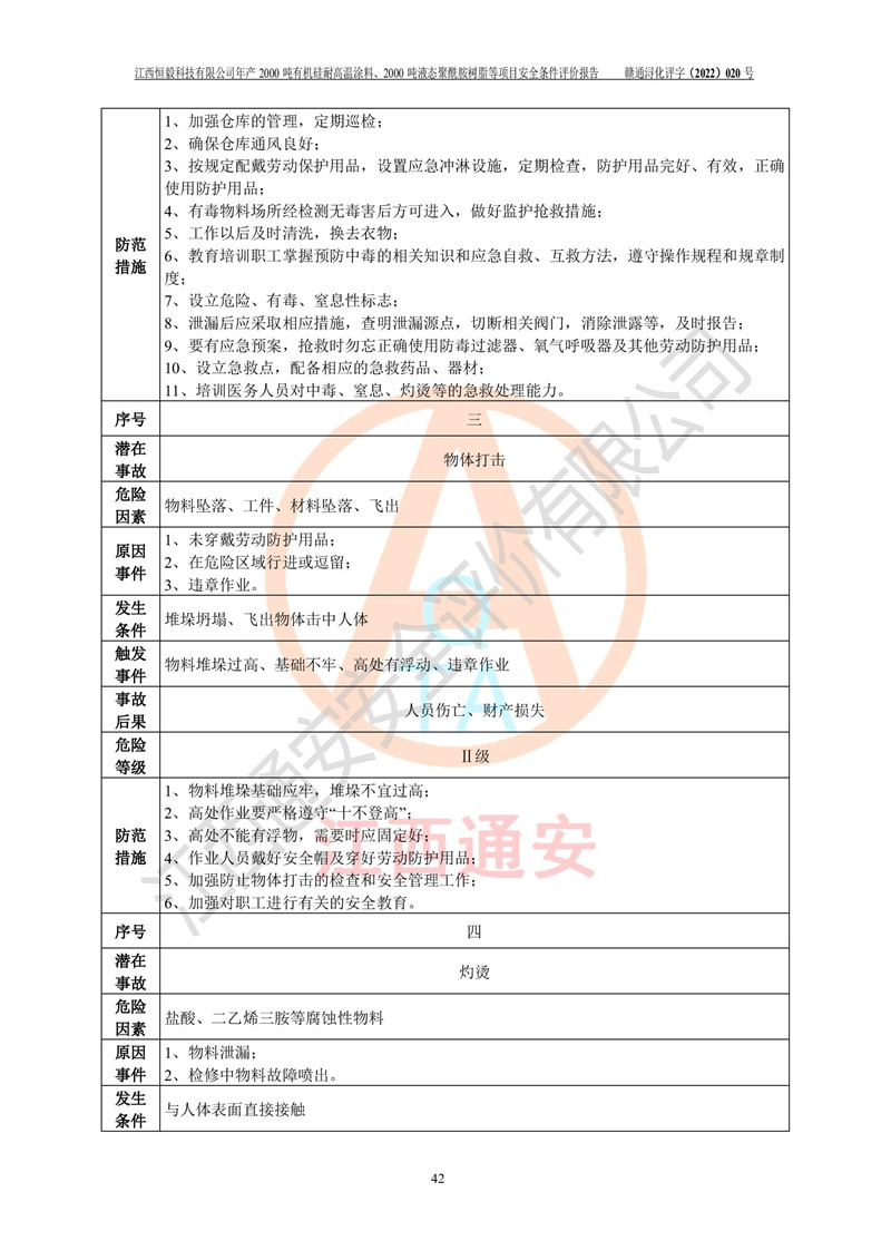评价结论 | 江西恒毅科技有限公司年产2000吨有机硅耐高温涂料、2000吨液态聚酰胺树脂等项目的选址、总体布局、周边环境、自然环境能满足建设安全条件;项目选择的工艺过程及设备设施的安全可靠性能达到**法规、标准规定要求;项目存在的危险有害因素可控,在落实本评价报告提出的有关安全对策措施后,其危险有害程度能达到可以接受的程度,项目建设能够实现安 全运行的目标。 | ||||