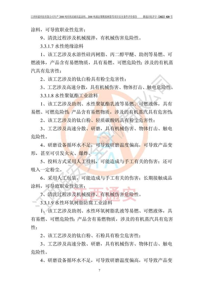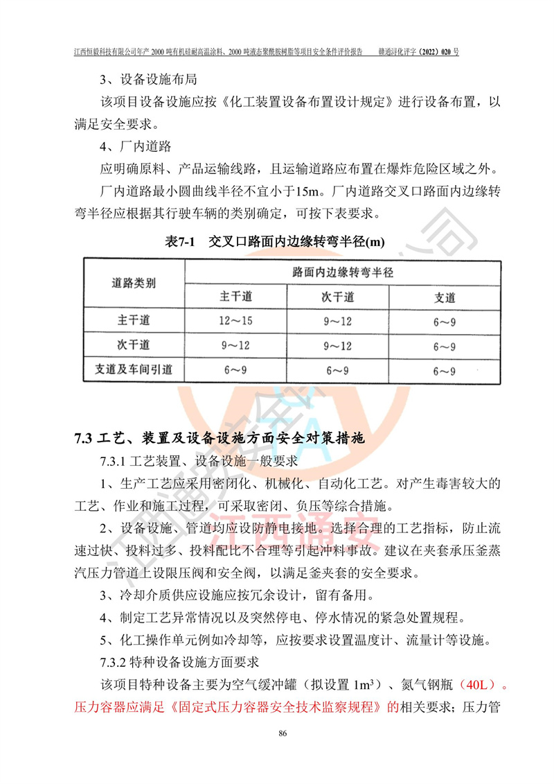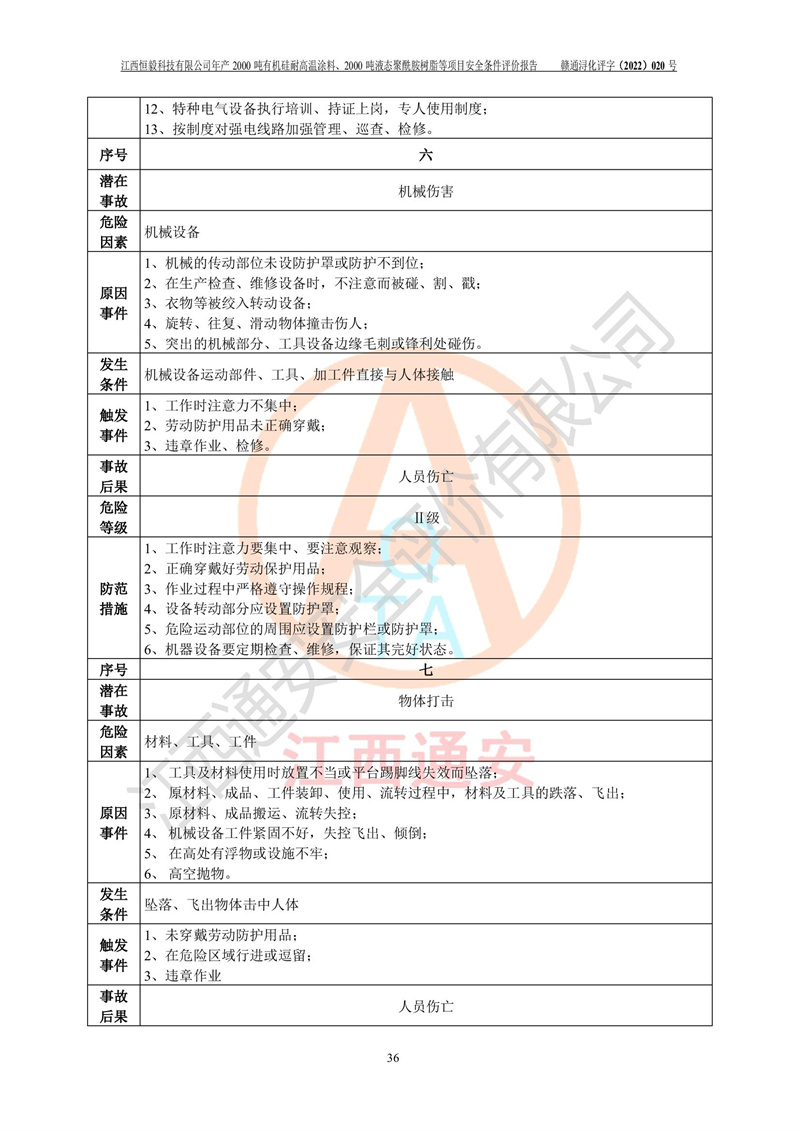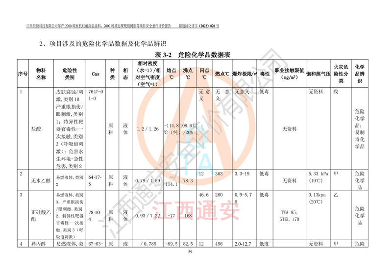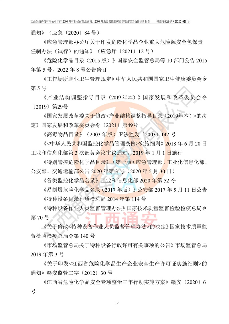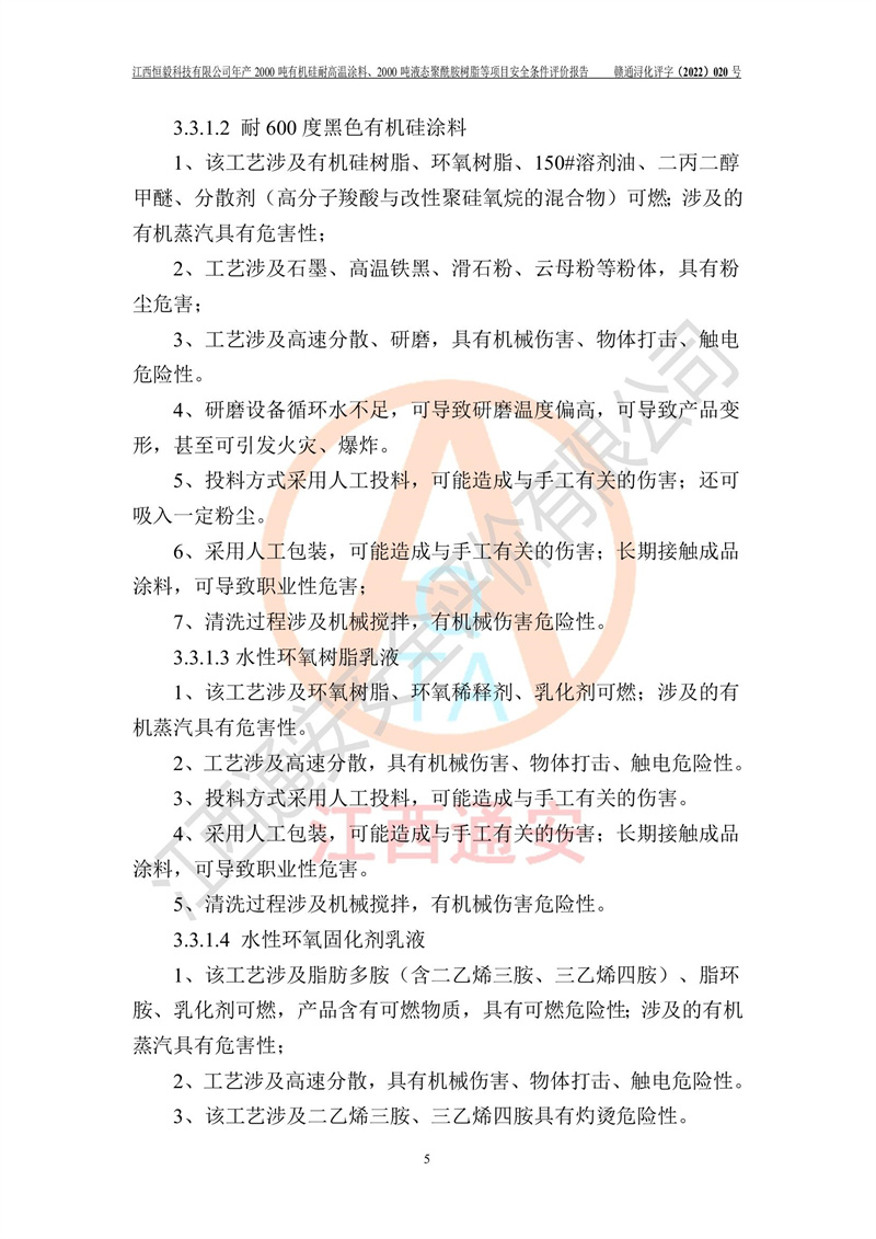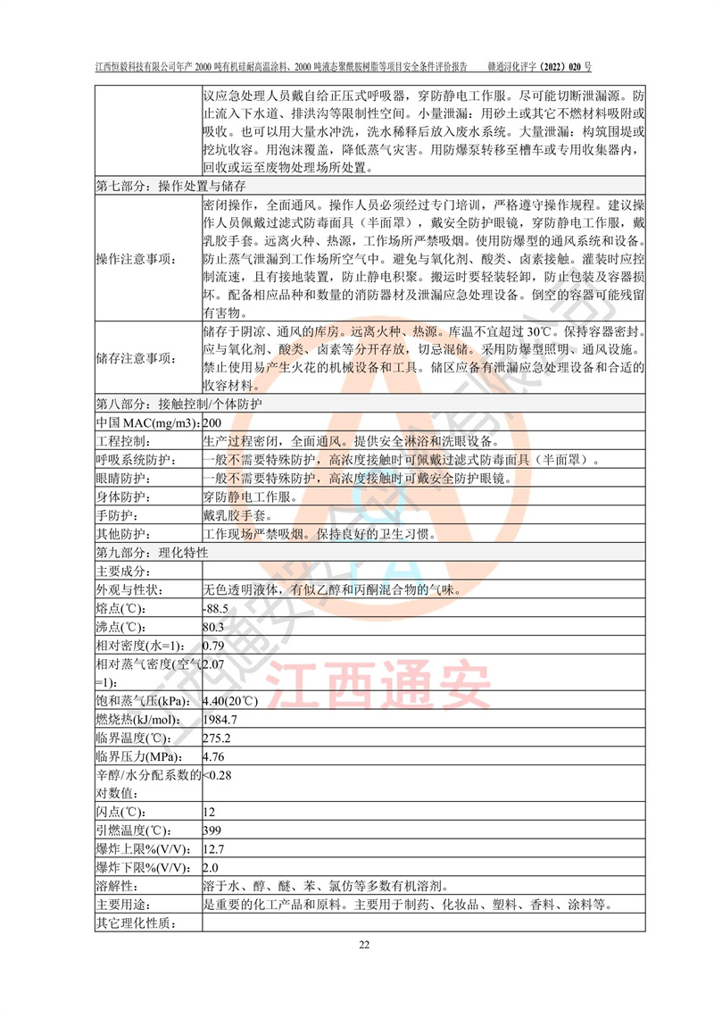 评价结论 | 江西恒毅科技有限公司年产2000吨有机硅耐高温涂料、2000吨液态聚酰胺树脂等项目的选址、总体布局、周边环境、自然环境能满足建设安全条件;项目选择的工艺过程及设备设施的安全可靠性能达到**法规、标准规定要求;项目存在的危险有害因素可控,在落实本评价报告提出的有关安全对策措施后,其危险有害程度能达到可以接受的程度,项目建设能够实现安 全运行的目标。 | ||||