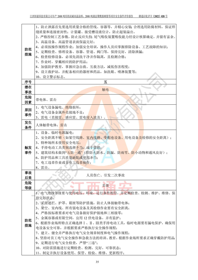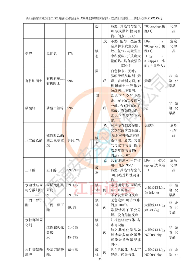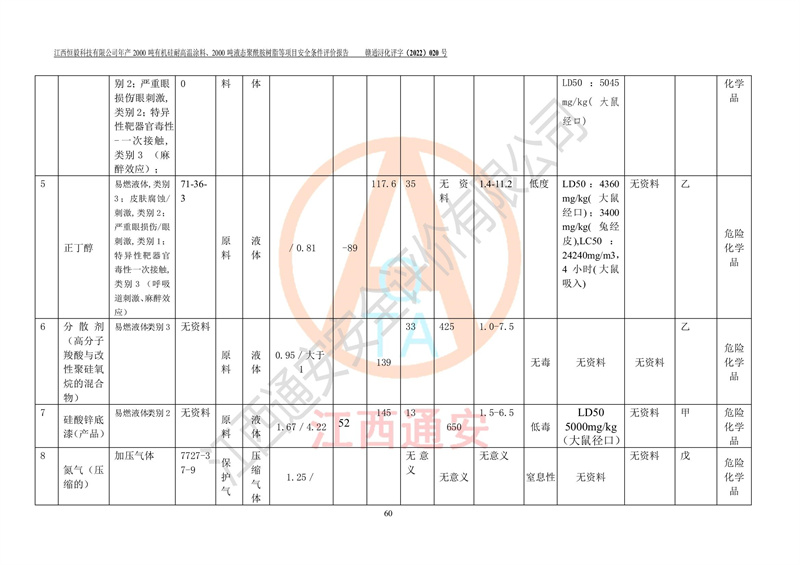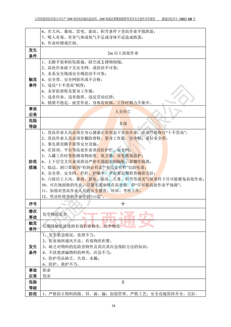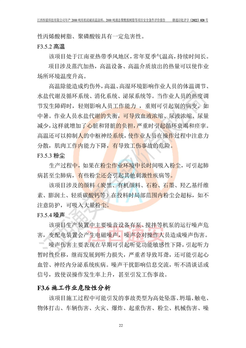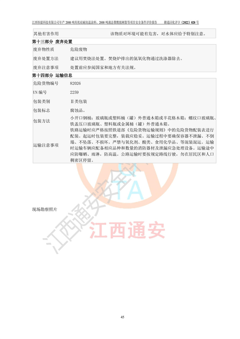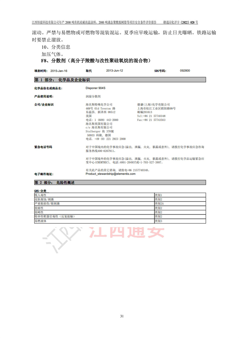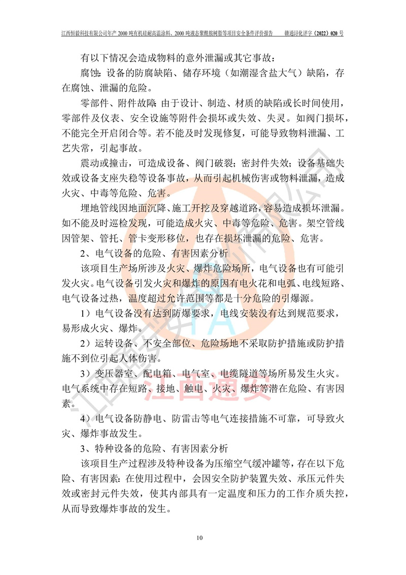 评价结论 | 江西恒毅科技有限公司年产2000吨有机硅耐高温涂料、2000吨液态聚酰胺树脂等项目的选址、总体布局、周边环境、自然环境能满足建设安全条件;项目选择的工艺过程及设备设施的安全可靠性能达到**法规、标准规定要求;项目存在的危险有害因素可控,在落实本评价报告提出的有关安全对策措施后,其危险有害程度能达到可以接受的程度,项目建设能够实现安 全运行的目标。 | ||||