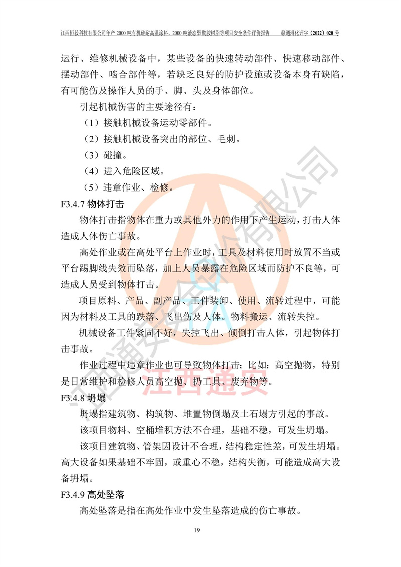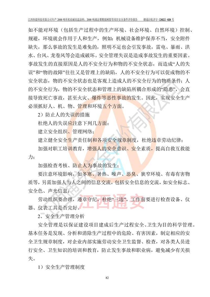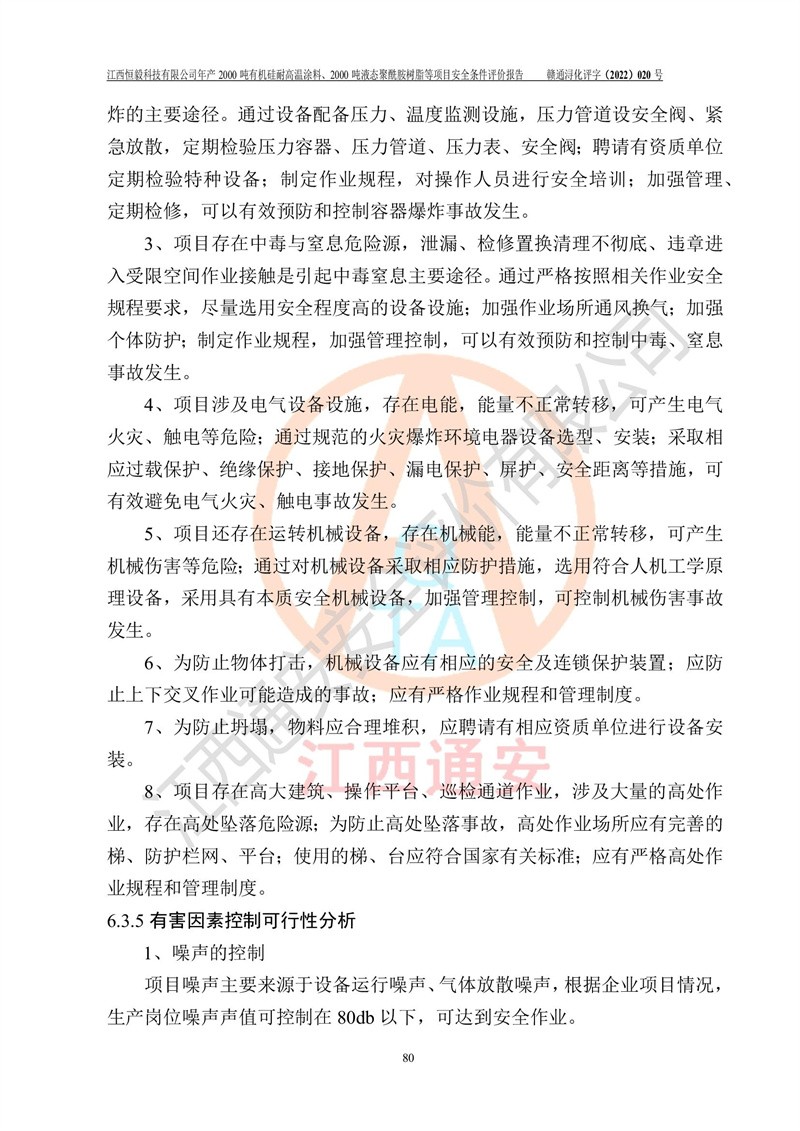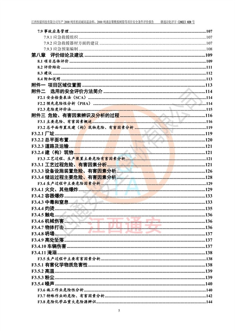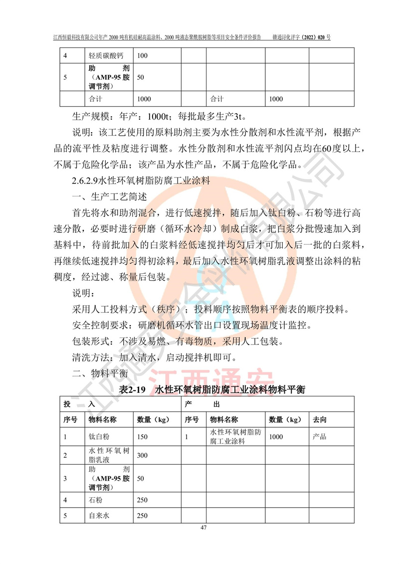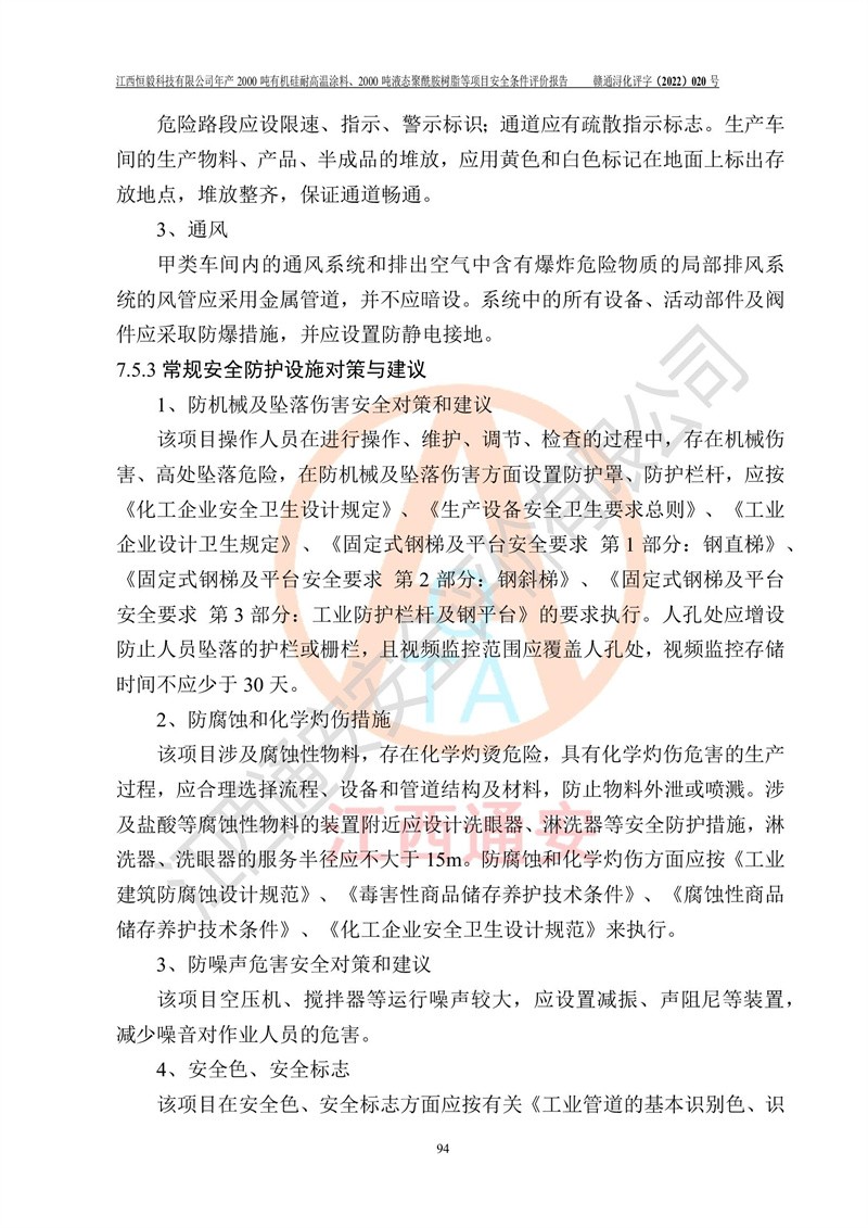 评价结论 | 江西恒毅科技有限公司年产2000吨有机硅耐高温涂料、2000吨液态聚酰胺树脂等项目的选址、总体布局、周边环境、自然环境能满足建设安全条件;项目选择的工艺过程及设备设施的安全可靠性能达到**法规、标准规定要求;项目存在的危险有害因素可控,在落实本评价报告提出的有关安全对策措施后,其危险有害程度能达到可以接受的程度,项目建设能够实现安 全运行的目标。 | ||||