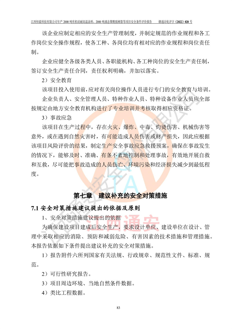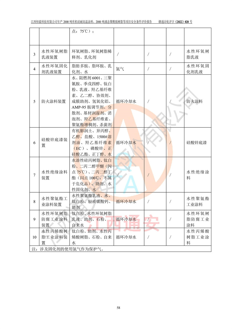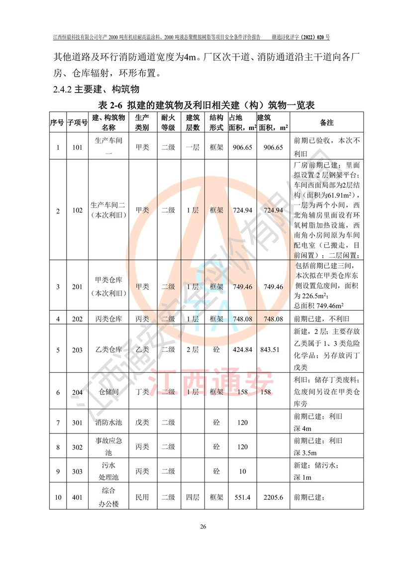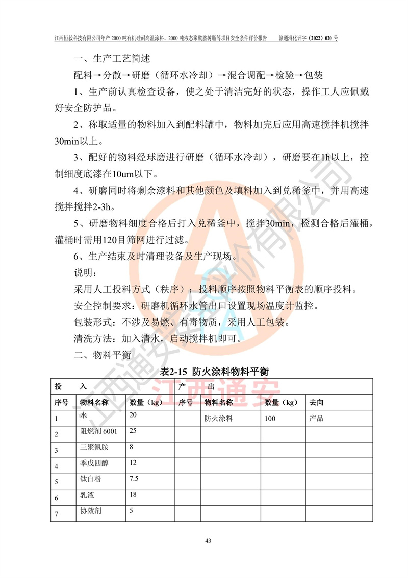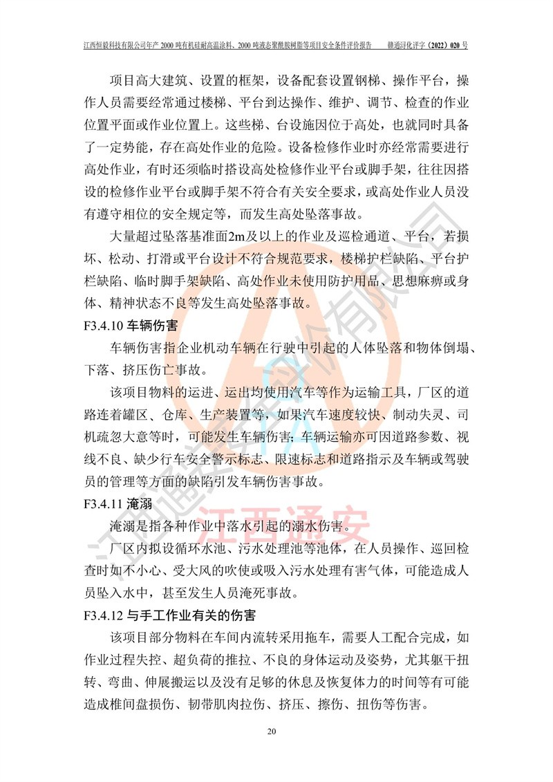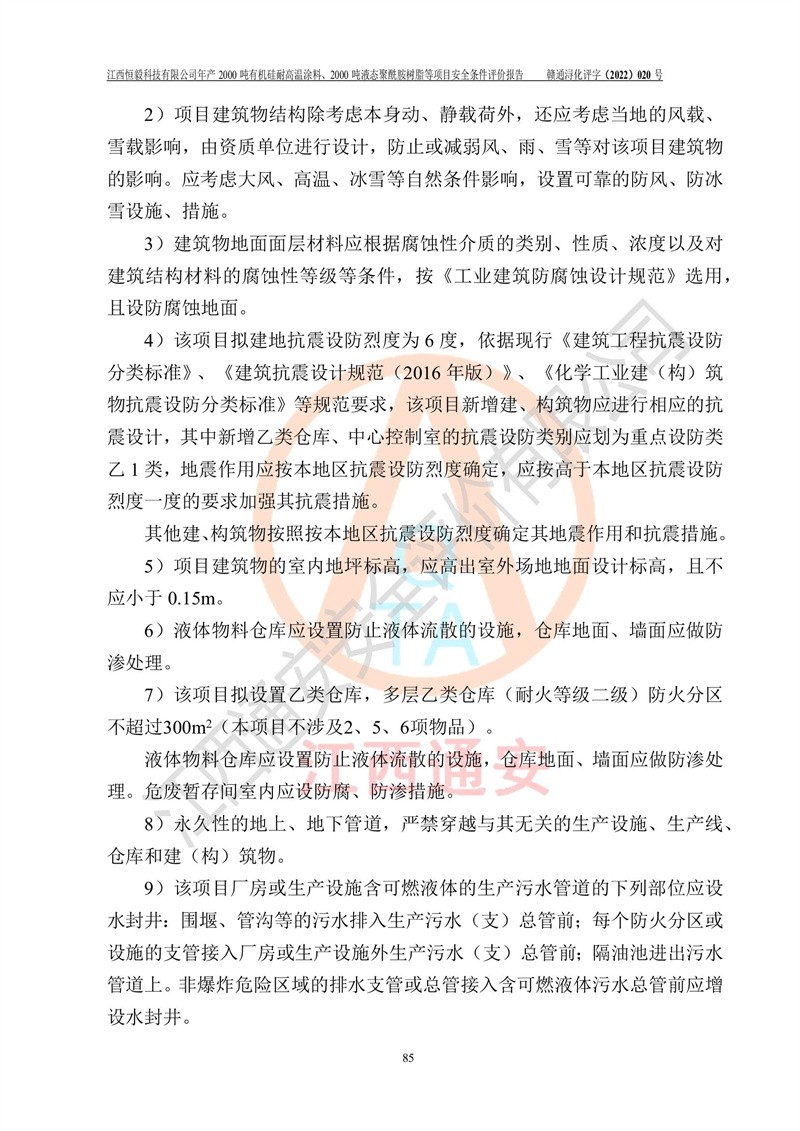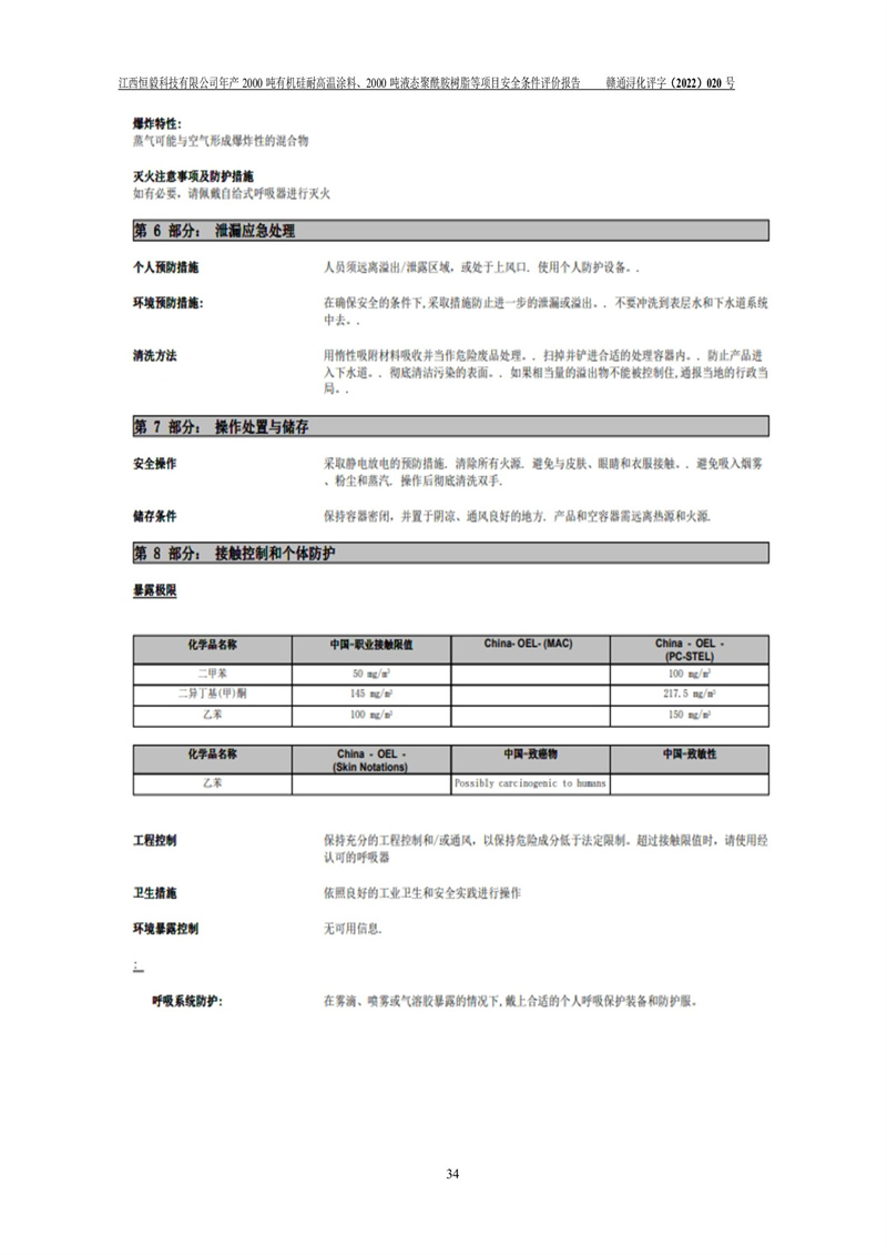 评价结论 | 江西恒毅科技有限公司年产2000吨有机硅耐高温涂料、2000吨液态聚酰胺树脂等项目的选址、总体布局、周边环境、自然环境能满足建设安全条件;项目选择的工艺过程及设备设施的安全可靠性能达到**法规、标准规定要求;项目存在的危险有害因素可控,在落实本评价报告提出的有关安全对策措施后,其危险有害程度能达到可以接受的程度,项目建设能够实现安 全运行的目标。 | ||||