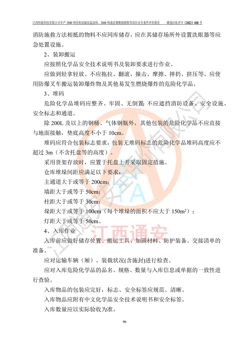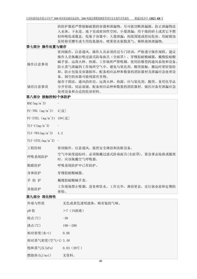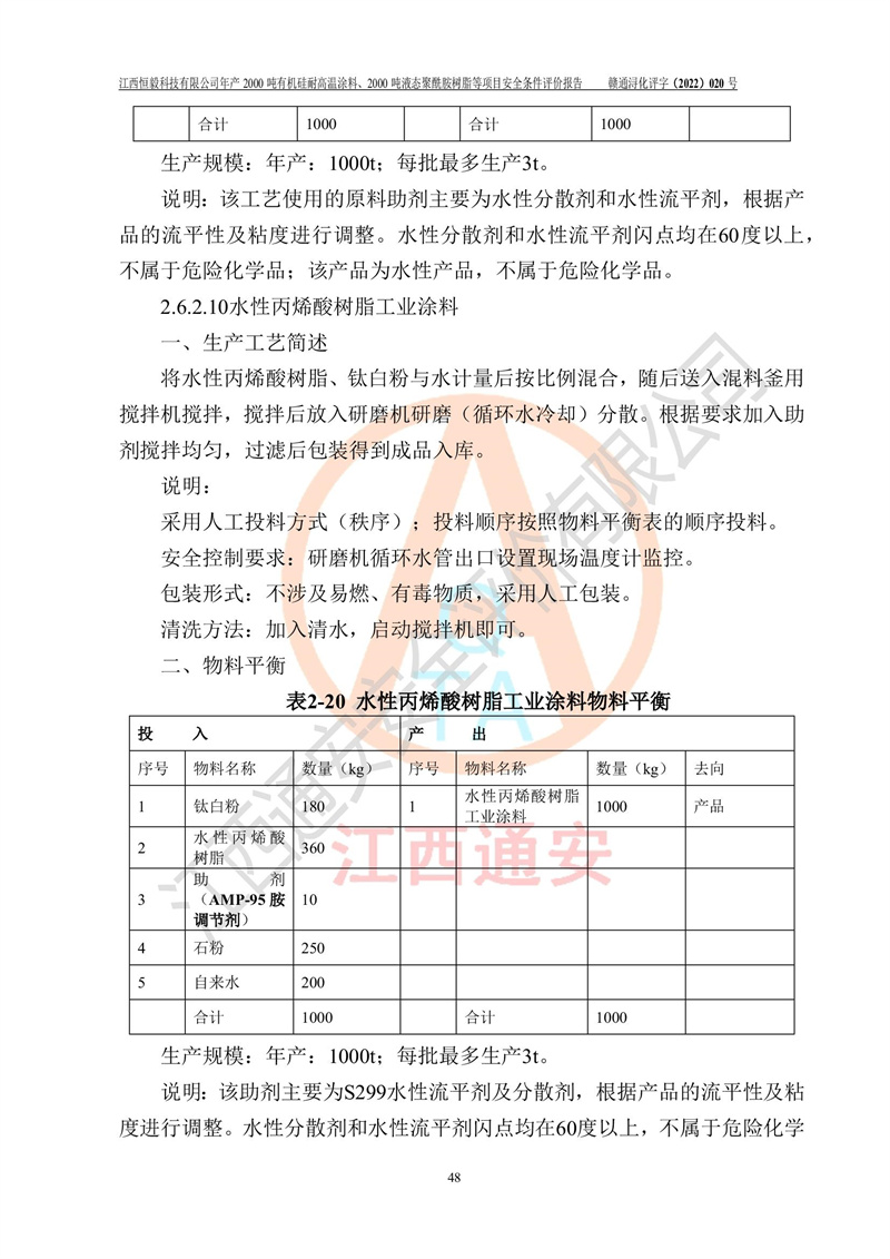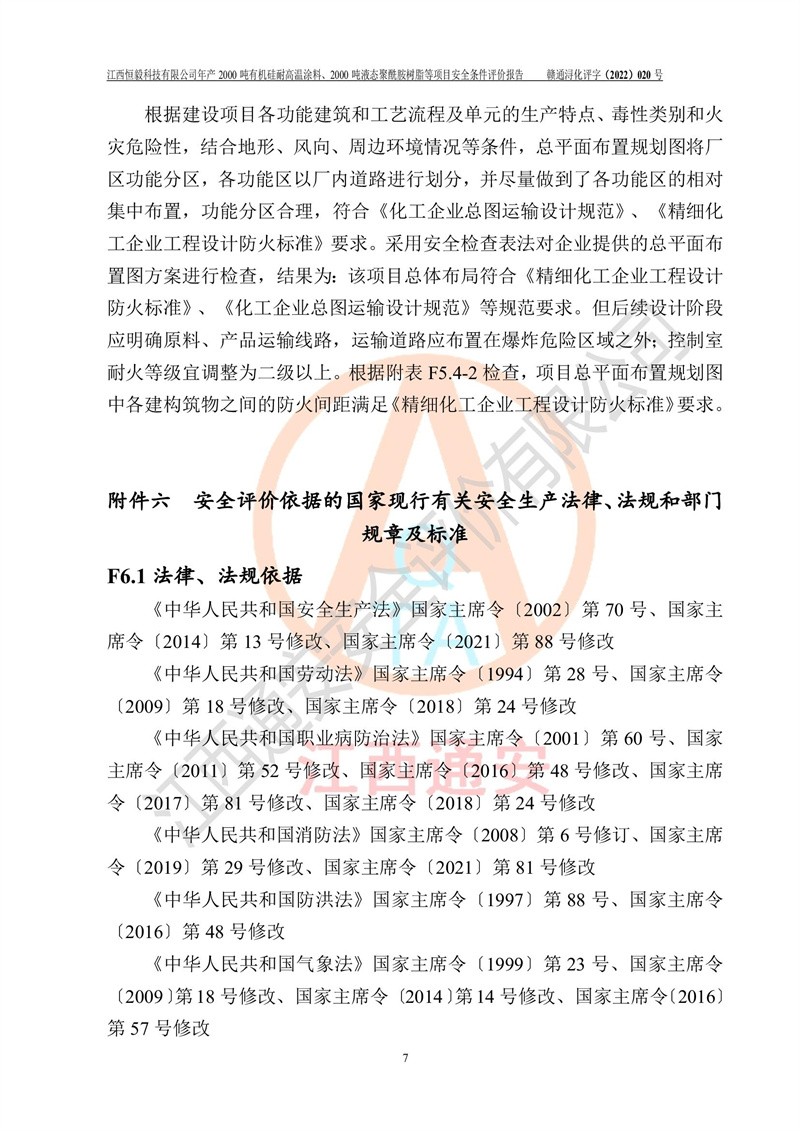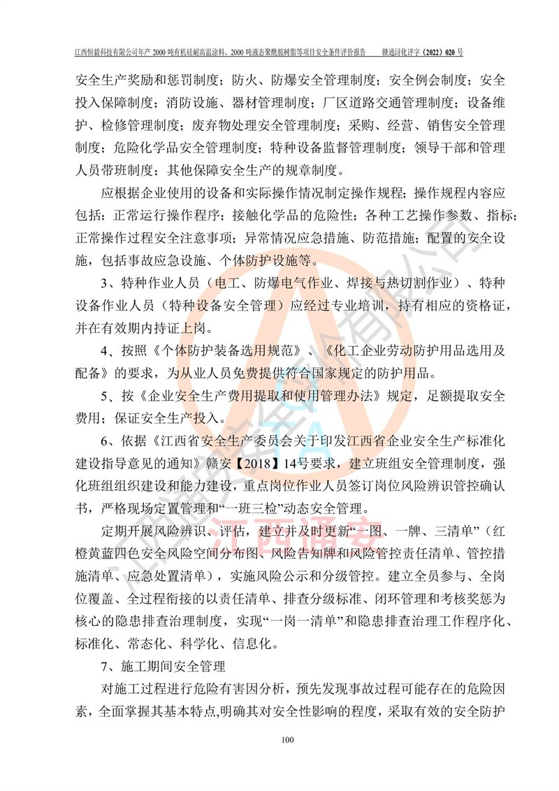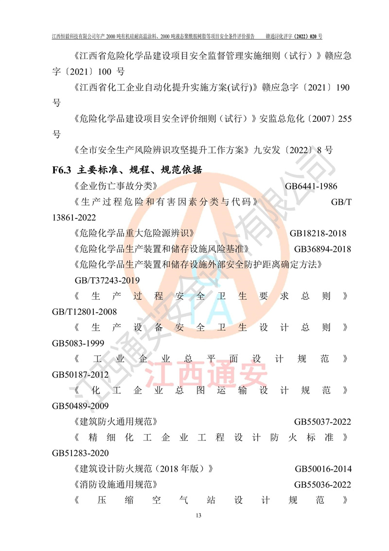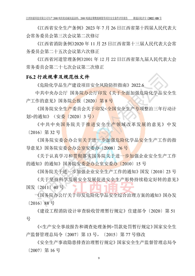 评价结论 | 江西恒毅科技有限公司年产2000吨有机硅耐高温涂料、2000吨液态聚酰胺树脂等项目的选址、总体布局、周边环境、自然环境能满足建设安全条件;项目选择的工艺过程及设备设施的安全可靠性能达到**法规、标准规定要求;项目存在的危险有害因素可控,在落实本评价报告提出的有关安全对策措施后,其危险有害程度能达到可以接受的程度,项目建设能够实现安 全运行的目标。 | ||||