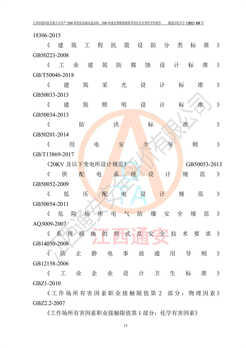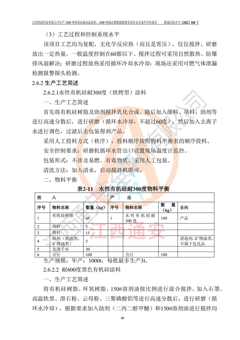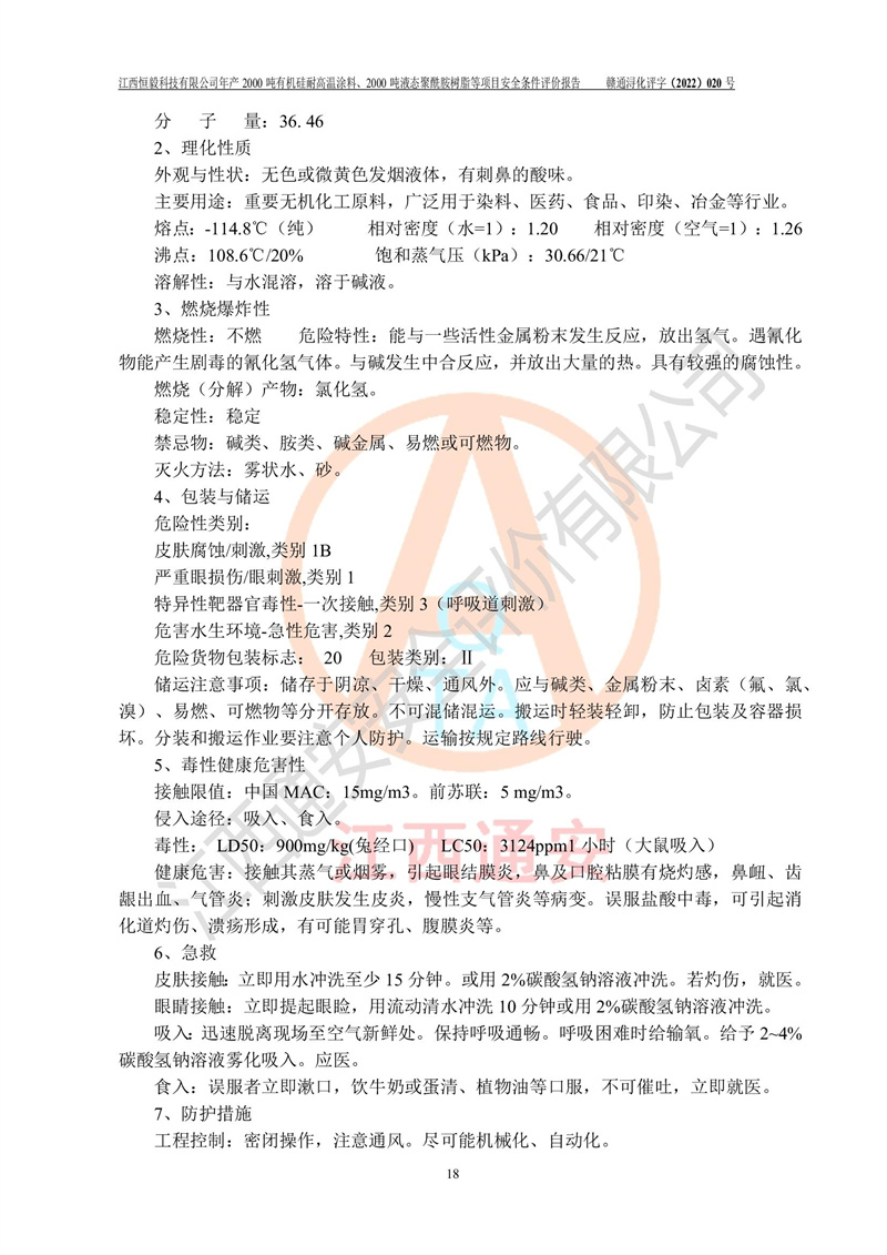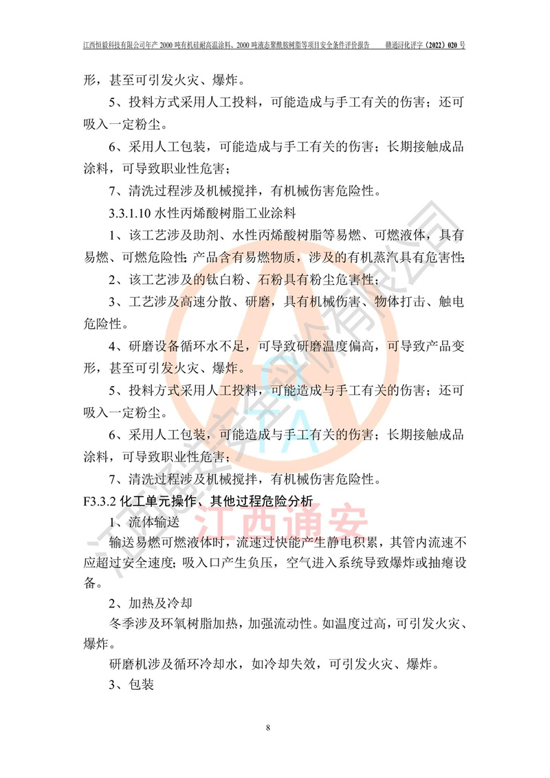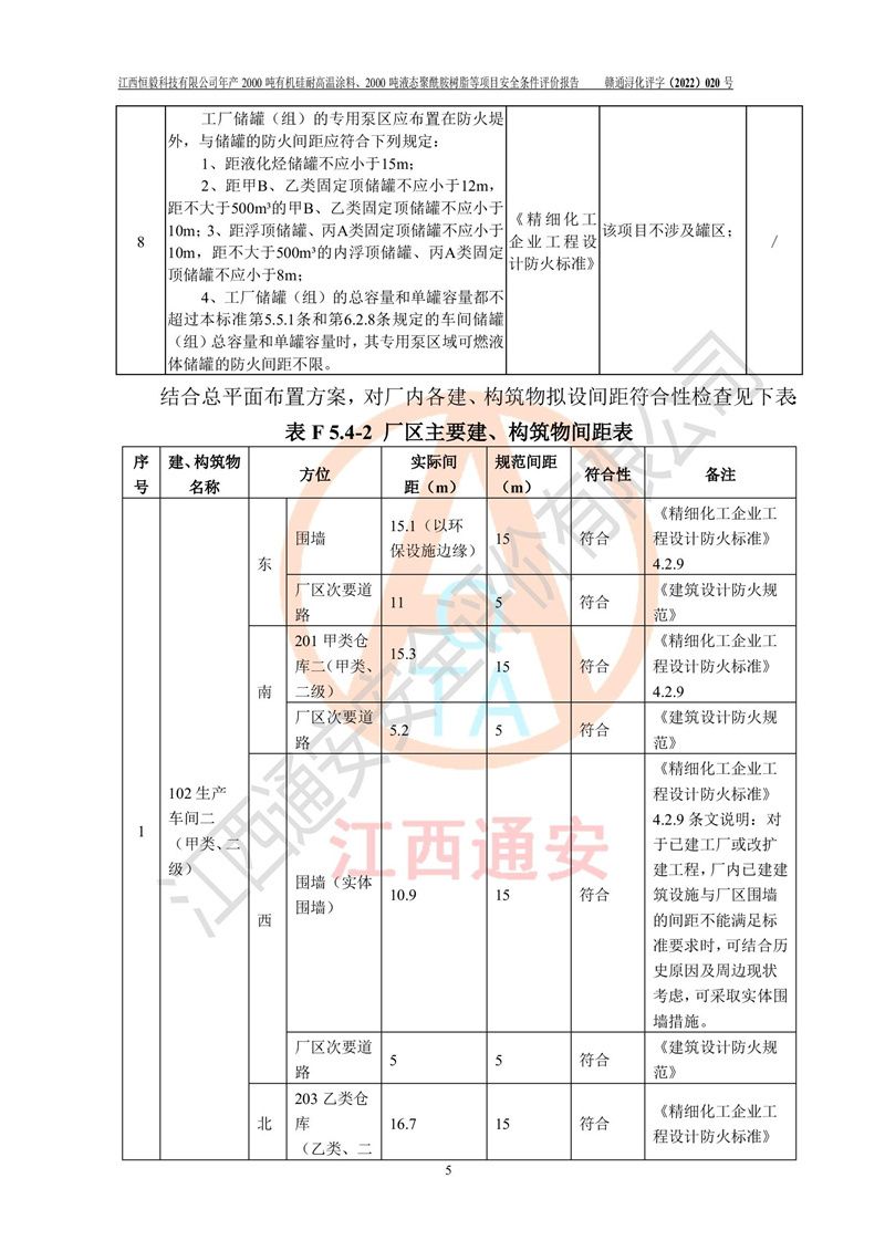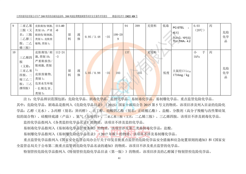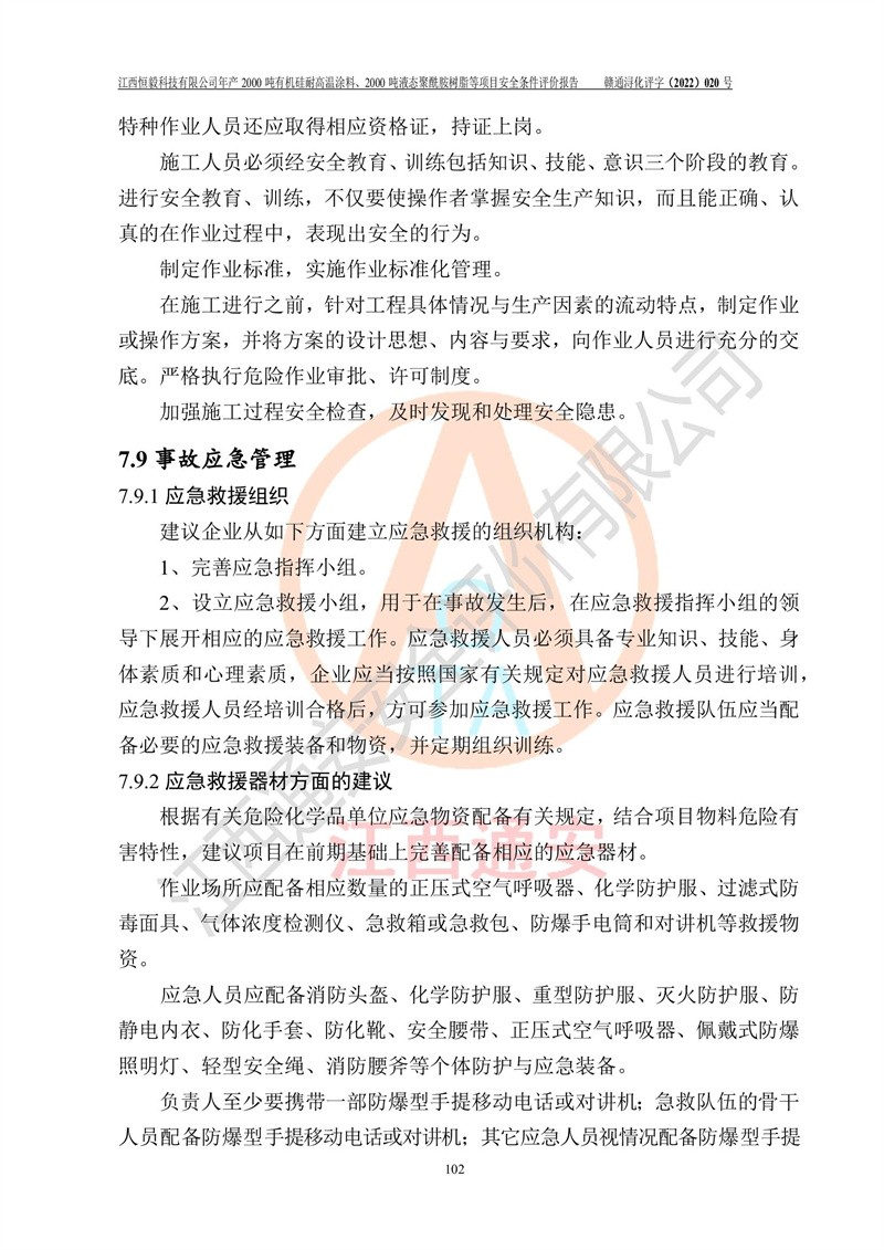 评价结论 | 江西恒毅科技有限公司年产2000吨有机硅耐高温涂料、2000吨液态聚酰胺树脂等项目的选址、总体布局、周边环境、自然环境能满足建设安全条件;项目选择的工艺过程及设备设施的安全可靠性能达到**法规、标准规定要求;项目存在的危险有害因素可控,在落实本评价报告提出的有关安全对策措施后,其危险有害程度能达到可以接受的程度,项目建设能够实现安 全运行的目标。 | ||||