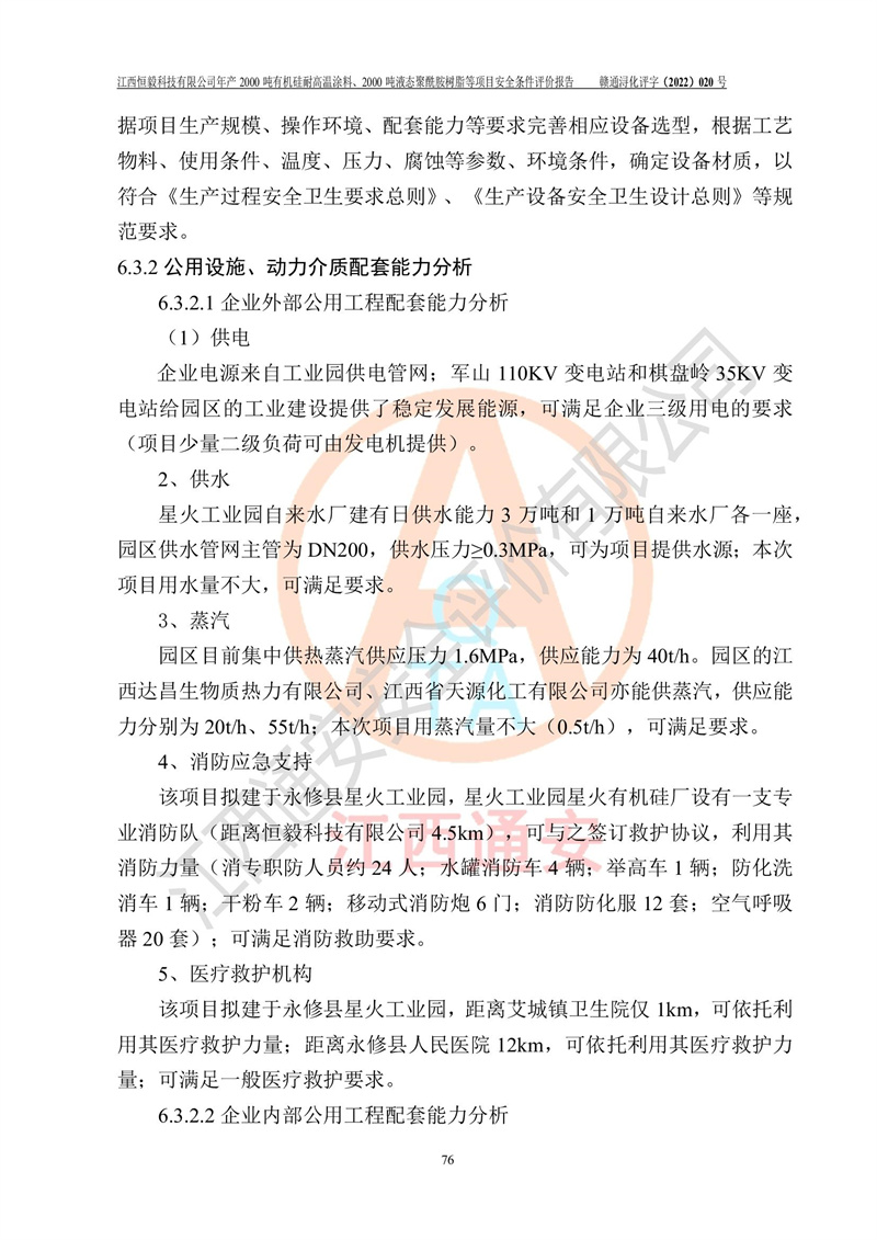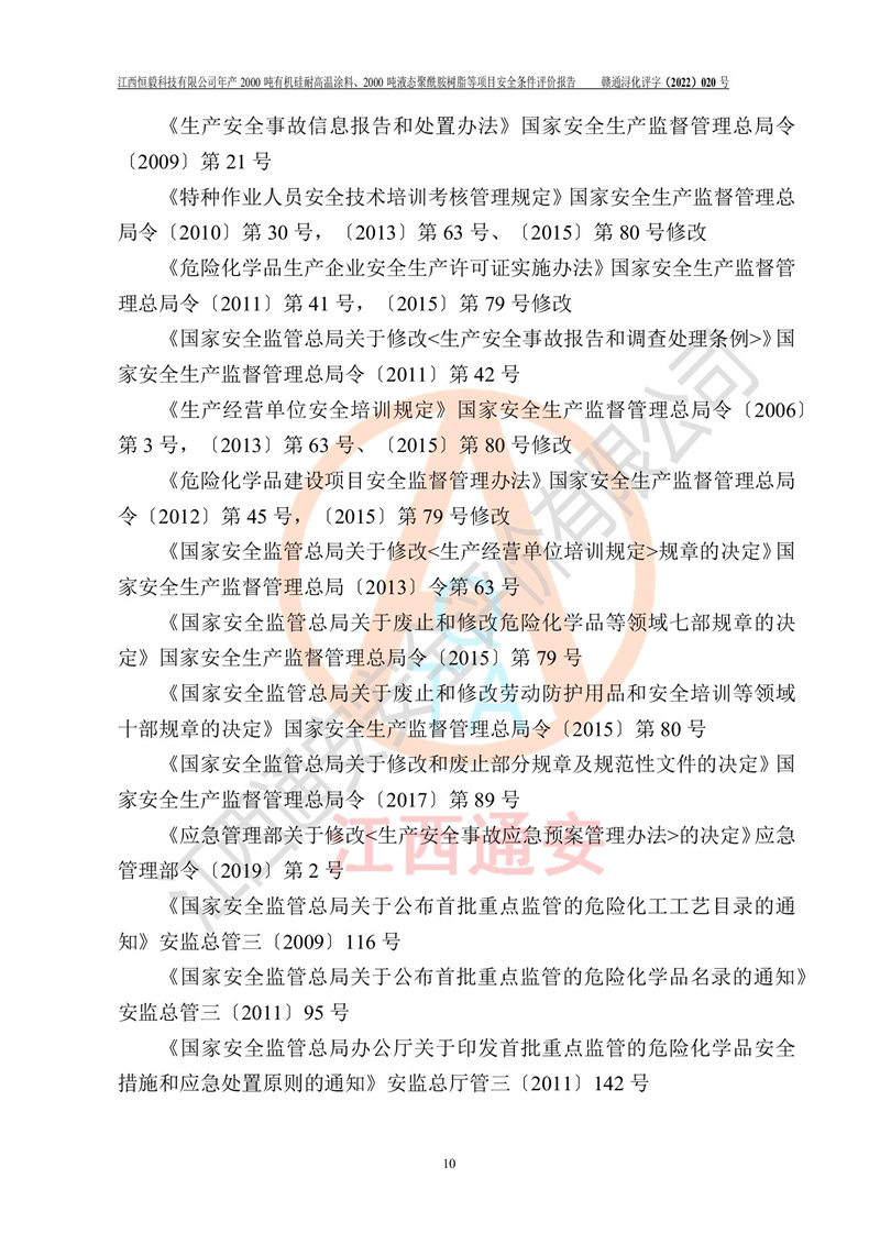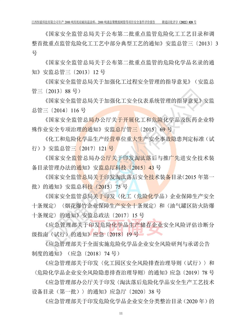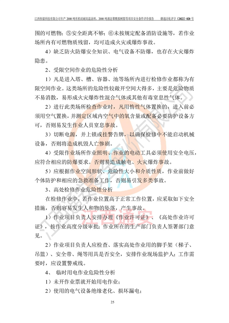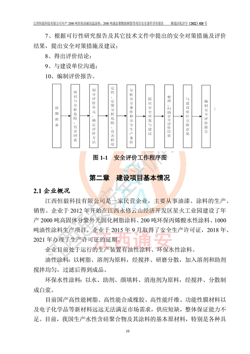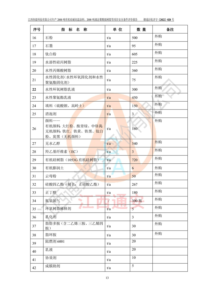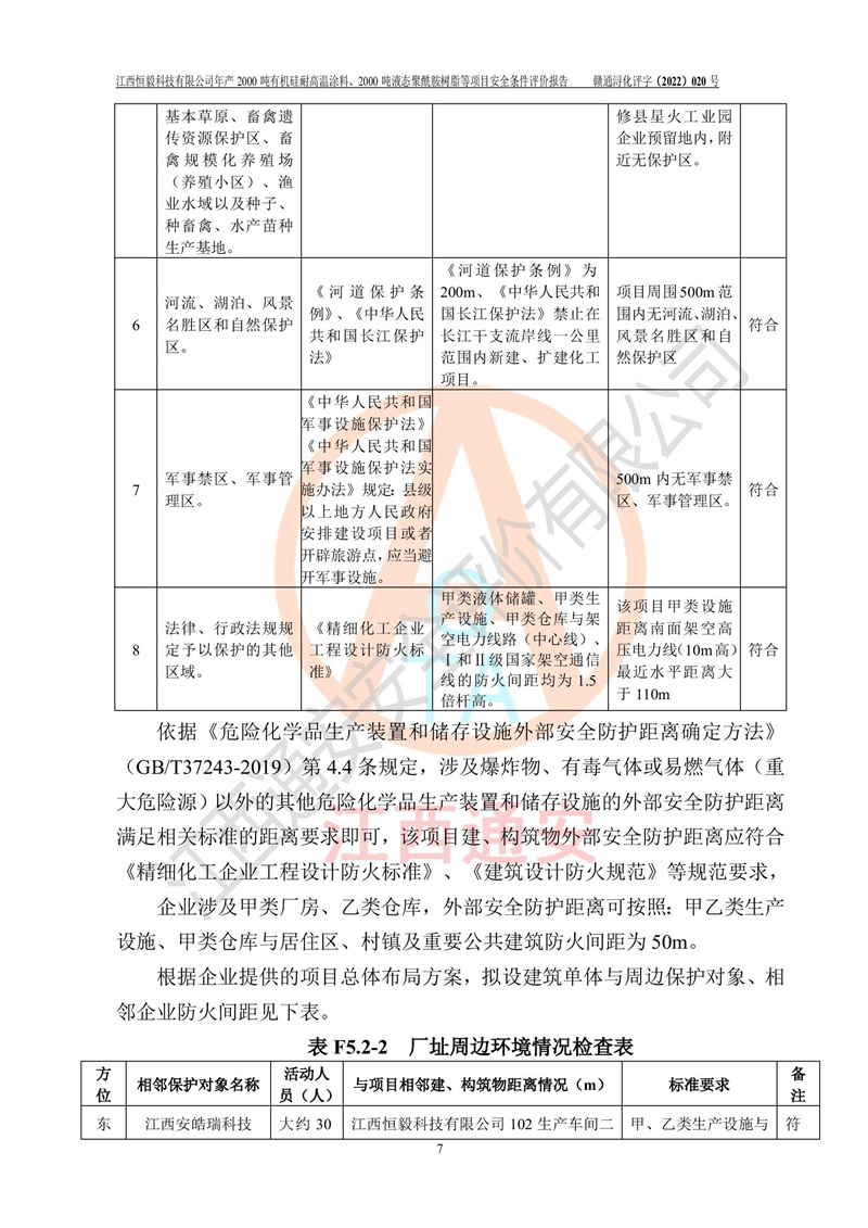 评价结论 | 江西恒毅科技有限公司年产2000吨有机硅耐高温涂料、2000吨液态聚酰胺树脂等项目的选址、总体布局、周边环境、自然环境能满足建设安全条件;项目选择的工艺过程及设备设施的安全可靠性能达到**法规、标准规定要求;项目存在的危险有害因素可控,在落实本评价报告提出的有关安全对策措施后,其危险有害程度能达到可以接受的程度,项目建设能够实现安 全运行的目标。 | ||||
