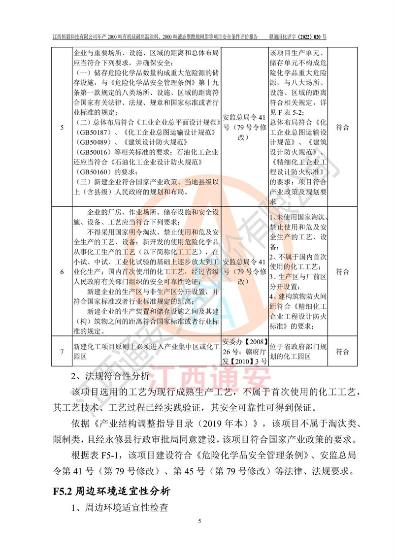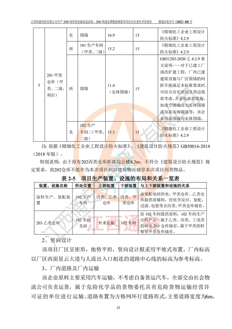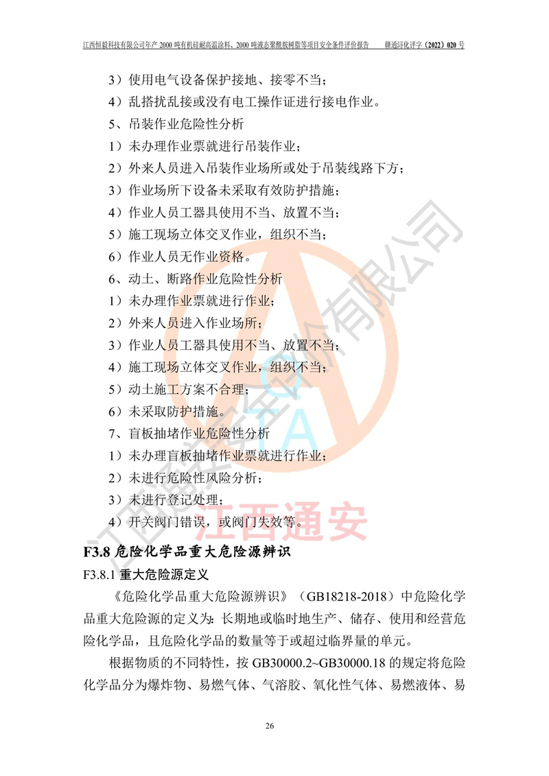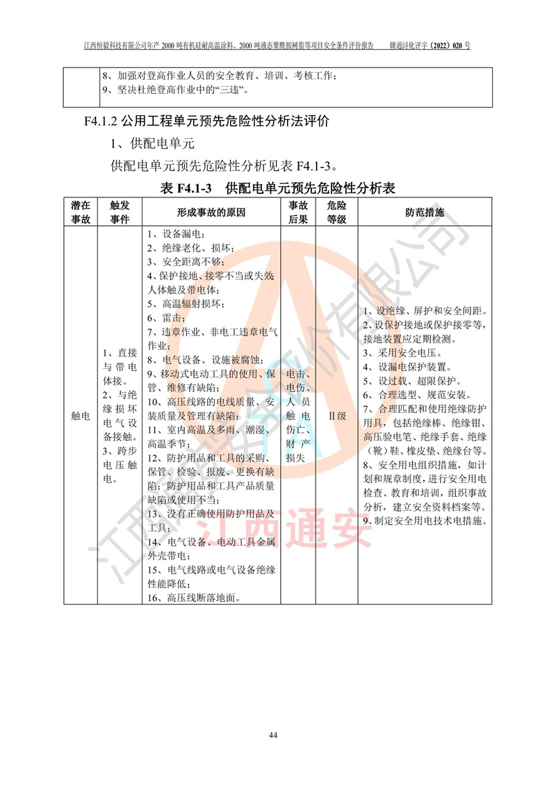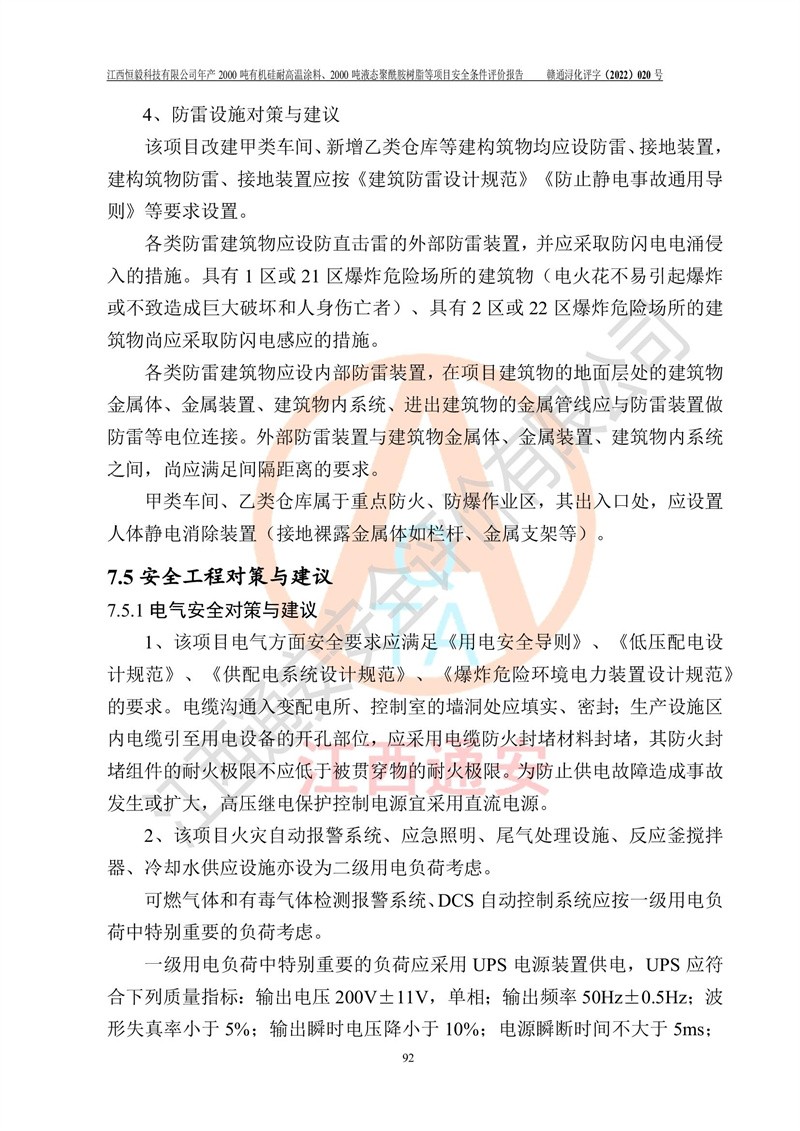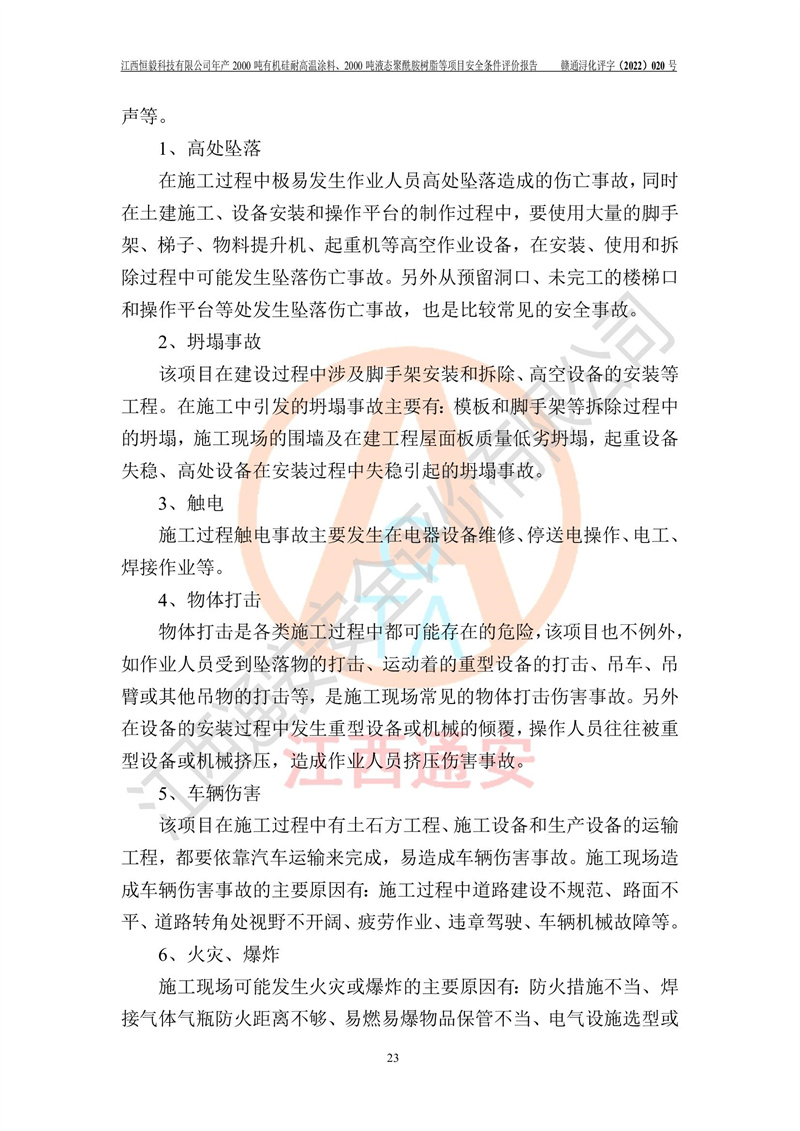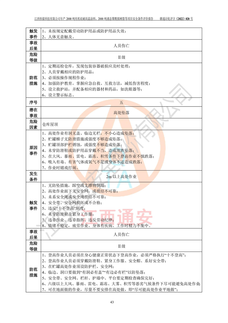 评价结论 | 江西恒毅科技有限公司年产2000吨有机硅耐高温涂料、2000吨液态聚酰胺树脂等项目的选址、总体布局、周边环境、自然环境能满足建设安全条件;项目选择的工艺过程及设备设施的安全可靠性能达到**法规、标准规定要求;项目存在的危险有害因素可控,在落实本评价报告提出的有关安全对策措施后,其危险有害程度能达到可以接受的程度,项目建设能够实现安 全运行的目标。 | ||||