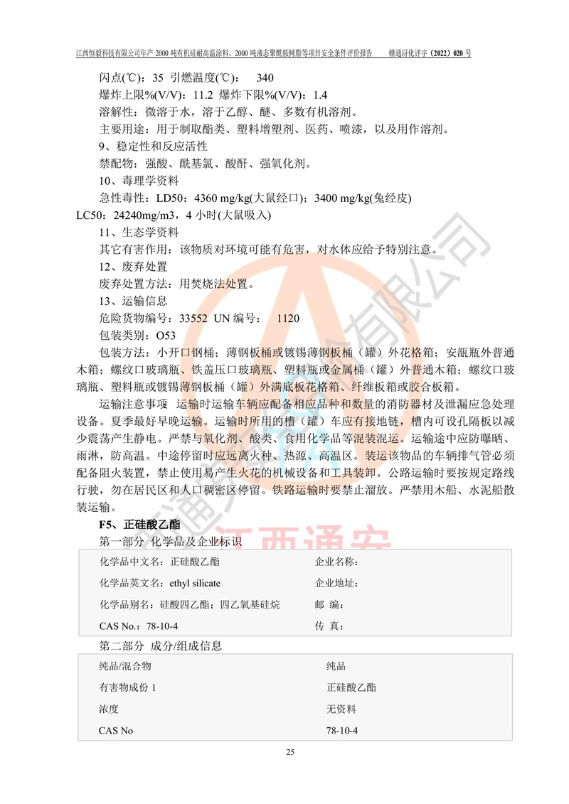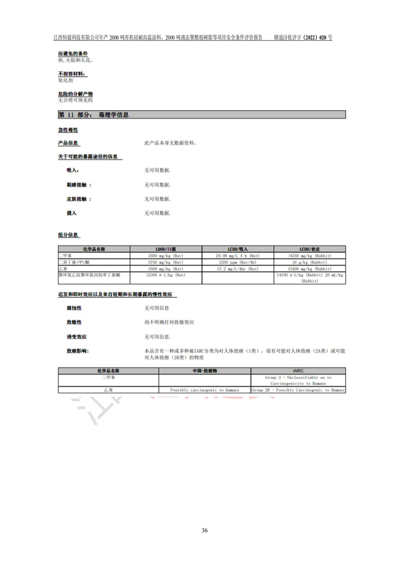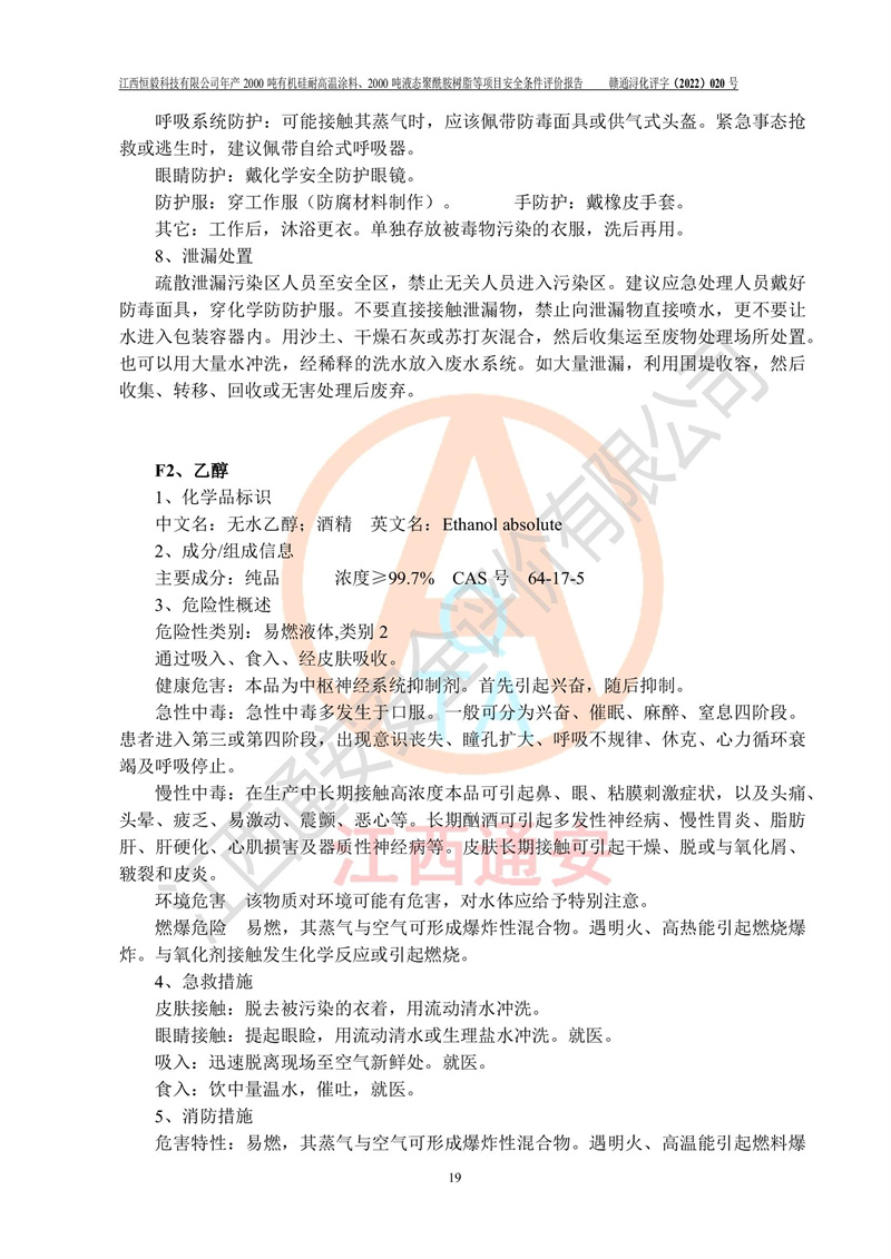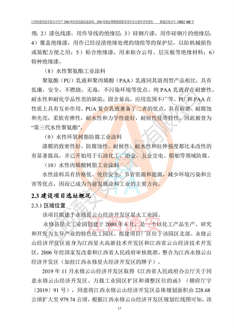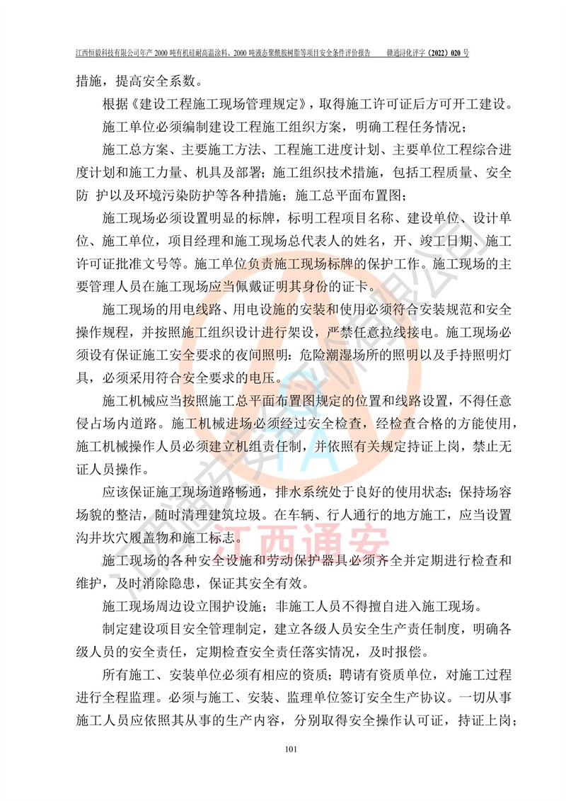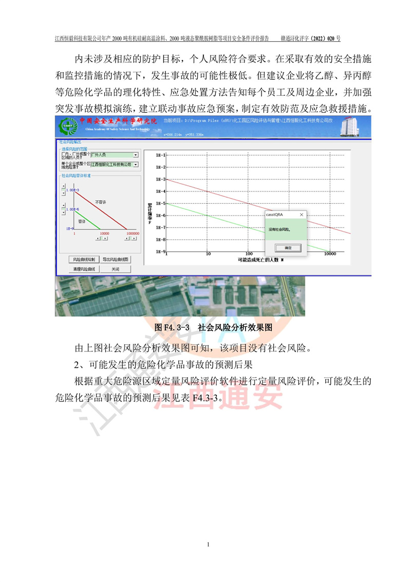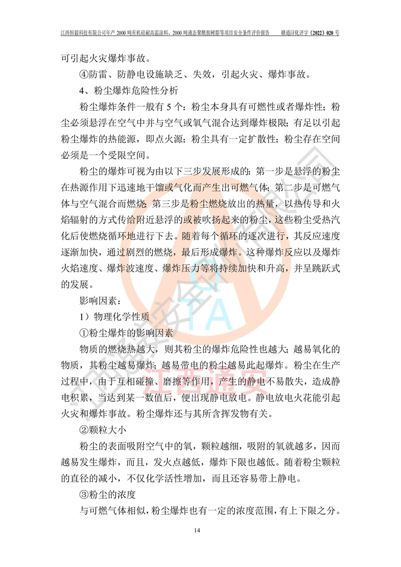 评价结论 | 江西恒毅科技有限公司年产2000吨有机硅耐高温涂料、2000吨液态聚酰胺树脂等项目的选址、总体布局、周边环境、自然环境能满足建设安全条件;项目选择的工艺过程及设备设施的安全可靠性能达到**法规、标准规定要求;项目存在的危险有害因素可控,在落实本评价报告提出的有关安全对策措施后,其危险有害程度能达到可以接受的程度,项目建设能够实现安 全运行的目标。 | ||||