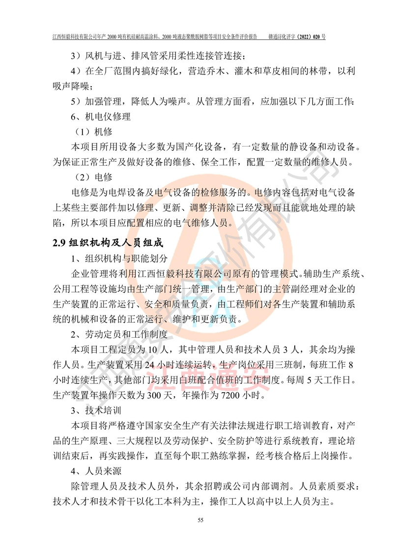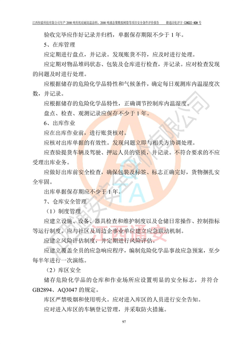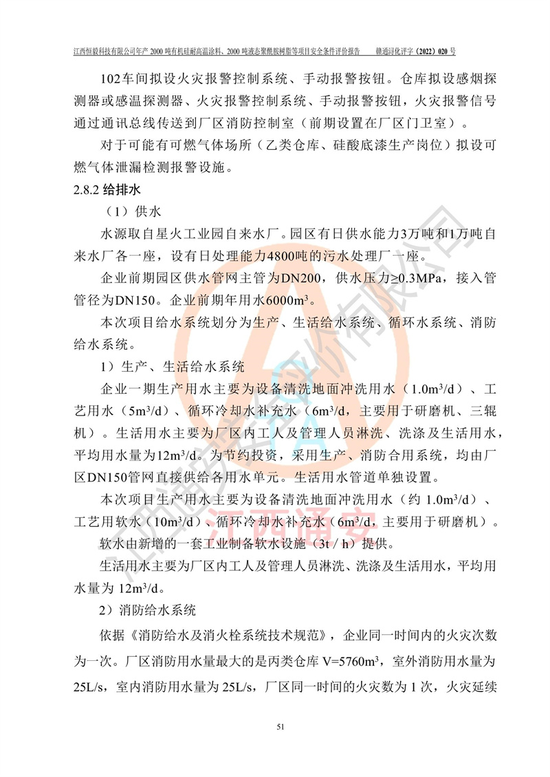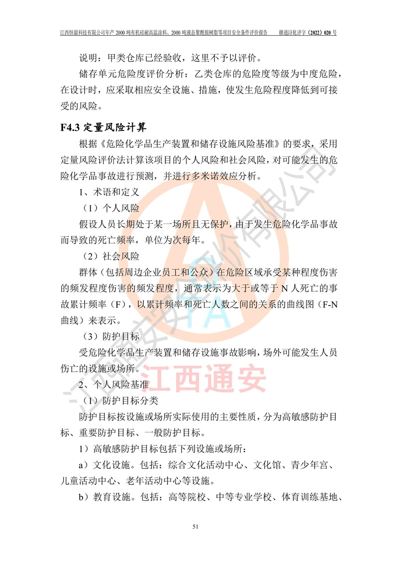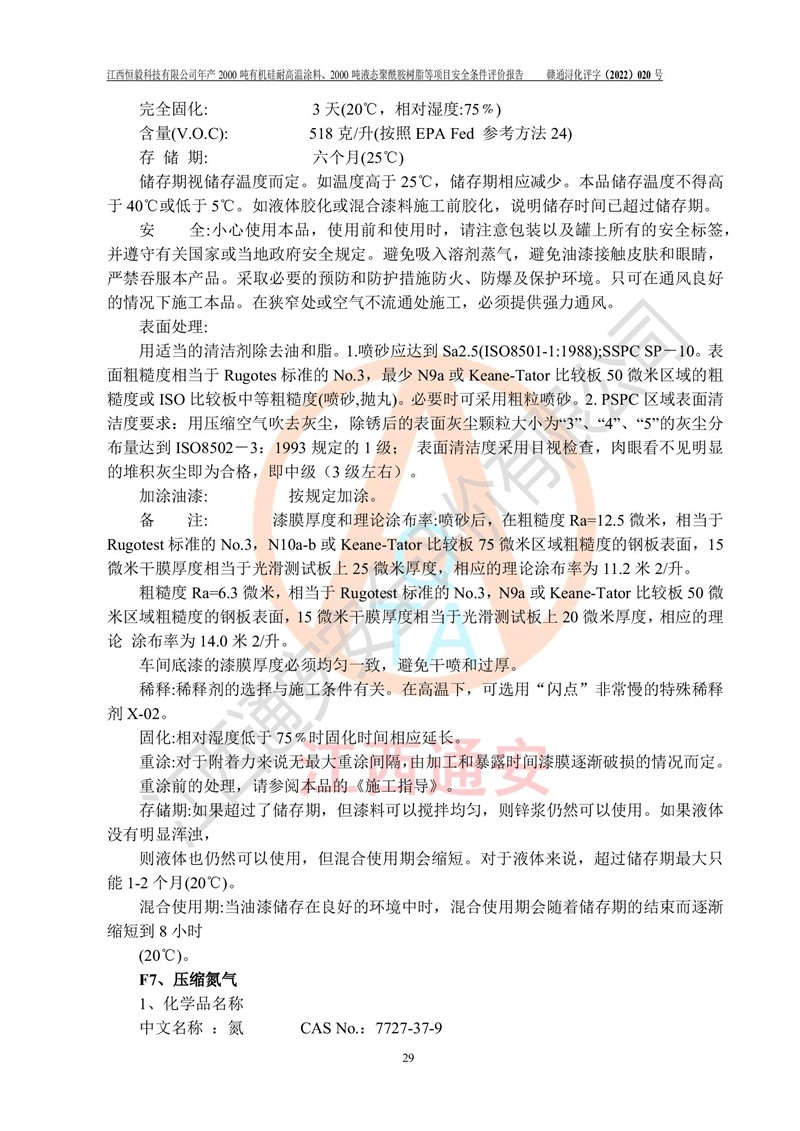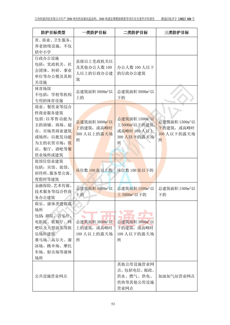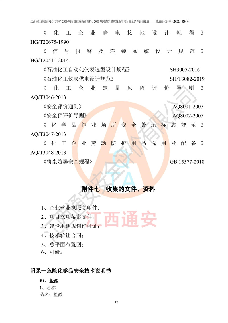 评价结论 | 江西恒毅科技有限公司年产2000吨有机硅耐高温涂料、2000吨液态聚酰胺树脂等项目的选址、总体布局、周边环境、自然环境能满足建设安全条件;项目选择的工艺过程及设备设施的安全可靠性能达到**法规、标准规定要求;项目存在的危险有害因素可控,在落实本评价报告提出的有关安全对策措施后,其危险有害程度能达到可以接受的程度,项目建设能够实现安 全运行的目标。 | ||||