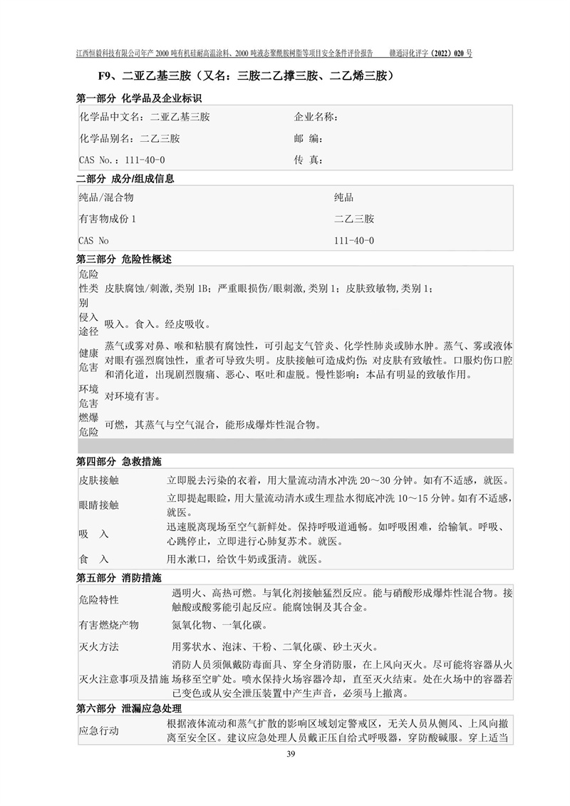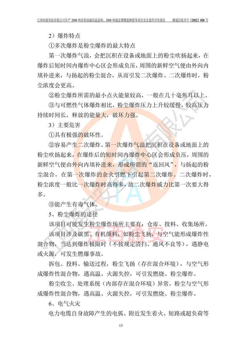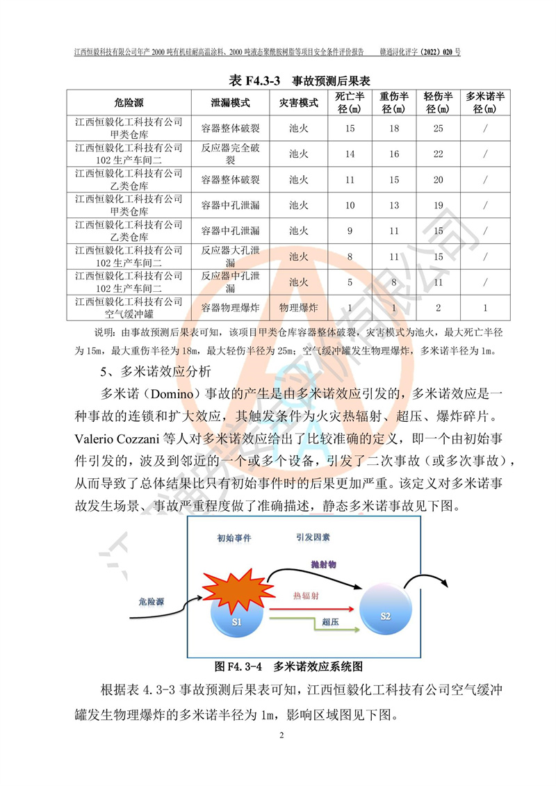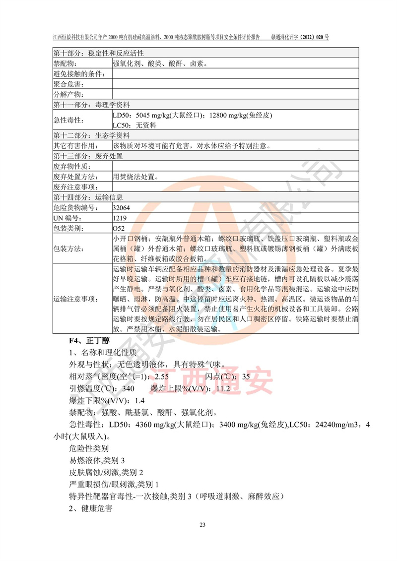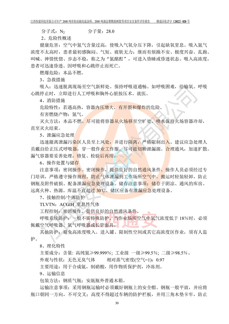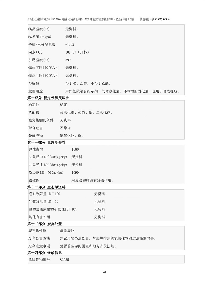评价结论 | 江西恒毅科技有限公司年产2000吨有机硅耐高温涂料、2000吨液态聚酰胺树脂等项目的选址、总体布局、周边环境、自然环境能满足建设安全条件;项目选择的工艺过程及设备设施的安全可靠性能达到**法规、标准规定要求;项目存在的危险有害因素可控,在落实本评价报告提出的有关安全对策措施后,其危险有害程度能达到可以接受的程度,项目建设能够实现安 全运行的目标。 | ||||