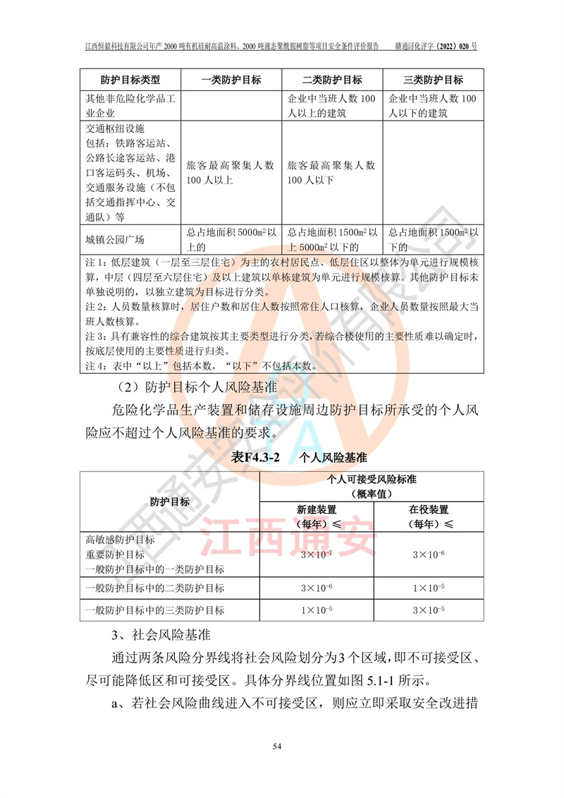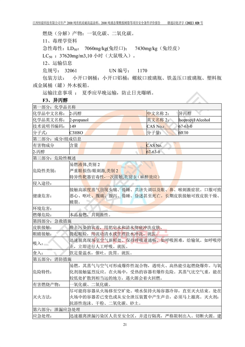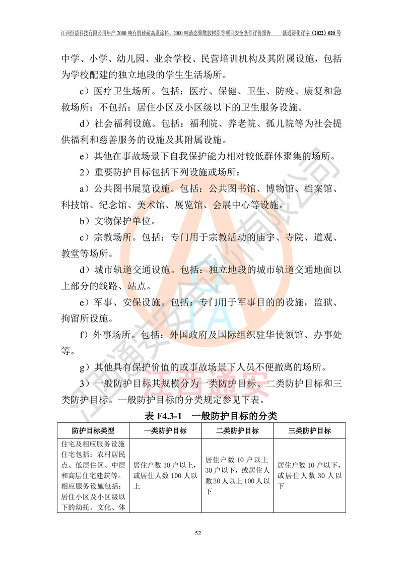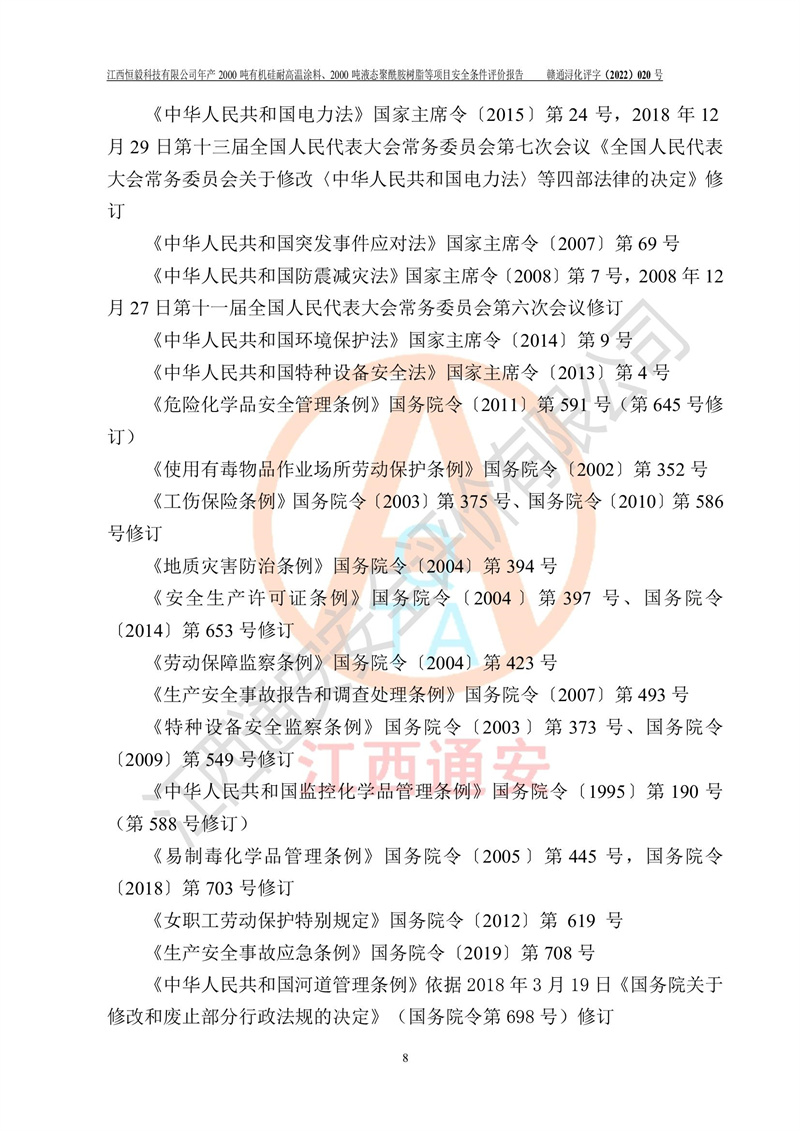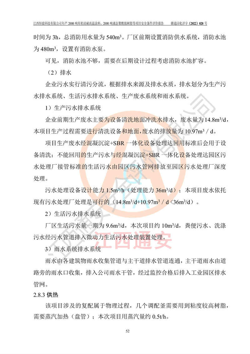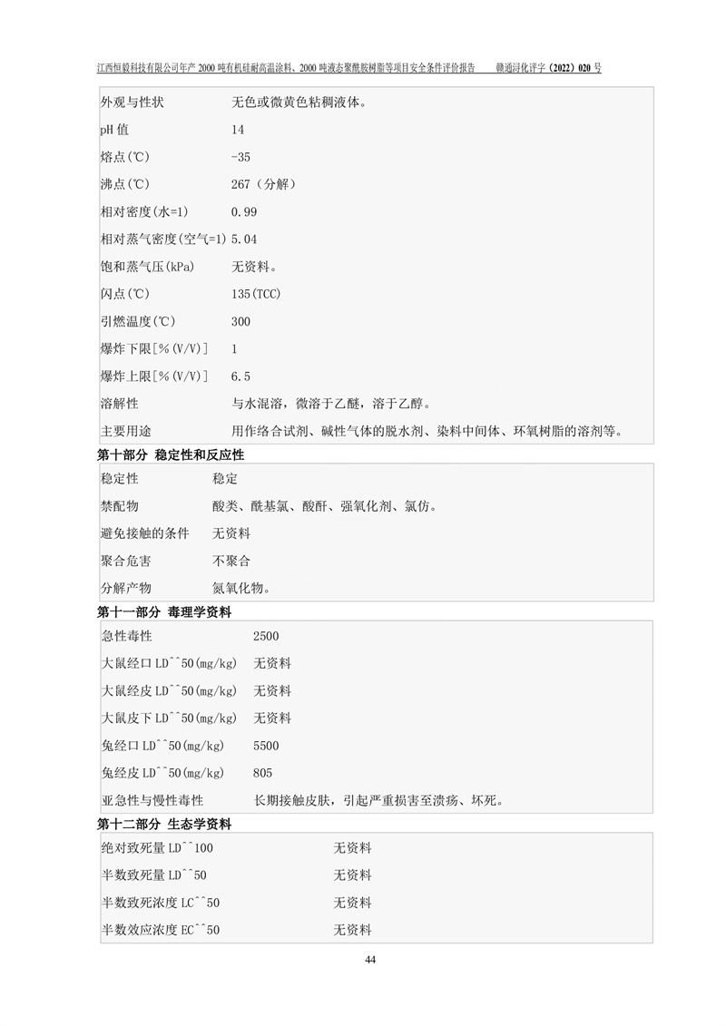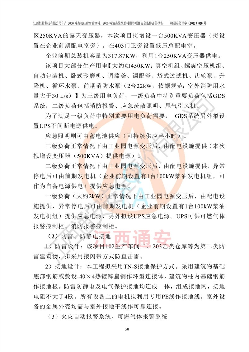 评价结论 | 江西恒毅科技有限公司年产2000吨有机硅耐高温涂料、2000吨液态聚酰胺树脂等项目的选址、总体布局、周边环境、自然环境能满足建设安全条件;项目选择的工艺过程及设备设施的安全可靠性能达到**法规、标准规定要求;项目存在的危险有害因素可控,在落实本评价报告提出的有关安全对策措施后,其危险有害程度能达到可以接受的程度,项目建设能够实现安 全运行的目标。 | ||||