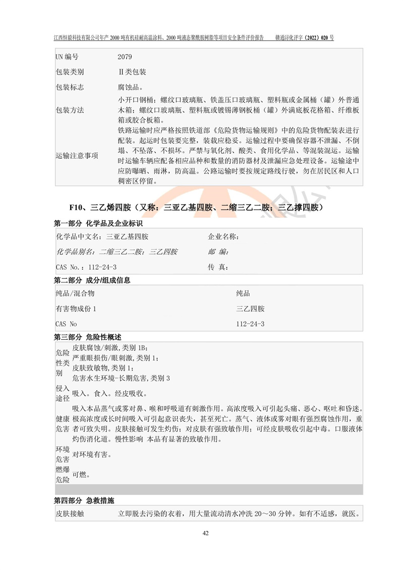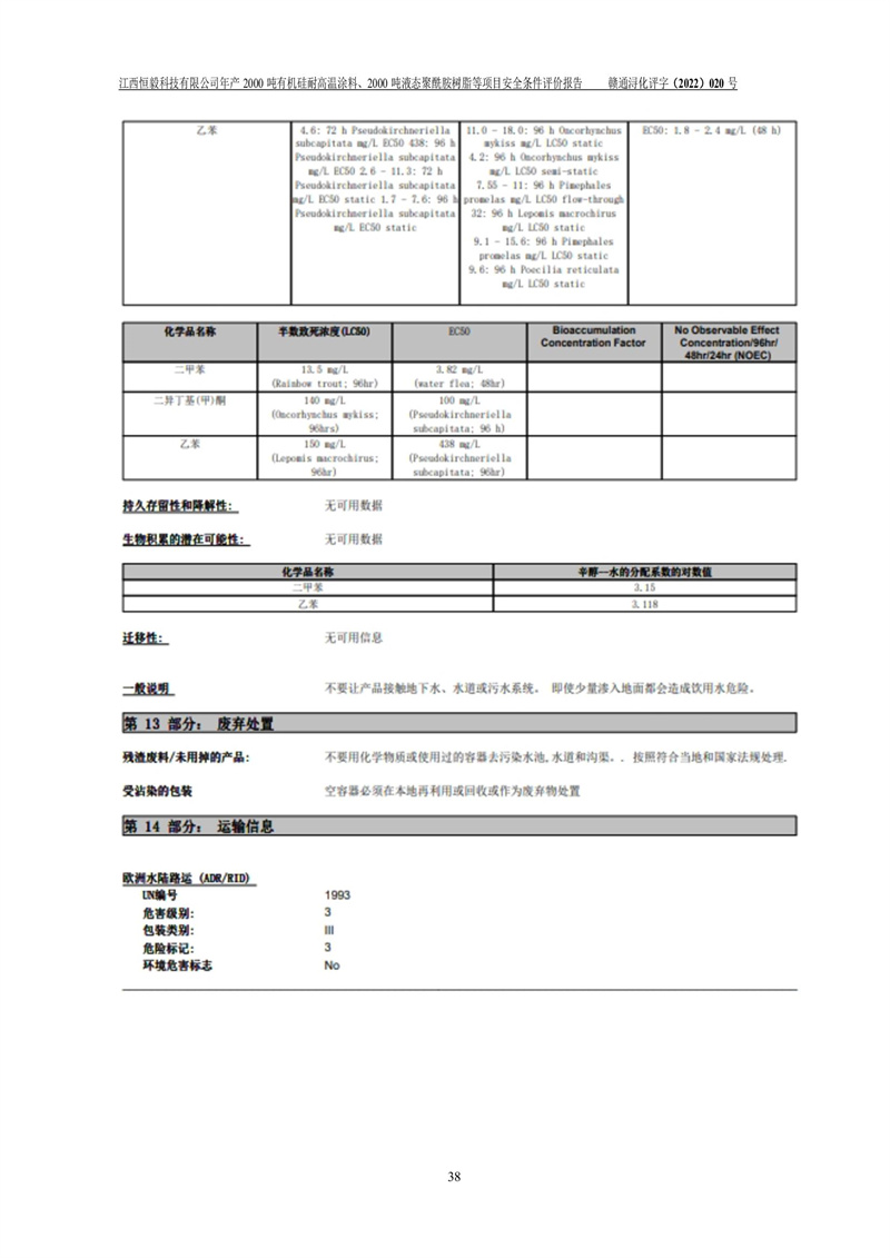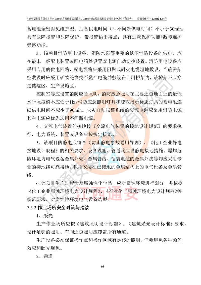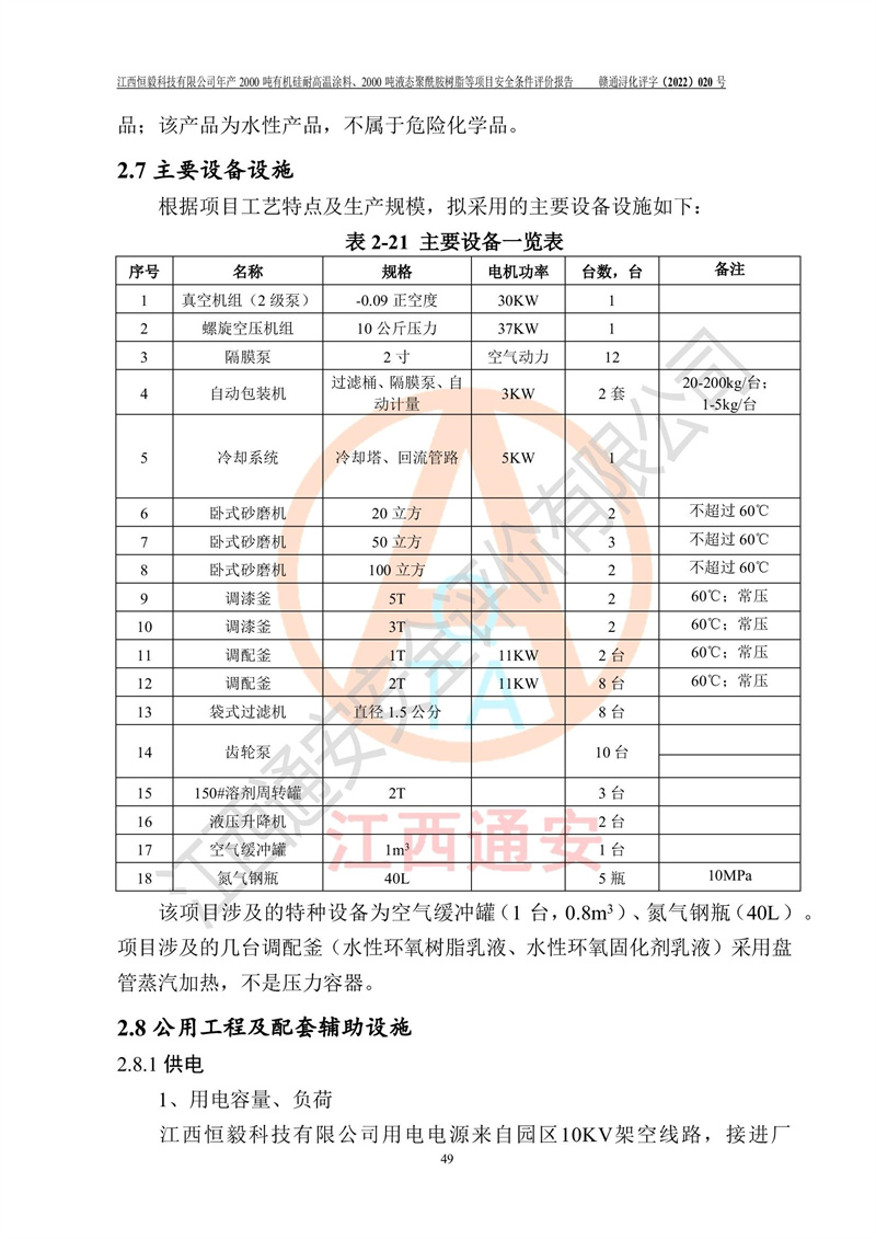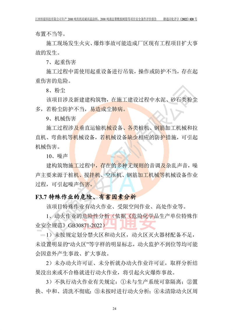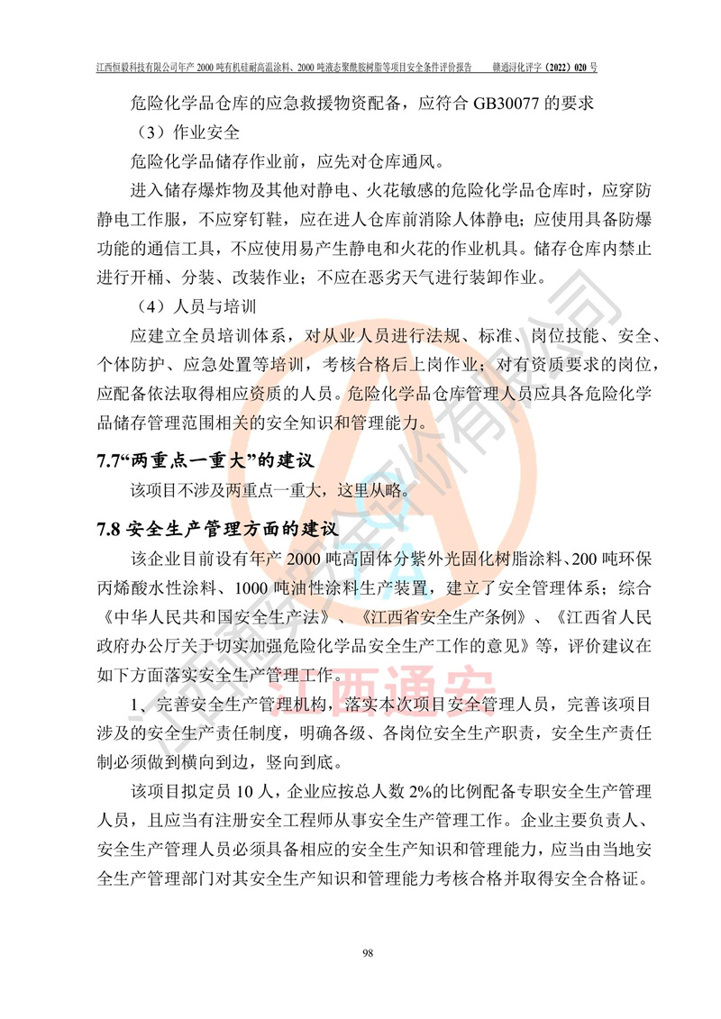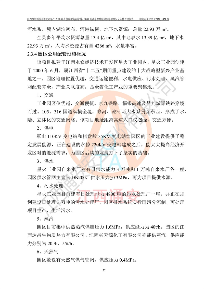 评价结论 | 江西恒毅科技有限公司年产2000吨有机硅耐高温涂料、2000吨液态聚酰胺树脂等项目的选址、总体布局、周边环境、自然环境能满足建设安全条件;项目选择的工艺过程及设备设施的安全可靠性能达到**法规、标准规定要求;项目存在的危险有害因素可控,在落实本评价报告提出的有关安全对策措施后,其危险有害程度能达到可以接受的程度,项目建设能够实现安 全运行的目标。 | ||||