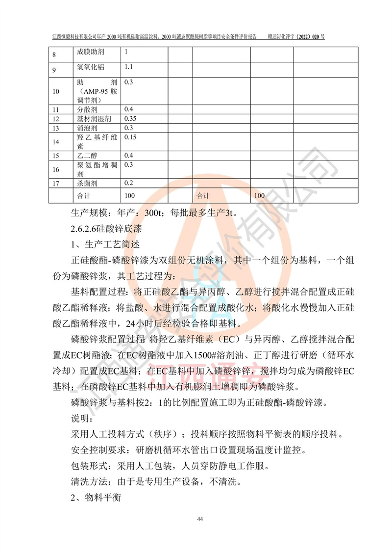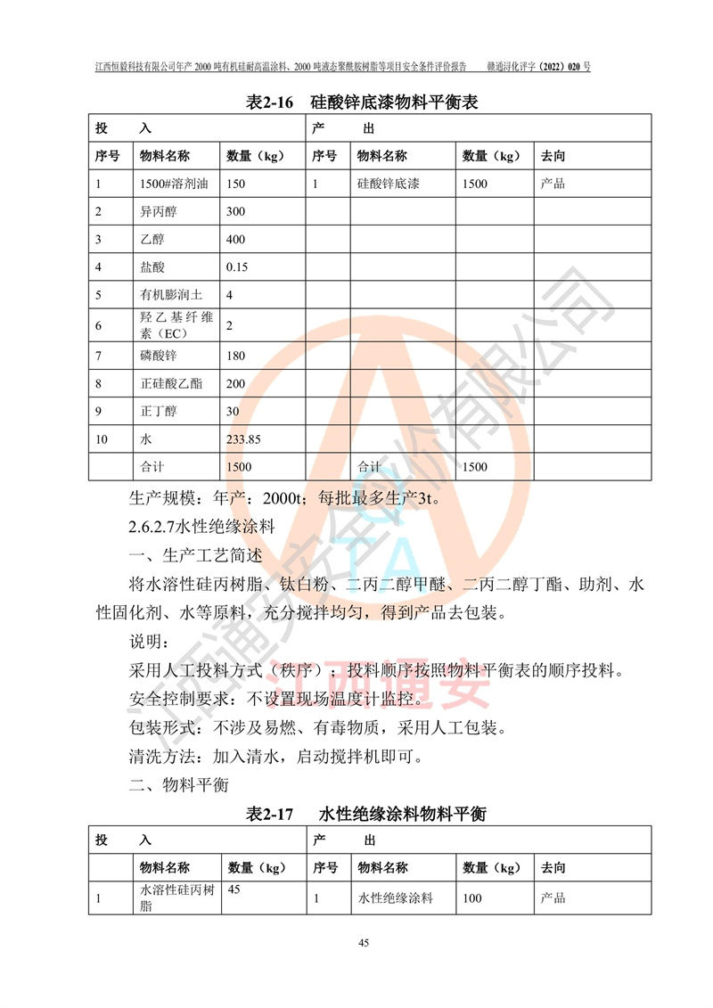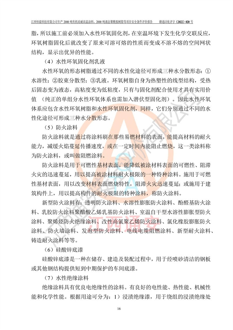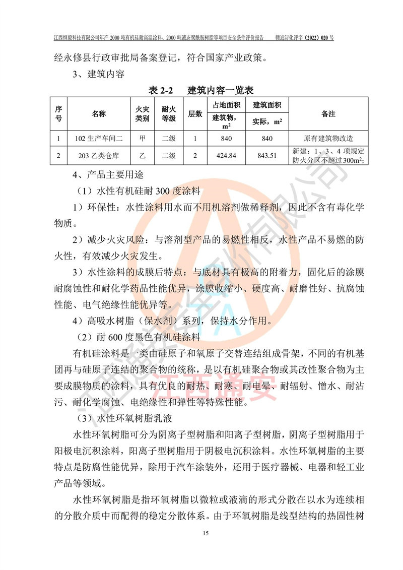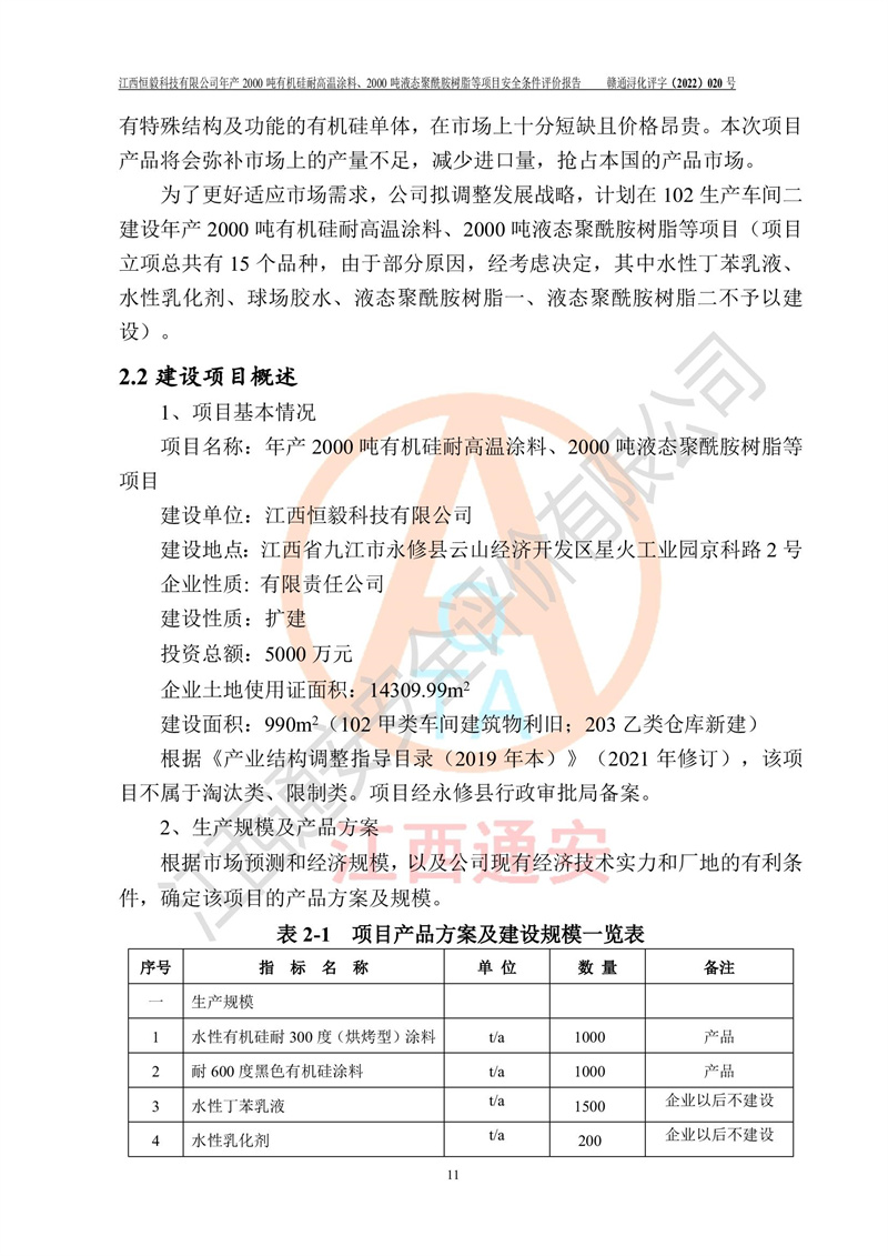 项目简介 | 江西恒毅科技有限公司是一家民营企业,主要从事油漆、涂料的生产、销售。企业于2012年开始在江西永修云山经济开发区星火工业园建设了年产2000吨高固体分紫外光固化树脂涂料、200吨**丙烯酸水性涂料、1000吨油性涂料生产项目。企业于2015年9月取得了安全生产许可证,2018年、2021年办理了生产许可证的延期。企业目前处于运行的生产装置有油性涂料、**水性涂料。项目名称:年产2000吨有机硅耐高温涂料、2000吨液态聚酰胺树脂等项目 建设地点:江西省九江市永修县云山经济开发区星火工业园京科路2号;企业性质: 有限责任公司 建设性质:扩建;投资总额:5000万元。 | ||||