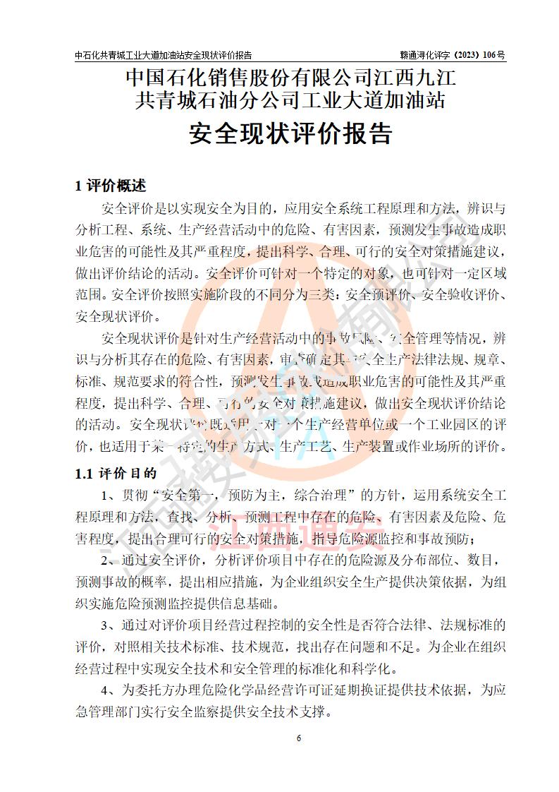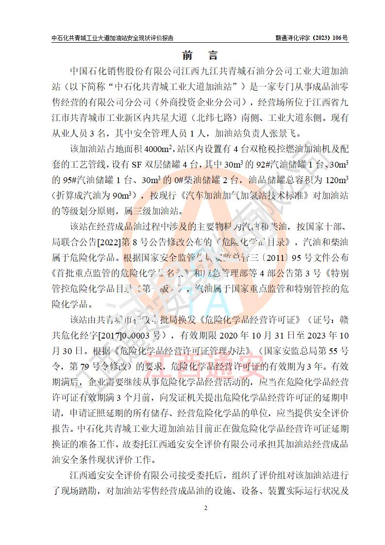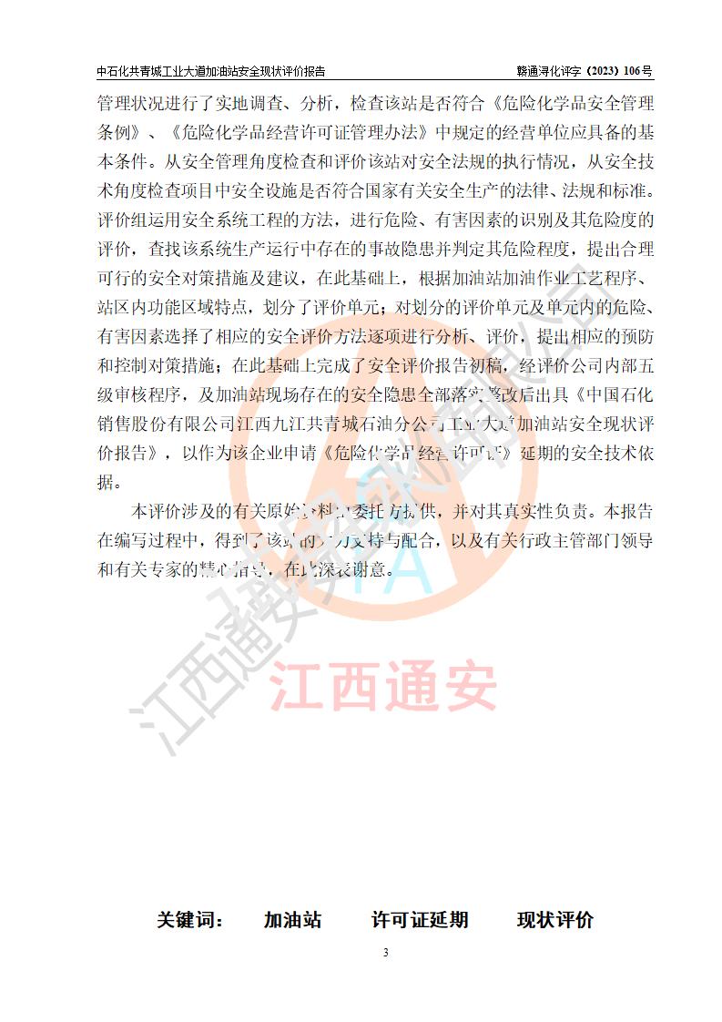 评价报告名称 | 中国石化销售股份有限公司江西九江共青城石油分公司工业大道加油站安全现状评价报告 | |||