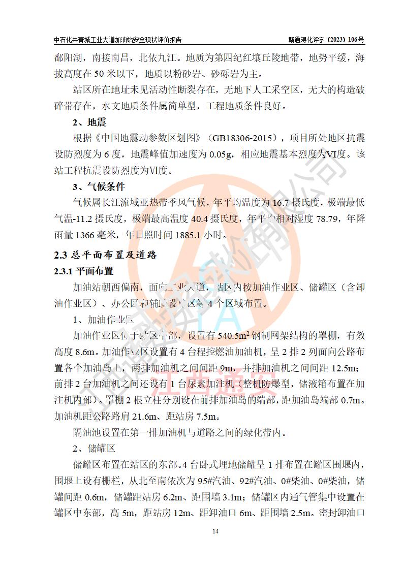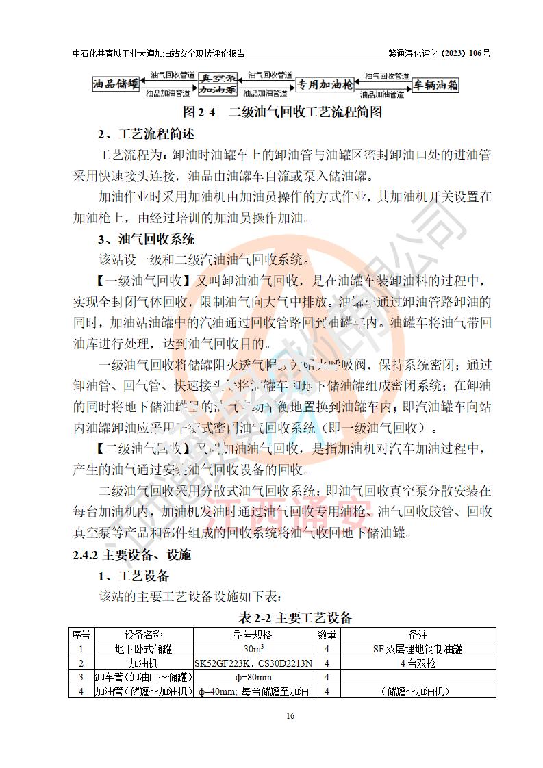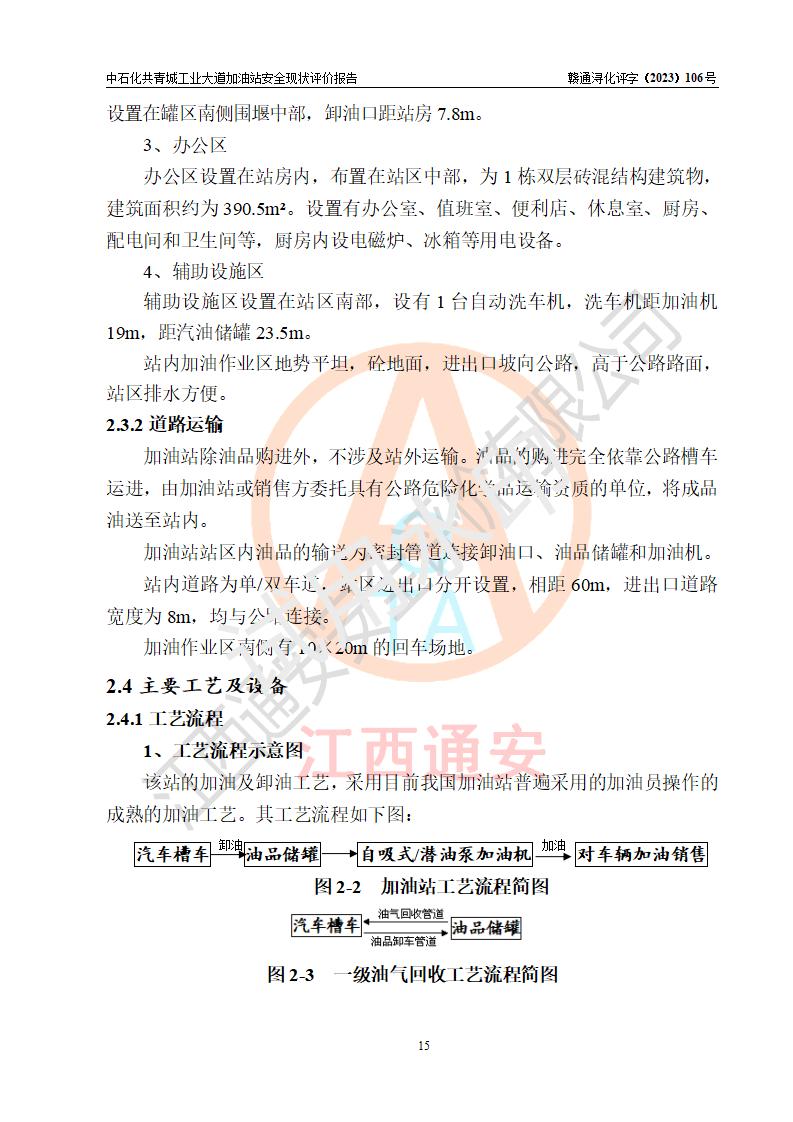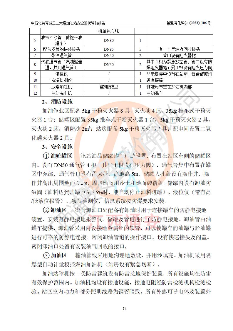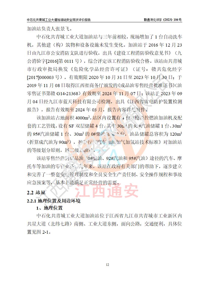 项目简介 | 中国石化销售股份有限公司江西九江共青城石油分公司工业大道加油站是一家专门从事成品油零售经营的有限公司分公司(外商投资企业分公司),经营场所位于江西省九江市共青城市工业新区内共星大道(北纬七路)南侧、工业大道东侧。现有从业人员3名,其中安全管理人员1人,加油站负责人张景飞。 该加油站占地面积4000m2,站区内设置有4台双枪税控燃油加油机及配套的工艺管线,设有SF双层储罐4台,其中30m3的92#汽油储罐1台、30m3的95#汽油储罐1台、30m3的0#柴油储罐2台,油品储罐总容积为120m3(折算成汽油为90m3),按现行《汽车加油加气加氢站技术标准》对加油站的等级划分原则,属三级加油站。 该站由共青城市行政审批局换发《危险化学品经营许可证》(证号:赣共危化经字[2017]000003号),**期限2020年10月31日至2023年10月30日。 | |||