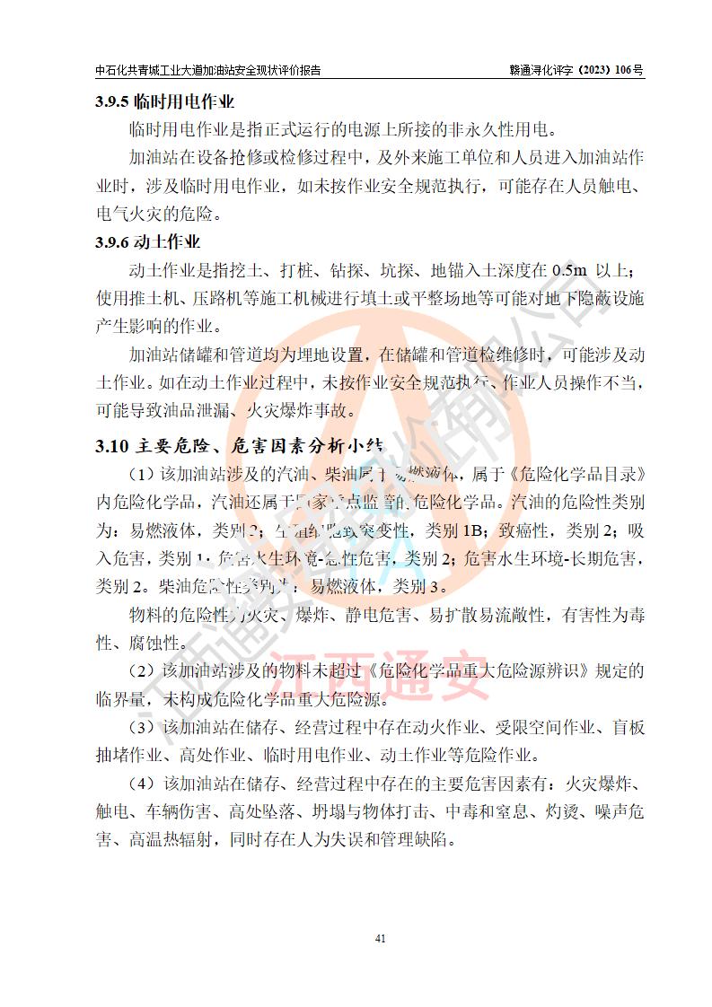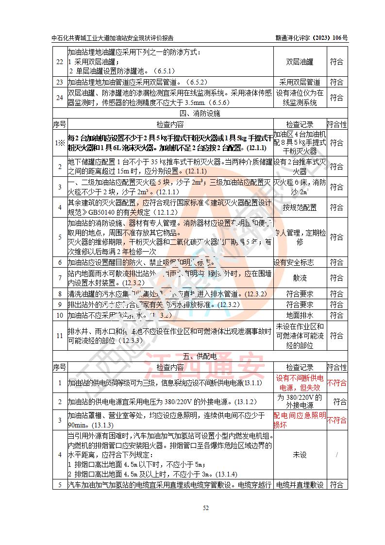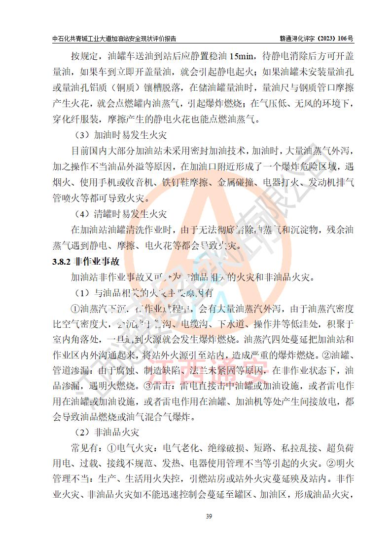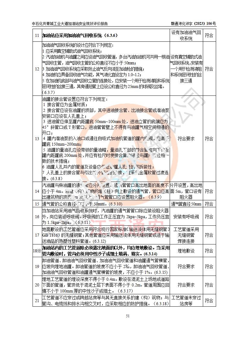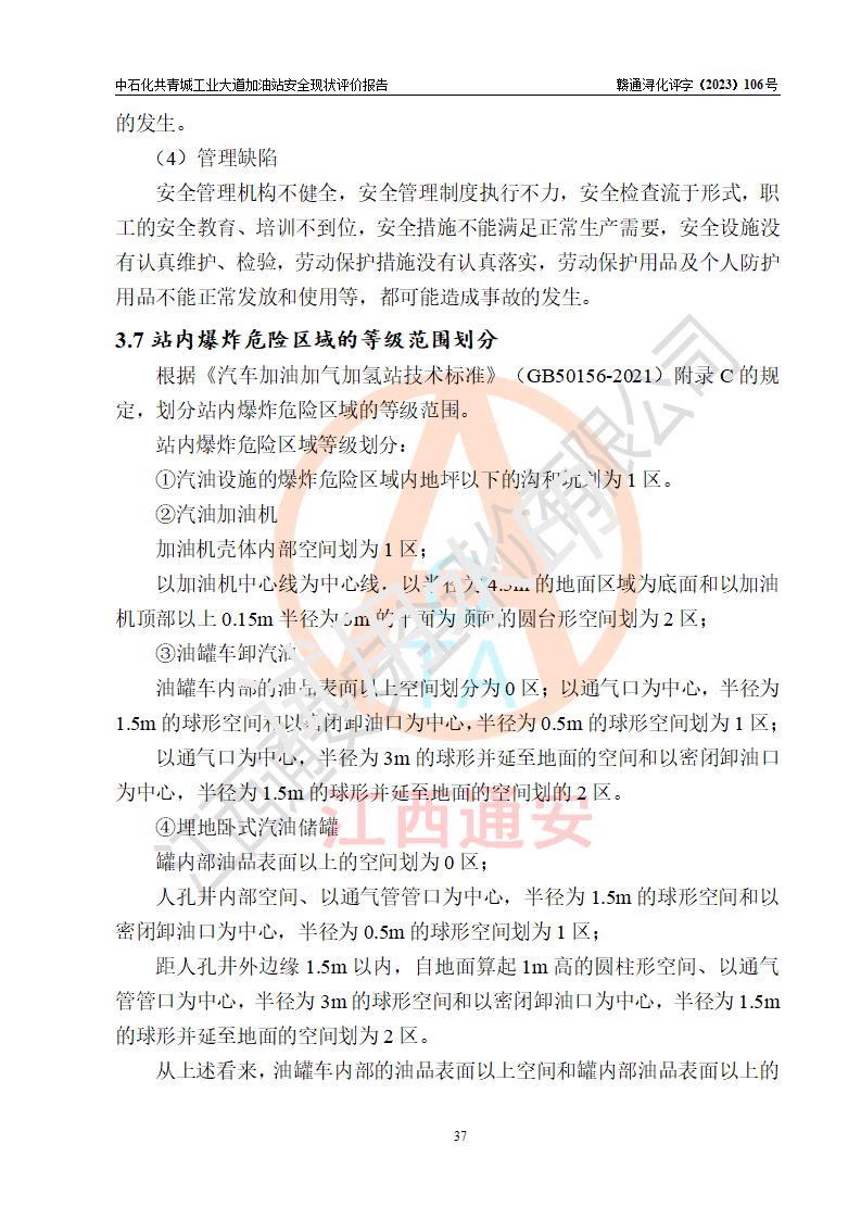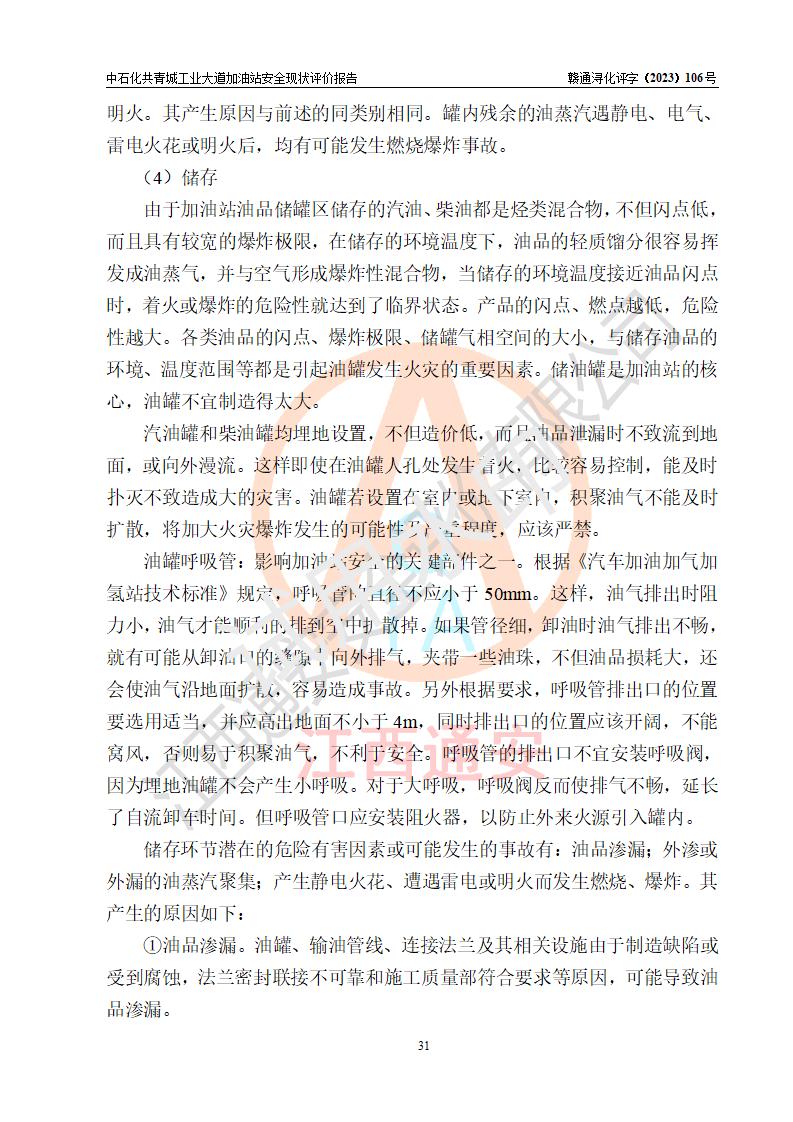 项目简介 | 中国石化销售股份有限公司江西九江共青城石油分公司工业大道加油站是一家专门从事成品油零售经营的有限公司分公司(外商投资企业分公司),经营场所位于江西省九江市共青城市工业新区内共星大道(北纬七路)南侧、工业大道东侧。现有从业人员3名,其中安全管理人员1人,加油站负责人张景飞。 该加油站占地面积4000m2,站区内设置有4台双枪税控燃油加油机及配套的工艺管线,设有SF双层储罐4台,其中30m3的92#汽油储罐1台、30m3的95#汽油储罐1台、30m3的0#柴油储罐2台,油品储罐总容积为120m3(折算成汽油为90m3),按现行《汽车加油加气加氢站技术标准》对加油站的等级划分原则,属三级加油站。 该站由共青城市行政审批局换发《危险化学品经营许可证》(证号:赣共危化经字[2017]000003号),**期限2020年10月31日至2023年10月30日。 | |||