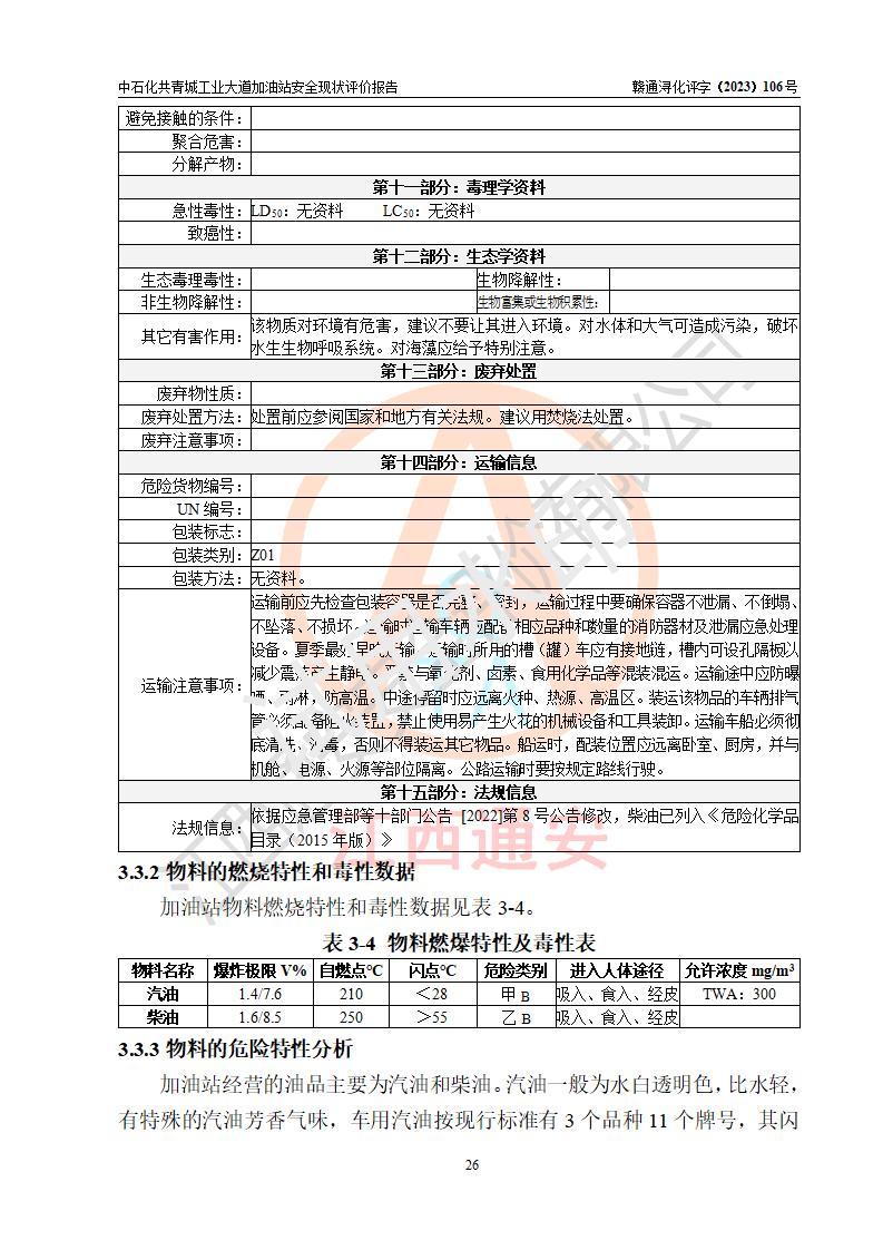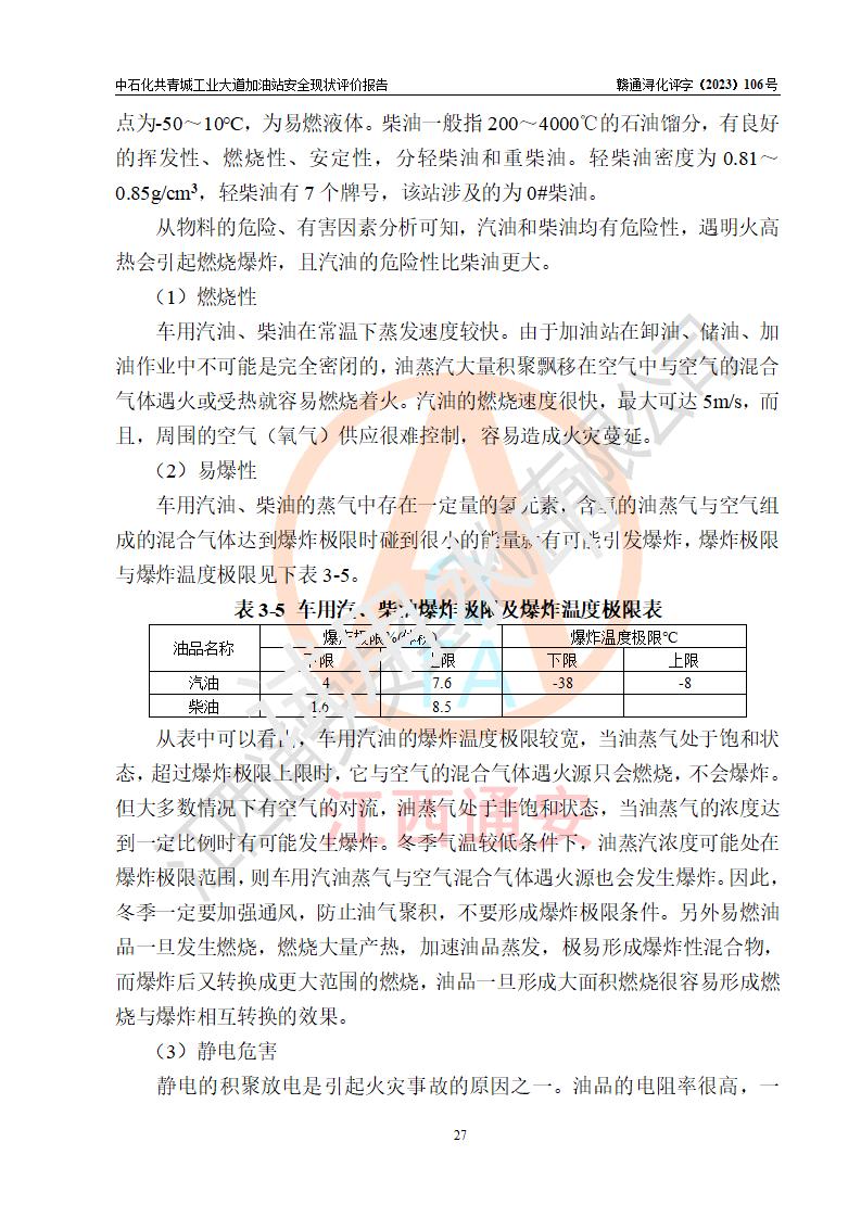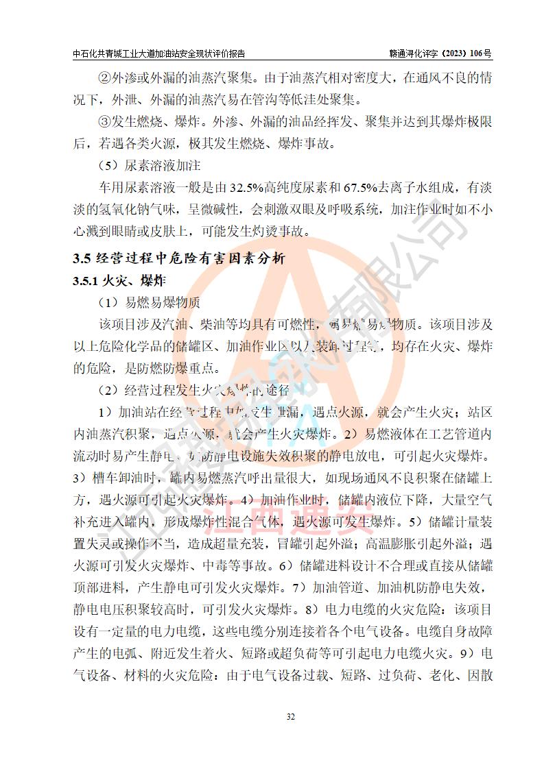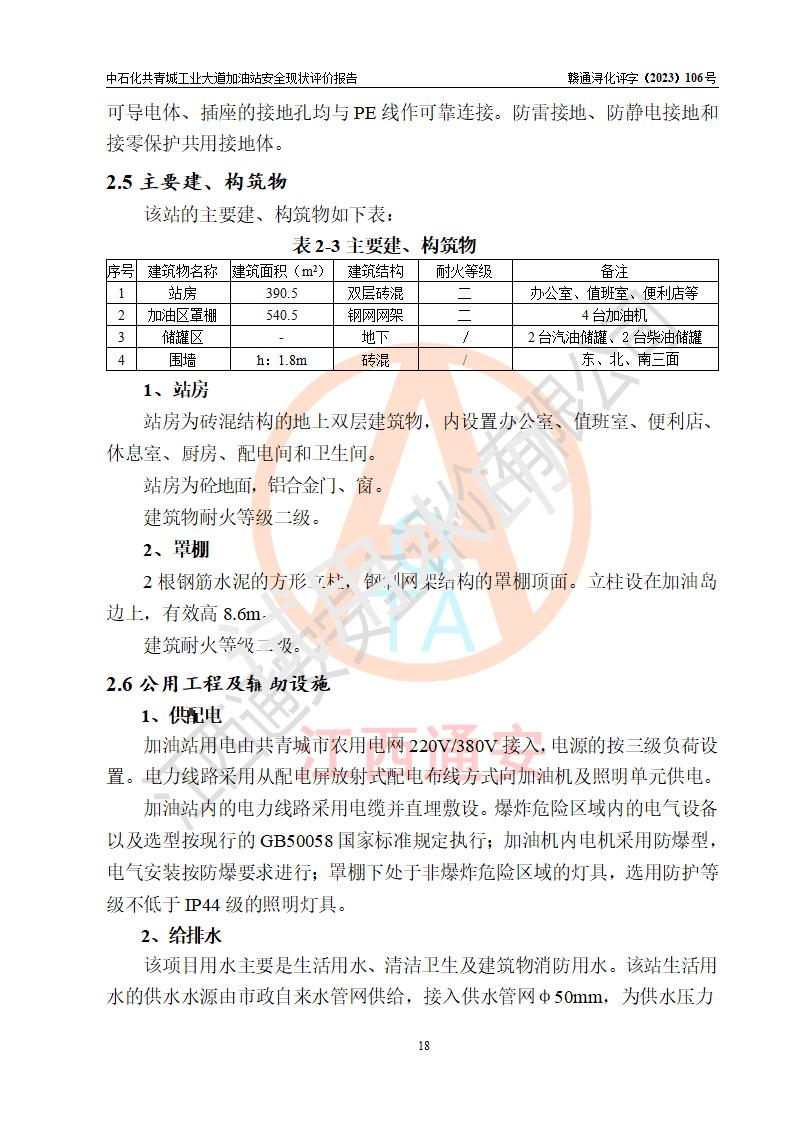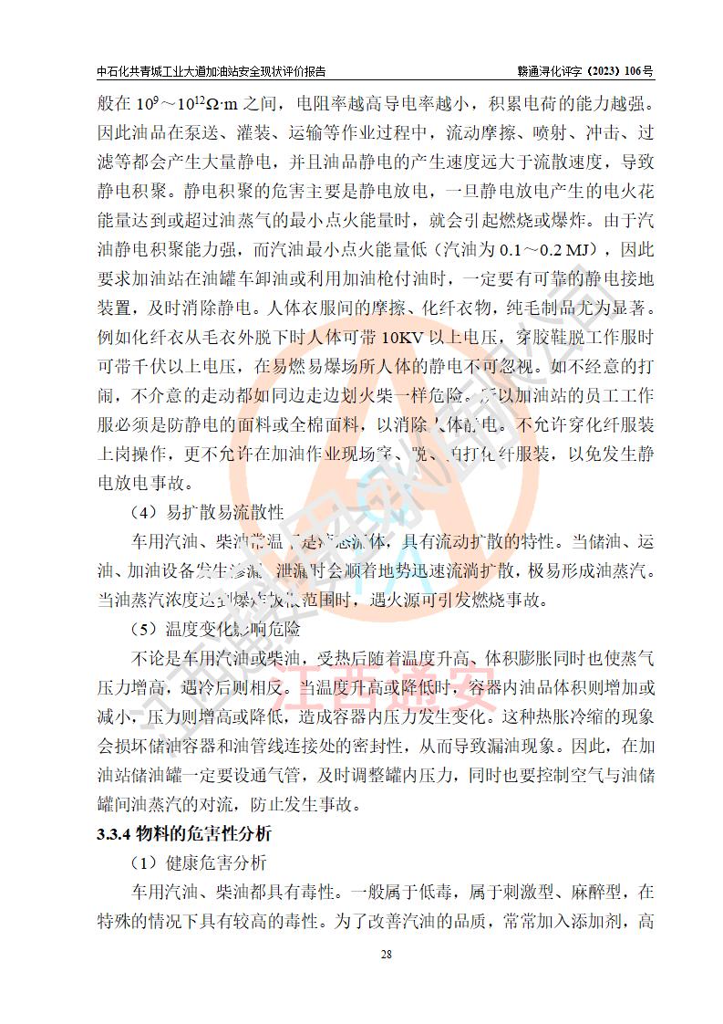 项目简介 | 中国石化销售股份有限公司江西九江共青城石油分公司工业大道加油站是一家专门从事成品油零售经营的有限公司分公司(外商投资企业分公司),经营场所位于江西省九江市共青城市工业新区内共星大道(北纬七路)南侧、工业大道东侧。现有从业人员3名,其中安全管理人员1人,加油站负责人张景飞。 该加油站占地面积4000m2,站区内设置有4台双枪税控燃油加油机及配套的工艺管线,设有SF双层储罐4台,其中30m3的92#汽油储罐1台、30m3的95#汽油储罐1台、30m3的0#柴油储罐2台,油品储罐总容积为120m3(折算成汽油为90m3),按现行《汽车加油加气加氢站技术标准》对加油站的等级划分原则,属三级加油站。 该站由共青城市行政审批局换发《危险化学品经营许可证》(证号:赣共危化经字[2017]000003号),**期限2020年10月31日至2023年10月30日。 | |||