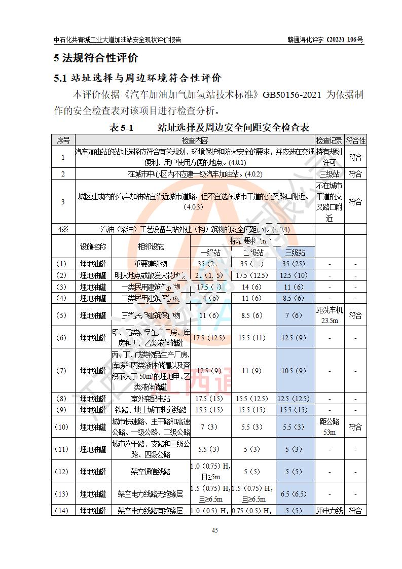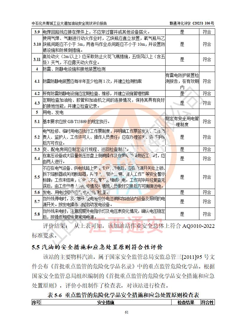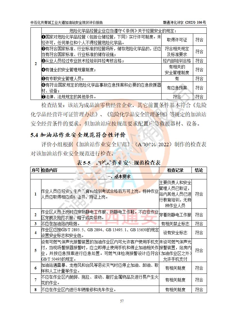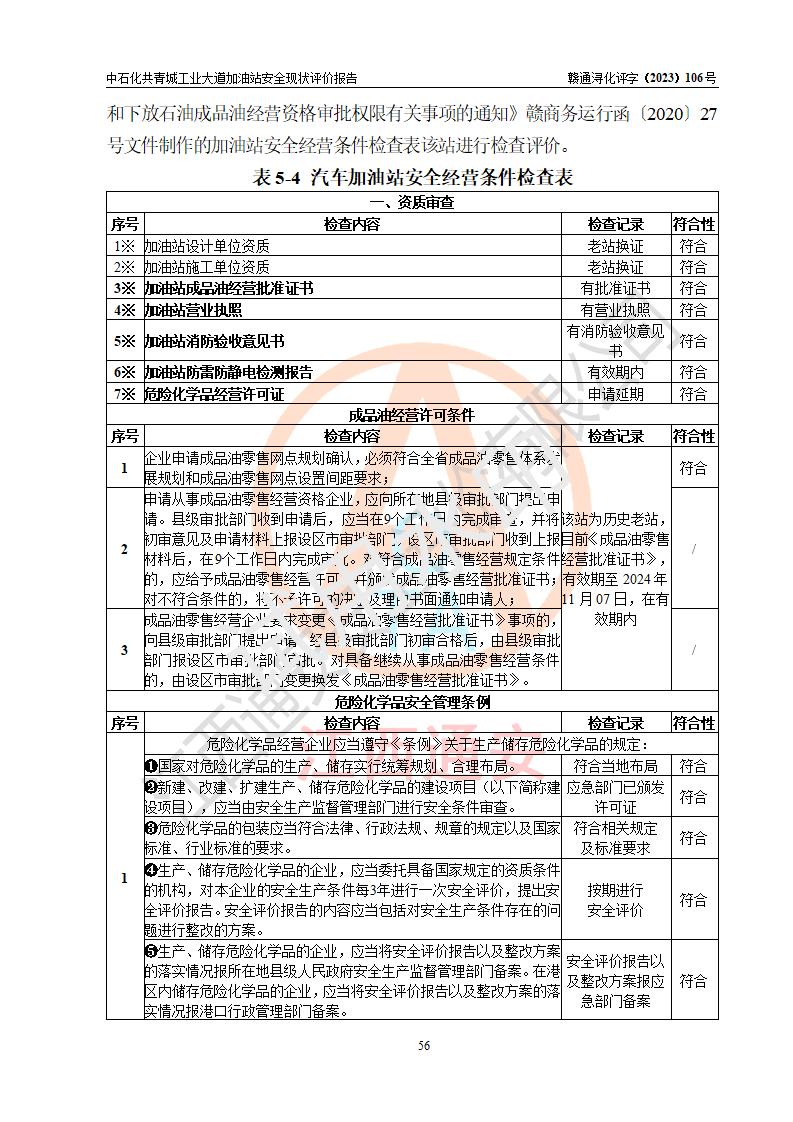 评价结论 | 中国石化销售股份有限公司江西九江共青城石油分公司工业大道加油站涉及的安全条件、安全经营条件、安全生产管理符合《危险化学品经营许可证管理办法》、《汽车加油加气加氢站技术标准》等**有关法规、标准、规范要求,能满足危险化学品经营安全条件。 | |||