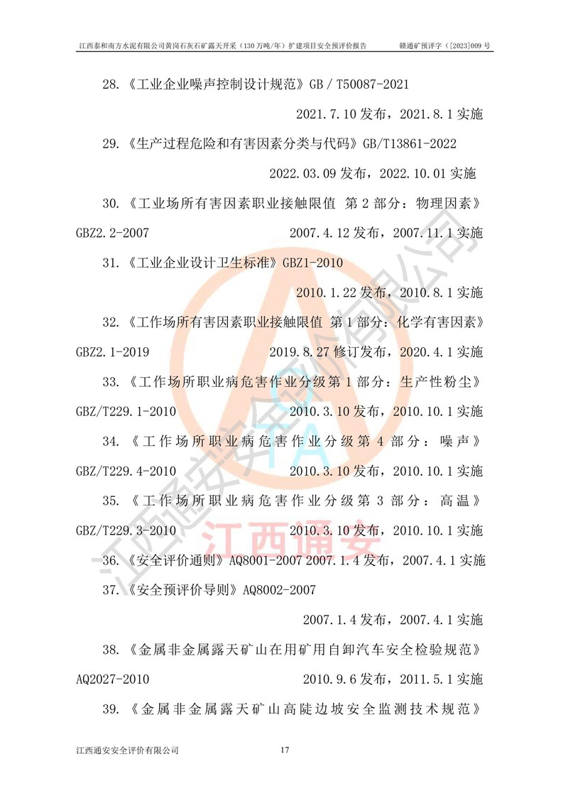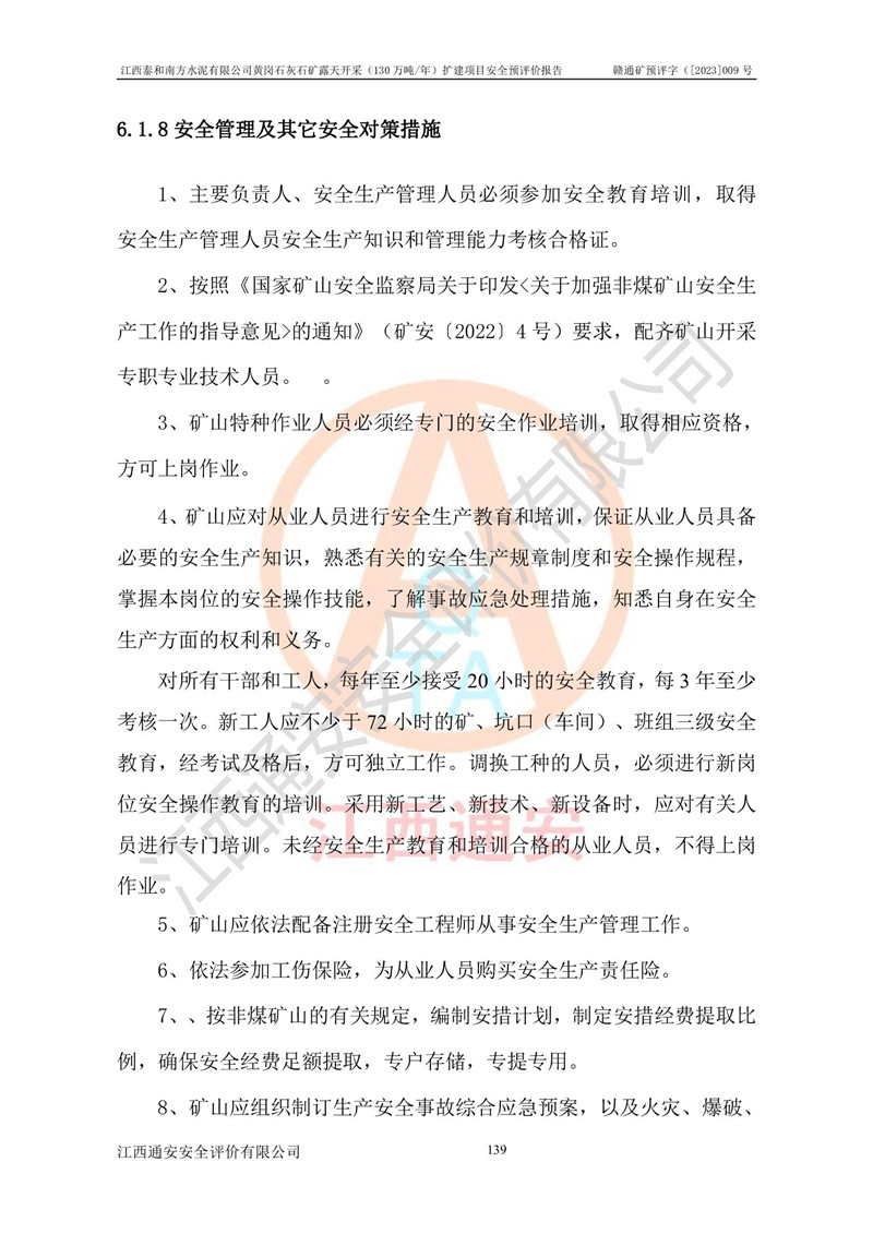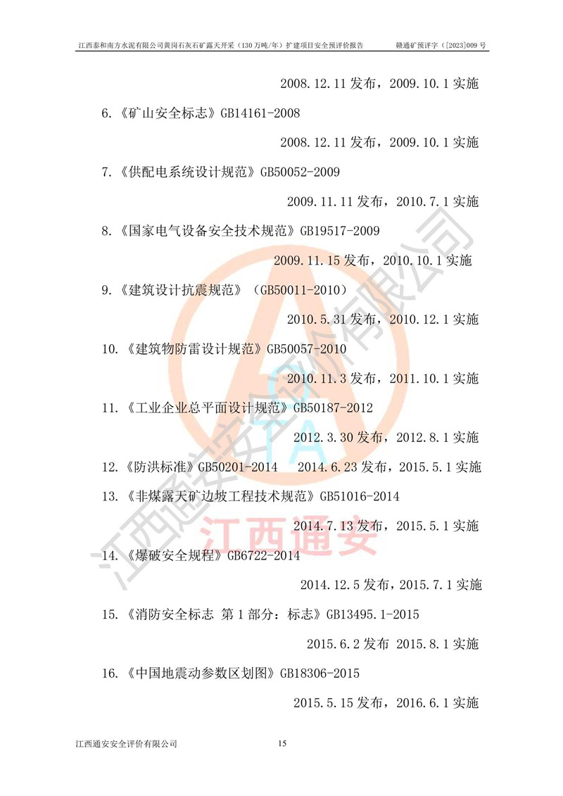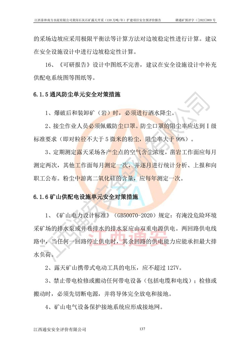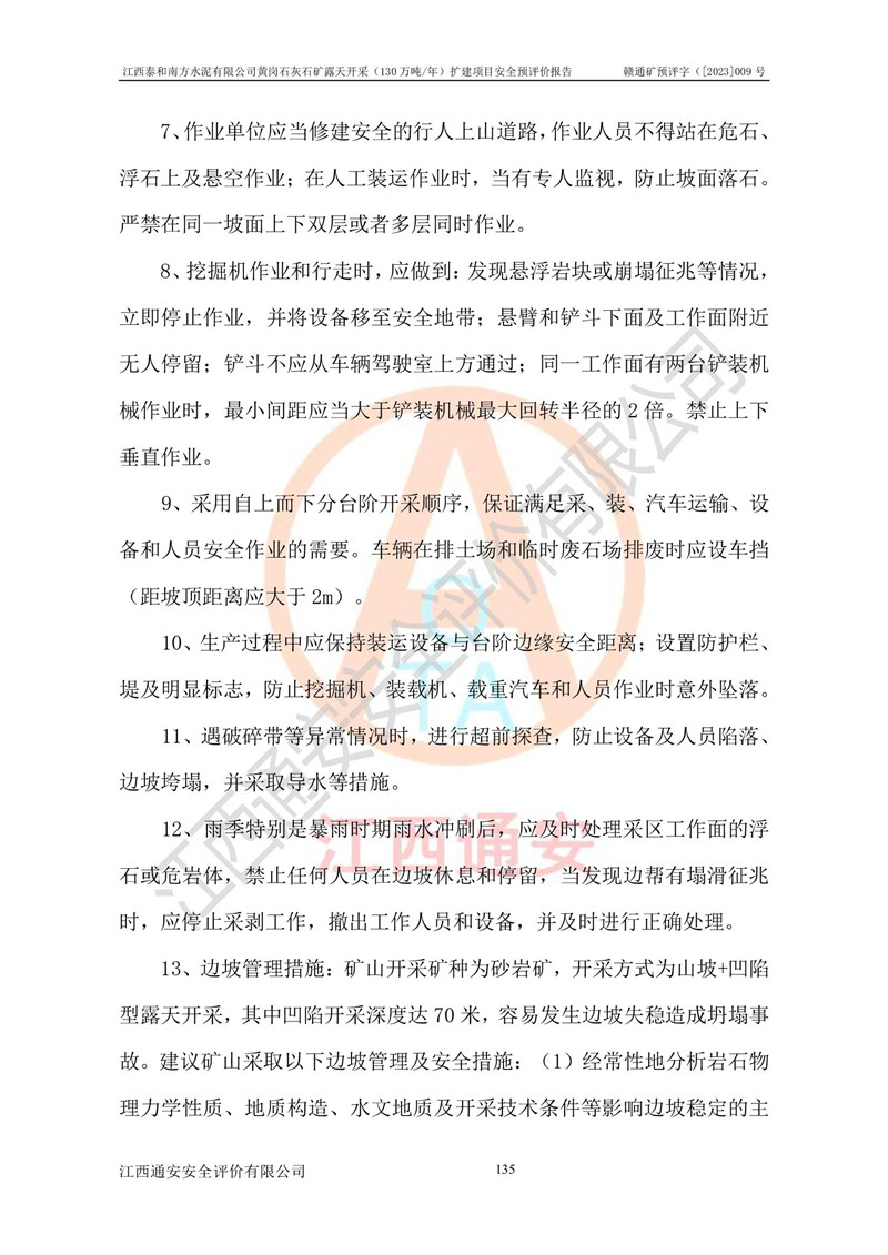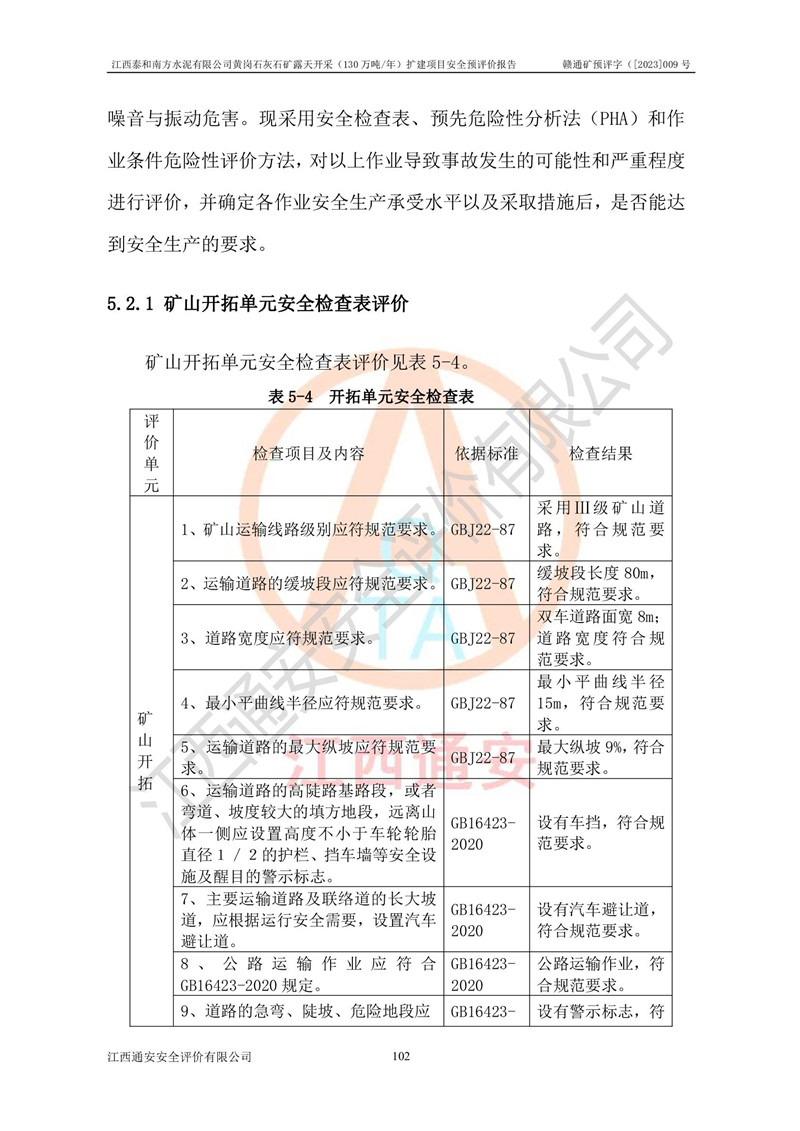 评价结论 | 1、本建设项目拟定的开采方案、采用的采矿工艺及各系统的安全设施基本符合安全生产法律、法规和行业安全技术规范的要求。 2、在建设施工及生产运行中,如能严格执行**有关安全生产法律、法规和有关标准、规范,认真落实《可研报告》提出的安全措施,并合理采纳本报告中提出的安全对策措施及建议,项目的主要危险、有害因素可得到较好控制,本评价项目安全生产风险在可接受范围。 结论:江西泰和南方水泥有限公司黄岗石灰石矿露天开采(130万吨/年)扩建项目从安全生产角度符合**有关安全生产法律、法规、规章、标准和规范的要求,风险可以接受。 | ||||