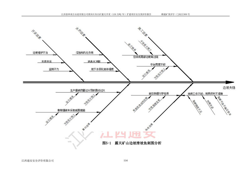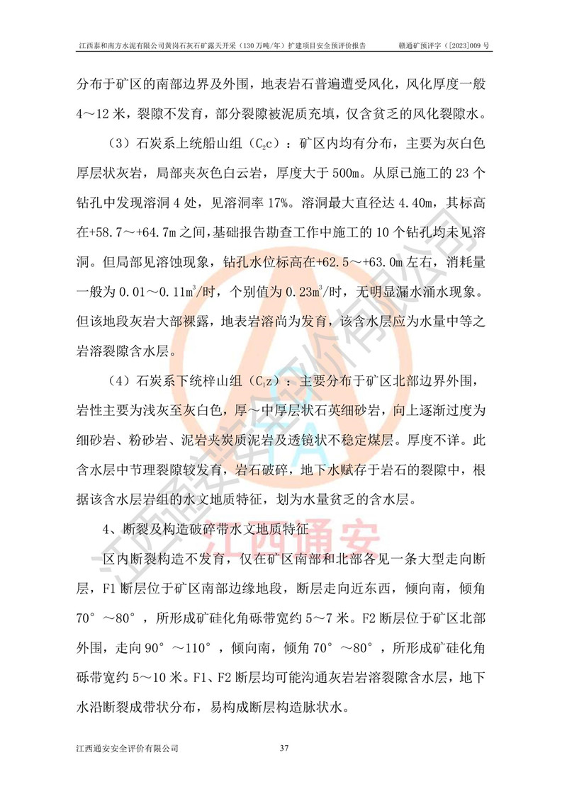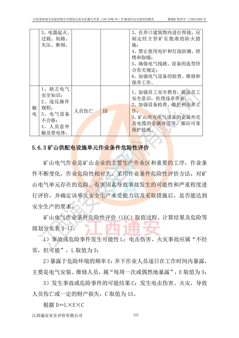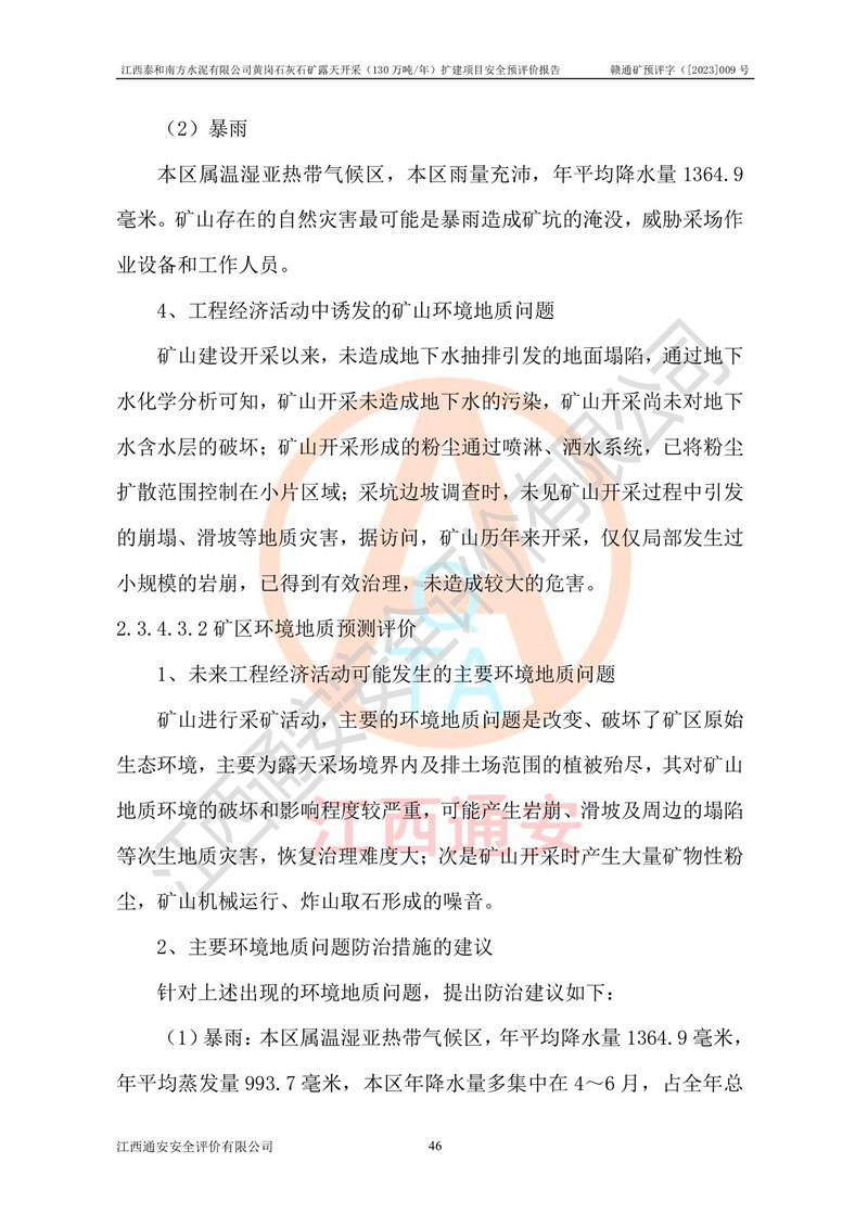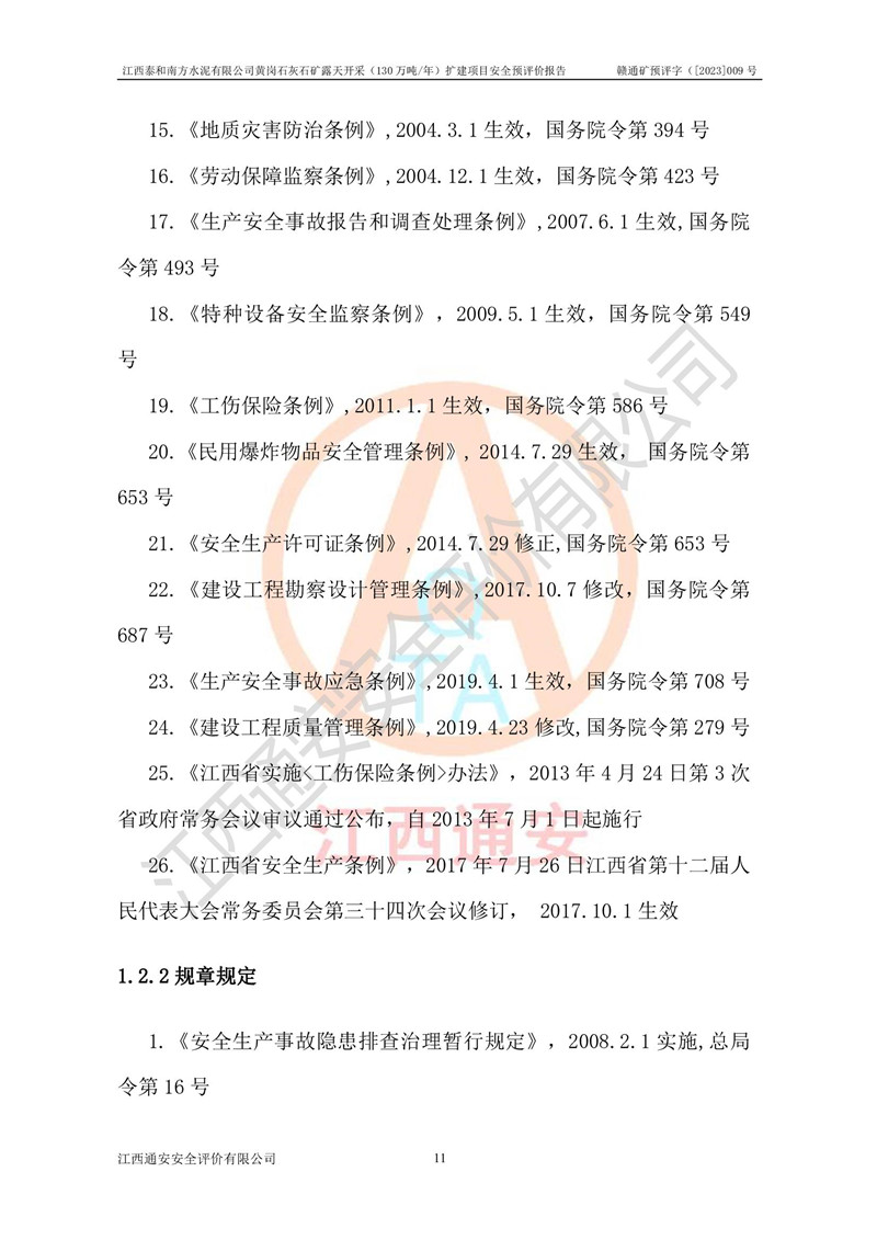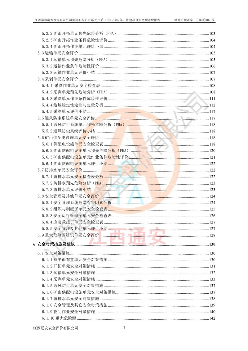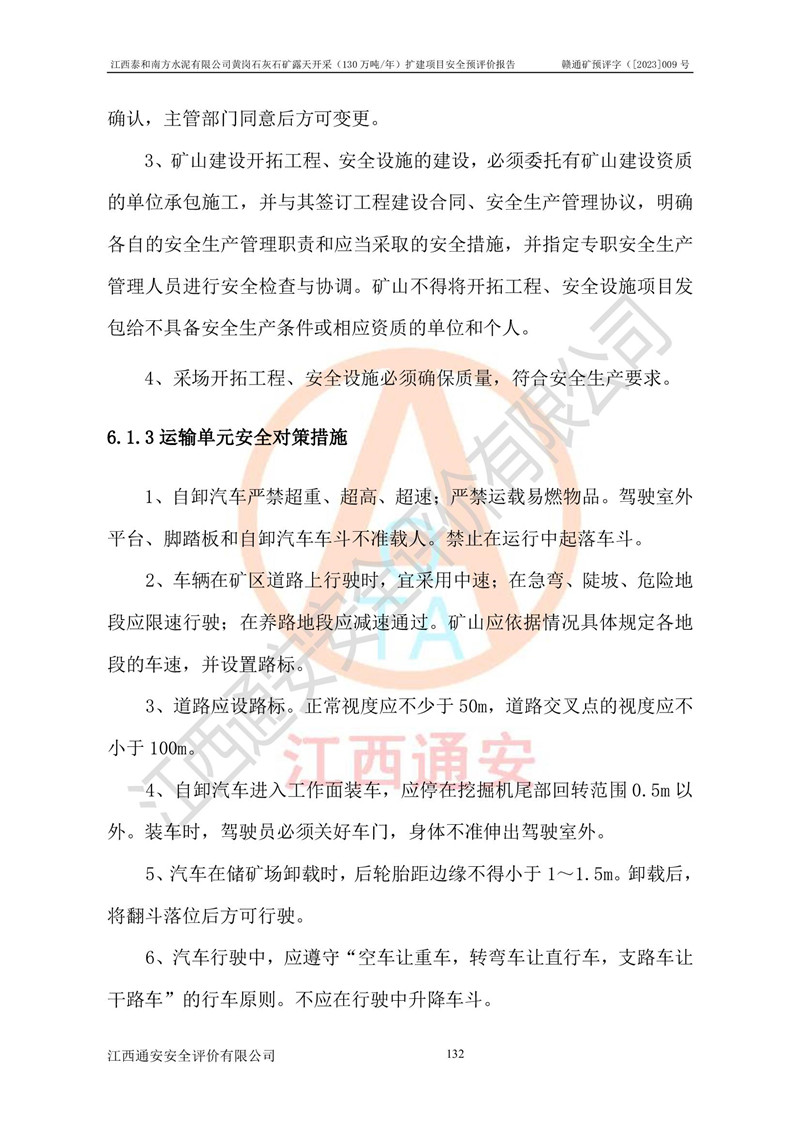 评价结论 | 1、本建设项目拟定的开采方案、采用的采矿工艺及各系统的安全设施基本符合安全生产法律、法规和行业安全技术规范的要求。 2、在建设施工及生产运行中,如能严格执行**有关安全生产法律、法规和有关标准、规范,认真落实《可研报告》提出的安全措施,并合理采纳本报告中提出的安全对策措施及建议,项目的主要危险、有害因素可得到较好控制,本评价项目安全生产风险在可接受范围。 结论:江西泰和南方水泥有限公司黄岗石灰石矿露天开采(130万吨/年)扩建项目从安全生产角度符合**有关安全生产法律、法规、规章、标准和规范的要求,风险可以接受。 | ||||