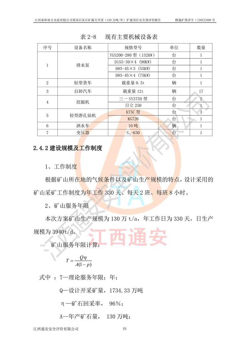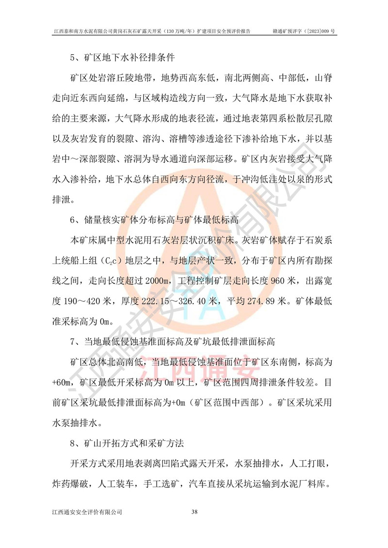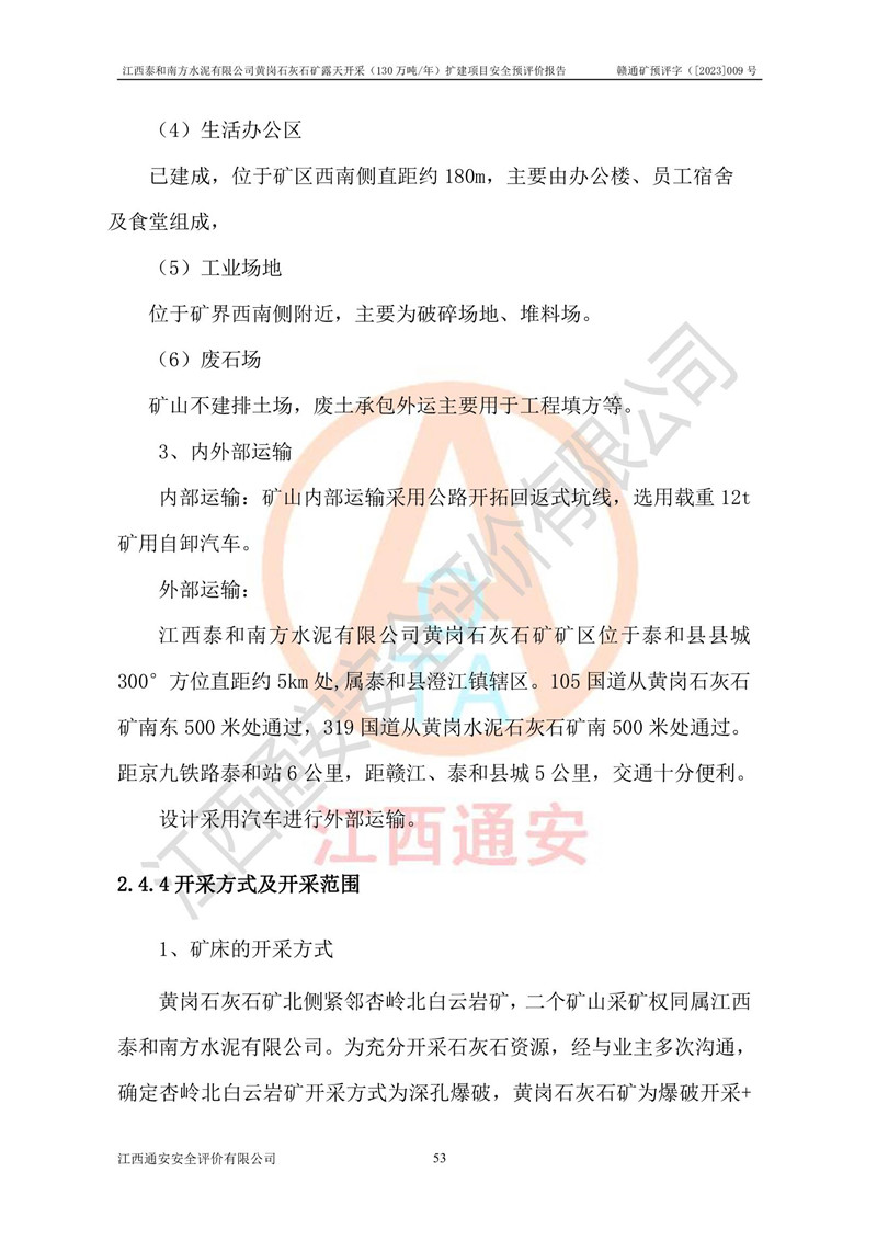 项目简介 | 江西泰和南方水泥有限公司黄岗石灰石矿矿区位于泰和县县城300°方位直距约5km处,属泰和县澄江镇辖区。矿区地理位置(2000**大地坐标):东经114°51′33″~114°52′11″,北纬26°49′01″~26°49′15″。矿区范围由13个拐点围成,矿区面积为0.3796km2。105国道从黄岗石灰石矿南东500米处通过,319国道从黄岗水泥石灰石矿南500米处通过。距京九铁路泰和站6**,距赣江、泰和县城5**,交通十分便利。 江西泰和南方水泥有限公司成立于1998年5月21日。2022年8月22日,江西泰和南方水泥有限公司取得泰和县市场监督管理局换发的营业执照,统一社会信用代码: 913608261622711022,名称: 江西泰和南方水泥有限公司,类型:有限责任公司,注册资本:壹亿壹仟万元整,法定**人:谢正洪,住所:江西省吉安市泰和县澄江镇上田黄岗,营业期限:1998年05月11日至2048年05月20日,经营范围:水泥生产,矿产资源(非煤矿山)开采、发电业务、输电业务、供(配)业务(依法须经批准的项目,经相关部门批准后方可开展经营活动)一般项目:水泥制品制造,非金属矿及制品销售,建筑材料销售,非金属矿物制品制造,水泥制品销售,再生资源销售,资源再生利用技术研发(除许可业务外,可自主依法经营法律法规非禁止或限制的项目)。 该矿现持原吉安市国土资源局于2015年4月17日为其延续换发的《采矿许可证》(证号:3608002009027120004485),划定矿区范围0.3796平方**,由13个拐点圈定,开采方式为露天开采,开采深度+93.3m至+0m,生产规模90万吨/年,**期自2015年4月17日至2035年4月17日。目前,采矿许可证变更生产规模130万吨/年正在办理之中。 2021年3月,该矿曾委托江西省煤矿设计院编制了《江西泰和南方水泥有限公司黄岗石灰岩矿露天开采整改工程初步设计》及《江西泰和南方水泥有限公司黄岗石灰岩矿露天开采整改工程安全设施设计》,采用山坡型露天开采,生产规模90万吨/年,设计开采标高+78m~+0m,*终形成+72m、+60m、+46m、+32m、+18m、+0m、。安全平台宽度6m,清扫平台宽度8m,台阶坡面角70°,台阶*终边坡角54.9°,终了境界**78m。 矿山于2022年12月获江西省应急管理厅换发的《安全生产许可证》,编号:(赣)FM安许证字[2006]M0050号,许可范围:石灰岩90万吨/年,+60m、+46m、+32m、+18m、+9m、±0m共6个台阶露天开采,**期自2021年05月13日至2024年05月12日。 为进一步扩大产能,将石灰石生产规模由90万吨/年提至130万吨/年,2021年3月中国建筑材料工业地质勘查中心江西总队编制了《江西泰和南方水泥有限公司黄岗石灰石矿资源储量核实报告》;2021年11月江西合成矿业有限公司编制了《江西泰和南方水泥有限公司黄岗石灰石矿矿产资源开发利用、地质环境恢复治理与土地复垦方案》;2022年11月10日,泰和县工业和信息化局下发了《关于江西泰和南方水泥有限公司黄岗石灰石矿智能化机械开采技改项目备案的通知》(泰工信备字[2022]1号),批准年生产规模130万吨/年。 2023年5月,湖南联盛勘察设计有限公司受委托编制了《江西泰和南方水泥有限公司黄岗石灰石矿露天开采(130万吨/年)扩建项目可行性研究报告》(以下简称《可研报告》)。建设规模为130万吨/年,《可研报告》设计山坡+凹陷型开采方式,采用公路开拓、汽车运输,机械、爆破联合开采,自上而下分台阶采矿。矿区设有一个采场,生产台阶高4m、5m、10m、14m,采场*大垂高93.3m。*终形成+80m、+70m、+60m、+46m、+32m、+18m、+0m(+4m、+0m并段)共7个台阶。 评价范围:2023年5月湖南联盛勘察设计有限公司编制的《江西泰和南方水泥有限公司石灰石矿露天开采(130万吨/年)扩建项目可行性研究报告》设计范围内开采、运输等生产及生产辅助系统配套的安全设施。 本安全预评价不包含破碎工业场地设施、加油站、危险化学品使用场所。 | ||||