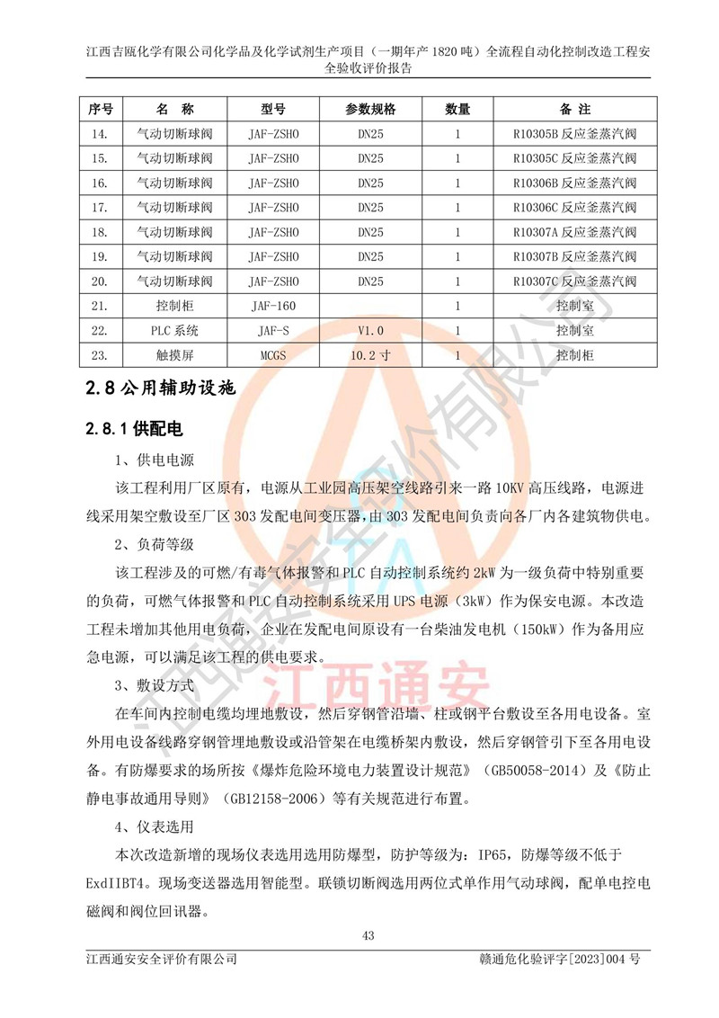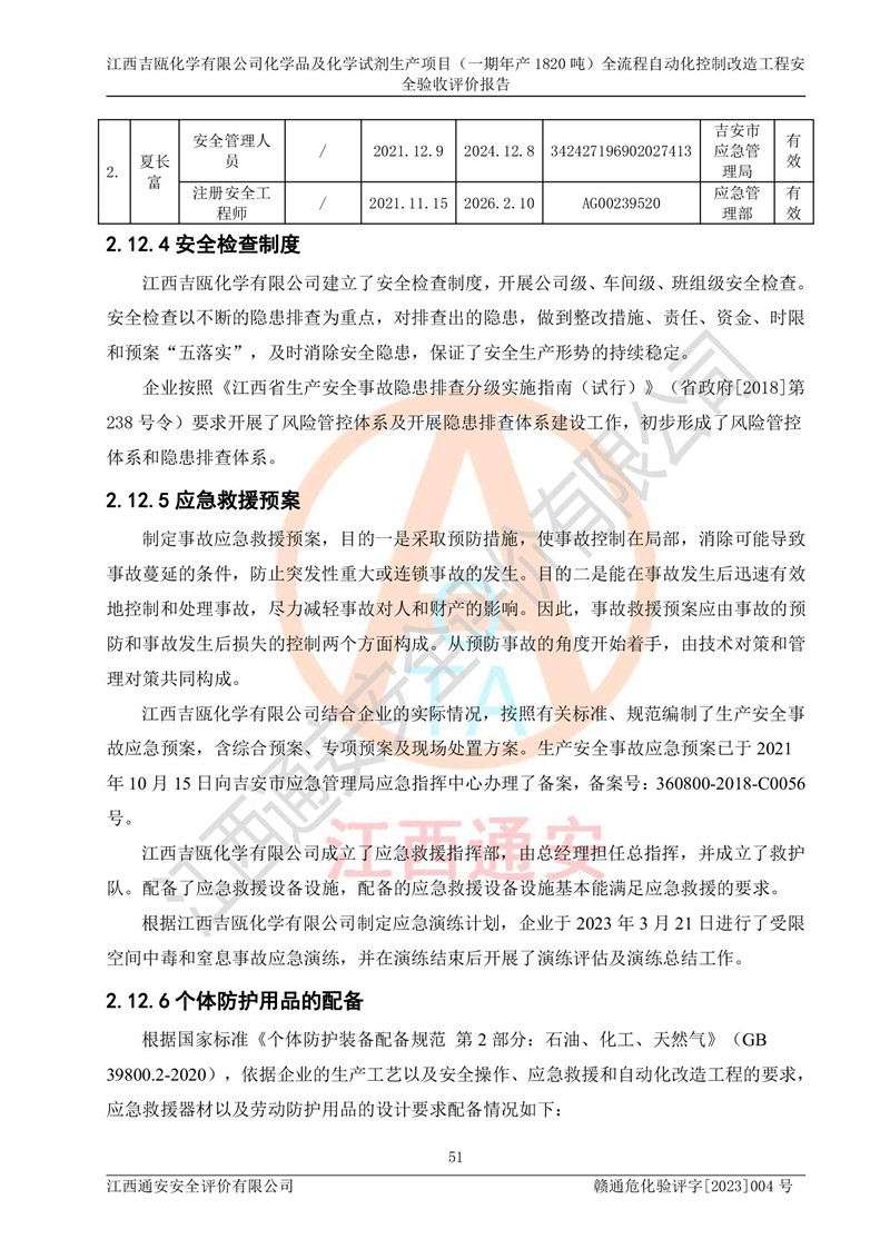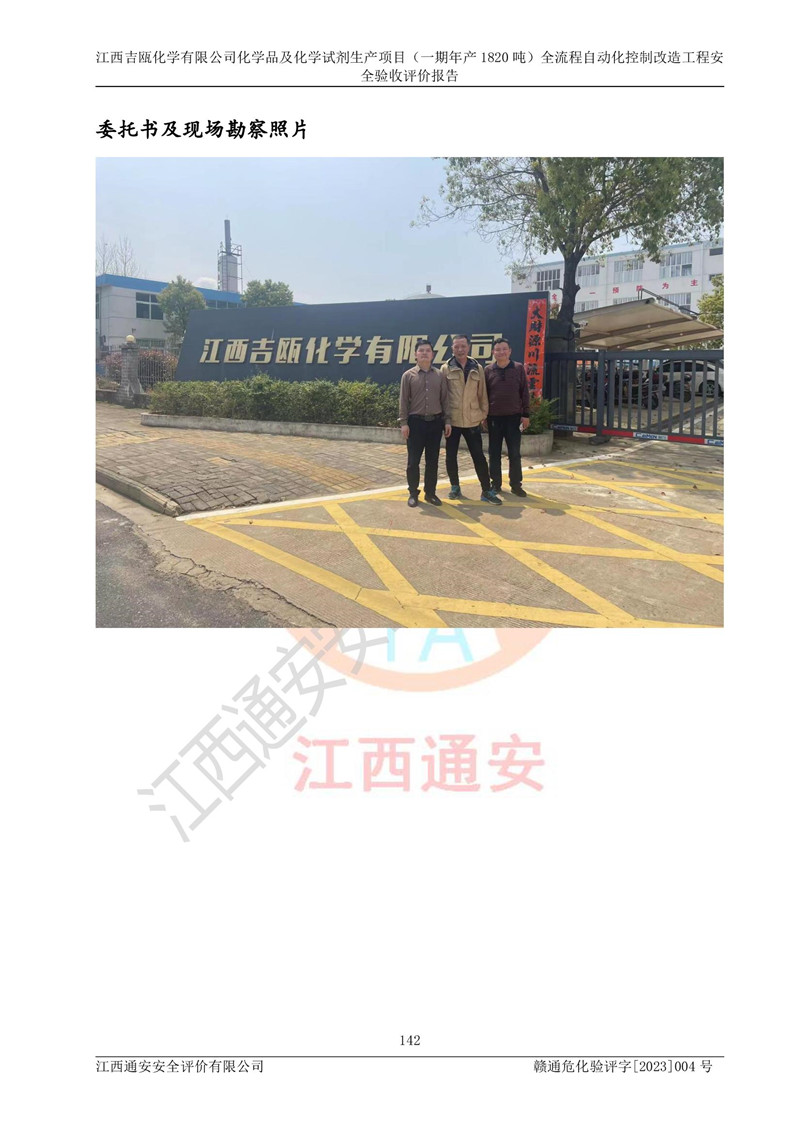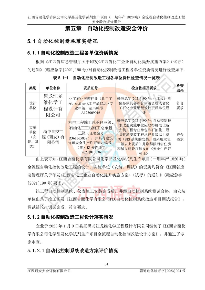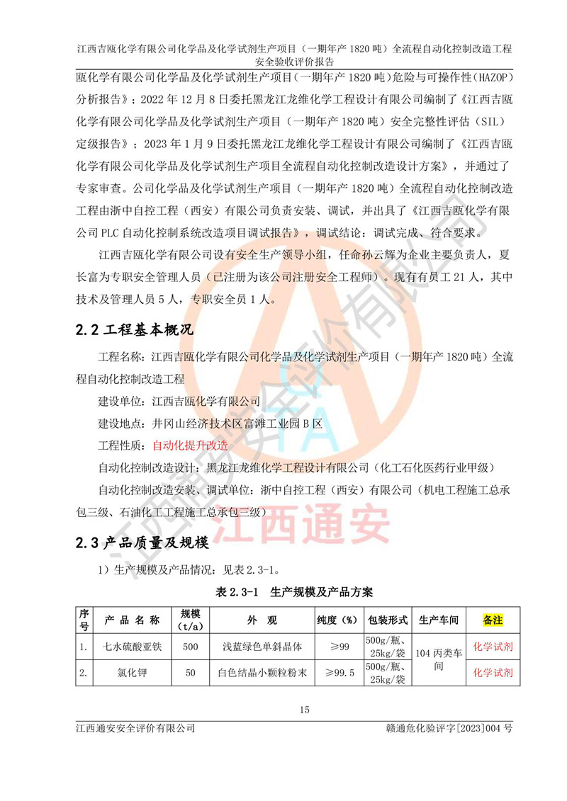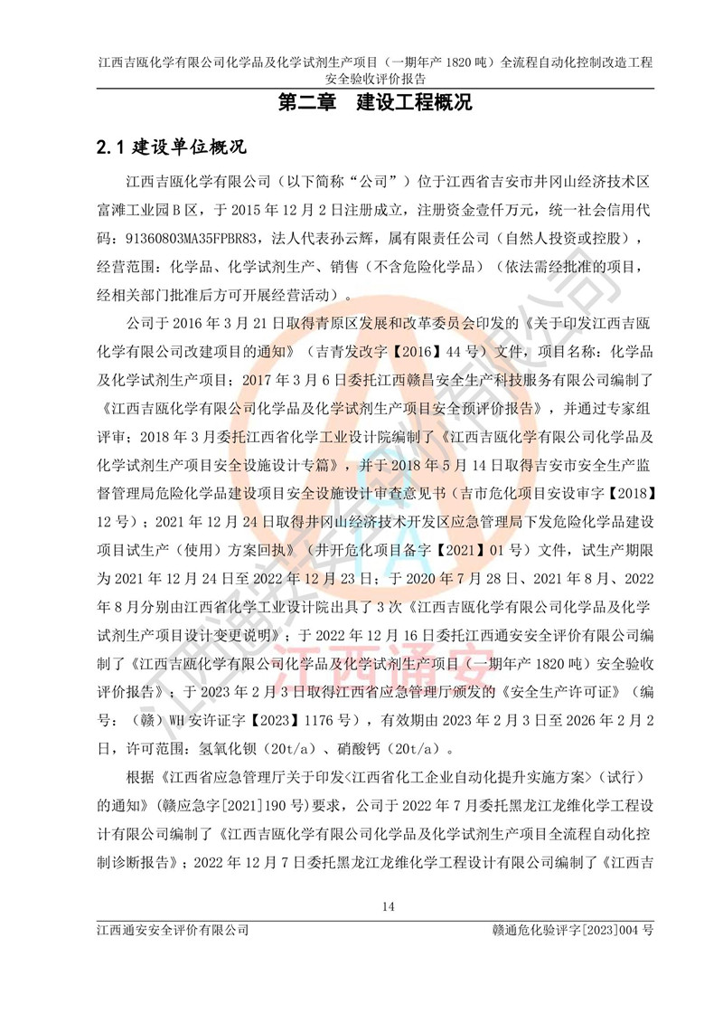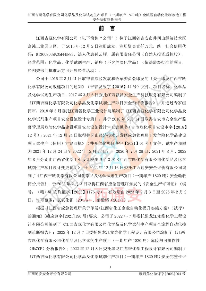 江西吉瓯化学有限公司(以下简称“公司”)位于江西省吉安市井冈山经济技术区富滩工业园B区,于2015年12月2日注册成立,注册资金壹仟万元,统一社会信用代码:91360803MA35FPBR83,法人**孙云辉,属有限责任公司(自然人投资或控股),经营范围:化学品、化学试剂生产、销售(不含危险化学品)(依法需经批准的项目,经相关部门批准后方可开展经营活动)。 公司于2016年3月21日取得青原区发展和改革委员会印发的《关于印发江西吉瓯化学有限公司改建项目的通知》(吉青发改字【2016】44号)文件,项目名称:化学品及化学试剂生产项目;2017年3月6日委托江西赣昌安全生产科技服务有限公司编制了《江西吉瓯化学有限公司化学品及化学试剂生产项目安全预评价报告》,并通过专家组评审;2018年3月委托江西省化学工业设计院编制了《江西吉瓯化学有限公司化学品及化学试剂生产项目安全设施设计专篇》,并于2018年5月14日取得吉安市安全生产监督管理局危险化学品建设项目安全设施设计审查意见书(吉市危化项目安设审字【2018】12号);2021年12月24日取得井冈山经济技术开发区应急管理局下发危险化学品建设项目试生产(使用)方案回执》(井开危化项目备字【2021】01号)文件,试生产期限为2021年12月24日至2022年12月23日;于2020年7月28日、2021年8月、2022年8月分别由江西省化学工业设计院出具了3次《江西吉瓯化学有限公司化学品及化学试剂生产项目设计变更说明》;于2022年12月16日委托江西通安安全评价有限公司编制了《江西吉瓯化学有限公司化学品及化学试剂生产项目(一期年产1820吨)安全验收评价报告》;于2023年2月3日取得江西省应急管理厅颁发的《安全生产许可证》(编号:(赣)WH安许证字【2023】1176号),**期由2023年2月3日至2026年2月2日,许可范围:氢氧化钡(20t/a)、硝酸钙(20t/a)。 根据《江西省应急管理厅关于印发<江西省化工企业自动化提升实施方案>(试行)的通知》(赣应急字[2021]190号)要求,公司于2022年7月委托黑龙江龙维化学工程设计有限公司编制了《江西吉瓯化学有限公司化学品及化学试剂生产项目全流程自动化控制诊断报告》;2022年12月7日委托黑龙江龙维化学工程设计有限公司编制了《江西吉瓯化学有限公司化学品及化学试剂生产项目(一期年产1820吨)危险与可操作性(HAZOP)分析报告》;2022年12月8日委托黑龙江龙维化学工程设计有限公司编制了《江西吉瓯化学有限公司化学品及化学试剂生产项目(一期年产1820吨)安全完整性评估(SIL)定级报告》;2023年1月9日委托黑龙江龙维化学工程设计有限公司编制了《江西吉瓯化学有限公司化学品及化学试剂生产项目全流程自动化控制改造设计方案》,并通过了专家审查。公司化学品及化学试剂生产项目(一期年产1820吨)全流程自动化控制改造工程由浙中自控工程(西安)有限公司负责安装、调试,并出具了《江西吉瓯化学有限公司PLC自动化控制系统改造项目调试报告》,调试结论:调试完成、符合要求。 |