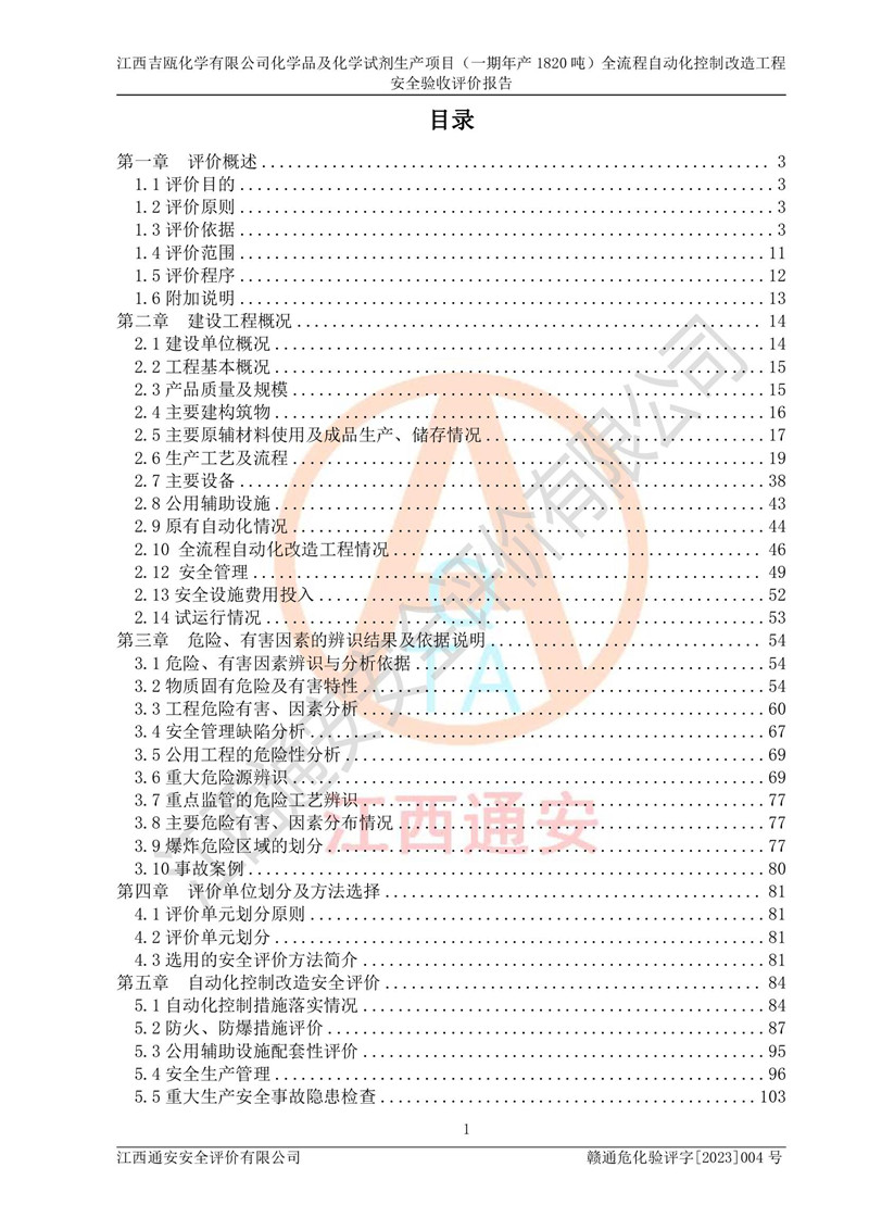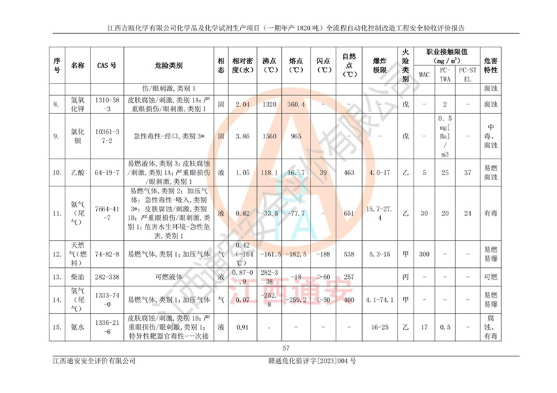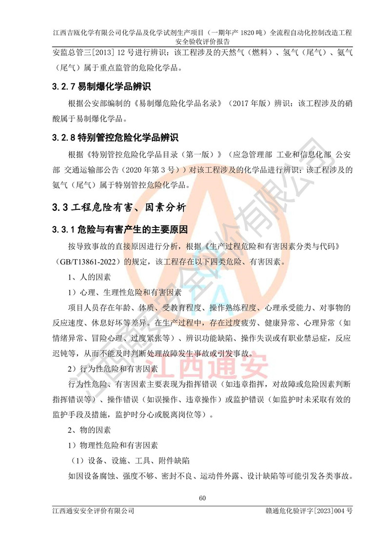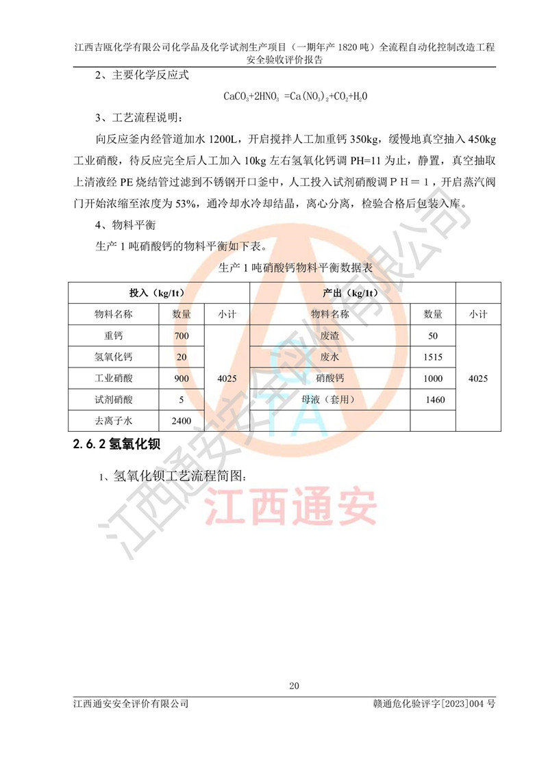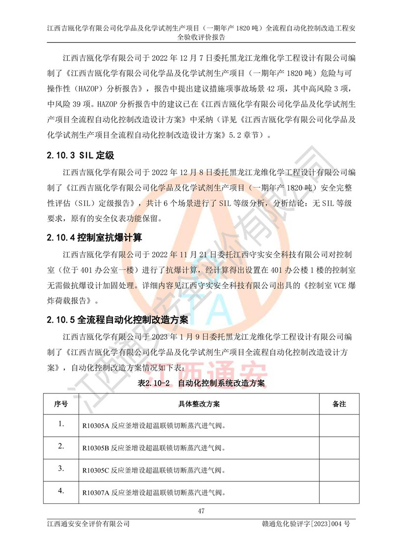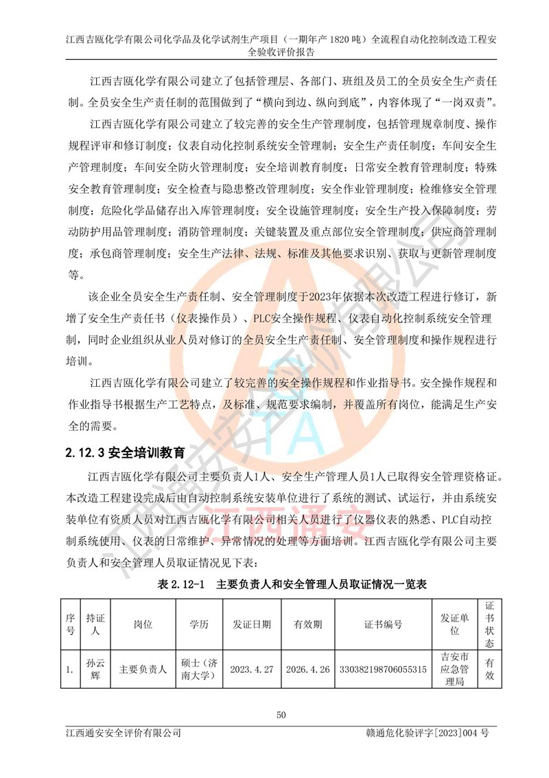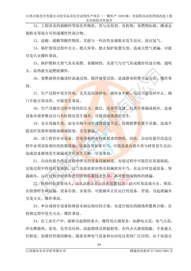 江西吉瓯化学有限公司(以下简称“公司”)位于江西省吉安市井冈山经济技术区富滩工业园B区,于2015年12月2日注册成立,注册资金壹仟万元,统一社会信用代码:91360803MA35FPBR83,法人**孙云辉,属有限责任公司(自然人投资或控股),经营范围:化学品、化学试剂生产、销售(不含危险化学品)(依法需经批准的项目,经相关部门批准后方可开展经营活动)。 公司于2016年3月21日取得青原区发展和改革委员会印发的《关于印发江西吉瓯化学有限公司改建项目的通知》(吉青发改字【2016】44号)文件,项目名称:化学品及化学试剂生产项目;2017年3月6日委托江西赣昌安全生产科技服务有限公司编制了《江西吉瓯化学有限公司化学品及化学试剂生产项目安全预评价报告》,并通过专家组评审;2018年3月委托江西省化学工业设计院编制了《江西吉瓯化学有限公司化学品及化学试剂生产项目安全设施设计专篇》,并于2018年5月14日取得吉安市安全生产监督管理局危险化学品建设项目安全设施设计审查意见书(吉市危化项目安设审字【2018】12号);2021年12月24日取得井冈山经济技术开发区应急管理局下发危险化学品建设项目试生产(使用)方案回执》(井开危化项目备字【2021】01号)文件,试生产期限为2021年12月24日至2022年12月23日;于2020年7月28日、2021年8月、2022年8月分别由江西省化学工业设计院出具了3次《江西吉瓯化学有限公司化学品及化学试剂生产项目设计变更说明》;于2022年12月16日委托江西通安安全评价有限公司编制了《江西吉瓯化学有限公司化学品及化学试剂生产项目(一期年产1820吨)安全验收评价报告》;于2023年2月3日取得江西省应急管理厅颁发的《安全生产许可证》(编号:(赣)WH安许证字【2023】1176号),**期由2023年2月3日至2026年2月2日,许可范围:氢氧化钡(20t/a)、硝酸钙(20t/a)。 根据《江西省应急管理厅关于印发<江西省化工企业自动化提升实施方案>(试行)的通知》(赣应急字[2021]190号)要求,公司于2022年7月委托黑龙江龙维化学工程设计有限公司编制了《江西吉瓯化学有限公司化学品及化学试剂生产项目全流程自动化控制诊断报告》;2022年12月7日委托黑龙江龙维化学工程设计有限公司编制了《江西吉瓯化学有限公司化学品及化学试剂生产项目(一期年产1820吨)危险与可操作性(HAZOP)分析报告》;2022年12月8日委托黑龙江龙维化学工程设计有限公司编制了《江西吉瓯化学有限公司化学品及化学试剂生产项目(一期年产1820吨)安全完整性评估(SIL)定级报告》;2023年1月9日委托黑龙江龙维化学工程设计有限公司编制了《江西吉瓯化学有限公司化学品及化学试剂生产项目全流程自动化控制改造设计方案》,并通过了专家审查。公司化学品及化学试剂生产项目(一期年产1820吨)全流程自动化控制改造工程由浙中自控工程(西安)有限公司负责安装、调试,并出具了《江西吉瓯化学有限公司PLC自动化控制系统改造项目调试报告》,调试结论:调试完成、符合要求。 |