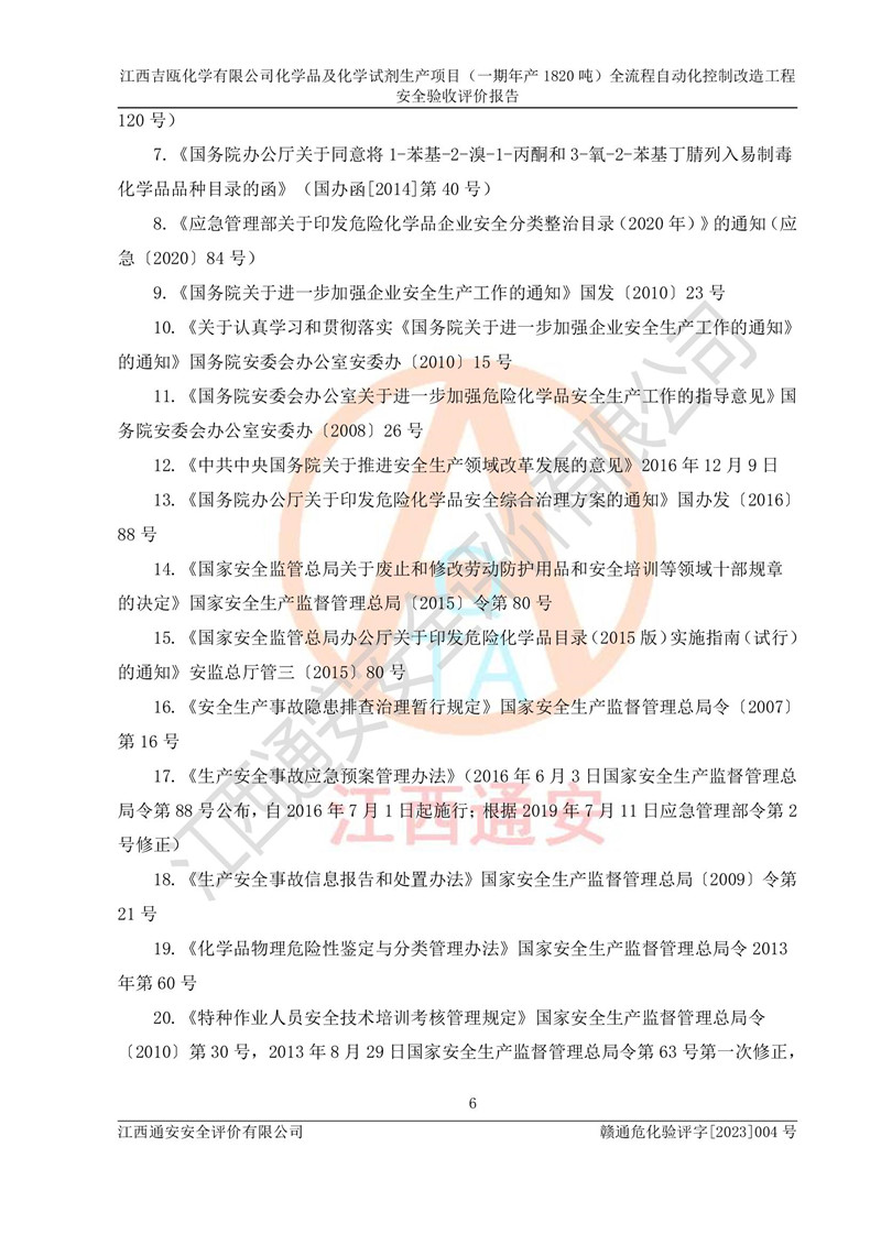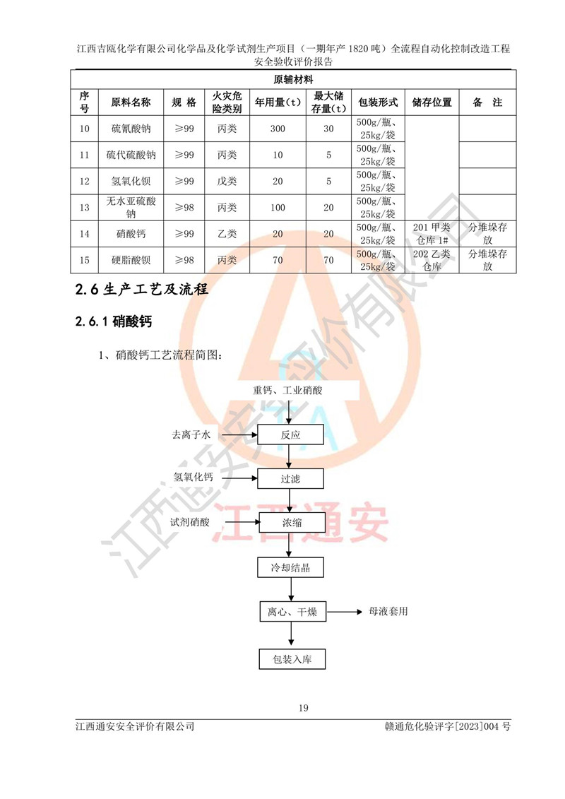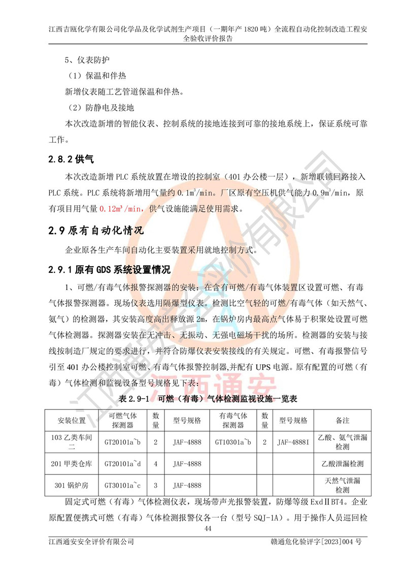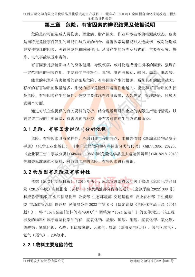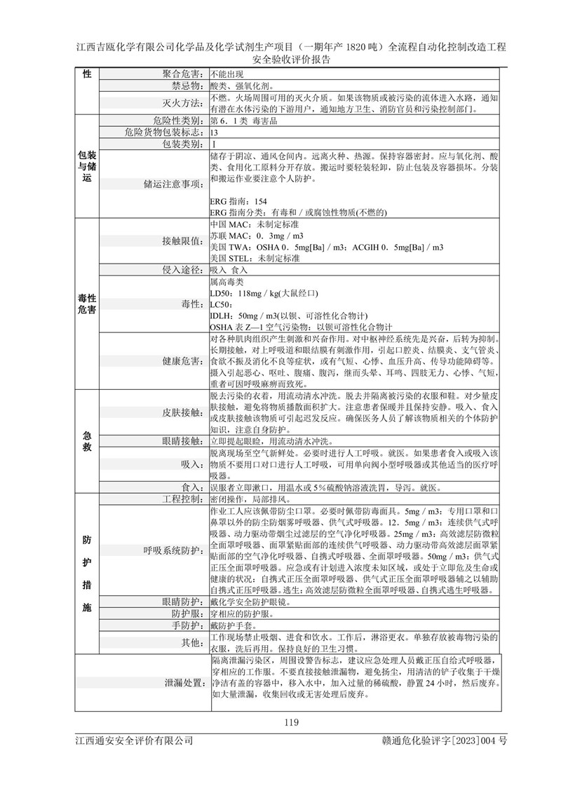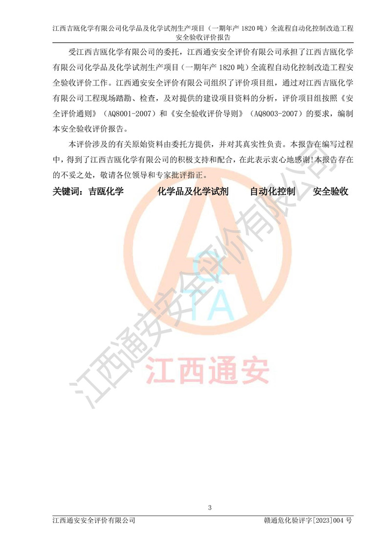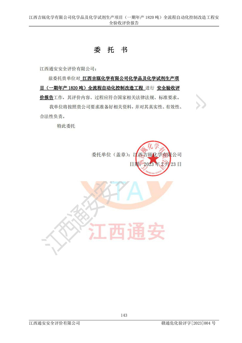 江西吉瓯化学有限公司(以下简称“公司”)位于江西省吉安市井冈山经济技术区富滩工业园B区,于2015年12月2日注册成立,注册资金壹仟万元,统一社会信用代码:91360803MA35FPBR83,法人**孙云辉,属有限责任公司(自然人投资或控股),经营范围:化学品、化学试剂生产、销售(不含危险化学品)(依法需经批准的项目,经相关部门批准后方可开展经营活动)。 公司于2016年3月21日取得青原区发展和改革委员会印发的《关于印发江西吉瓯化学有限公司改建项目的通知》(吉青发改字【2016】44号)文件,项目名称:化学品及化学试剂生产项目;2017年3月6日委托江西赣昌安全生产科技服务有限公司编制了《江西吉瓯化学有限公司化学品及化学试剂生产项目安全预评价报告》,并通过专家组评审;2018年3月委托江西省化学工业设计院编制了《江西吉瓯化学有限公司化学品及化学试剂生产项目安全设施设计专篇》,并于2018年5月14日取得吉安市安全生产监督管理局危险化学品建设项目安全设施设计审查意见书(吉市危化项目安设审字【2018】12号);2021年12月24日取得井冈山经济技术开发区应急管理局下发危险化学品建设项目试生产(使用)方案回执》(井开危化项目备字【2021】01号)文件,试生产期限为2021年12月24日至2022年12月23日;于2020年7月28日、2021年8月、2022年8月分别由江西省化学工业设计院出具了3次《江西吉瓯化学有限公司化学品及化学试剂生产项目设计变更说明》;于2022年12月16日委托江西通安安全评价有限公司编制了《江西吉瓯化学有限公司化学品及化学试剂生产项目(一期年产1820吨)安全验收评价报告》;于2023年2月3日取得江西省应急管理厅颁发的《安全生产许可证》(编号:(赣)WH安许证字【2023】1176号),**期由2023年2月3日至2026年2月2日,许可范围:氢氧化钡(20t/a)、硝酸钙(20t/a)。 根据《江西省应急管理厅关于印发<江西省化工企业自动化提升实施方案>(试行)的通知》(赣应急字[2021]190号)要求,公司于2022年7月委托黑龙江龙维化学工程设计有限公司编制了《江西吉瓯化学有限公司化学品及化学试剂生产项目全流程自动化控制诊断报告》;2022年12月7日委托黑龙江龙维化学工程设计有限公司编制了《江西吉瓯化学有限公司化学品及化学试剂生产项目(一期年产1820吨)危险与可操作性(HAZOP)分析报告》;2022年12月8日委托黑龙江龙维化学工程设计有限公司编制了《江西吉瓯化学有限公司化学品及化学试剂生产项目(一期年产1820吨)安全完整性评估(SIL)定级报告》;2023年1月9日委托黑龙江龙维化学工程设计有限公司编制了《江西吉瓯化学有限公司化学品及化学试剂生产项目全流程自动化控制改造设计方案》,并通过了专家审查。公司化学品及化学试剂生产项目(一期年产1820吨)全流程自动化控制改造工程由浙中自控工程(西安)有限公司负责安装、调试,并出具了《江西吉瓯化学有限公司PLC自动化控制系统改造项目调试报告》,调试结论:调试完成、符合要求。 |