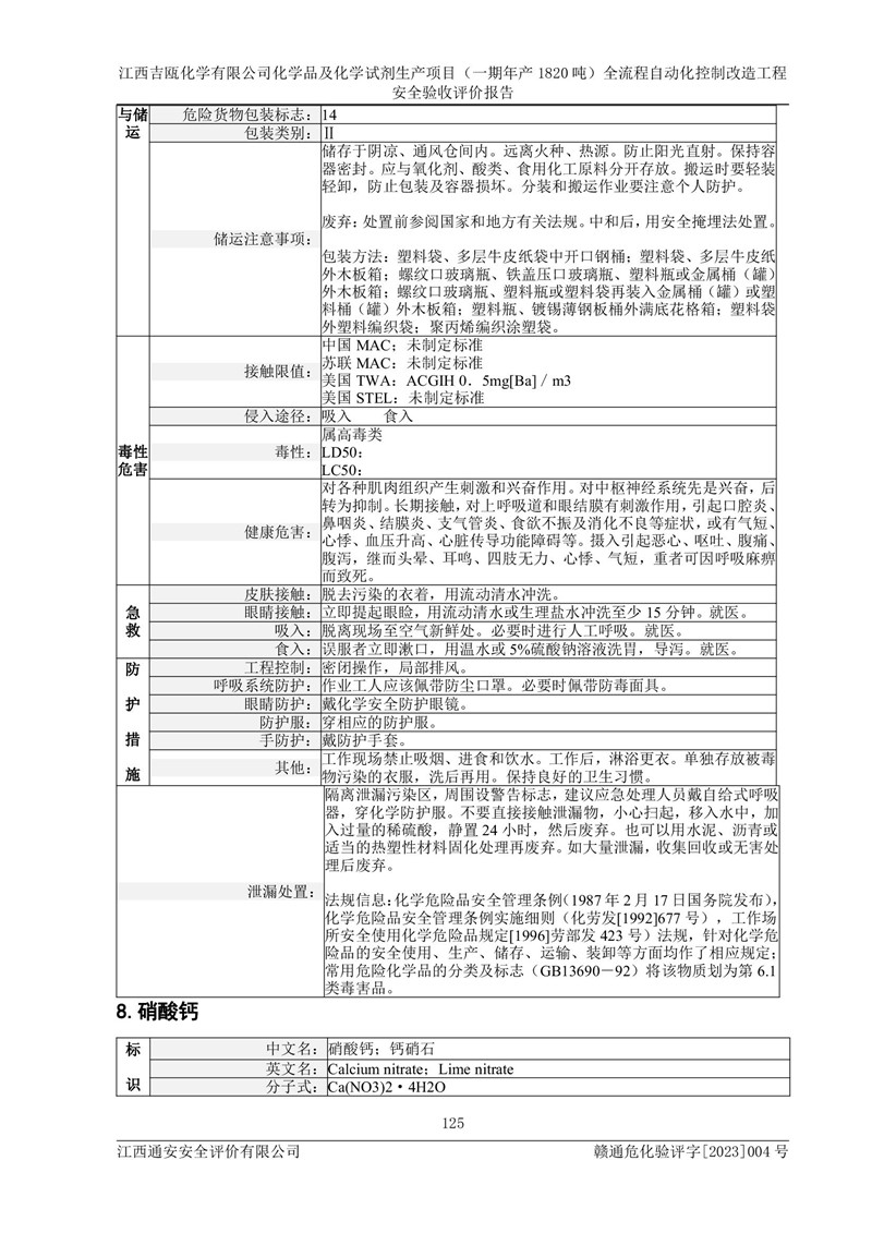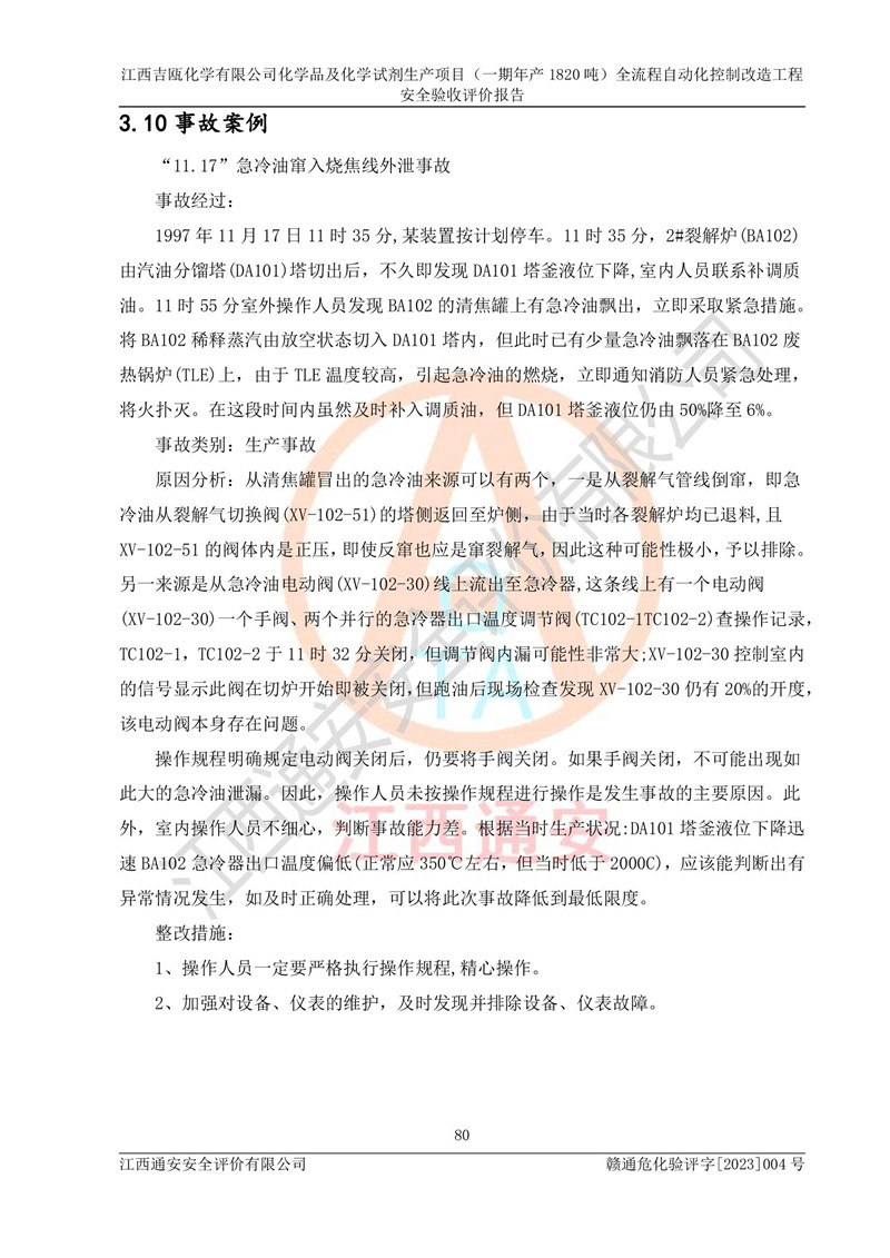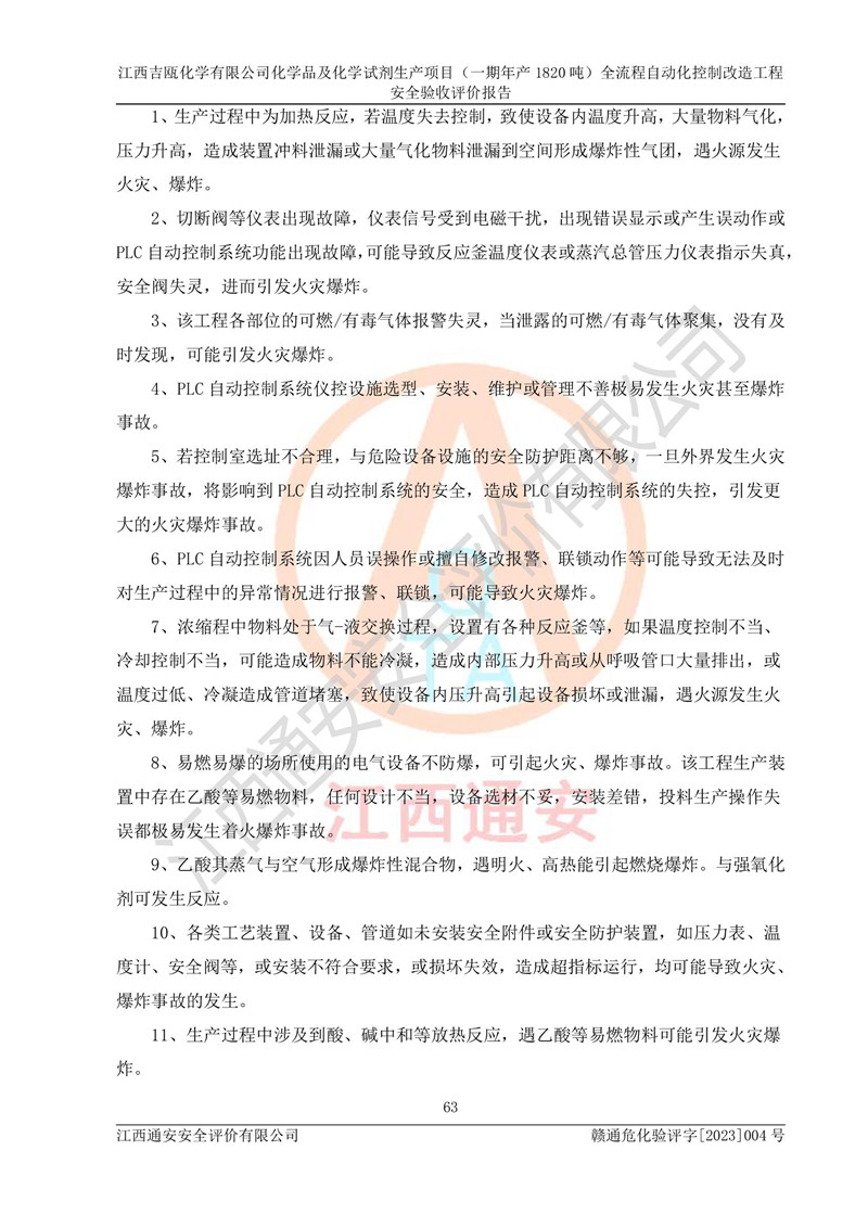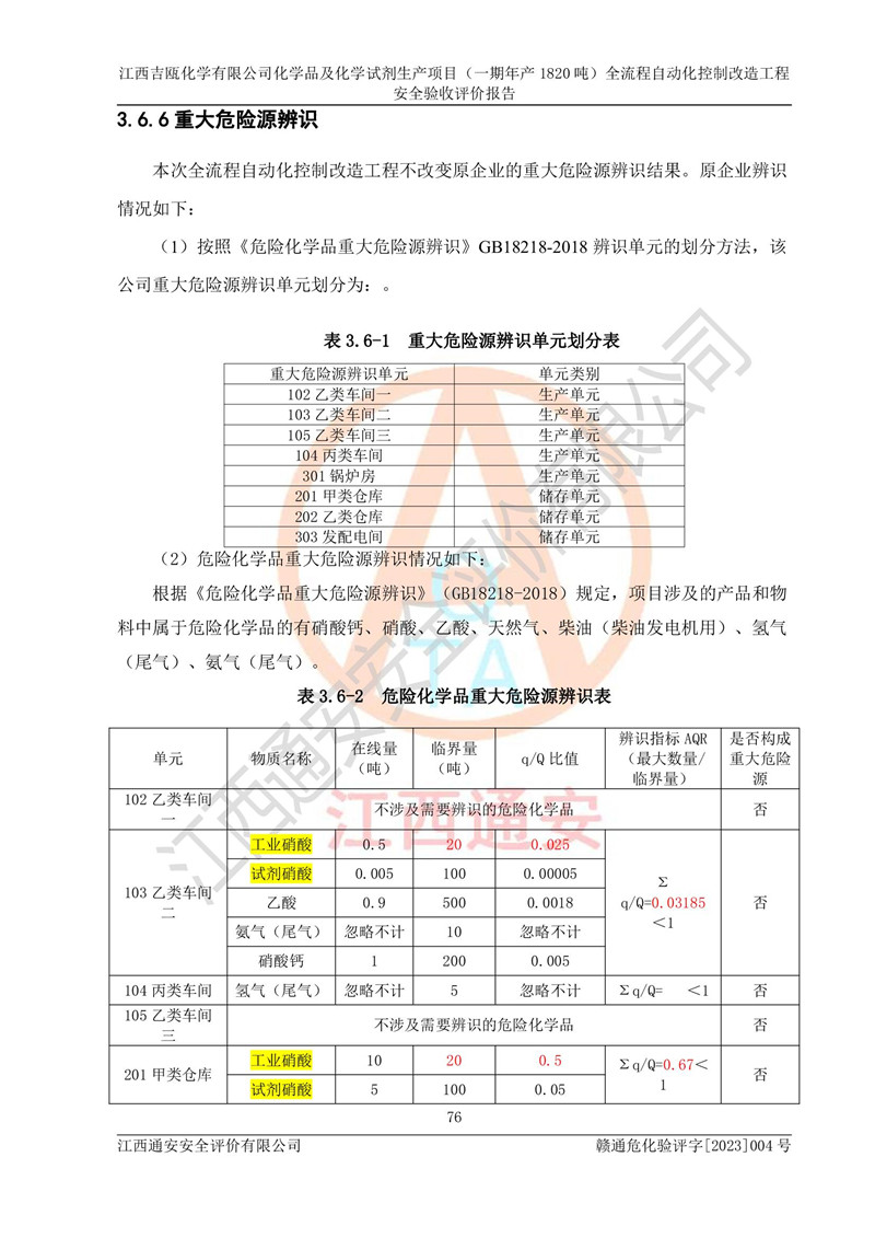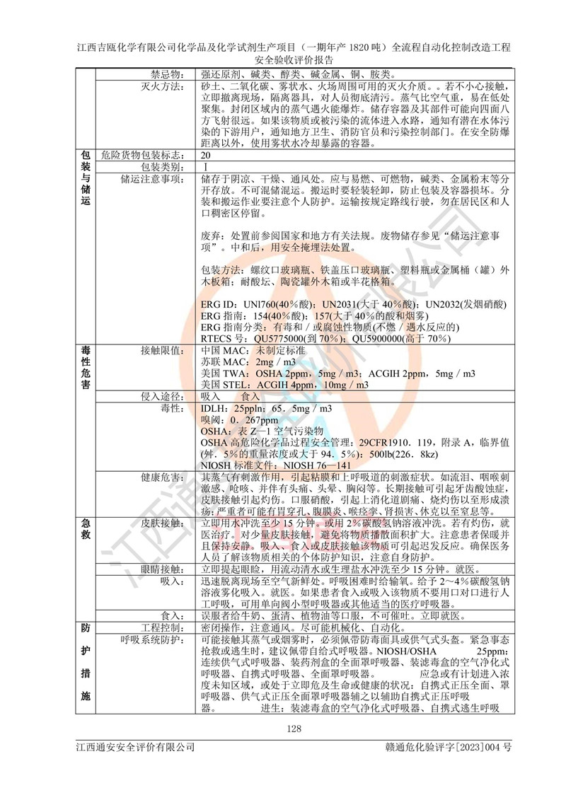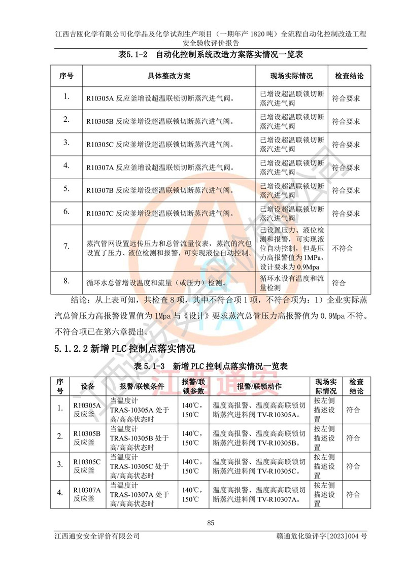 江西吉瓯化学有限公司(以下简称“公司”)位于江西省吉安市井冈山经济技术区富滩工业园B区,于2015年12月2日注册成立,注册资金壹仟万元,统一社会信用代码:91360803MA35FPBR83,法人**孙云辉,属有限责任公司(自然人投资或控股),经营范围:化学品、化学试剂生产、销售(不含危险化学品)(依法需经批准的项目,经相关部门批准后方可开展经营活动)。 公司于2016年3月21日取得青原区发展和改革委员会印发的《关于印发江西吉瓯化学有限公司改建项目的通知》(吉青发改字【2016】44号)文件,项目名称:化学品及化学试剂生产项目;2017年3月6日委托江西赣昌安全生产科技服务有限公司编制了《江西吉瓯化学有限公司化学品及化学试剂生产项目安全预评价报告》,并通过专家组评审;2018年3月委托江西省化学工业设计院编制了《江西吉瓯化学有限公司化学品及化学试剂生产项目安全设施设计专篇》,并于2018年5月14日取得吉安市安全生产监督管理局危险化学品建设项目安全设施设计审查意见书(吉市危化项目安设审字【2018】12号);2021年12月24日取得井冈山经济技术开发区应急管理局下发危险化学品建设项目试生产(使用)方案回执》(井开危化项目备字【2021】01号)文件,试生产期限为2021年12月24日至2022年12月23日;于2020年7月28日、2021年8月、2022年8月分别由江西省化学工业设计院出具了3次《江西吉瓯化学有限公司化学品及化学试剂生产项目设计变更说明》;于2022年12月16日委托江西通安安全评价有限公司编制了《江西吉瓯化学有限公司化学品及化学试剂生产项目(一期年产1820吨)安全验收评价报告》;于2023年2月3日取得江西省应急管理厅颁发的《安全生产许可证》(编号:(赣)WH安许证字【2023】1176号),**期由2023年2月3日至2026年2月2日,许可范围:氢氧化钡(20t/a)、硝酸钙(20t/a)。 根据《江西省应急管理厅关于印发<江西省化工企业自动化提升实施方案>(试行)的通知》(赣应急字[2021]190号)要求,公司于2022年7月委托黑龙江龙维化学工程设计有限公司编制了《江西吉瓯化学有限公司化学品及化学试剂生产项目全流程自动化控制诊断报告》;2022年12月7日委托黑龙江龙维化学工程设计有限公司编制了《江西吉瓯化学有限公司化学品及化学试剂生产项目(一期年产1820吨)危险与可操作性(HAZOP)分析报告》;2022年12月8日委托黑龙江龙维化学工程设计有限公司编制了《江西吉瓯化学有限公司化学品及化学试剂生产项目(一期年产1820吨)安全完整性评估(SIL)定级报告》;2023年1月9日委托黑龙江龙维化学工程设计有限公司编制了《江西吉瓯化学有限公司化学品及化学试剂生产项目全流程自动化控制改造设计方案》,并通过了专家审查。公司化学品及化学试剂生产项目(一期年产1820吨)全流程自动化控制改造工程由浙中自控工程(西安)有限公司负责安装、调试,并出具了《江西吉瓯化学有限公司PLC自动化控制系统改造项目调试报告》,调试结论:调试完成、符合要求。 |