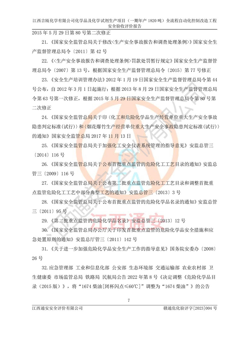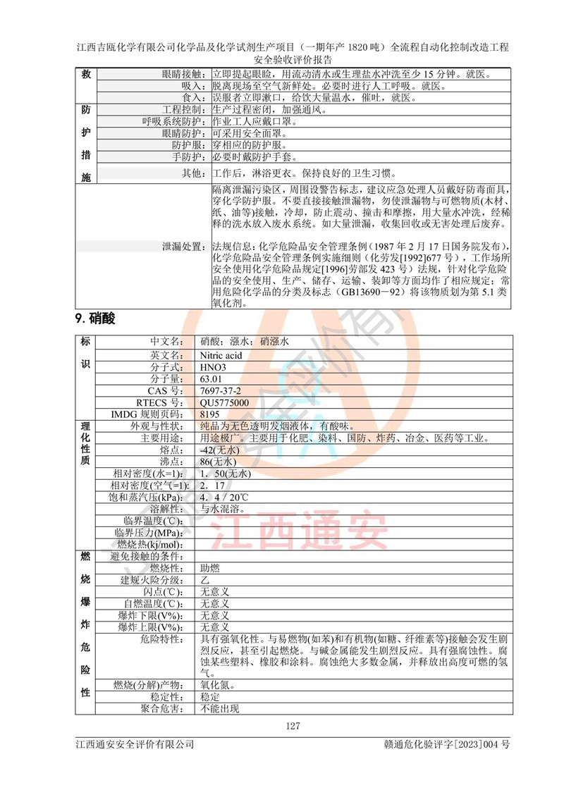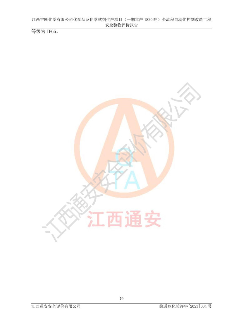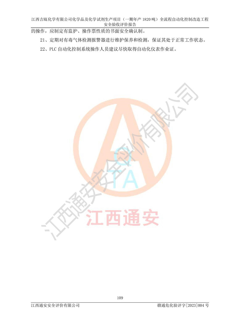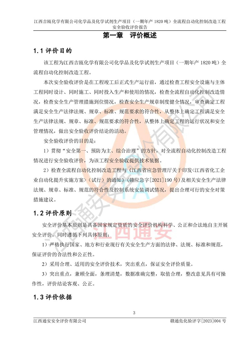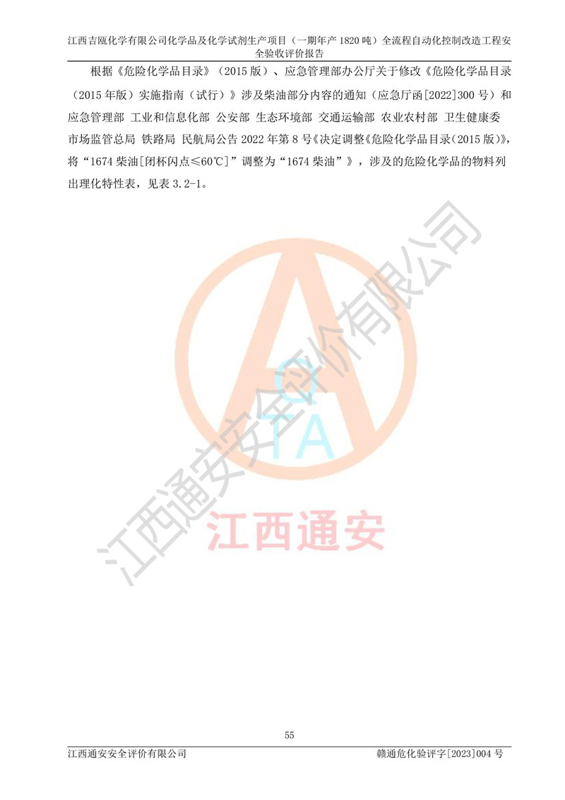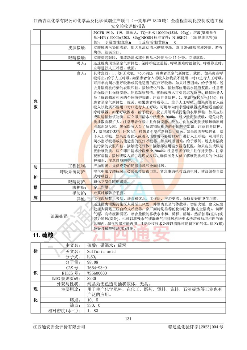 江西吉瓯化学有限公司(以下简称“公司”)位于江西省吉安市井冈山经济技术区富滩工业园B区,于2015年12月2日注册成立,注册资金壹仟万元,统一社会信用代码:91360803MA35FPBR83,法人**孙云辉,属有限责任公司(自然人投资或控股),经营范围:化学品、化学试剂生产、销售(不含危险化学品)(依法需经批准的项目,经相关部门批准后方可开展经营活动)。 公司于2016年3月21日取得青原区发展和改革委员会印发的《关于印发江西吉瓯化学有限公司改建项目的通知》(吉青发改字【2016】44号)文件,项目名称:化学品及化学试剂生产项目;2017年3月6日委托江西赣昌安全生产科技服务有限公司编制了《江西吉瓯化学有限公司化学品及化学试剂生产项目安全预评价报告》,并通过专家组评审;2018年3月委托江西省化学工业设计院编制了《江西吉瓯化学有限公司化学品及化学试剂生产项目安全设施设计专篇》,并于2018年5月14日取得吉安市安全生产监督管理局危险化学品建设项目安全设施设计审查意见书(吉市危化项目安设审字【2018】12号);2021年12月24日取得井冈山经济技术开发区应急管理局下发危险化学品建设项目试生产(使用)方案回执》(井开危化项目备字【2021】01号)文件,试生产期限为2021年12月24日至2022年12月23日;于2020年7月28日、2021年8月、2022年8月分别由江西省化学工业设计院出具了3次《江西吉瓯化学有限公司化学品及化学试剂生产项目设计变更说明》;于2022年12月16日委托江西通安安全评价有限公司编制了《江西吉瓯化学有限公司化学品及化学试剂生产项目(一期年产1820吨)安全验收评价报告》;于2023年2月3日取得江西省应急管理厅颁发的《安全生产许可证》(编号:(赣)WH安许证字【2023】1176号),**期由2023年2月3日至2026年2月2日,许可范围:氢氧化钡(20t/a)、硝酸钙(20t/a)。 根据《江西省应急管理厅关于印发<江西省化工企业自动化提升实施方案>(试行)的通知》(赣应急字[2021]190号)要求,公司于2022年7月委托黑龙江龙维化学工程设计有限公司编制了《江西吉瓯化学有限公司化学品及化学试剂生产项目全流程自动化控制诊断报告》;2022年12月7日委托黑龙江龙维化学工程设计有限公司编制了《江西吉瓯化学有限公司化学品及化学试剂生产项目(一期年产1820吨)危险与可操作性(HAZOP)分析报告》;2022年12月8日委托黑龙江龙维化学工程设计有限公司编制了《江西吉瓯化学有限公司化学品及化学试剂生产项目(一期年产1820吨)安全完整性评估(SIL)定级报告》;2023年1月9日委托黑龙江龙维化学工程设计有限公司编制了《江西吉瓯化学有限公司化学品及化学试剂生产项目全流程自动化控制改造设计方案》,并通过了专家审查。公司化学品及化学试剂生产项目(一期年产1820吨)全流程自动化控制改造工程由浙中自控工程(西安)有限公司负责安装、调试,并出具了《江西吉瓯化学有限公司PLC自动化控制系统改造项目调试报告》,调试结论:调试完成、符合要求。 |
