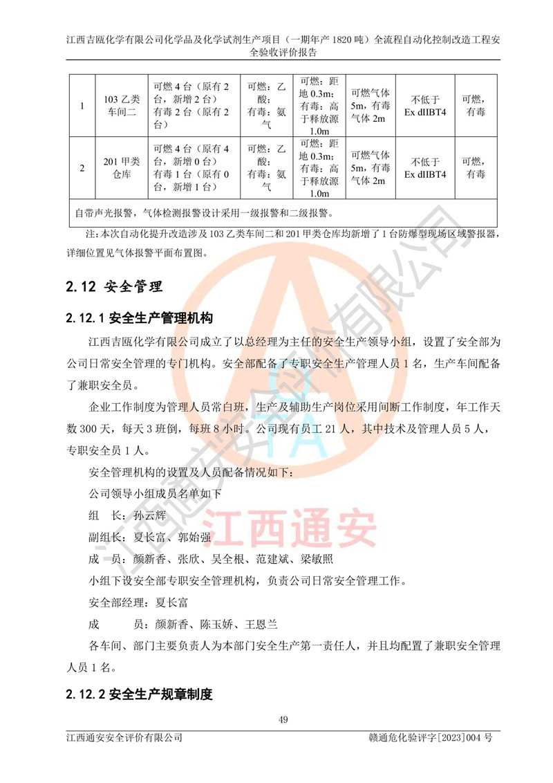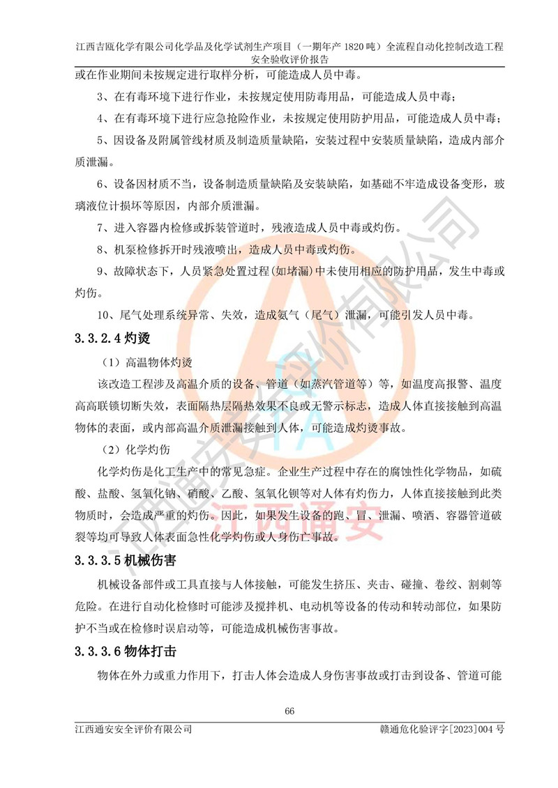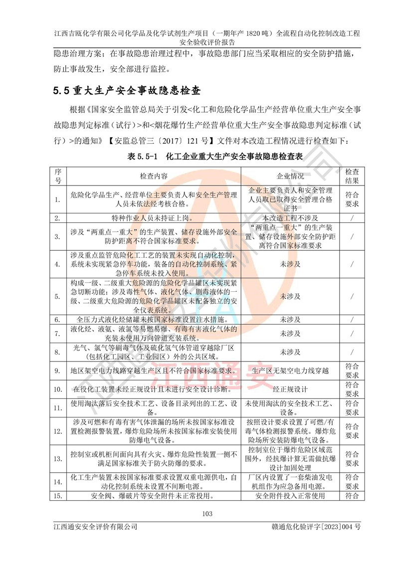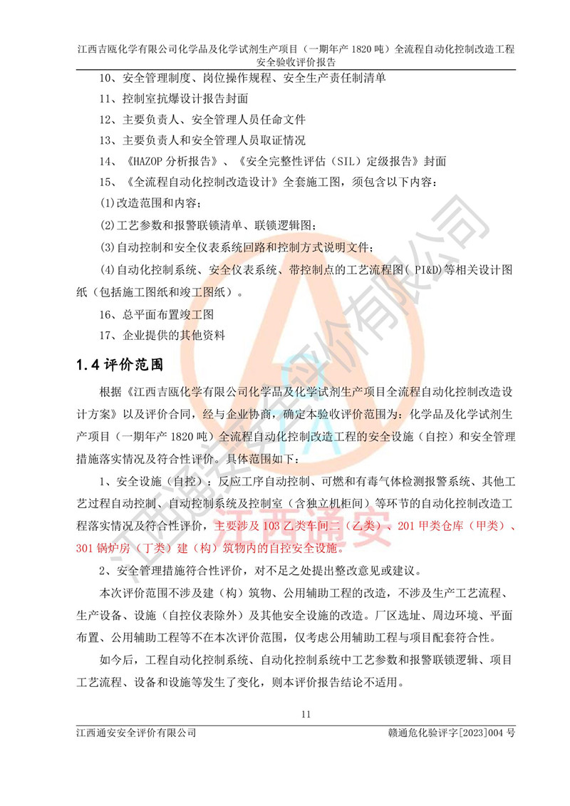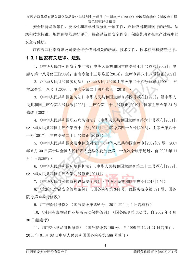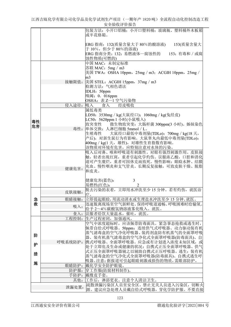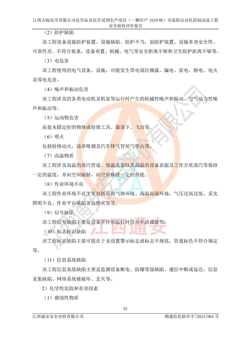 江西吉瓯化学有限公司(以下简称“公司”)位于江西省吉安市井冈山经济技术区富滩工业园B区,于2015年12月2日注册成立,注册资金壹仟万元,统一社会信用代码:91360803MA35FPBR83,法人**孙云辉,属有限责任公司(自然人投资或控股),经营范围:化学品、化学试剂生产、销售(不含危险化学品)(依法需经批准的项目,经相关部门批准后方可开展经营活动)。 公司于2016年3月21日取得青原区发展和改革委员会印发的《关于印发江西吉瓯化学有限公司改建项目的通知》(吉青发改字【2016】44号)文件,项目名称:化学品及化学试剂生产项目;2017年3月6日委托江西赣昌安全生产科技服务有限公司编制了《江西吉瓯化学有限公司化学品及化学试剂生产项目安全预评价报告》,并通过专家组评审;2018年3月委托江西省化学工业设计院编制了《江西吉瓯化学有限公司化学品及化学试剂生产项目安全设施设计专篇》,并于2018年5月14日取得吉安市安全生产监督管理局危险化学品建设项目安全设施设计审查意见书(吉市危化项目安设审字【2018】12号);2021年12月24日取得井冈山经济技术开发区应急管理局下发危险化学品建设项目试生产(使用)方案回执》(井开危化项目备字【2021】01号)文件,试生产期限为2021年12月24日至2022年12月23日;于2020年7月28日、2021年8月、2022年8月分别由江西省化学工业设计院出具了3次《江西吉瓯化学有限公司化学品及化学试剂生产项目设计变更说明》;于2022年12月16日委托江西通安安全评价有限公司编制了《江西吉瓯化学有限公司化学品及化学试剂生产项目(一期年产1820吨)安全验收评价报告》;于2023年2月3日取得江西省应急管理厅颁发的《安全生产许可证》(编号:(赣)WH安许证字【2023】1176号),**期由2023年2月3日至2026年2月2日,许可范围:氢氧化钡(20t/a)、硝酸钙(20t/a)。 根据《江西省应急管理厅关于印发<江西省化工企业自动化提升实施方案>(试行)的通知》(赣应急字[2021]190号)要求,公司于2022年7月委托黑龙江龙维化学工程设计有限公司编制了《江西吉瓯化学有限公司化学品及化学试剂生产项目全流程自动化控制诊断报告》;2022年12月7日委托黑龙江龙维化学工程设计有限公司编制了《江西吉瓯化学有限公司化学品及化学试剂生产项目(一期年产1820吨)危险与可操作性(HAZOP)分析报告》;2022年12月8日委托黑龙江龙维化学工程设计有限公司编制了《江西吉瓯化学有限公司化学品及化学试剂生产项目(一期年产1820吨)安全完整性评估(SIL)定级报告》;2023年1月9日委托黑龙江龙维化学工程设计有限公司编制了《江西吉瓯化学有限公司化学品及化学试剂生产项目全流程自动化控制改造设计方案》,并通过了专家审查。公司化学品及化学试剂生产项目(一期年产1820吨)全流程自动化控制改造工程由浙中自控工程(西安)有限公司负责安装、调试,并出具了《江西吉瓯化学有限公司PLC自动化控制系统改造项目调试报告》,调试结论:调试完成、符合要求。 |