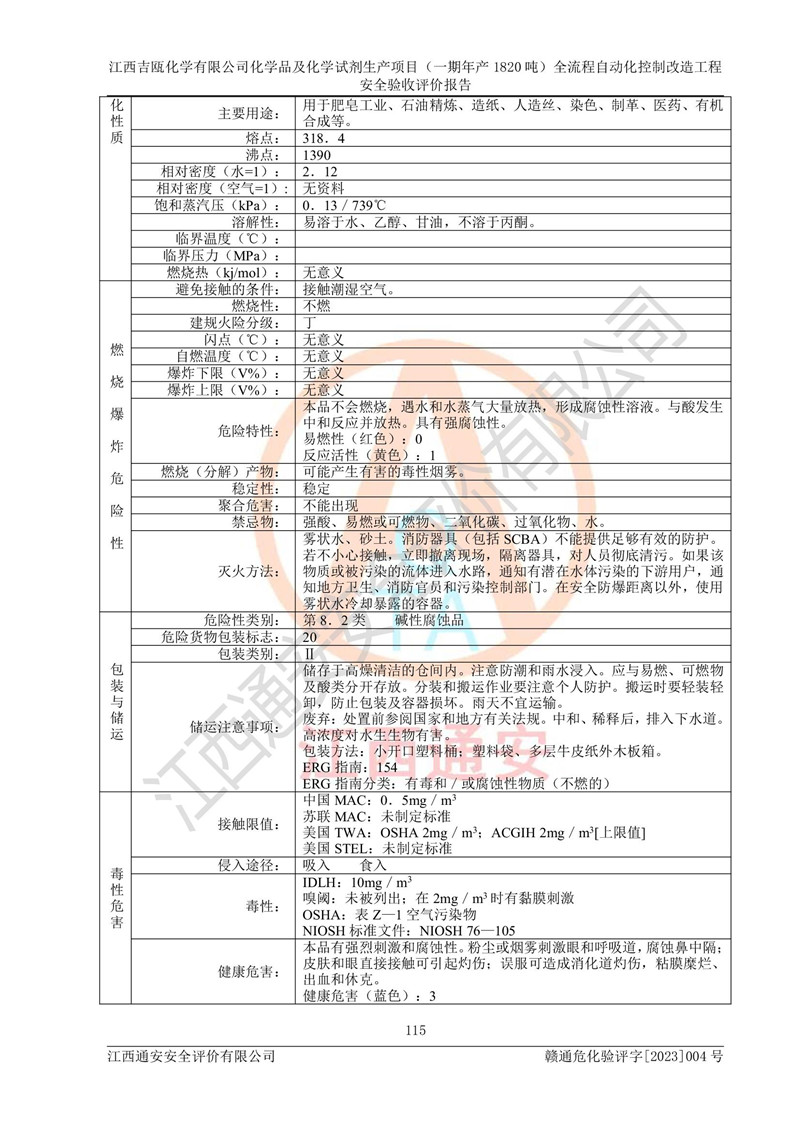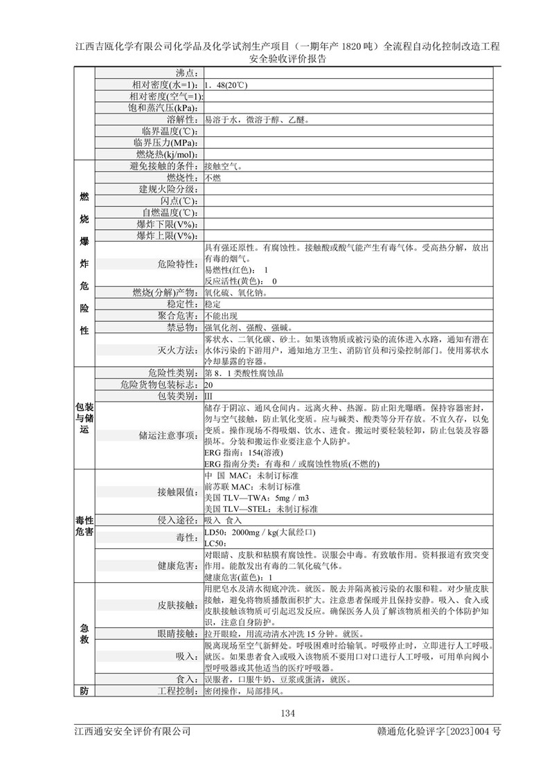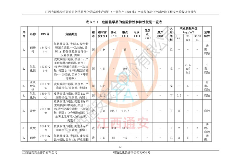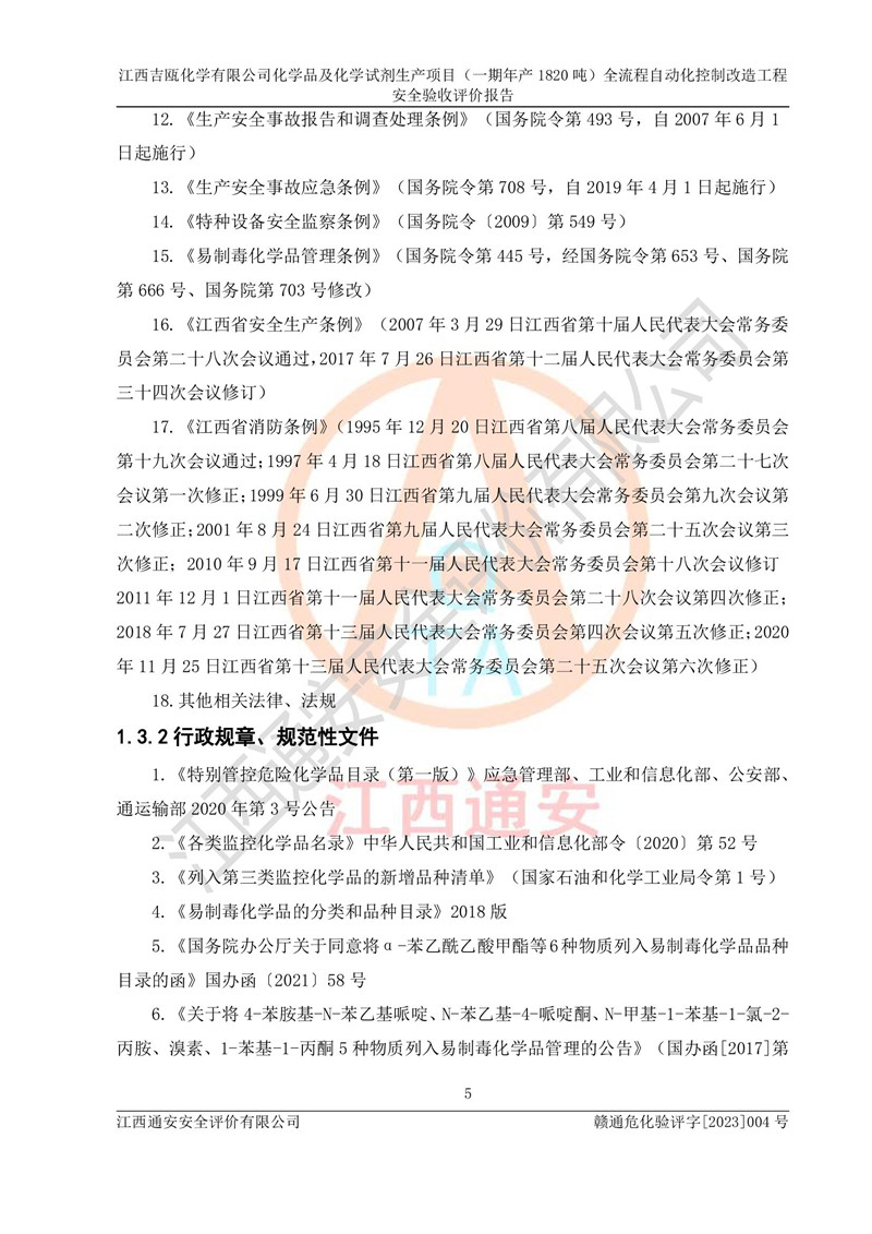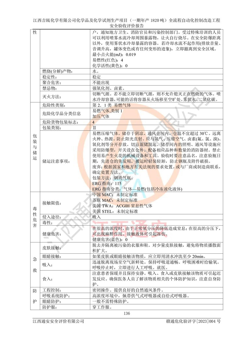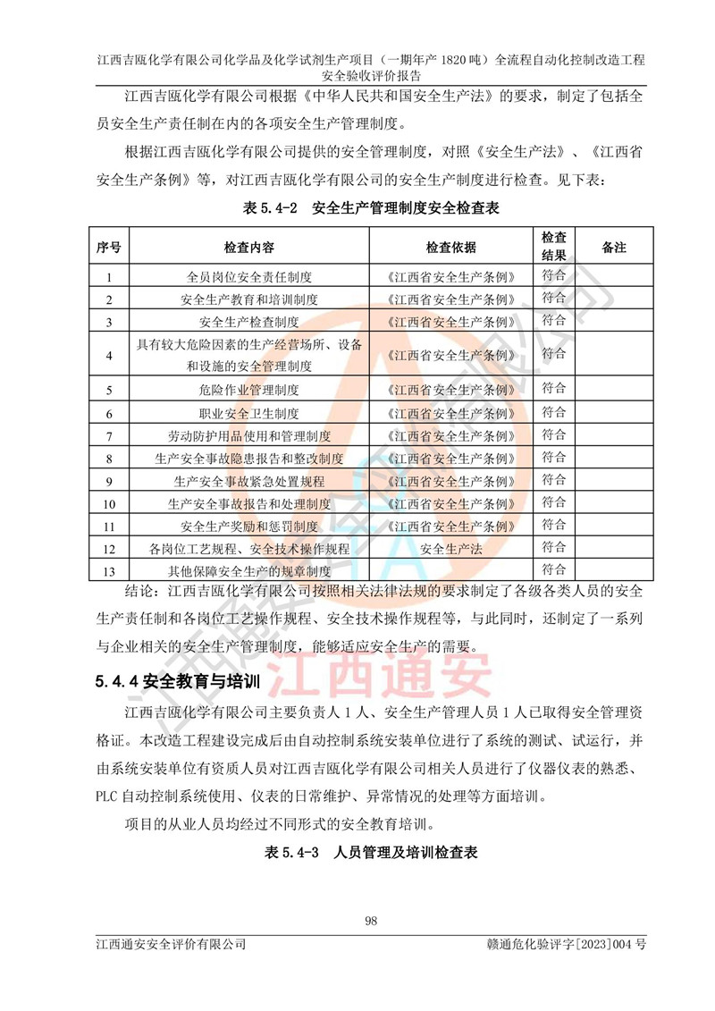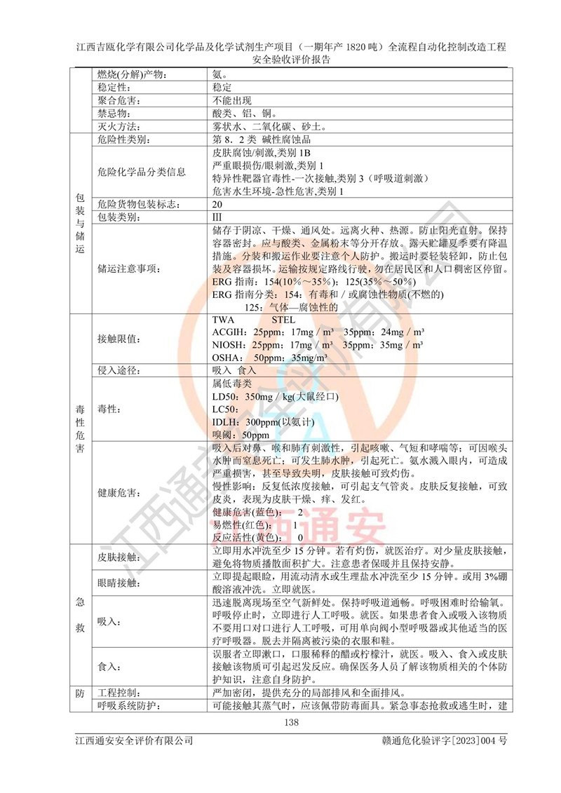 江西吉瓯化学有限公司(以下简称“公司”)位于江西省吉安市井冈山经济技术区富滩工业园B区,于2015年12月2日注册成立,注册资金壹仟万元,统一社会信用代码:91360803MA35FPBR83,法人**孙云辉,属有限责任公司(自然人投资或控股),经营范围:化学品、化学试剂生产、销售(不含危险化学品)(依法需经批准的项目,经相关部门批准后方可开展经营活动)。 公司于2016年3月21日取得青原区发展和改革委员会印发的《关于印发江西吉瓯化学有限公司改建项目的通知》(吉青发改字【2016】44号)文件,项目名称:化学品及化学试剂生产项目;2017年3月6日委托江西赣昌安全生产科技服务有限公司编制了《江西吉瓯化学有限公司化学品及化学试剂生产项目安全预评价报告》,并通过专家组评审;2018年3月委托江西省化学工业设计院编制了《江西吉瓯化学有限公司化学品及化学试剂生产项目安全设施设计专篇》,并于2018年5月14日取得吉安市安全生产监督管理局危险化学品建设项目安全设施设计审查意见书(吉市危化项目安设审字【2018】12号);2021年12月24日取得井冈山经济技术开发区应急管理局下发危险化学品建设项目试生产(使用)方案回执》(井开危化项目备字【2021】01号)文件,试生产期限为2021年12月24日至2022年12月23日;于2020年7月28日、2021年8月、2022年8月分别由江西省化学工业设计院出具了3次《江西吉瓯化学有限公司化学品及化学试剂生产项目设计变更说明》;于2022年12月16日委托江西通安安全评价有限公司编制了《江西吉瓯化学有限公司化学品及化学试剂生产项目(一期年产1820吨)安全验收评价报告》;于2023年2月3日取得江西省应急管理厅颁发的《安全生产许可证》(编号:(赣)WH安许证字【2023】1176号),**期由2023年2月3日至2026年2月2日,许可范围:氢氧化钡(20t/a)、硝酸钙(20t/a)。 根据《江西省应急管理厅关于印发<江西省化工企业自动化提升实施方案>(试行)的通知》(赣应急字[2021]190号)要求,公司于2022年7月委托黑龙江龙维化学工程设计有限公司编制了《江西吉瓯化学有限公司化学品及化学试剂生产项目全流程自动化控制诊断报告》;2022年12月7日委托黑龙江龙维化学工程设计有限公司编制了《江西吉瓯化学有限公司化学品及化学试剂生产项目(一期年产1820吨)危险与可操作性(HAZOP)分析报告》;2022年12月8日委托黑龙江龙维化学工程设计有限公司编制了《江西吉瓯化学有限公司化学品及化学试剂生产项目(一期年产1820吨)安全完整性评估(SIL)定级报告》;2023年1月9日委托黑龙江龙维化学工程设计有限公司编制了《江西吉瓯化学有限公司化学品及化学试剂生产项目全流程自动化控制改造设计方案》,并通过了专家审查。公司化学品及化学试剂生产项目(一期年产1820吨)全流程自动化控制改造工程由浙中自控工程(西安)有限公司负责安装、调试,并出具了《江西吉瓯化学有限公司PLC自动化控制系统改造项目调试报告》,调试结论:调试完成、符合要求。 |