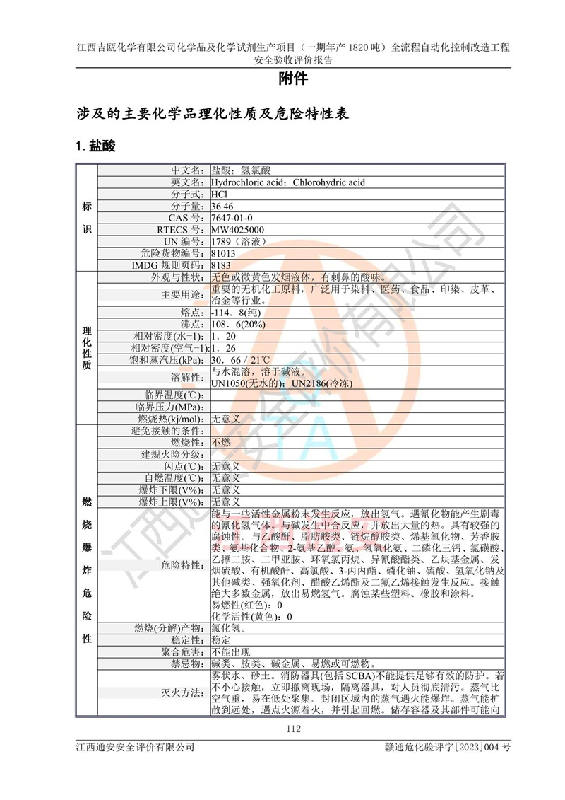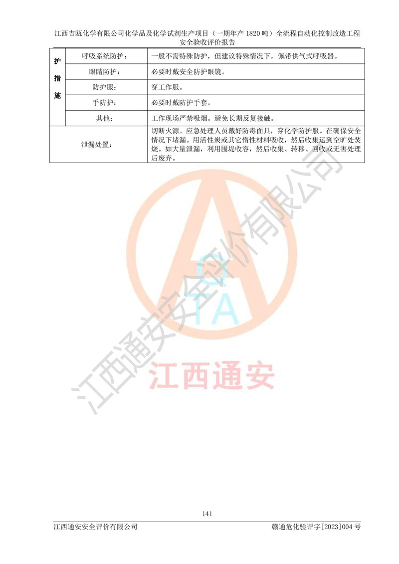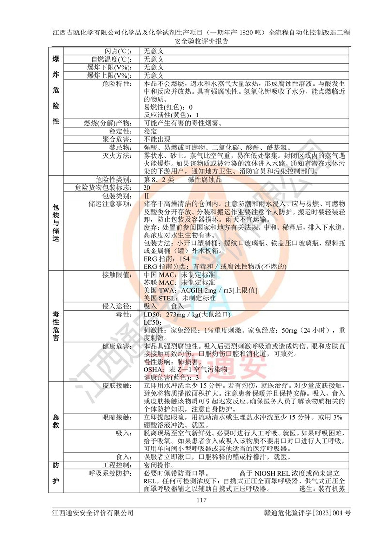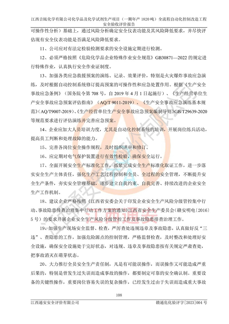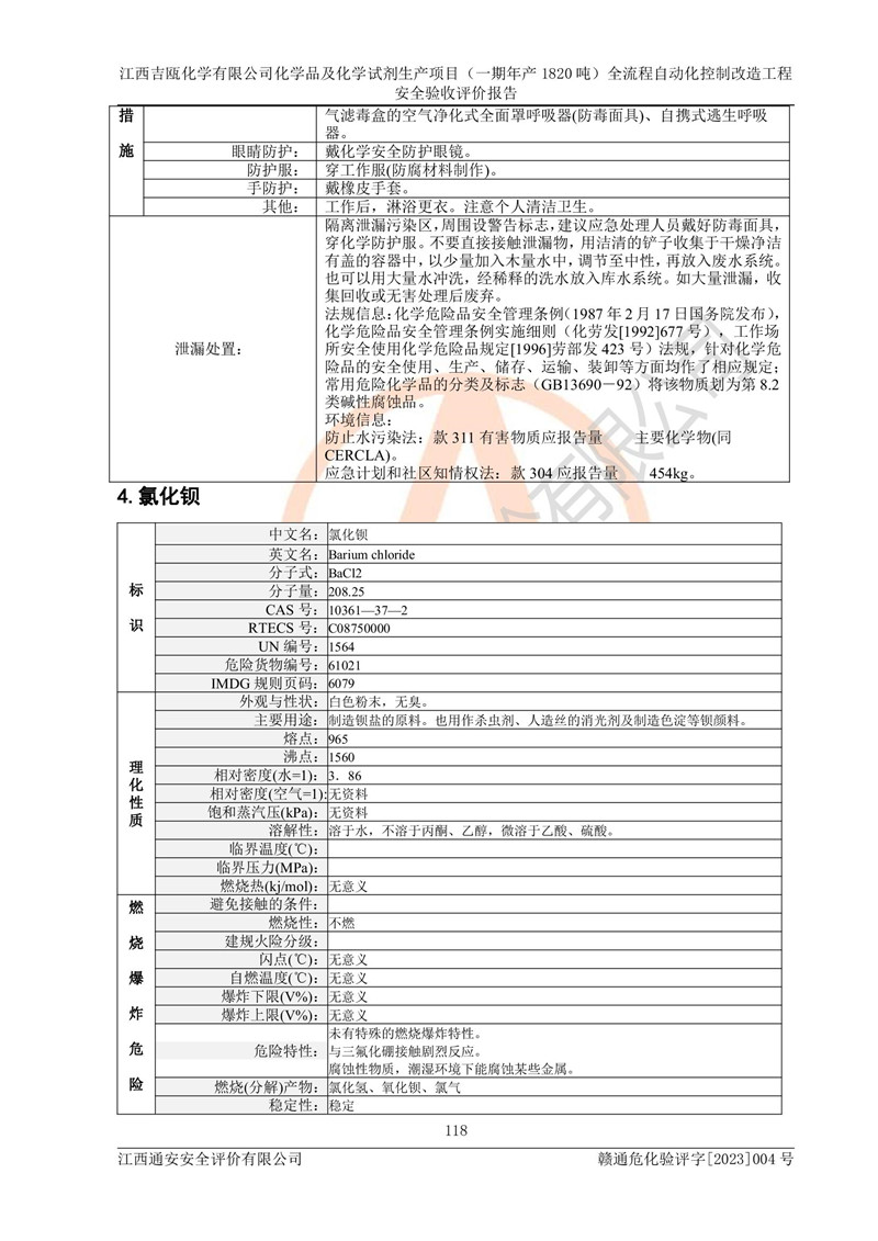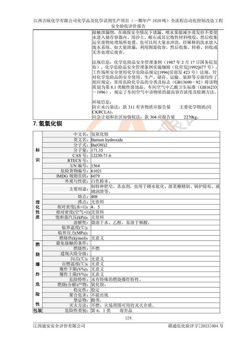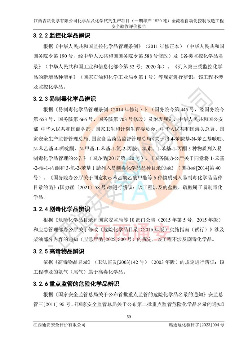 江西吉瓯化学有限公司(以下简称“公司”)位于江西省吉安市井冈山经济技术区富滩工业园B区,于2015年12月2日注册成立,注册资金壹仟万元,统一社会信用代码:91360803MA35FPBR83,法人**孙云辉,属有限责任公司(自然人投资或控股),经营范围:化学品、化学试剂生产、销售(不含危险化学品)(依法需经批准的项目,经相关部门批准后方可开展经营活动)。 公司于2016年3月21日取得青原区发展和改革委员会印发的《关于印发江西吉瓯化学有限公司改建项目的通知》(吉青发改字【2016】44号)文件,项目名称:化学品及化学试剂生产项目;2017年3月6日委托江西赣昌安全生产科技服务有限公司编制了《江西吉瓯化学有限公司化学品及化学试剂生产项目安全预评价报告》,并通过专家组评审;2018年3月委托江西省化学工业设计院编制了《江西吉瓯化学有限公司化学品及化学试剂生产项目安全设施设计专篇》,并于2018年5月14日取得吉安市安全生产监督管理局危险化学品建设项目安全设施设计审查意见书(吉市危化项目安设审字【2018】12号);2021年12月24日取得井冈山经济技术开发区应急管理局下发危险化学品建设项目试生产(使用)方案回执》(井开危化项目备字【2021】01号)文件,试生产期限为2021年12月24日至2022年12月23日;于2020年7月28日、2021年8月、2022年8月分别由江西省化学工业设计院出具了3次《江西吉瓯化学有限公司化学品及化学试剂生产项目设计变更说明》;于2022年12月16日委托江西通安安全评价有限公司编制了《江西吉瓯化学有限公司化学品及化学试剂生产项目(一期年产1820吨)安全验收评价报告》;于2023年2月3日取得江西省应急管理厅颁发的《安全生产许可证》(编号:(赣)WH安许证字【2023】1176号),**期由2023年2月3日至2026年2月2日,许可范围:氢氧化钡(20t/a)、硝酸钙(20t/a)。 根据《江西省应急管理厅关于印发<江西省化工企业自动化提升实施方案>(试行)的通知》(赣应急字[2021]190号)要求,公司于2022年7月委托黑龙江龙维化学工程设计有限公司编制了《江西吉瓯化学有限公司化学品及化学试剂生产项目全流程自动化控制诊断报告》;2022年12月7日委托黑龙江龙维化学工程设计有限公司编制了《江西吉瓯化学有限公司化学品及化学试剂生产项目(一期年产1820吨)危险与可操作性(HAZOP)分析报告》;2022年12月8日委托黑龙江龙维化学工程设计有限公司编制了《江西吉瓯化学有限公司化学品及化学试剂生产项目(一期年产1820吨)安全完整性评估(SIL)定级报告》;2023年1月9日委托黑龙江龙维化学工程设计有限公司编制了《江西吉瓯化学有限公司化学品及化学试剂生产项目全流程自动化控制改造设计方案》,并通过了专家审查。公司化学品及化学试剂生产项目(一期年产1820吨)全流程自动化控制改造工程由浙中自控工程(西安)有限公司负责安装、调试,并出具了《江西吉瓯化学有限公司PLC自动化控制系统改造项目调试报告》,调试结论:调试完成、符合要求。 |