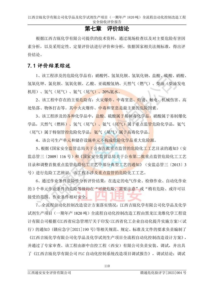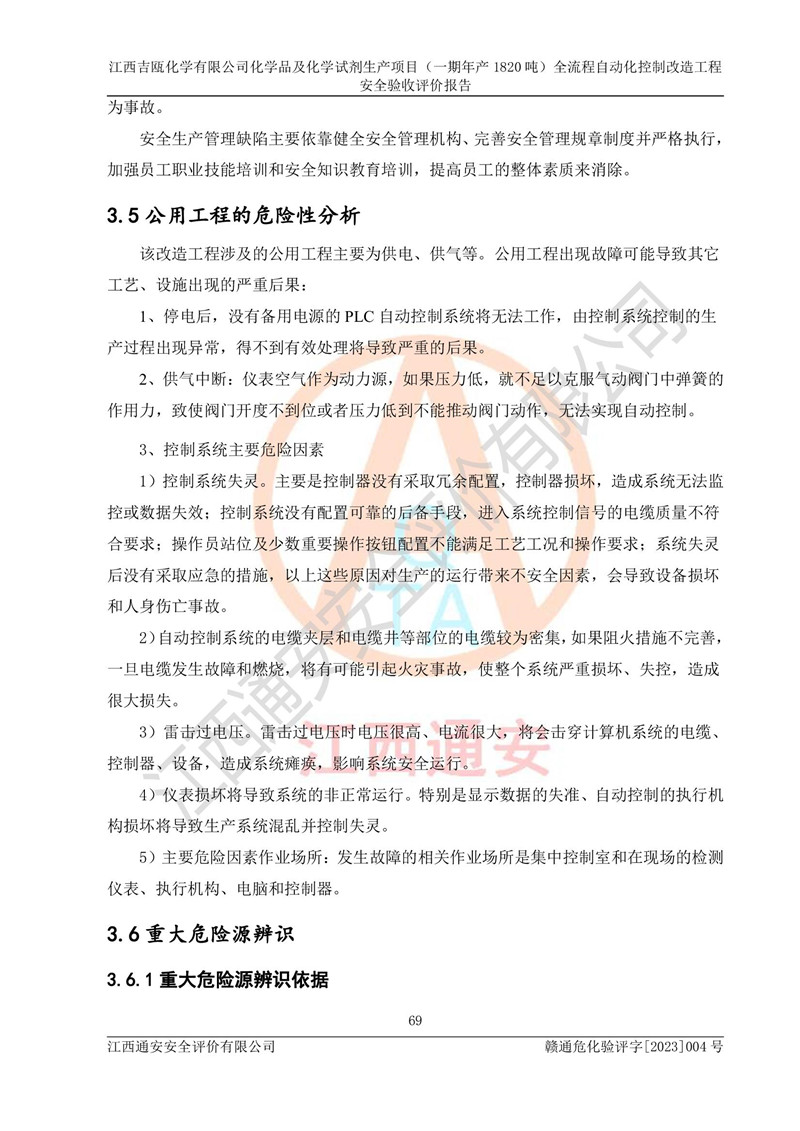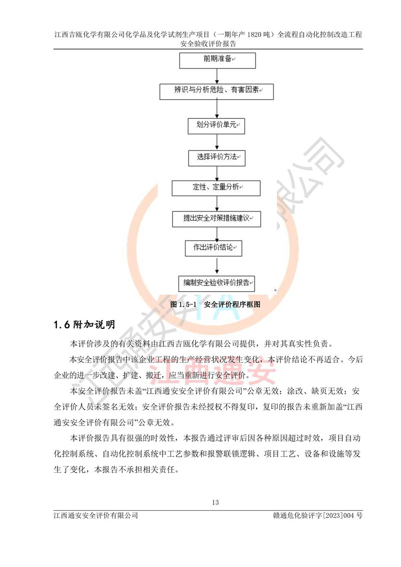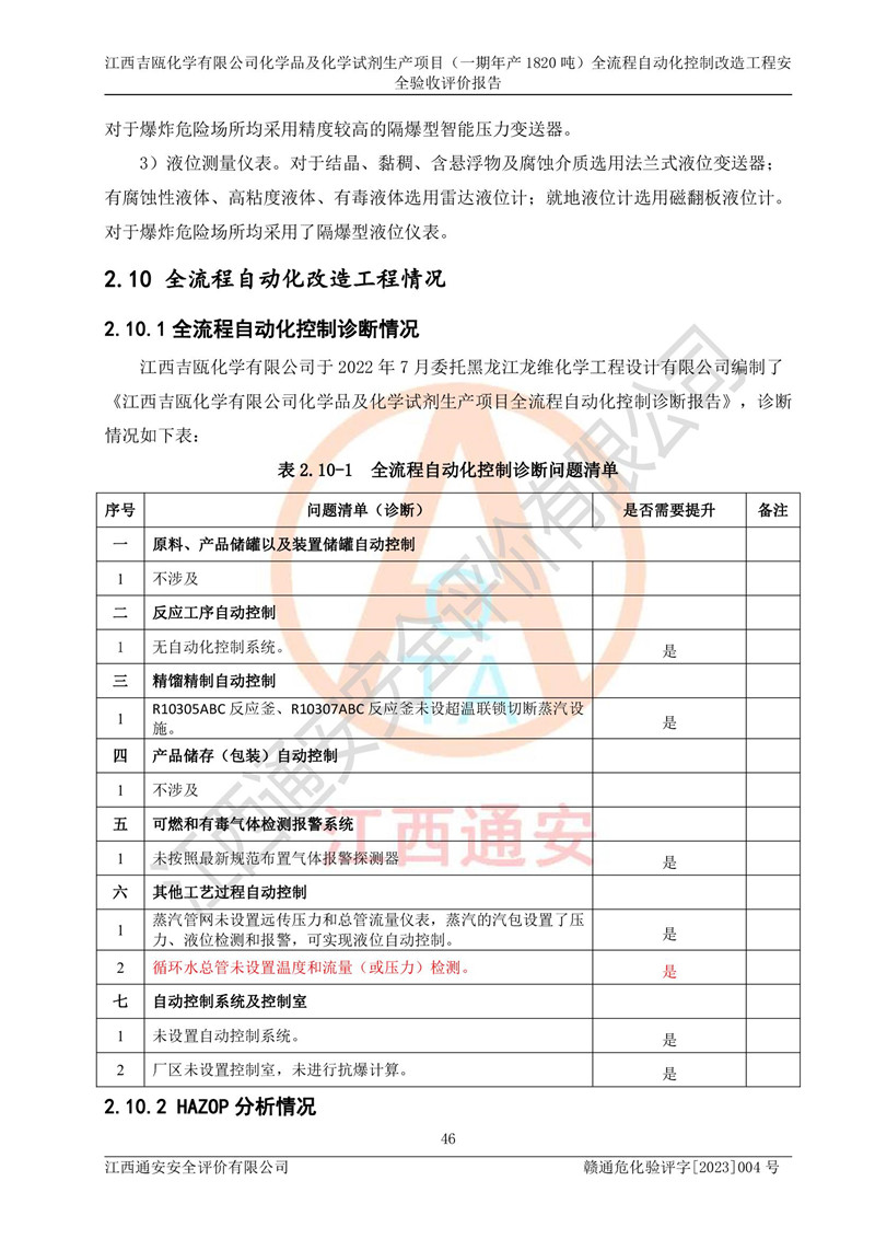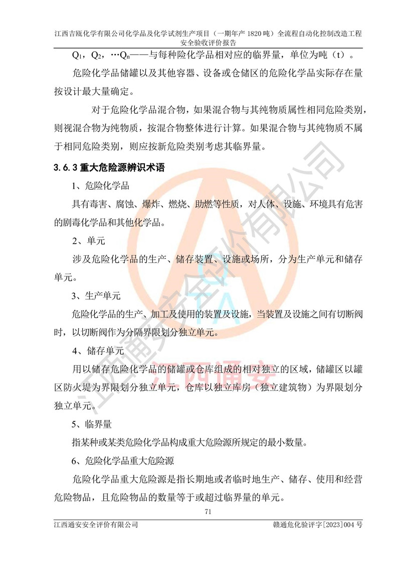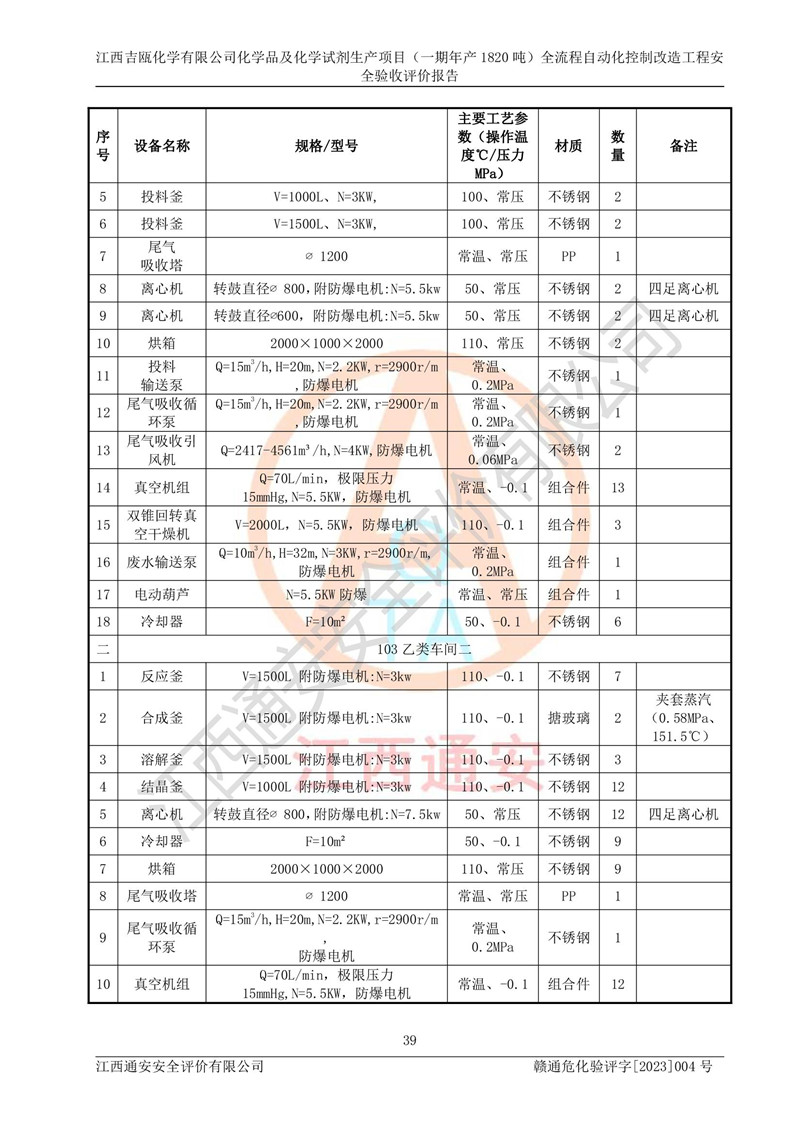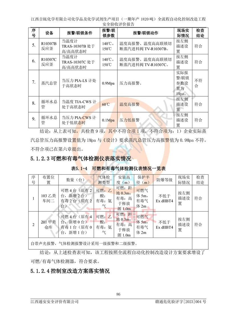 江西吉瓯化学有限公司(以下简称“公司”)位于江西省吉安市井冈山经济技术区富滩工业园B区,于2015年12月2日注册成立,注册资金壹仟万元,统一社会信用代码:91360803MA35FPBR83,法人**孙云辉,属有限责任公司(自然人投资或控股),经营范围:化学品、化学试剂生产、销售(不含危险化学品)(依法需经批准的项目,经相关部门批准后方可开展经营活动)。 公司于2016年3月21日取得青原区发展和改革委员会印发的《关于印发江西吉瓯化学有限公司改建项目的通知》(吉青发改字【2016】44号)文件,项目名称:化学品及化学试剂生产项目;2017年3月6日委托江西赣昌安全生产科技服务有限公司编制了《江西吉瓯化学有限公司化学品及化学试剂生产项目安全预评价报告》,并通过专家组评审;2018年3月委托江西省化学工业设计院编制了《江西吉瓯化学有限公司化学品及化学试剂生产项目安全设施设计专篇》,并于2018年5月14日取得吉安市安全生产监督管理局危险化学品建设项目安全设施设计审查意见书(吉市危化项目安设审字【2018】12号);2021年12月24日取得井冈山经济技术开发区应急管理局下发危险化学品建设项目试生产(使用)方案回执》(井开危化项目备字【2021】01号)文件,试生产期限为2021年12月24日至2022年12月23日;于2020年7月28日、2021年8月、2022年8月分别由江西省化学工业设计院出具了3次《江西吉瓯化学有限公司化学品及化学试剂生产项目设计变更说明》;于2022年12月16日委托江西通安安全评价有限公司编制了《江西吉瓯化学有限公司化学品及化学试剂生产项目(一期年产1820吨)安全验收评价报告》;于2023年2月3日取得江西省应急管理厅颁发的《安全生产许可证》(编号:(赣)WH安许证字【2023】1176号),**期由2023年2月3日至2026年2月2日,许可范围:氢氧化钡(20t/a)、硝酸钙(20t/a)。 根据《江西省应急管理厅关于印发<江西省化工企业自动化提升实施方案>(试行)的通知》(赣应急字[2021]190号)要求,公司于2022年7月委托黑龙江龙维化学工程设计有限公司编制了《江西吉瓯化学有限公司化学品及化学试剂生产项目全流程自动化控制诊断报告》;2022年12月7日委托黑龙江龙维化学工程设计有限公司编制了《江西吉瓯化学有限公司化学品及化学试剂生产项目(一期年产1820吨)危险与可操作性(HAZOP)分析报告》;2022年12月8日委托黑龙江龙维化学工程设计有限公司编制了《江西吉瓯化学有限公司化学品及化学试剂生产项目(一期年产1820吨)安全完整性评估(SIL)定级报告》;2023年1月9日委托黑龙江龙维化学工程设计有限公司编制了《江西吉瓯化学有限公司化学品及化学试剂生产项目全流程自动化控制改造设计方案》,并通过了专家审查。公司化学品及化学试剂生产项目(一期年产1820吨)全流程自动化控制改造工程由浙中自控工程(西安)有限公司负责安装、调试,并出具了《江西吉瓯化学有限公司PLC自动化控制系统改造项目调试报告》,调试结论:调试完成、符合要求。 |
