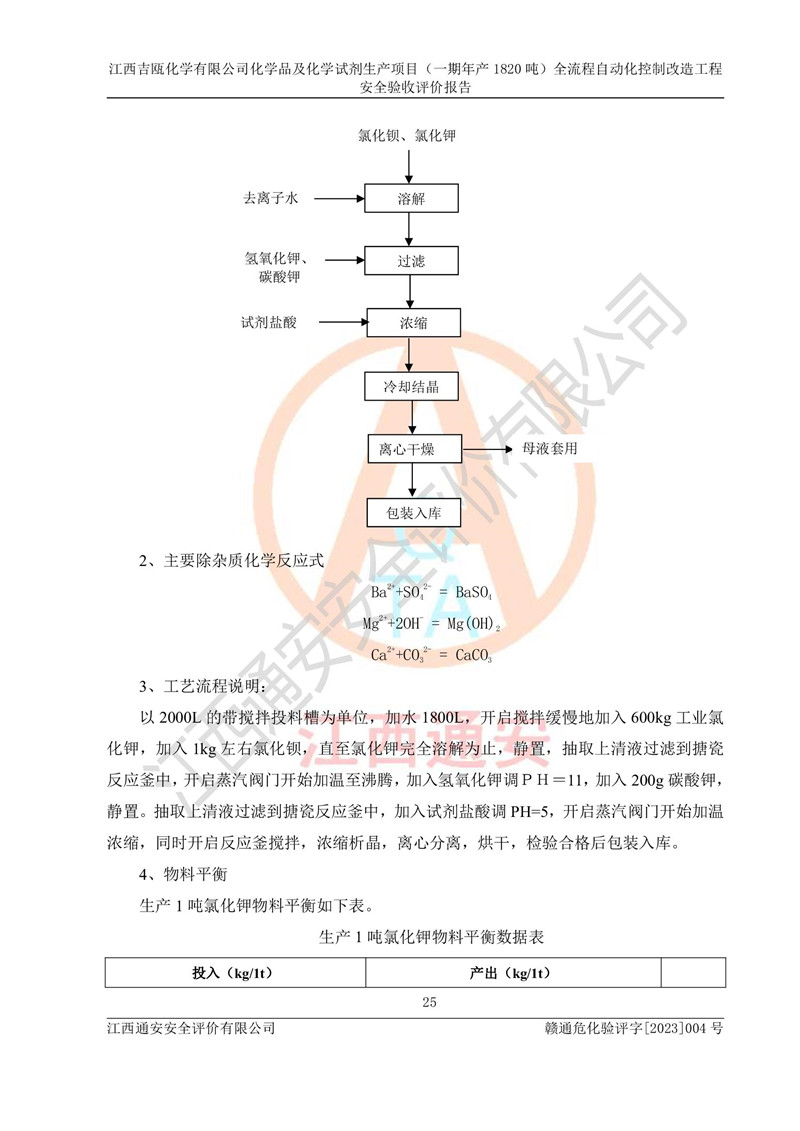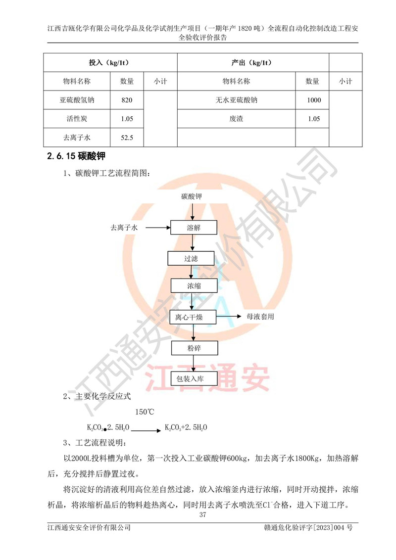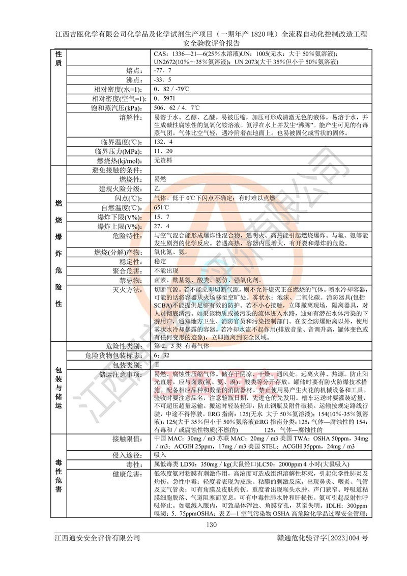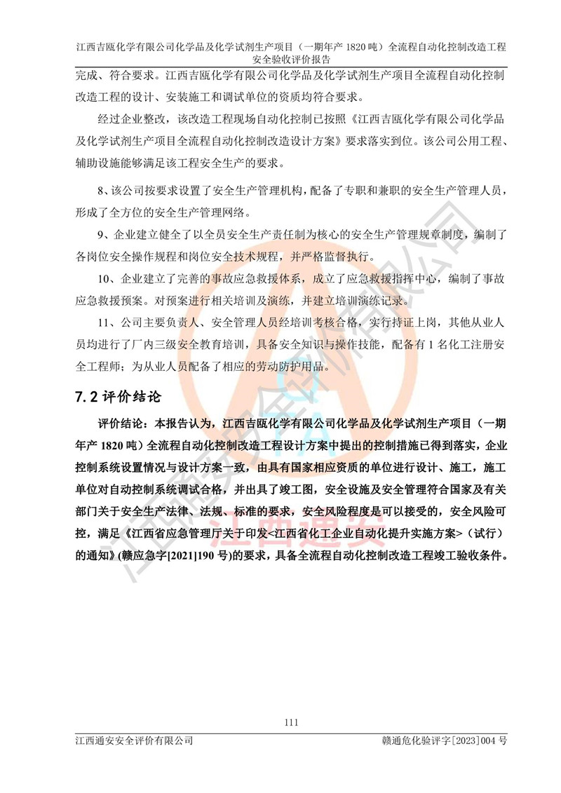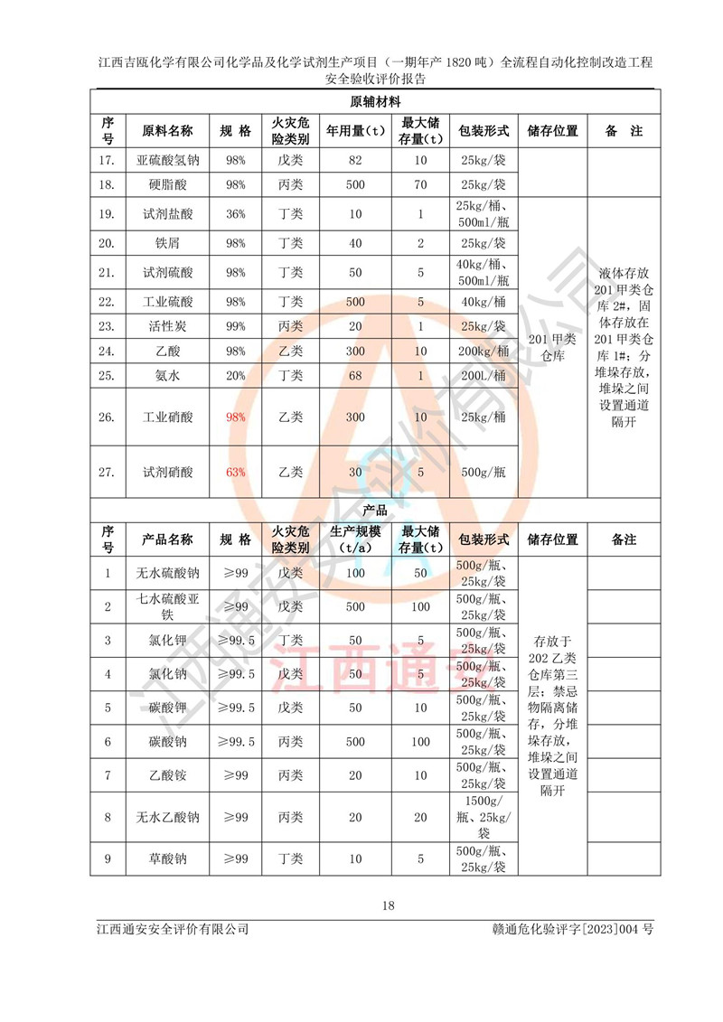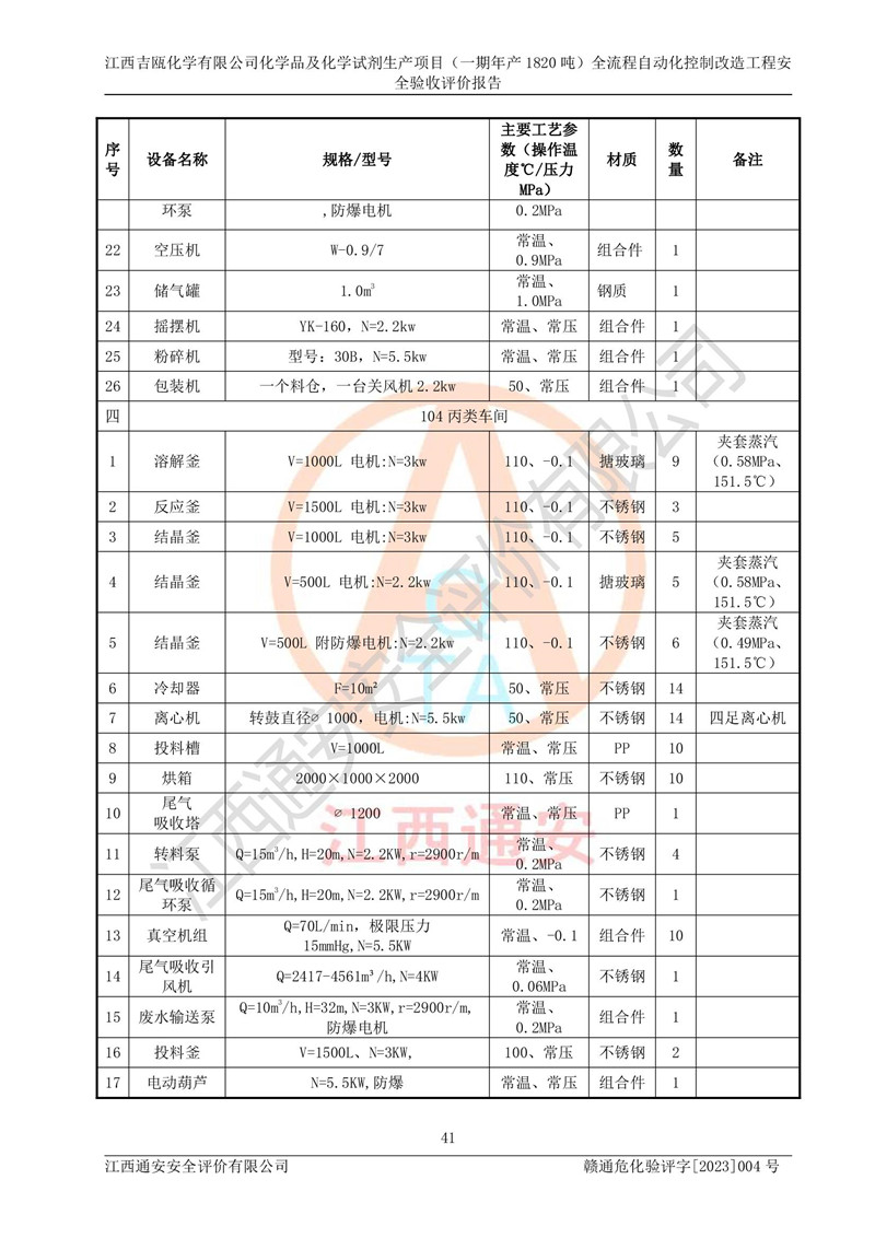 江西吉瓯化学有限公司(以下简称“公司”)位于江西省吉安市井冈山经济技术区富滩工业园B区,于2015年12月2日注册成立,注册资金壹仟万元,统一社会信用代码:91360803MA35FPBR83,法人**孙云辉,属有限责任公司(自然人投资或控股),经营范围:化学品、化学试剂生产、销售(不含危险化学品)(依法需经批准的项目,经相关部门批准后方可开展经营活动)。 公司于2016年3月21日取得青原区发展和改革委员会印发的《关于印发江西吉瓯化学有限公司改建项目的通知》(吉青发改字【2016】44号)文件,项目名称:化学品及化学试剂生产项目;2017年3月6日委托江西赣昌安全生产科技服务有限公司编制了《江西吉瓯化学有限公司化学品及化学试剂生产项目安全预评价报告》,并通过专家组评审;2018年3月委托江西省化学工业设计院编制了《江西吉瓯化学有限公司化学品及化学试剂生产项目安全设施设计专篇》,并于2018年5月14日取得吉安市安全生产监督管理局危险化学品建设项目安全设施设计审查意见书(吉市危化项目安设审字【2018】12号);2021年12月24日取得井冈山经济技术开发区应急管理局下发危险化学品建设项目试生产(使用)方案回执》(井开危化项目备字【2021】01号)文件,试生产期限为2021年12月24日至2022年12月23日;于2020年7月28日、2021年8月、2022年8月分别由江西省化学工业设计院出具了3次《江西吉瓯化学有限公司化学品及化学试剂生产项目设计变更说明》;于2022年12月16日委托江西通安安全评价有限公司编制了《江西吉瓯化学有限公司化学品及化学试剂生产项目(一期年产1820吨)安全验收评价报告》;于2023年2月3日取得江西省应急管理厅颁发的《安全生产许可证》(编号:(赣)WH安许证字【2023】1176号),**期由2023年2月3日至2026年2月2日,许可范围:氢氧化钡(20t/a)、硝酸钙(20t/a)。 根据《江西省应急管理厅关于印发<江西省化工企业自动化提升实施方案>(试行)的通知》(赣应急字[2021]190号)要求,公司于2022年7月委托黑龙江龙维化学工程设计有限公司编制了《江西吉瓯化学有限公司化学品及化学试剂生产项目全流程自动化控制诊断报告》;2022年12月7日委托黑龙江龙维化学工程设计有限公司编制了《江西吉瓯化学有限公司化学品及化学试剂生产项目(一期年产1820吨)危险与可操作性(HAZOP)分析报告》;2022年12月8日委托黑龙江龙维化学工程设计有限公司编制了《江西吉瓯化学有限公司化学品及化学试剂生产项目(一期年产1820吨)安全完整性评估(SIL)定级报告》;2023年1月9日委托黑龙江龙维化学工程设计有限公司编制了《江西吉瓯化学有限公司化学品及化学试剂生产项目全流程自动化控制改造设计方案》,并通过了专家审查。公司化学品及化学试剂生产项目(一期年产1820吨)全流程自动化控制改造工程由浙中自控工程(西安)有限公司负责安装、调试,并出具了《江西吉瓯化学有限公司PLC自动化控制系统改造项目调试报告》,调试结论:调试完成、符合要求。 |
