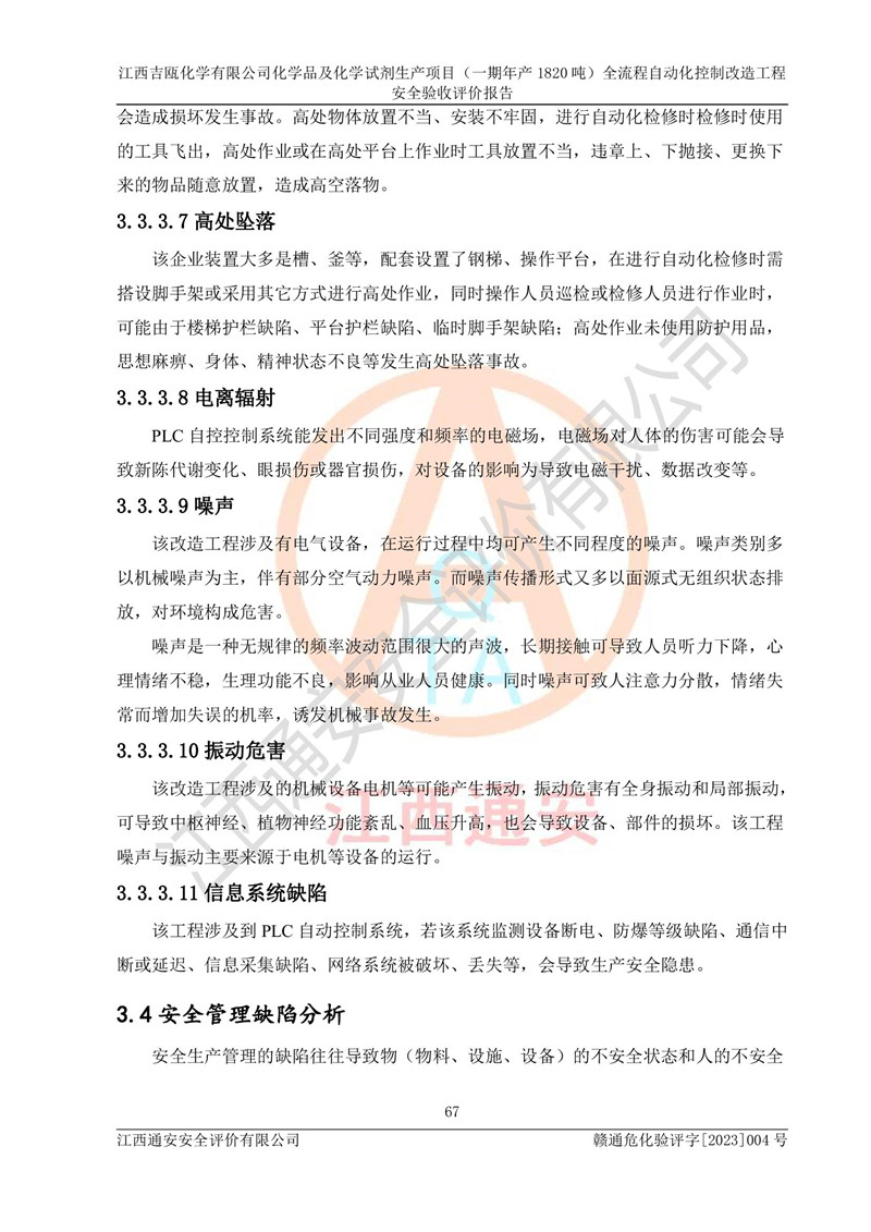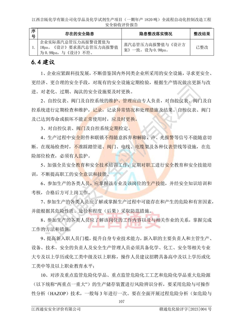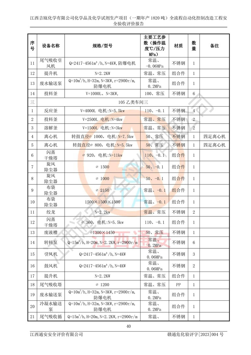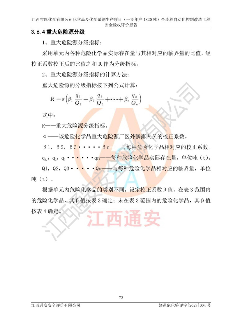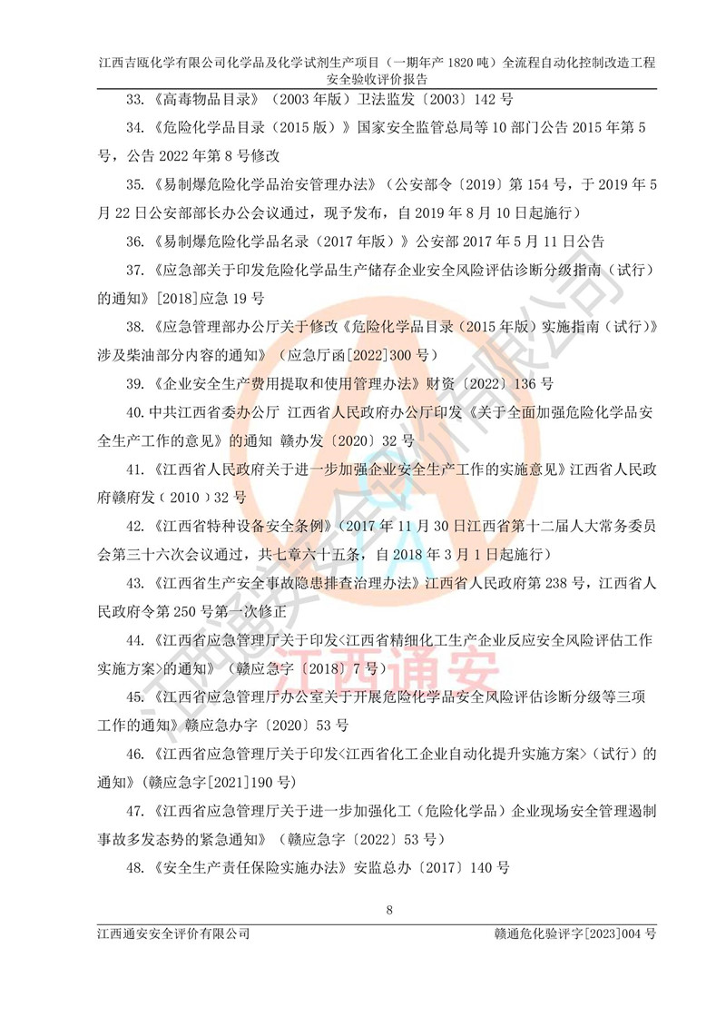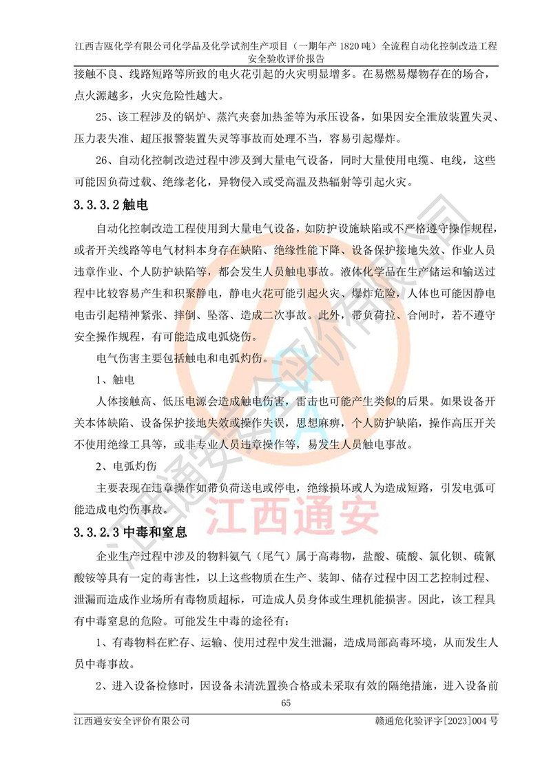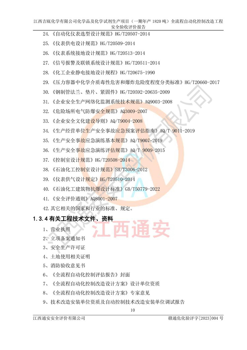 江西吉瓯化学有限公司(以下简称“公司”)位于江西省吉安市井冈山经济技术区富滩工业园B区,于2015年12月2日注册成立,注册资金壹仟万元,统一社会信用代码:91360803MA35FPBR83,法人**孙云辉,属有限责任公司(自然人投资或控股),经营范围:化学品、化学试剂生产、销售(不含危险化学品)(依法需经批准的项目,经相关部门批准后方可开展经营活动)。 公司于2016年3月21日取得青原区发展和改革委员会印发的《关于印发江西吉瓯化学有限公司改建项目的通知》(吉青发改字【2016】44号)文件,项目名称:化学品及化学试剂生产项目;2017年3月6日委托江西赣昌安全生产科技服务有限公司编制了《江西吉瓯化学有限公司化学品及化学试剂生产项目安全预评价报告》,并通过专家组评审;2018年3月委托江西省化学工业设计院编制了《江西吉瓯化学有限公司化学品及化学试剂生产项目安全设施设计专篇》,并于2018年5月14日取得吉安市安全生产监督管理局危险化学品建设项目安全设施设计审查意见书(吉市危化项目安设审字【2018】12号);2021年12月24日取得井冈山经济技术开发区应急管理局下发危险化学品建设项目试生产(使用)方案回执》(井开危化项目备字【2021】01号)文件,试生产期限为2021年12月24日至2022年12月23日;于2020年7月28日、2021年8月、2022年8月分别由江西省化学工业设计院出具了3次《江西吉瓯化学有限公司化学品及化学试剂生产项目设计变更说明》;于2022年12月16日委托江西通安安全评价有限公司编制了《江西吉瓯化学有限公司化学品及化学试剂生产项目(一期年产1820吨)安全验收评价报告》;于2023年2月3日取得江西省应急管理厅颁发的《安全生产许可证》(编号:(赣)WH安许证字【2023】1176号),**期由2023年2月3日至2026年2月2日,许可范围:氢氧化钡(20t/a)、硝酸钙(20t/a)。 根据《江西省应急管理厅关于印发<江西省化工企业自动化提升实施方案>(试行)的通知》(赣应急字[2021]190号)要求,公司于2022年7月委托黑龙江龙维化学工程设计有限公司编制了《江西吉瓯化学有限公司化学品及化学试剂生产项目全流程自动化控制诊断报告》;2022年12月7日委托黑龙江龙维化学工程设计有限公司编制了《江西吉瓯化学有限公司化学品及化学试剂生产项目(一期年产1820吨)危险与可操作性(HAZOP)分析报告》;2022年12月8日委托黑龙江龙维化学工程设计有限公司编制了《江西吉瓯化学有限公司化学品及化学试剂生产项目(一期年产1820吨)安全完整性评估(SIL)定级报告》;2023年1月9日委托黑龙江龙维化学工程设计有限公司编制了《江西吉瓯化学有限公司化学品及化学试剂生产项目全流程自动化控制改造设计方案》,并通过了专家审查。公司化学品及化学试剂生产项目(一期年产1820吨)全流程自动化控制改造工程由浙中自控工程(西安)有限公司负责安装、调试,并出具了《江西吉瓯化学有限公司PLC自动化控制系统改造项目调试报告》,调试结论:调试完成、符合要求。 |