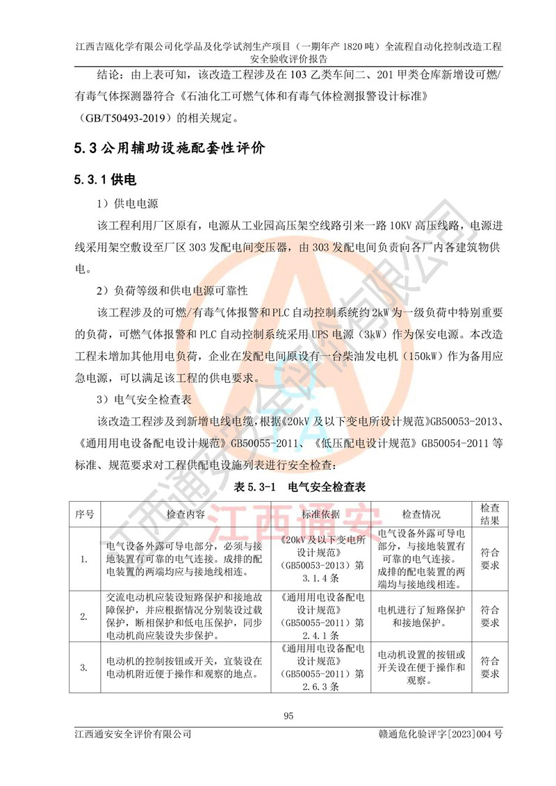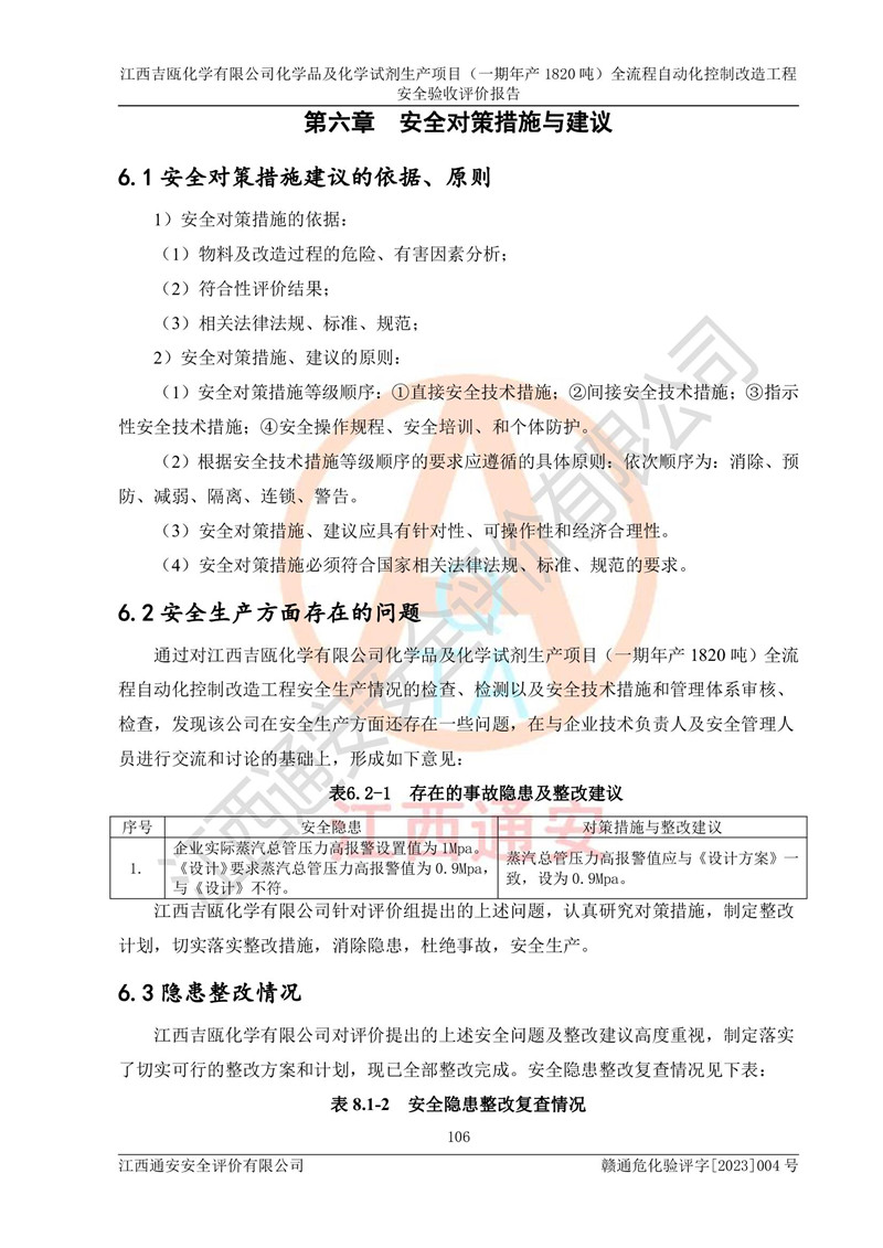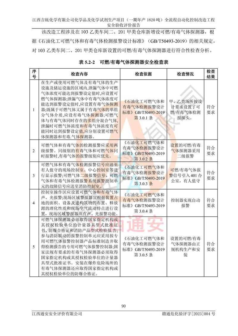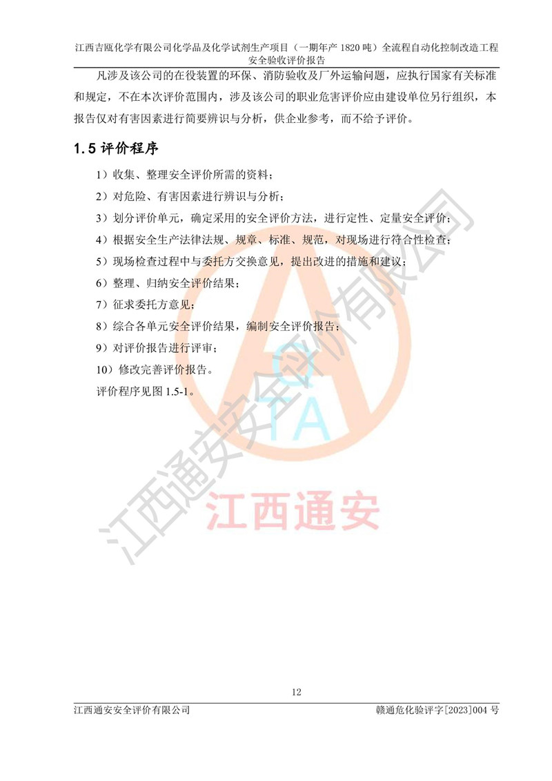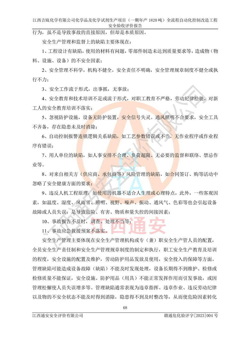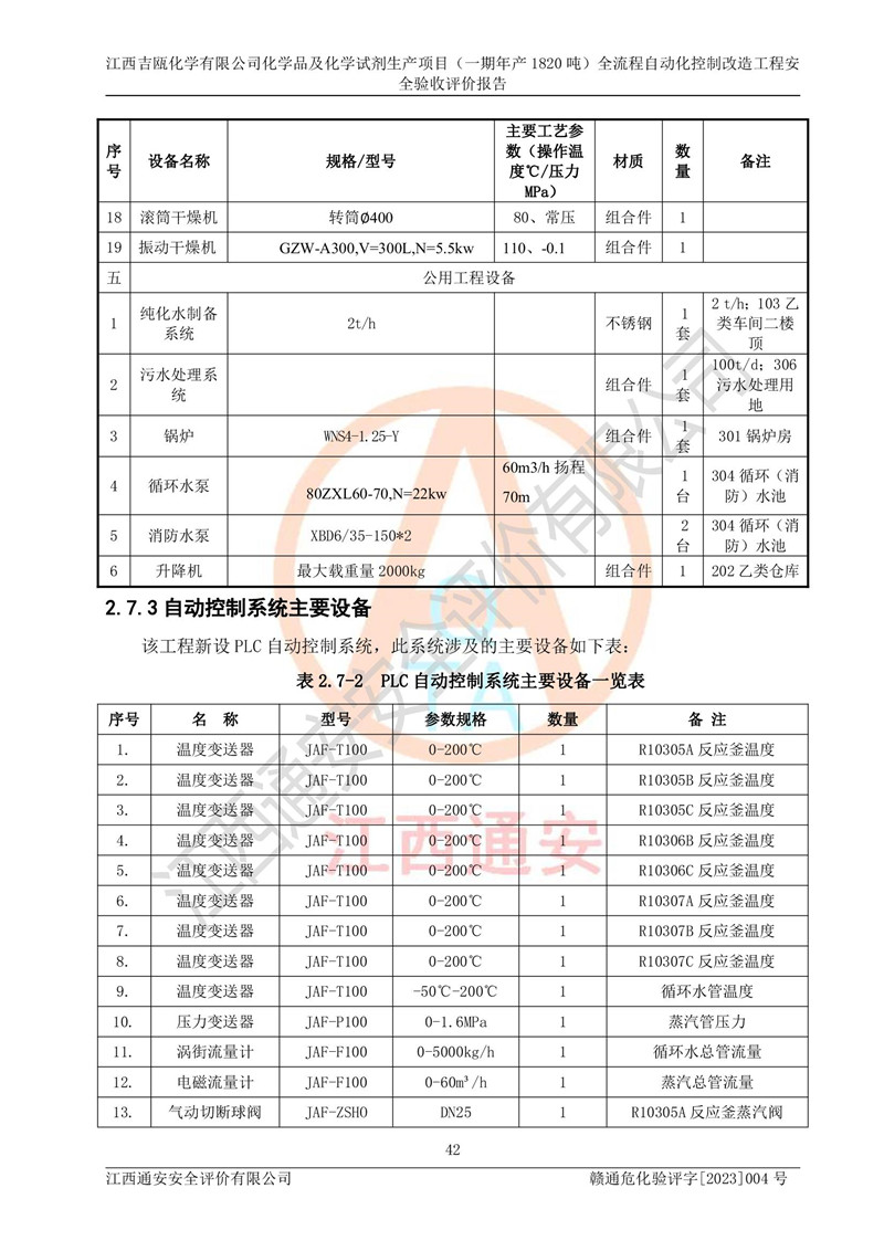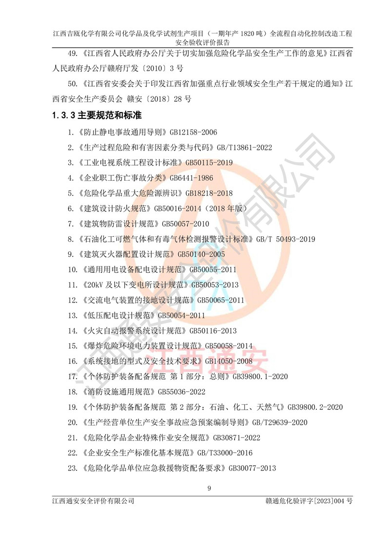 江西吉瓯化学有限公司(以下简称“公司”)位于江西省吉安市井冈山经济技术区富滩工业园B区,于2015年12月2日注册成立,注册资金壹仟万元,统一社会信用代码:91360803MA35FPBR83,法人**孙云辉,属有限责任公司(自然人投资或控股),经营范围:化学品、化学试剂生产、销售(不含危险化学品)(依法需经批准的项目,经相关部门批准后方可开展经营活动)。 公司于2016年3月21日取得青原区发展和改革委员会印发的《关于印发江西吉瓯化学有限公司改建项目的通知》(吉青发改字【2016】44号)文件,项目名称:化学品及化学试剂生产项目;2017年3月6日委托江西赣昌安全生产科技服务有限公司编制了《江西吉瓯化学有限公司化学品及化学试剂生产项目安全预评价报告》,并通过专家组评审;2018年3月委托江西省化学工业设计院编制了《江西吉瓯化学有限公司化学品及化学试剂生产项目安全设施设计专篇》,并于2018年5月14日取得吉安市安全生产监督管理局危险化学品建设项目安全设施设计审查意见书(吉市危化项目安设审字【2018】12号);2021年12月24日取得井冈山经济技术开发区应急管理局下发危险化学品建设项目试生产(使用)方案回执》(井开危化项目备字【2021】01号)文件,试生产期限为2021年12月24日至2022年12月23日;于2020年7月28日、2021年8月、2022年8月分别由江西省化学工业设计院出具了3次《江西吉瓯化学有限公司化学品及化学试剂生产项目设计变更说明》;于2022年12月16日委托江西通安安全评价有限公司编制了《江西吉瓯化学有限公司化学品及化学试剂生产项目(一期年产1820吨)安全验收评价报告》;于2023年2月3日取得江西省应急管理厅颁发的《安全生产许可证》(编号:(赣)WH安许证字【2023】1176号),**期由2023年2月3日至2026年2月2日,许可范围:氢氧化钡(20t/a)、硝酸钙(20t/a)。 根据《江西省应急管理厅关于印发<江西省化工企业自动化提升实施方案>(试行)的通知》(赣应急字[2021]190号)要求,公司于2022年7月委托黑龙江龙维化学工程设计有限公司编制了《江西吉瓯化学有限公司化学品及化学试剂生产项目全流程自动化控制诊断报告》;2022年12月7日委托黑龙江龙维化学工程设计有限公司编制了《江西吉瓯化学有限公司化学品及化学试剂生产项目(一期年产1820吨)危险与可操作性(HAZOP)分析报告》;2022年12月8日委托黑龙江龙维化学工程设计有限公司编制了《江西吉瓯化学有限公司化学品及化学试剂生产项目(一期年产1820吨)安全完整性评估(SIL)定级报告》;2023年1月9日委托黑龙江龙维化学工程设计有限公司编制了《江西吉瓯化学有限公司化学品及化学试剂生产项目全流程自动化控制改造设计方案》,并通过了专家审查。公司化学品及化学试剂生产项目(一期年产1820吨)全流程自动化控制改造工程由浙中自控工程(西安)有限公司负责安装、调试,并出具了《江西吉瓯化学有限公司PLC自动化控制系统改造项目调试报告》,调试结论:调试完成、符合要求。 |