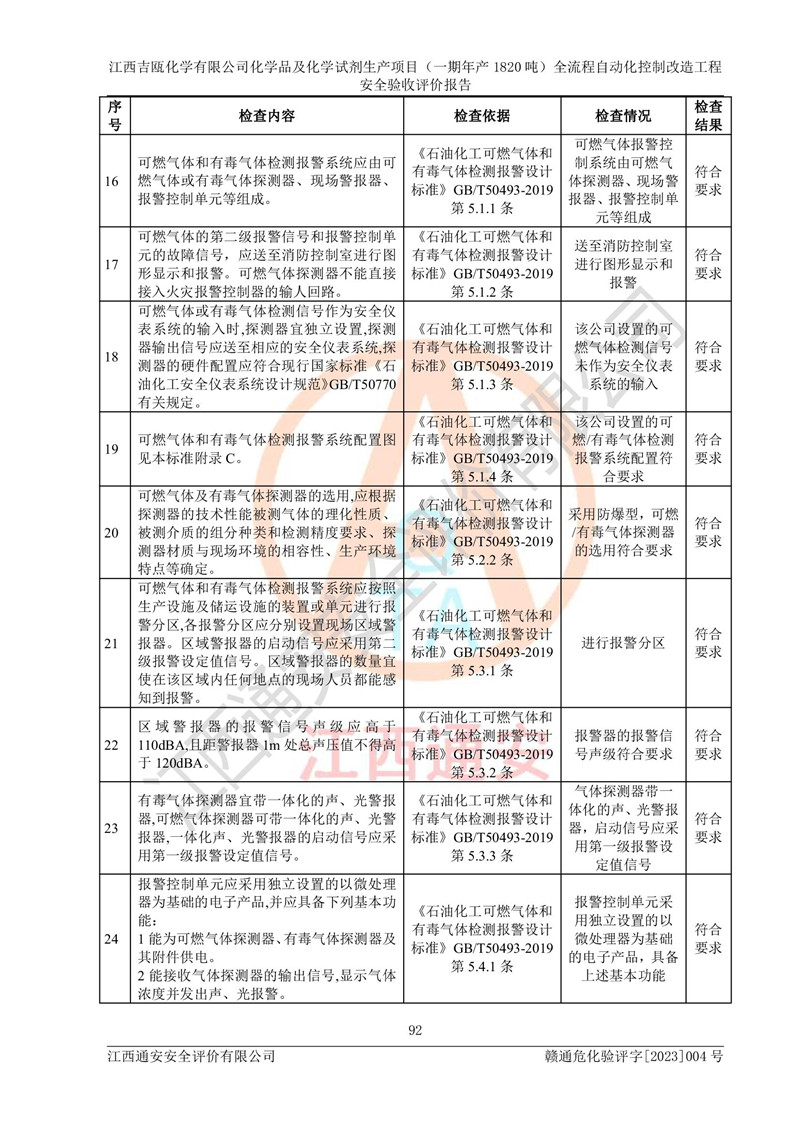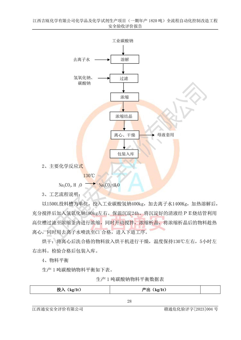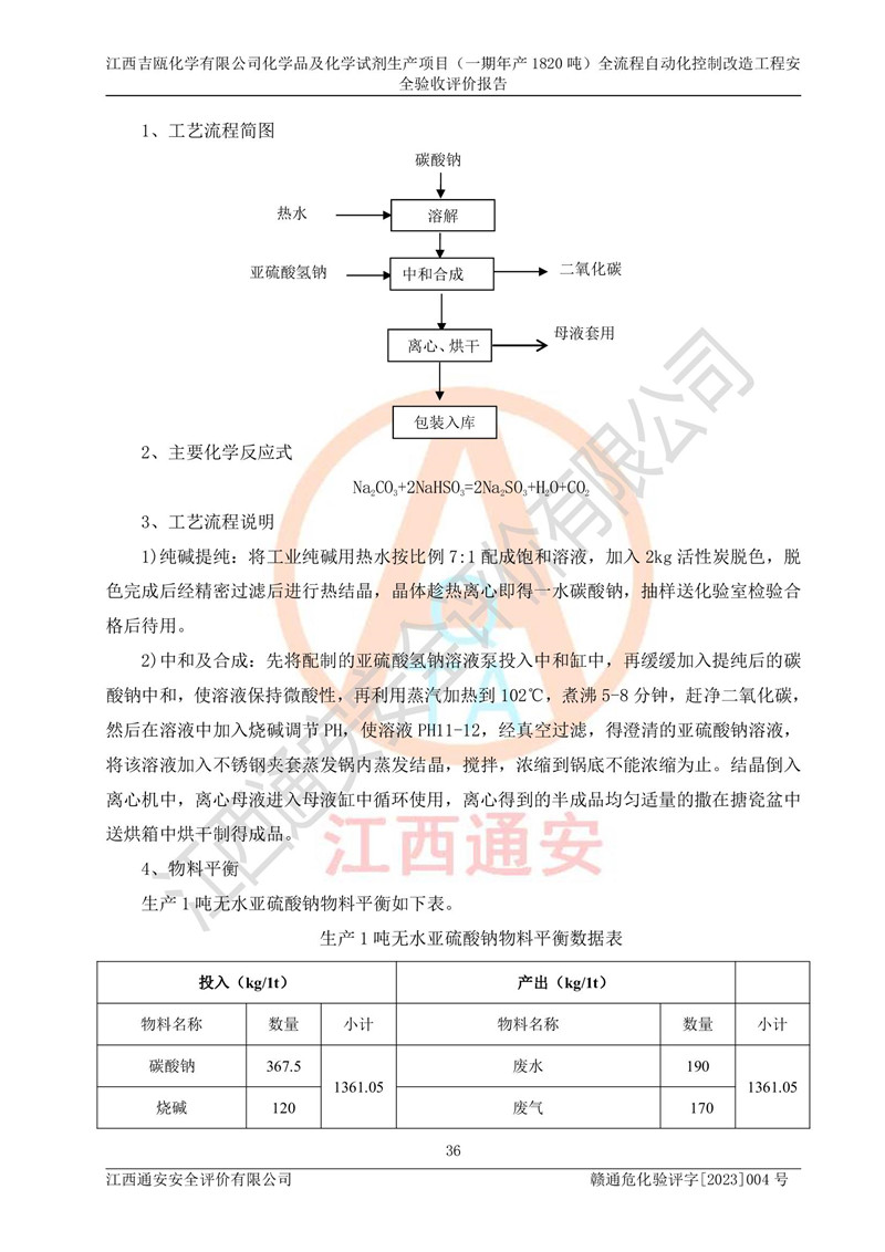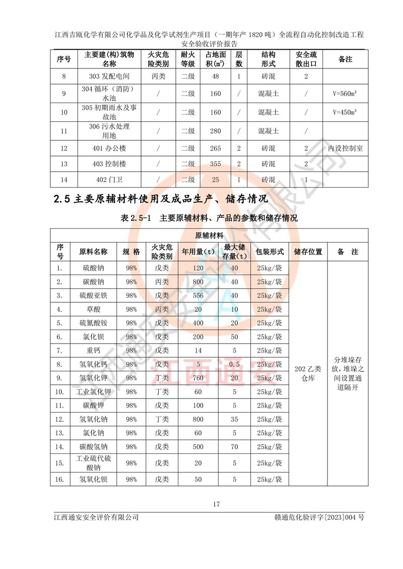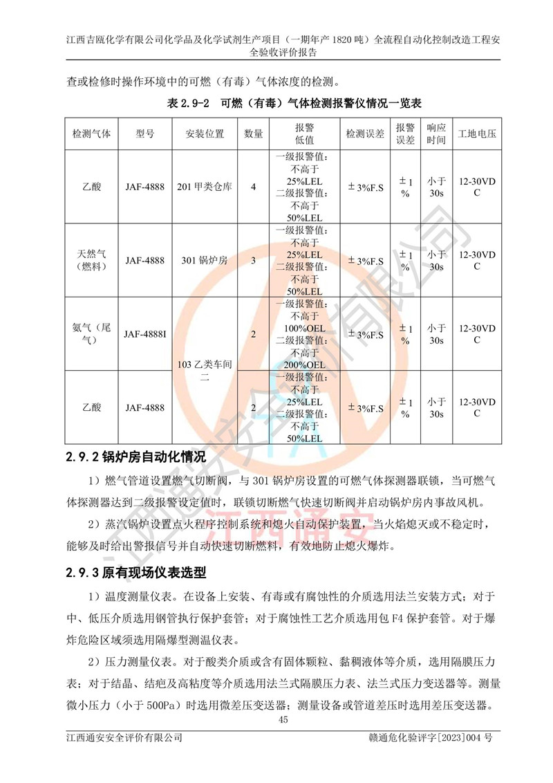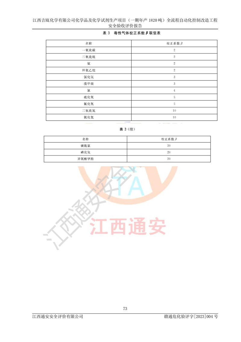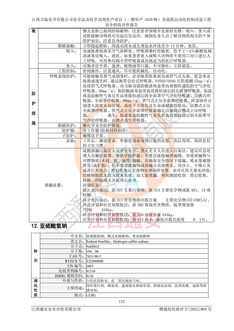 江西吉瓯化学有限公司(以下简称“公司”)位于江西省吉安市井冈山经济技术区富滩工业园B区,于2015年12月2日注册成立,注册资金壹仟万元,统一社会信用代码:91360803MA35FPBR83,法人**孙云辉,属有限责任公司(自然人投资或控股),经营范围:化学品、化学试剂生产、销售(不含危险化学品)(依法需经批准的项目,经相关部门批准后方可开展经营活动)。 公司于2016年3月21日取得青原区发展和改革委员会印发的《关于印发江西吉瓯化学有限公司改建项目的通知》(吉青发改字【2016】44号)文件,项目名称:化学品及化学试剂生产项目;2017年3月6日委托江西赣昌安全生产科技服务有限公司编制了《江西吉瓯化学有限公司化学品及化学试剂生产项目安全预评价报告》,并通过专家组评审;2018年3月委托江西省化学工业设计院编制了《江西吉瓯化学有限公司化学品及化学试剂生产项目安全设施设计专篇》,并于2018年5月14日取得吉安市安全生产监督管理局危险化学品建设项目安全设施设计审查意见书(吉市危化项目安设审字【2018】12号);2021年12月24日取得井冈山经济技术开发区应急管理局下发危险化学品建设项目试生产(使用)方案回执》(井开危化项目备字【2021】01号)文件,试生产期限为2021年12月24日至2022年12月23日;于2020年7月28日、2021年8月、2022年8月分别由江西省化学工业设计院出具了3次《江西吉瓯化学有限公司化学品及化学试剂生产项目设计变更说明》;于2022年12月16日委托江西通安安全评价有限公司编制了《江西吉瓯化学有限公司化学品及化学试剂生产项目(一期年产1820吨)安全验收评价报告》;于2023年2月3日取得江西省应急管理厅颁发的《安全生产许可证》(编号:(赣)WH安许证字【2023】1176号),**期由2023年2月3日至2026年2月2日,许可范围:氢氧化钡(20t/a)、硝酸钙(20t/a)。 根据《江西省应急管理厅关于印发<江西省化工企业自动化提升实施方案>(试行)的通知》(赣应急字[2021]190号)要求,公司于2022年7月委托黑龙江龙维化学工程设计有限公司编制了《江西吉瓯化学有限公司化学品及化学试剂生产项目全流程自动化控制诊断报告》;2022年12月7日委托黑龙江龙维化学工程设计有限公司编制了《江西吉瓯化学有限公司化学品及化学试剂生产项目(一期年产1820吨)危险与可操作性(HAZOP)分析报告》;2022年12月8日委托黑龙江龙维化学工程设计有限公司编制了《江西吉瓯化学有限公司化学品及化学试剂生产项目(一期年产1820吨)安全完整性评估(SIL)定级报告》;2023年1月9日委托黑龙江龙维化学工程设计有限公司编制了《江西吉瓯化学有限公司化学品及化学试剂生产项目全流程自动化控制改造设计方案》,并通过了专家审查。公司化学品及化学试剂生产项目(一期年产1820吨)全流程自动化控制改造工程由浙中自控工程(西安)有限公司负责安装、调试,并出具了《江西吉瓯化学有限公司PLC自动化控制系统改造项目调试报告》,调试结论:调试完成、符合要求。 |