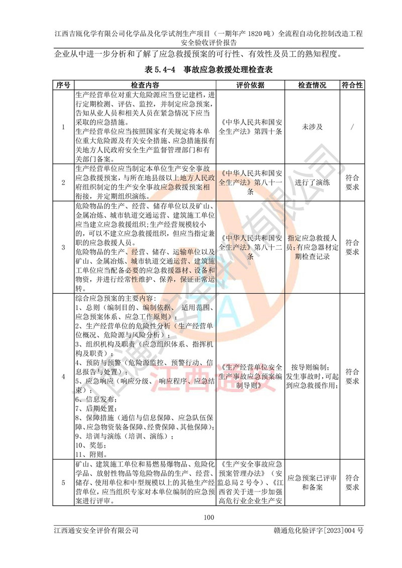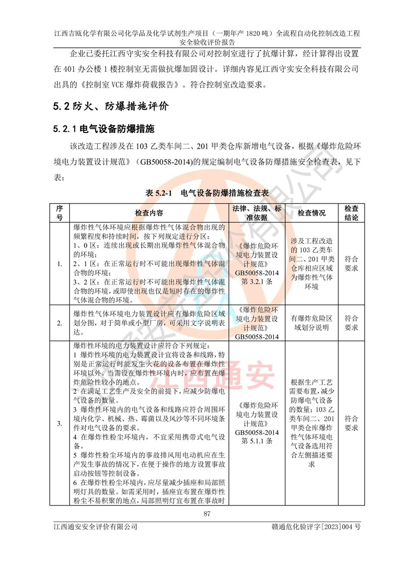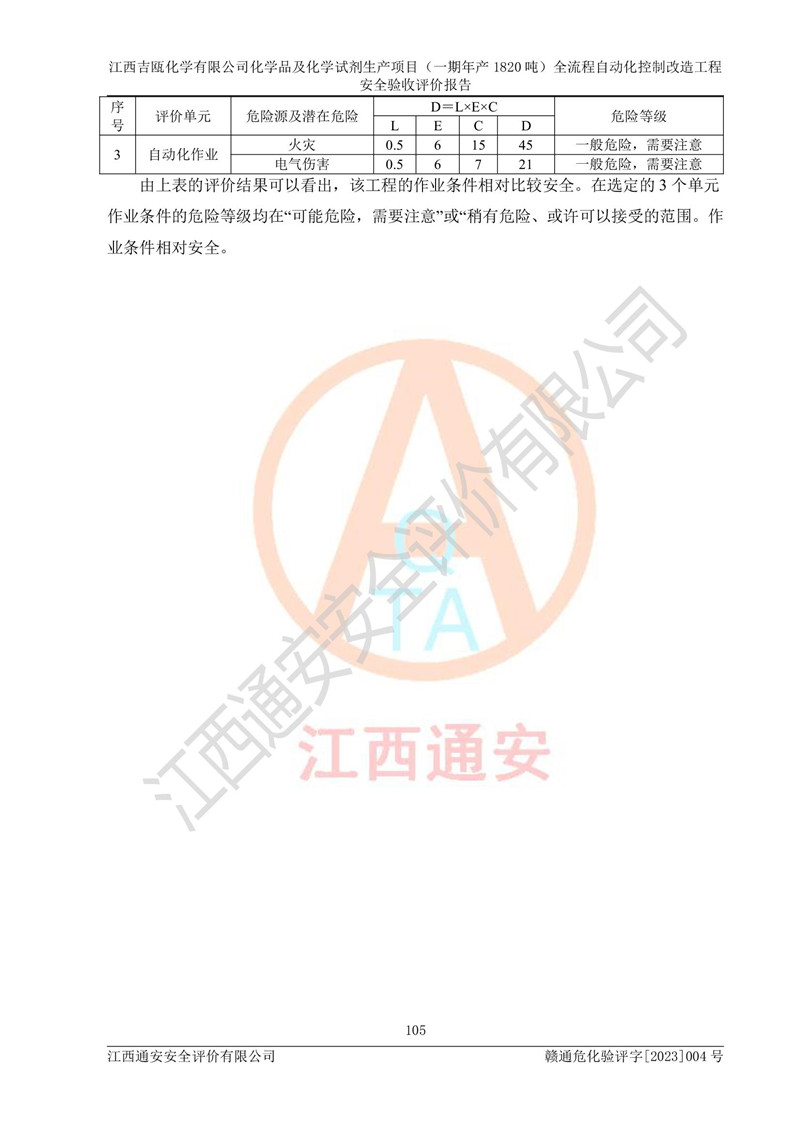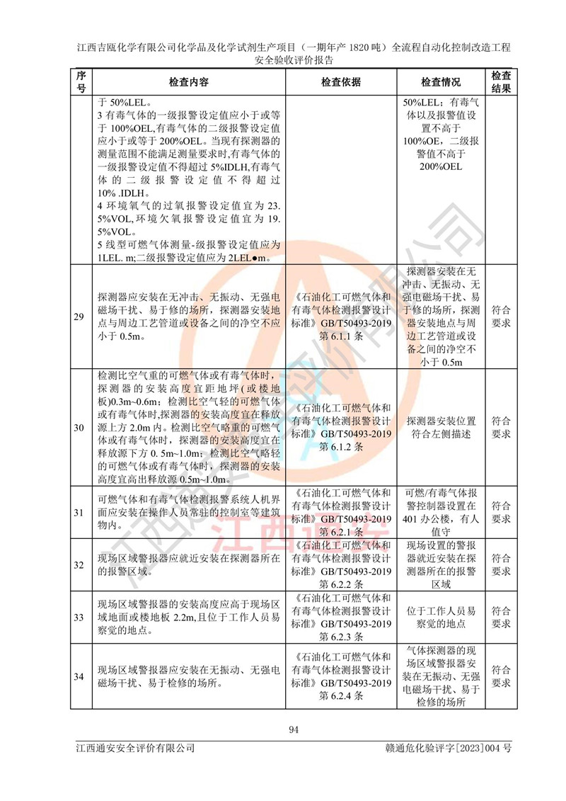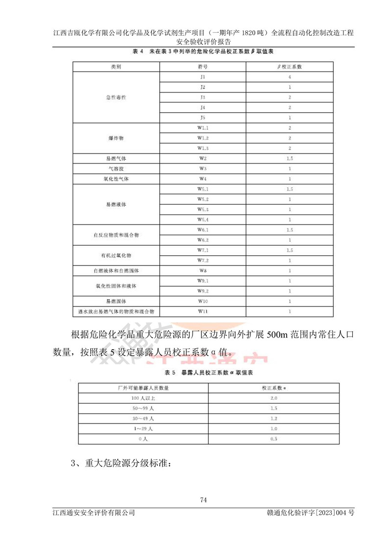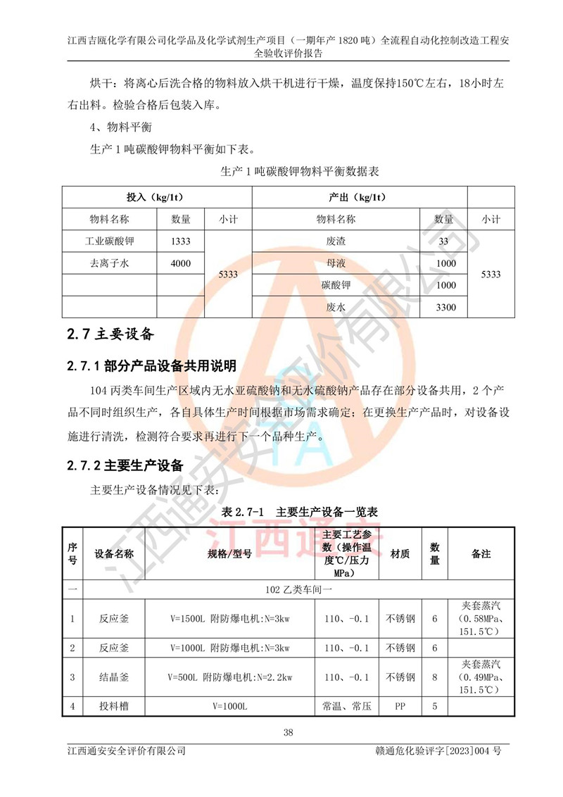 江西吉瓯化学有限公司(以下简称“公司”)位于江西省吉安市井冈山经济技术区富滩工业园B区,于2015年12月2日注册成立,注册资金壹仟万元,统一社会信用代码:91360803MA35FPBR83,法人**孙云辉,属有限责任公司(自然人投资或控股),经营范围:化学品、化学试剂生产、销售(不含危险化学品)(依法需经批准的项目,经相关部门批准后方可开展经营活动)。 公司于2016年3月21日取得青原区发展和改革委员会印发的《关于印发江西吉瓯化学有限公司改建项目的通知》(吉青发改字【2016】44号)文件,项目名称:化学品及化学试剂生产项目;2017年3月6日委托江西赣昌安全生产科技服务有限公司编制了《江西吉瓯化学有限公司化学品及化学试剂生产项目安全预评价报告》,并通过专家组评审;2018年3月委托江西省化学工业设计院编制了《江西吉瓯化学有限公司化学品及化学试剂生产项目安全设施设计专篇》,并于2018年5月14日取得吉安市安全生产监督管理局危险化学品建设项目安全设施设计审查意见书(吉市危化项目安设审字【2018】12号);2021年12月24日取得井冈山经济技术开发区应急管理局下发危险化学品建设项目试生产(使用)方案回执》(井开危化项目备字【2021】01号)文件,试生产期限为2021年12月24日至2022年12月23日;于2020年7月28日、2021年8月、2022年8月分别由江西省化学工业设计院出具了3次《江西吉瓯化学有限公司化学品及化学试剂生产项目设计变更说明》;于2022年12月16日委托江西通安安全评价有限公司编制了《江西吉瓯化学有限公司化学品及化学试剂生产项目(一期年产1820吨)安全验收评价报告》;于2023年2月3日取得江西省应急管理厅颁发的《安全生产许可证》(编号:(赣)WH安许证字【2023】1176号),**期由2023年2月3日至2026年2月2日,许可范围:氢氧化钡(20t/a)、硝酸钙(20t/a)。 根据《江西省应急管理厅关于印发<江西省化工企业自动化提升实施方案>(试行)的通知》(赣应急字[2021]190号)要求,公司于2022年7月委托黑龙江龙维化学工程设计有限公司编制了《江西吉瓯化学有限公司化学品及化学试剂生产项目全流程自动化控制诊断报告》;2022年12月7日委托黑龙江龙维化学工程设计有限公司编制了《江西吉瓯化学有限公司化学品及化学试剂生产项目(一期年产1820吨)危险与可操作性(HAZOP)分析报告》;2022年12月8日委托黑龙江龙维化学工程设计有限公司编制了《江西吉瓯化学有限公司化学品及化学试剂生产项目(一期年产1820吨)安全完整性评估(SIL)定级报告》;2023年1月9日委托黑龙江龙维化学工程设计有限公司编制了《江西吉瓯化学有限公司化学品及化学试剂生产项目全流程自动化控制改造设计方案》,并通过了专家审查。公司化学品及化学试剂生产项目(一期年产1820吨)全流程自动化控制改造工程由浙中自控工程(西安)有限公司负责安装、调试,并出具了《江西吉瓯化学有限公司PLC自动化控制系统改造项目调试报告》,调试结论:调试完成、符合要求。 |