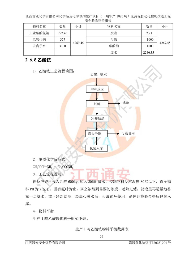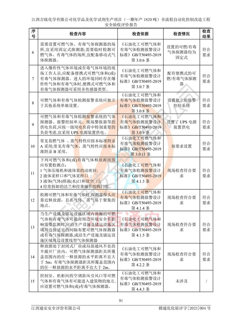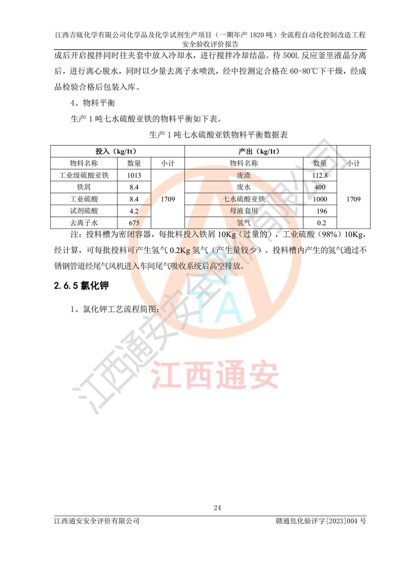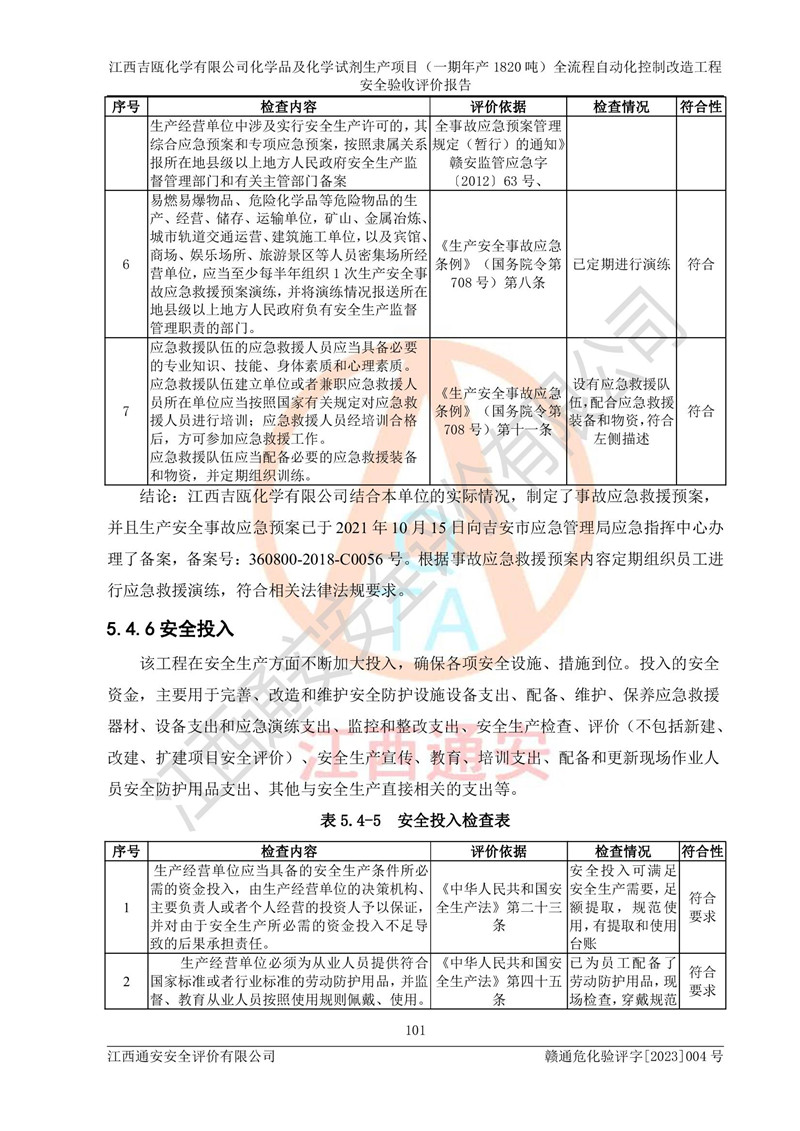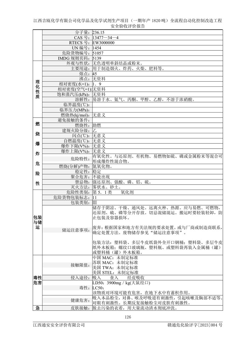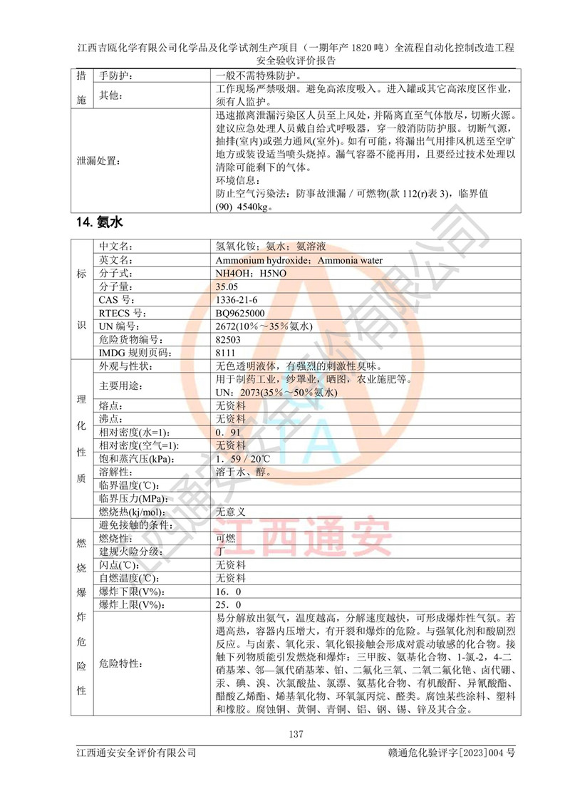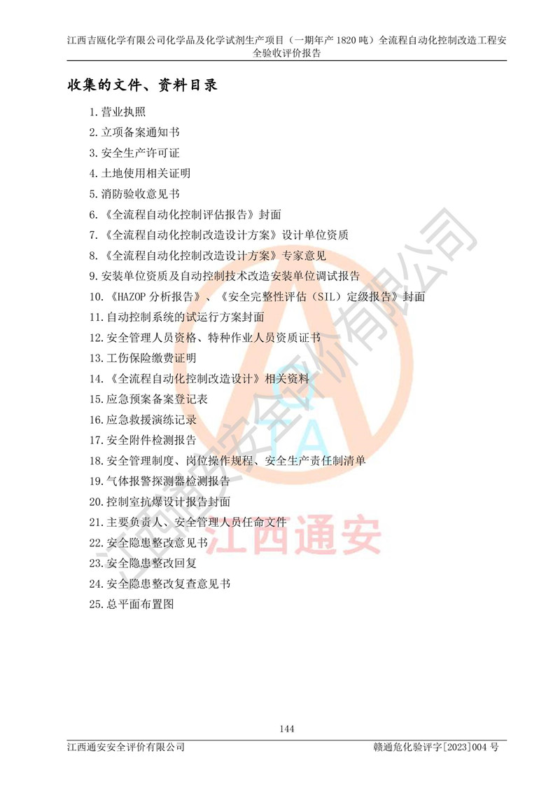 江西吉瓯化学有限公司(以下简称“公司”)位于江西省吉安市井冈山经济技术区富滩工业园B区,于2015年12月2日注册成立,注册资金壹仟万元,统一社会信用代码:91360803MA35FPBR83,法人**孙云辉,属有限责任公司(自然人投资或控股),经营范围:化学品、化学试剂生产、销售(不含危险化学品)(依法需经批准的项目,经相关部门批准后方可开展经营活动)。 公司于2016年3月21日取得青原区发展和改革委员会印发的《关于印发江西吉瓯化学有限公司改建项目的通知》(吉青发改字【2016】44号)文件,项目名称:化学品及化学试剂生产项目;2017年3月6日委托江西赣昌安全生产科技服务有限公司编制了《江西吉瓯化学有限公司化学品及化学试剂生产项目安全预评价报告》,并通过专家组评审;2018年3月委托江西省化学工业设计院编制了《江西吉瓯化学有限公司化学品及化学试剂生产项目安全设施设计专篇》,并于2018年5月14日取得吉安市安全生产监督管理局危险化学品建设项目安全设施设计审查意见书(吉市危化项目安设审字【2018】12号);2021年12月24日取得井冈山经济技术开发区应急管理局下发危险化学品建设项目试生产(使用)方案回执》(井开危化项目备字【2021】01号)文件,试生产期限为2021年12月24日至2022年12月23日;于2020年7月28日、2021年8月、2022年8月分别由江西省化学工业设计院出具了3次《江西吉瓯化学有限公司化学品及化学试剂生产项目设计变更说明》;于2022年12月16日委托江西通安安全评价有限公司编制了《江西吉瓯化学有限公司化学品及化学试剂生产项目(一期年产1820吨)安全验收评价报告》;于2023年2月3日取得江西省应急管理厅颁发的《安全生产许可证》(编号:(赣)WH安许证字【2023】1176号),**期由2023年2月3日至2026年2月2日,许可范围:氢氧化钡(20t/a)、硝酸钙(20t/a)。 根据《江西省应急管理厅关于印发<江西省化工企业自动化提升实施方案>(试行)的通知》(赣应急字[2021]190号)要求,公司于2022年7月委托黑龙江龙维化学工程设计有限公司编制了《江西吉瓯化学有限公司化学品及化学试剂生产项目全流程自动化控制诊断报告》;2022年12月7日委托黑龙江龙维化学工程设计有限公司编制了《江西吉瓯化学有限公司化学品及化学试剂生产项目(一期年产1820吨)危险与可操作性(HAZOP)分析报告》;2022年12月8日委托黑龙江龙维化学工程设计有限公司编制了《江西吉瓯化学有限公司化学品及化学试剂生产项目(一期年产1820吨)安全完整性评估(SIL)定级报告》;2023年1月9日委托黑龙江龙维化学工程设计有限公司编制了《江西吉瓯化学有限公司化学品及化学试剂生产项目全流程自动化控制改造设计方案》,并通过了专家审查。公司化学品及化学试剂生产项目(一期年产1820吨)全流程自动化控制改造工程由浙中自控工程(西安)有限公司负责安装、调试,并出具了《江西吉瓯化学有限公司PLC自动化控制系统改造项目调试报告》,调试结论:调试完成、符合要求。 |