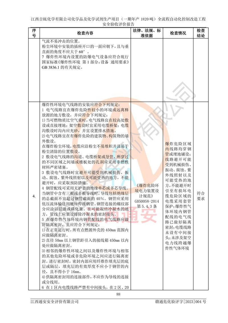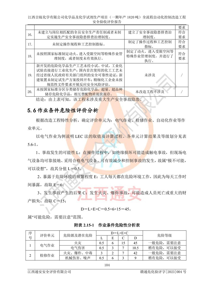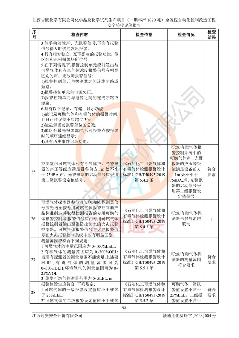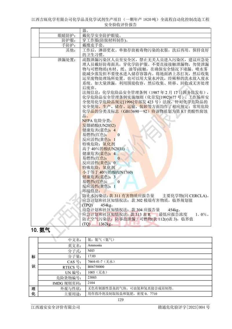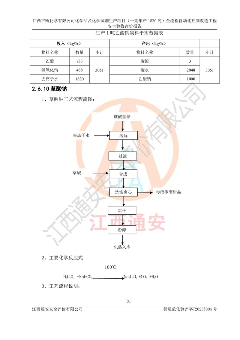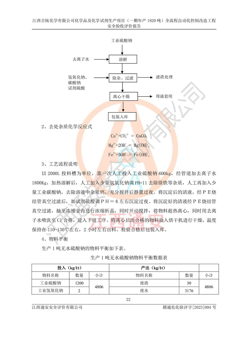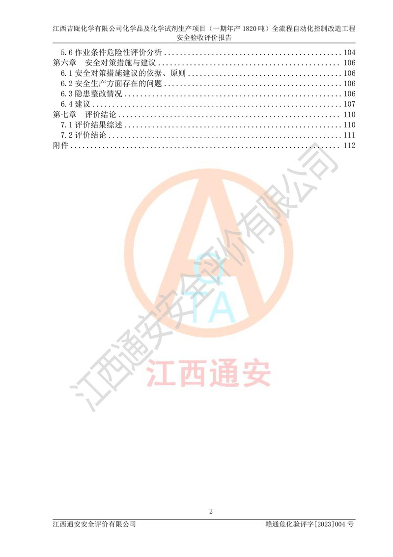 江西吉瓯化学有限公司(以下简称“公司”)位于江西省吉安市井冈山经济技术区富滩工业园B区,于2015年12月2日注册成立,注册资金壹仟万元,统一社会信用代码:91360803MA35FPBR83,法人**孙云辉,属有限责任公司(自然人投资或控股),经营范围:化学品、化学试剂生产、销售(不含危险化学品)(依法需经批准的项目,经相关部门批准后方可开展经营活动)。 公司于2016年3月21日取得青原区发展和改革委员会印发的《关于印发江西吉瓯化学有限公司改建项目的通知》(吉青发改字【2016】44号)文件,项目名称:化学品及化学试剂生产项目;2017年3月6日委托江西赣昌安全生产科技服务有限公司编制了《江西吉瓯化学有限公司化学品及化学试剂生产项目安全预评价报告》,并通过专家组评审;2018年3月委托江西省化学工业设计院编制了《江西吉瓯化学有限公司化学品及化学试剂生产项目安全设施设计专篇》,并于2018年5月14日取得吉安市安全生产监督管理局危险化学品建设项目安全设施设计审查意见书(吉市危化项目安设审字【2018】12号);2021年12月24日取得井冈山经济技术开发区应急管理局下发危险化学品建设项目试生产(使用)方案回执》(井开危化项目备字【2021】01号)文件,试生产期限为2021年12月24日至2022年12月23日;于2020年7月28日、2021年8月、2022年8月分别由江西省化学工业设计院出具了3次《江西吉瓯化学有限公司化学品及化学试剂生产项目设计变更说明》;于2022年12月16日委托江西通安安全评价有限公司编制了《江西吉瓯化学有限公司化学品及化学试剂生产项目(一期年产1820吨)安全验收评价报告》;于2023年2月3日取得江西省应急管理厅颁发的《安全生产许可证》(编号:(赣)WH安许证字【2023】1176号),**期由2023年2月3日至2026年2月2日,许可范围:氢氧化钡(20t/a)、硝酸钙(20t/a)。 根据《江西省应急管理厅关于印发<江西省化工企业自动化提升实施方案>(试行)的通知》(赣应急字[2021]190号)要求,公司于2022年7月委托黑龙江龙维化学工程设计有限公司编制了《江西吉瓯化学有限公司化学品及化学试剂生产项目全流程自动化控制诊断报告》;2022年12月7日委托黑龙江龙维化学工程设计有限公司编制了《江西吉瓯化学有限公司化学品及化学试剂生产项目(一期年产1820吨)危险与可操作性(HAZOP)分析报告》;2022年12月8日委托黑龙江龙维化学工程设计有限公司编制了《江西吉瓯化学有限公司化学品及化学试剂生产项目(一期年产1820吨)安全完整性评估(SIL)定级报告》;2023年1月9日委托黑龙江龙维化学工程设计有限公司编制了《江西吉瓯化学有限公司化学品及化学试剂生产项目全流程自动化控制改造设计方案》,并通过了专家审查。公司化学品及化学试剂生产项目(一期年产1820吨)全流程自动化控制改造工程由浙中自控工程(西安)有限公司负责安装、调试,并出具了《江西吉瓯化学有限公司PLC自动化控制系统改造项目调试报告》,调试结论:调试完成、符合要求。 |