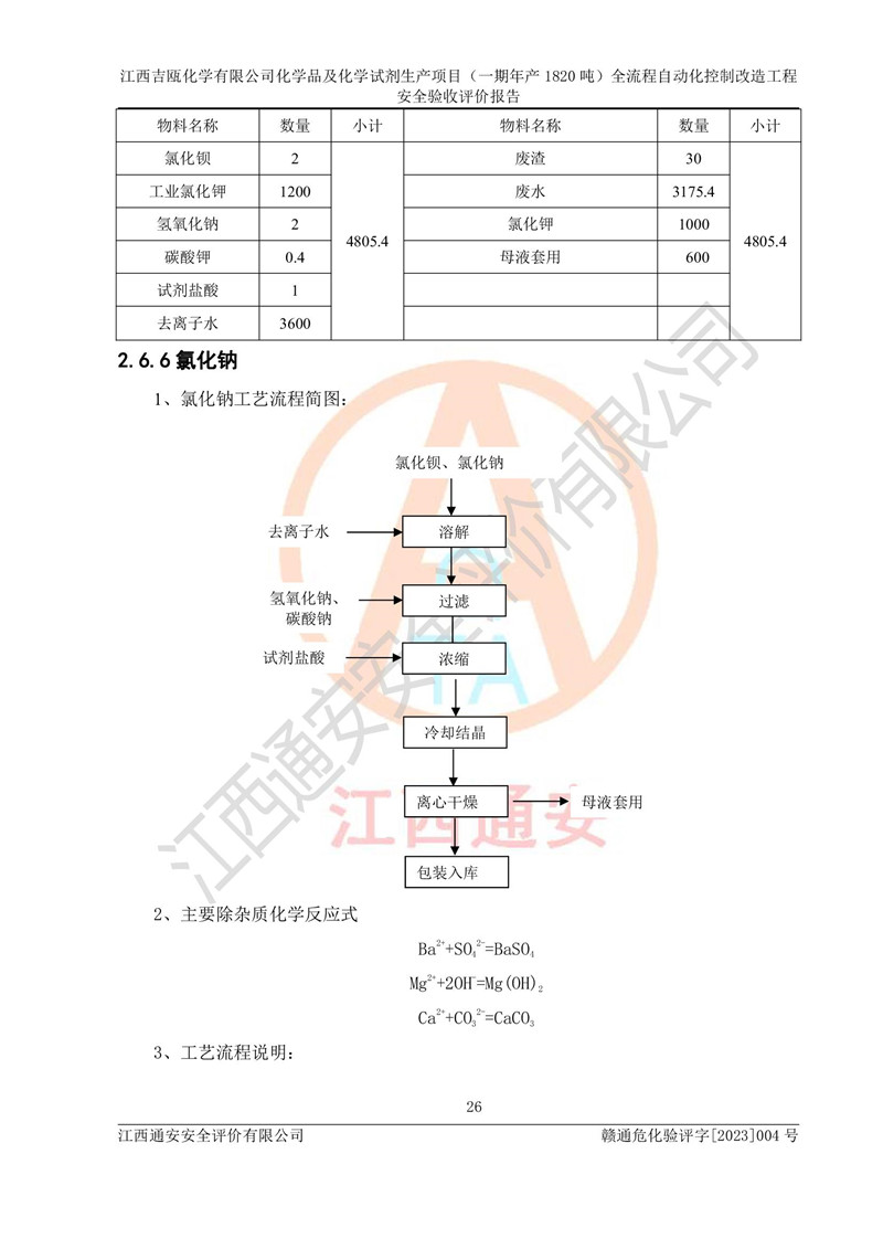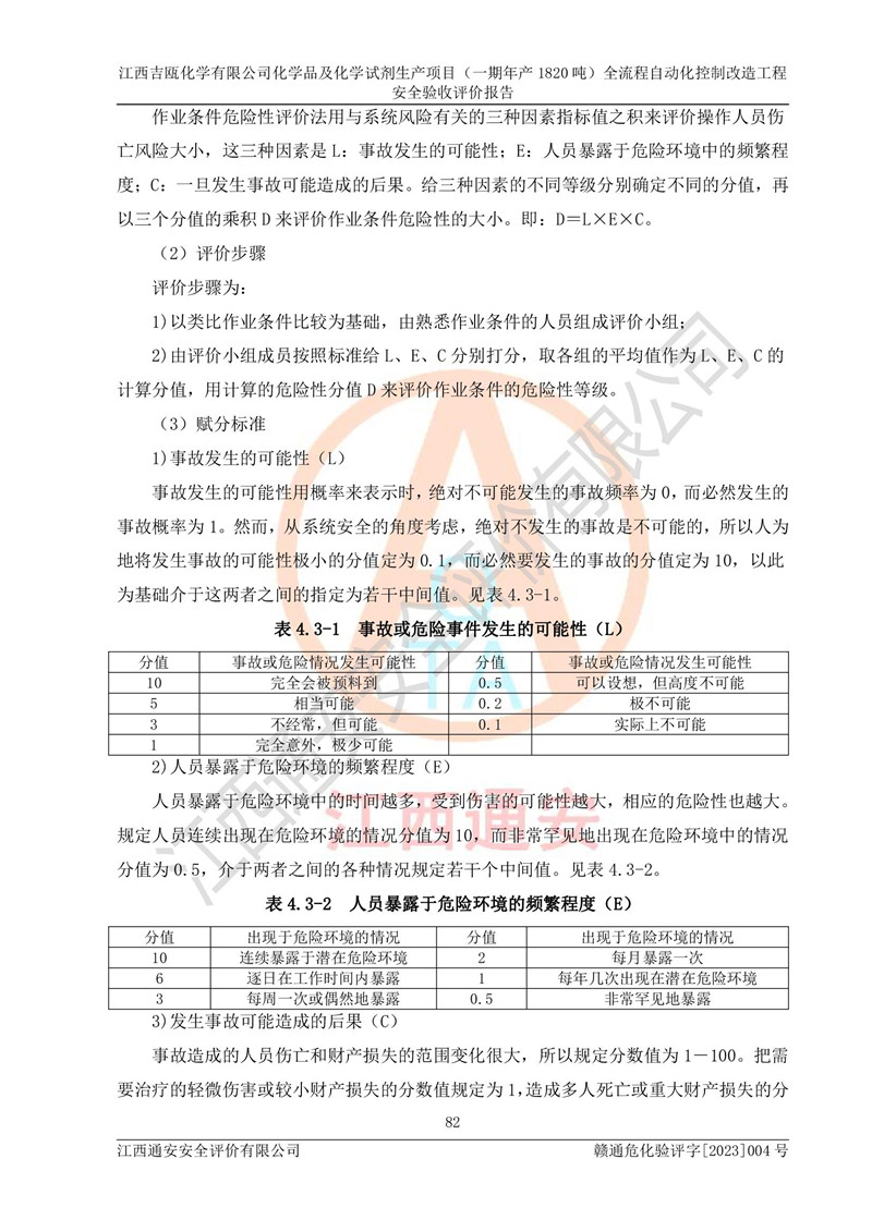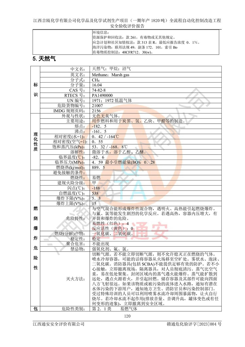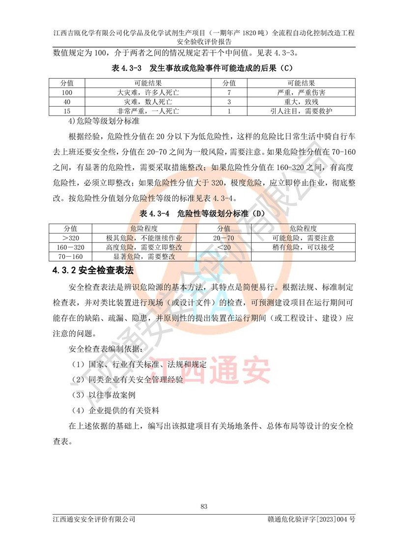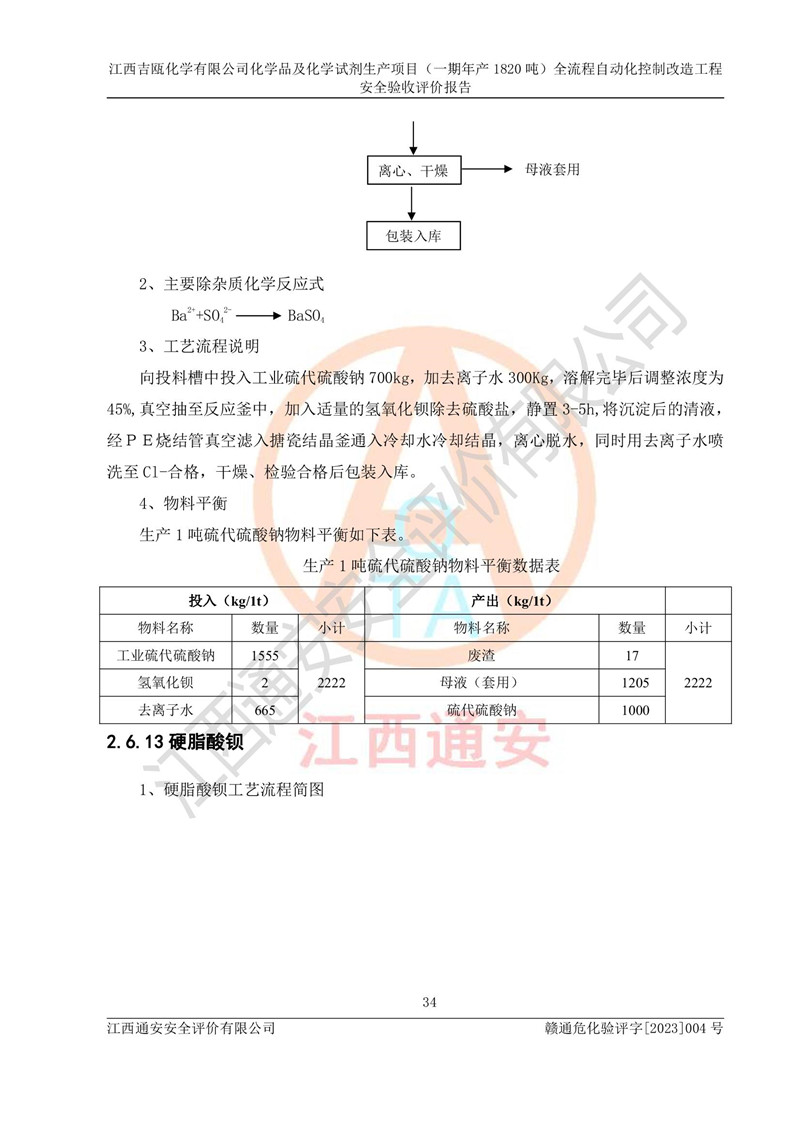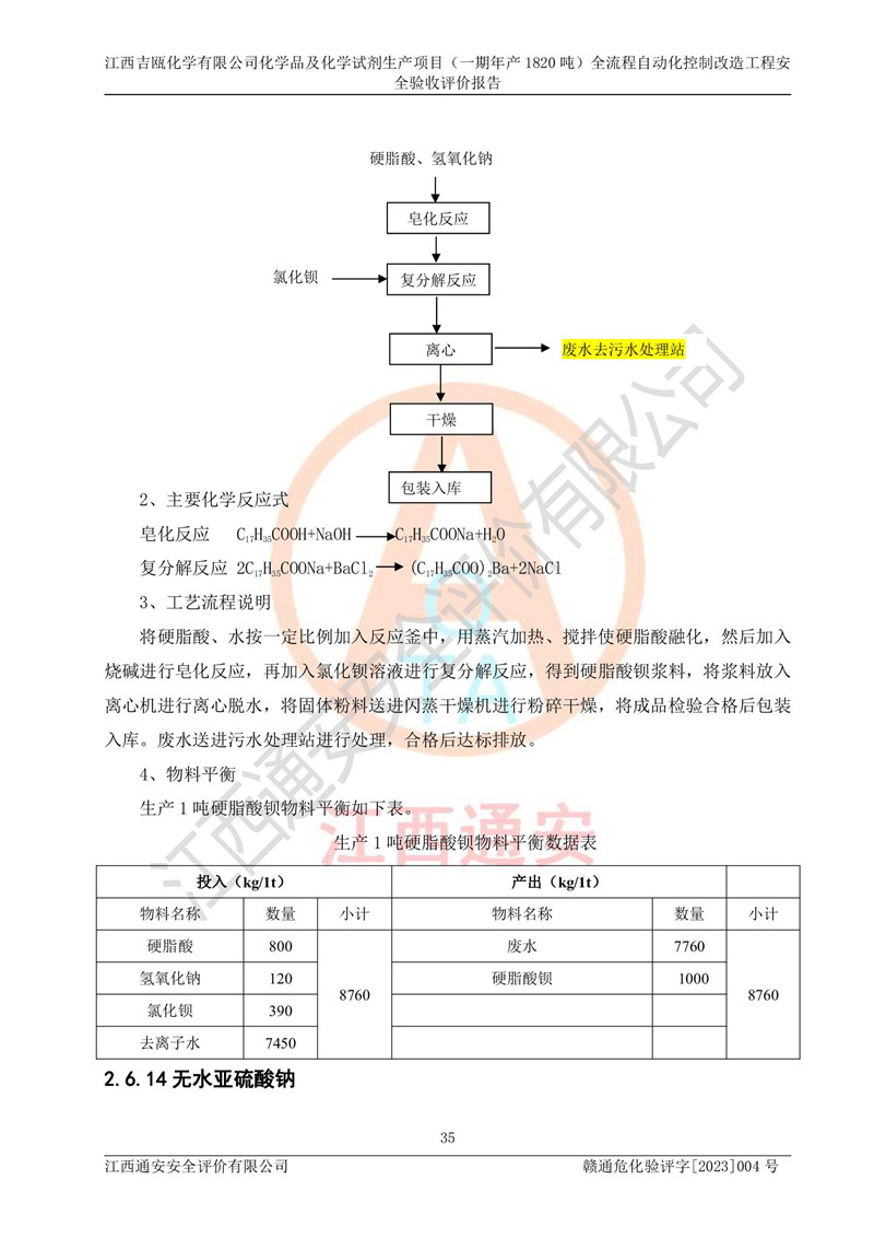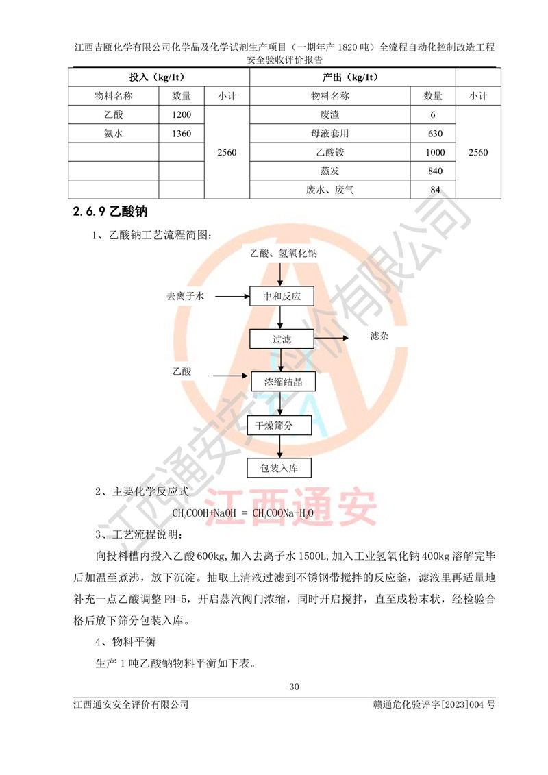 江西吉瓯化学有限公司(以下简称“公司”)位于江西省吉安市井冈山经济技术区富滩工业园B区,于2015年12月2日注册成立,注册资金壹仟万元,统一社会信用代码:91360803MA35FPBR83,法人**孙云辉,属有限责任公司(自然人投资或控股),经营范围:化学品、化学试剂生产、销售(不含危险化学品)(依法需经批准的项目,经相关部门批准后方可开展经营活动)。 公司于2016年3月21日取得青原区发展和改革委员会印发的《关于印发江西吉瓯化学有限公司改建项目的通知》(吉青发改字【2016】44号)文件,项目名称:化学品及化学试剂生产项目;2017年3月6日委托江西赣昌安全生产科技服务有限公司编制了《江西吉瓯化学有限公司化学品及化学试剂生产项目安全预评价报告》,并通过专家组评审;2018年3月委托江西省化学工业设计院编制了《江西吉瓯化学有限公司化学品及化学试剂生产项目安全设施设计专篇》,并于2018年5月14日取得吉安市安全生产监督管理局危险化学品建设项目安全设施设计审查意见书(吉市危化项目安设审字【2018】12号);2021年12月24日取得井冈山经济技术开发区应急管理局下发危险化学品建设项目试生产(使用)方案回执》(井开危化项目备字【2021】01号)文件,试生产期限为2021年12月24日至2022年12月23日;于2020年7月28日、2021年8月、2022年8月分别由江西省化学工业设计院出具了3次《江西吉瓯化学有限公司化学品及化学试剂生产项目设计变更说明》;于2022年12月16日委托江西通安安全评价有限公司编制了《江西吉瓯化学有限公司化学品及化学试剂生产项目(一期年产1820吨)安全验收评价报告》;于2023年2月3日取得江西省应急管理厅颁发的《安全生产许可证》(编号:(赣)WH安许证字【2023】1176号),**期由2023年2月3日至2026年2月2日,许可范围:氢氧化钡(20t/a)、硝酸钙(20t/a)。 根据《江西省应急管理厅关于印发<江西省化工企业自动化提升实施方案>(试行)的通知》(赣应急字[2021]190号)要求,公司于2022年7月委托黑龙江龙维化学工程设计有限公司编制了《江西吉瓯化学有限公司化学品及化学试剂生产项目全流程自动化控制诊断报告》;2022年12月7日委托黑龙江龙维化学工程设计有限公司编制了《江西吉瓯化学有限公司化学品及化学试剂生产项目(一期年产1820吨)危险与可操作性(HAZOP)分析报告》;2022年12月8日委托黑龙江龙维化学工程设计有限公司编制了《江西吉瓯化学有限公司化学品及化学试剂生产项目(一期年产1820吨)安全完整性评估(SIL)定级报告》;2023年1月9日委托黑龙江龙维化学工程设计有限公司编制了《江西吉瓯化学有限公司化学品及化学试剂生产项目全流程自动化控制改造设计方案》,并通过了专家审查。公司化学品及化学试剂生产项目(一期年产1820吨)全流程自动化控制改造工程由浙中自控工程(西安)有限公司负责安装、调试,并出具了《江西吉瓯化学有限公司PLC自动化控制系统改造项目调试报告》,调试结论:调试完成、符合要求。 |
