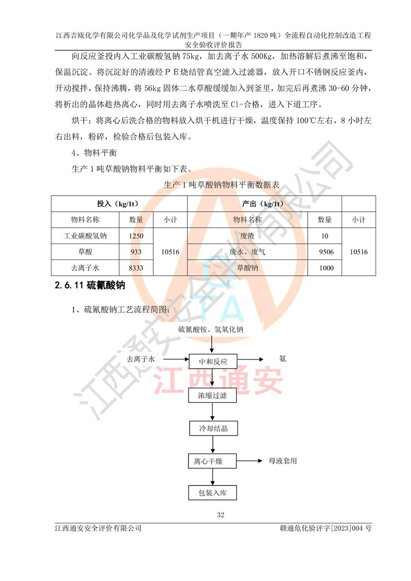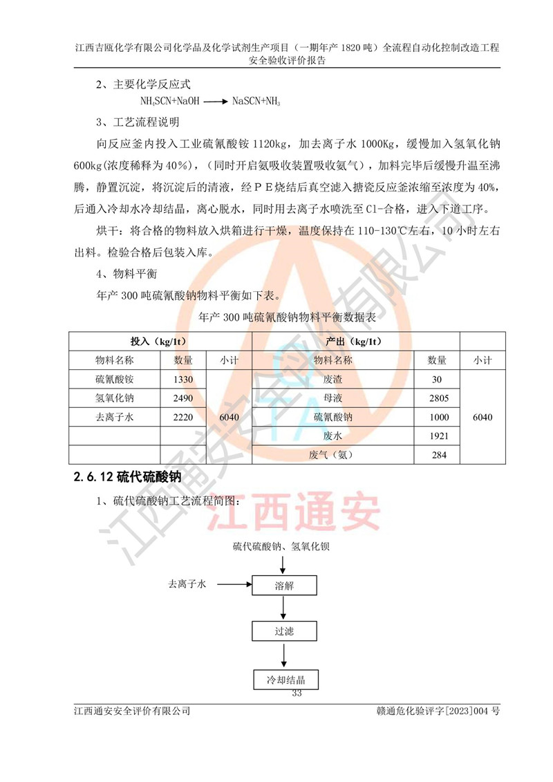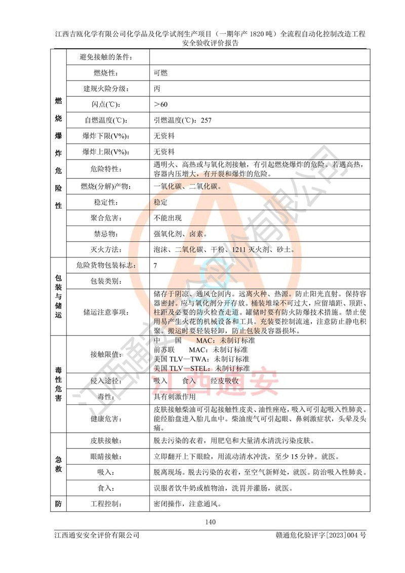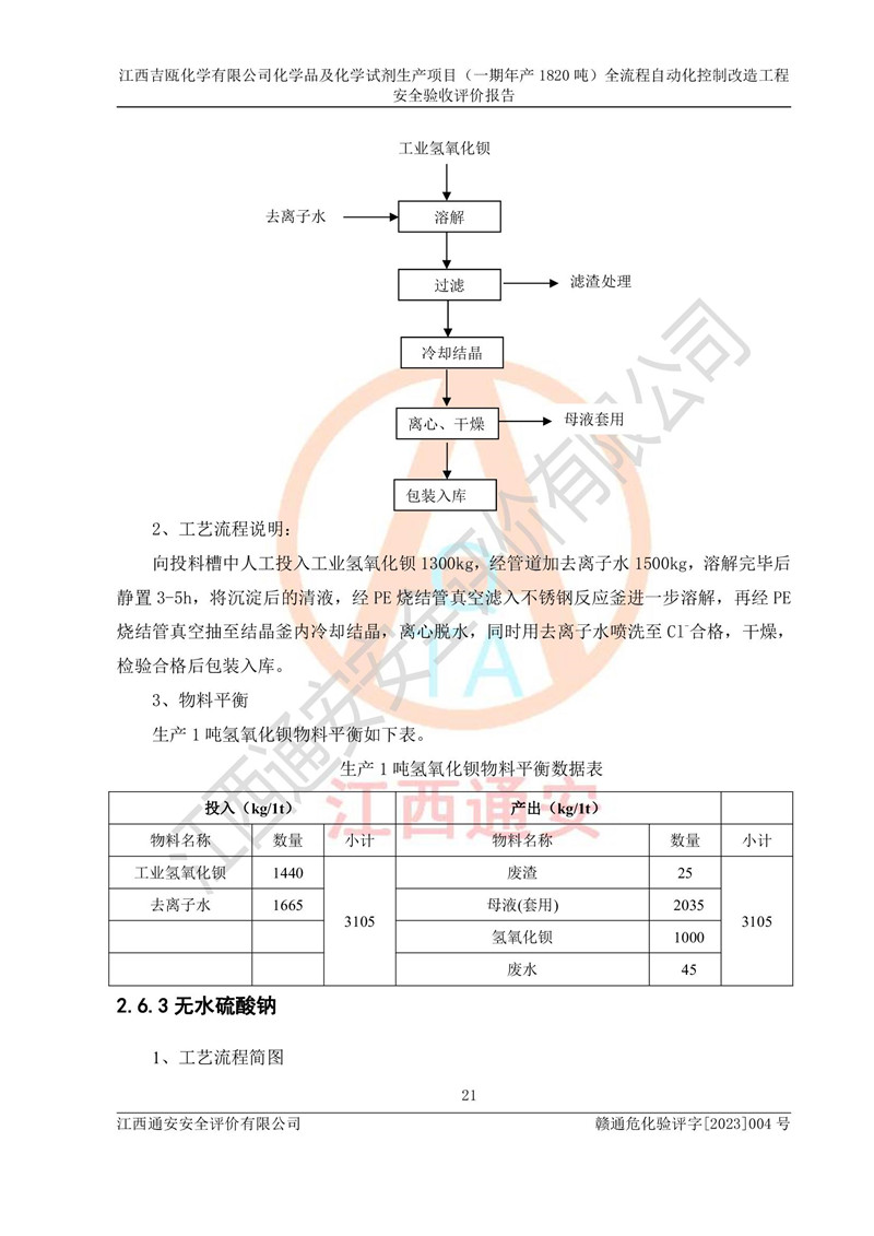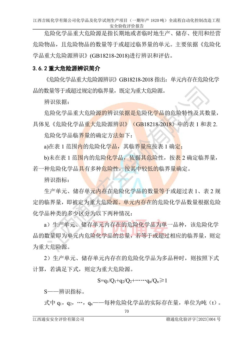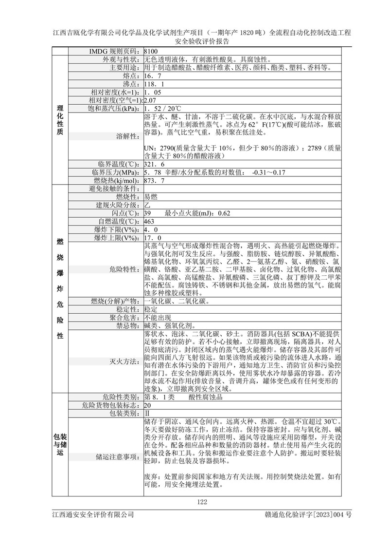 江西吉瓯化学有限公司(以下简称“公司”)位于江西省吉安市井冈山经济技术区富滩工业园B区,于2015年12月2日注册成立,注册资金壹仟万元,统一社会信用代码:91360803MA35FPBR83,法人**孙云辉,属有限责任公司(自然人投资或控股),经营范围:化学品、化学试剂生产、销售(不含危险化学品)(依法需经批准的项目,经相关部门批准后方可开展经营活动)。 公司于2016年3月21日取得青原区发展和改革委员会印发的《关于印发江西吉瓯化学有限公司改建项目的通知》(吉青发改字【2016】44号)文件,项目名称:化学品及化学试剂生产项目;2017年3月6日委托江西赣昌安全生产科技服务有限公司编制了《江西吉瓯化学有限公司化学品及化学试剂生产项目安全预评价报告》,并通过专家组评审;2018年3月委托江西省化学工业设计院编制了《江西吉瓯化学有限公司化学品及化学试剂生产项目安全设施设计专篇》,并于2018年5月14日取得吉安市安全生产监督管理局危险化学品建设项目安全设施设计审查意见书(吉市危化项目安设审字【2018】12号);2021年12月24日取得井冈山经济技术开发区应急管理局下发危险化学品建设项目试生产(使用)方案回执》(井开危化项目备字【2021】01号)文件,试生产期限为2021年12月24日至2022年12月23日;于2020年7月28日、2021年8月、2022年8月分别由江西省化学工业设计院出具了3次《江西吉瓯化学有限公司化学品及化学试剂生产项目设计变更说明》;于2022年12月16日委托江西通安安全评价有限公司编制了《江西吉瓯化学有限公司化学品及化学试剂生产项目(一期年产1820吨)安全验收评价报告》;于2023年2月3日取得江西省应急管理厅颁发的《安全生产许可证》(编号:(赣)WH安许证字【2023】1176号),**期由2023年2月3日至2026年2月2日,许可范围:氢氧化钡(20t/a)、硝酸钙(20t/a)。 根据《江西省应急管理厅关于印发<江西省化工企业自动化提升实施方案>(试行)的通知》(赣应急字[2021]190号)要求,公司于2022年7月委托黑龙江龙维化学工程设计有限公司编制了《江西吉瓯化学有限公司化学品及化学试剂生产项目全流程自动化控制诊断报告》;2022年12月7日委托黑龙江龙维化学工程设计有限公司编制了《江西吉瓯化学有限公司化学品及化学试剂生产项目(一期年产1820吨)危险与可操作性(HAZOP)分析报告》;2022年12月8日委托黑龙江龙维化学工程设计有限公司编制了《江西吉瓯化学有限公司化学品及化学试剂生产项目(一期年产1820吨)安全完整性评估(SIL)定级报告》;2023年1月9日委托黑龙江龙维化学工程设计有限公司编制了《江西吉瓯化学有限公司化学品及化学试剂生产项目全流程自动化控制改造设计方案》,并通过了专家审查。公司化学品及化学试剂生产项目(一期年产1820吨)全流程自动化控制改造工程由浙中自控工程(西安)有限公司负责安装、调试,并出具了《江西吉瓯化学有限公司PLC自动化控制系统改造项目调试报告》,调试结论:调试完成、符合要求。 |